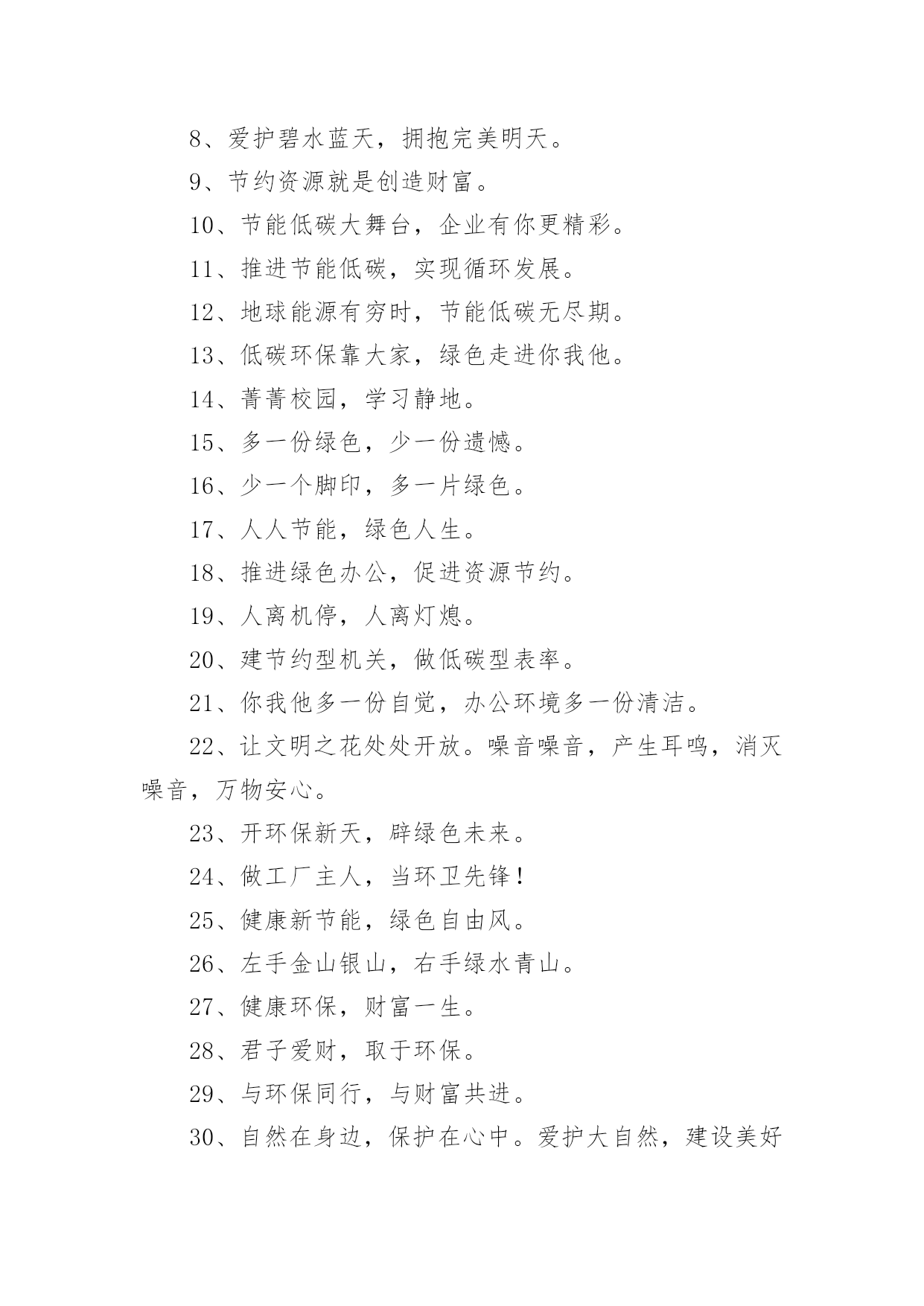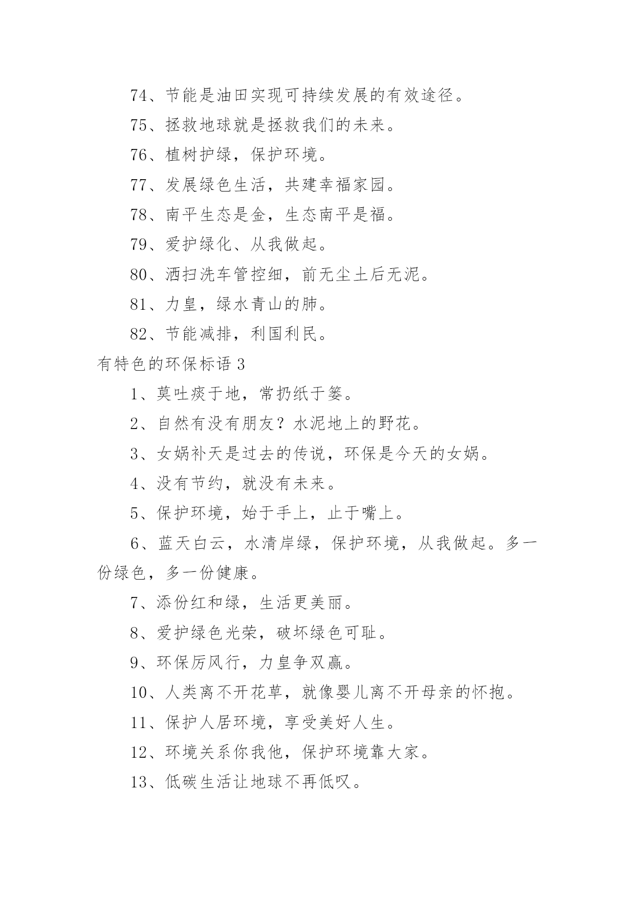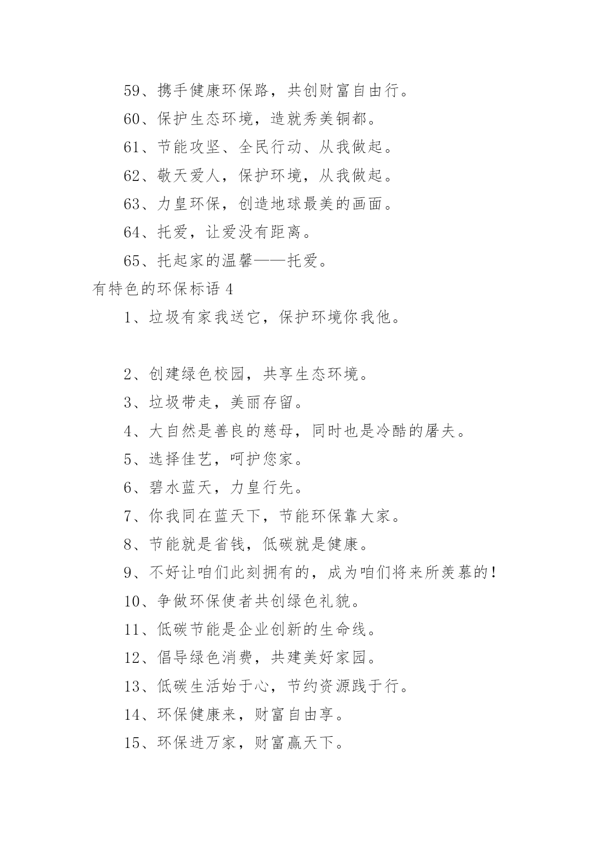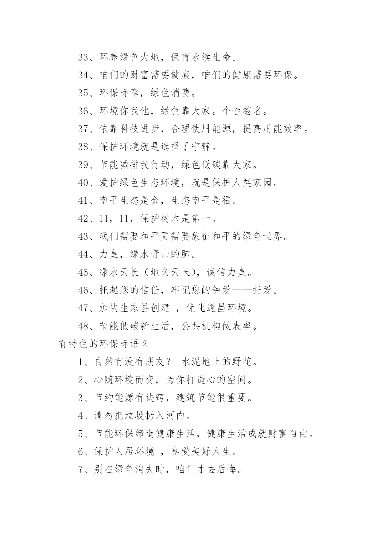 有特色的环保标语有特色的环保标语集锦15篇在平平淡淡的日常中,大家都接触过比较经典的标语吧,标语起着警示人们的作用。还苦于找不到好的标语?以下是小编整理的有特色的环保标语,欢迎大家借鉴与参考,希望对大家有所帮助。有特色的环保标语11、花儿红,草儿绿,世界更美丽。2、用我奔放情,饰你智慧心。3、你栽一棵树,我栽一棵树,我们共同为校园添绿。4、树立企业形象,协调人与自然。5、诚信力皇,环保担当。6、节能环保缔造健康生活,健康生活成就财富自由。7、享受低碳生活,不再被OUT。8、建立环保模范城市促进社会可持续发展。9、不好让咱们此刻拥有的,成为咱们将来所羡慕的!10、绿色是性命之源绿色是人类之根。11、生活垃圾不乱倒,村庄洁净风光好。12、我爱花,我爱草。我爱青春小树苗。13、人人做整理,场地有条理,全员做清扫,环境更美好。14、让文明之花处处开放。噪音噪音,产生耳鸣,消灭噪音,万物安心。15、有了您的真心呵护,工厂才会更加美丽。16、节能为环保,财富为健康。17、分工合作来清扫,相信明天会更好。18、环保一小步,健康一大步。19、绿色是生命之色,生命呼唤着绿色。保护环境,从我做起。20、让节能减排成为习惯,让绿色文明一生相伴。21、节能降耗,企业首要。22、节水节电靠大家,节能需要你我他。23、采用防晒膜、窗帘等阻止强烈阳光,冬季多利用阳光。24、节约资源,从我做起。25、让城市多一块绿地,让生命多一份美好,让财富多一点分享。26、做世界一流环保产品,让地球人都身体康健,给财富自由的翅膀。27、国事家事天下事,节能减排无小事。28、节约零风险,储蓄益终身!29、节约是美德,节约是智慧,节约是品质,节约是责任。30、你我环保,一起健康,共创财富,共享自由。31、我们的使命就是让您自由的呼吸纯净的空气。32、地球更健康,节能N次方。33、环养绿色大地,保育永续生命。34、咱们的财富需要健康,咱们的健康需要环保。35、环保标章,绿色消费。36、环境你我他,绿色靠大家。个性签名。37、依靠科技进步,合理使用能源,提高用能效率。38、保护环境就是选择了宁静。39、节能减排我行动,绿色低碳靠大家。40、爱护绿色生态环境,就是保护人类家园。41、南平生态是金,生态南平是福。42、11,11,保护树木是第一。43、我们需要和平更需要象征和平的绿色世界。44、力皇,绿水青山的肺。45、绿水天长(地久天长),诚信力皇。46、托起您的信任,牢记您的钟爱——托爱。47、加快生态县创建,优化遂昌环境。48、节能低碳新生活,公共机构做表率。有特色的环保标语21、自然有没有朋友?水泥地上的野花。2、心随环境而变,为你打造心的空间。3、节约能源有诀窍,建筑节能很重要。4、请勿把垃圾扔入河内。5、节能环保缔造健康生活,健康生活成就财富自由。6、保护人居环境,享受美好人生。7、别在绿色消失时,咱们才去后悔。8、爱护碧水蓝天,拥抱完美明天。9、节约资源就是创造财富。10、节能低碳大舞台,企业有你更精彩。11、推进节能低碳,实现循环发展。12、地球能源有穷时,节能低碳无尽期。13、低碳环保靠大家,绿色走进你我他。14、菁菁校园,学习静地。15、多一份绿色,少一份遗憾。16、少一个脚印,多一片绿色。17、人人节能,绿色人生。18、推进绿色办公,促进资源节约。19、人离机停,人离灯熄。20、建节约型机关,做低碳型表率。21、你我他多一份自觉,办公环境多一份清洁。22、让文明之花处处开放。噪音噪音,产生耳鸣,消灭噪音,万物安心。23、开环保新天,辟绿色未来。24、做工厂主人,当环卫先锋!25、健康新节能,绿色自由风。26、左手金山银山,右手绿水青山。27、健康环保,财富一生。28、君子爱财,取于环保。29、与环保同行,与财富共进。30、自然在身边,保护在心中。爱护大自然,建设美好家园。31、节能出产品,节约出人品。32、倡导节能减排,促进人与自然协调发展。33、珍惜您用的每一滴水,因为她们是珍稀的生命之源,请爱护我们的地球。34、每一寸芳草绿,都寄着你生命的根源,请爱护花草!35、人人使用低碳产品,个个参与节能减排。36、实行清洁生产综合利用资源打造绿色竞争力绿色贵在保持,环保重在行动。37、节能减排人人出力,绿色城市人人受益。38、家事国事天下事,节能减排是大事。39、节约能源,从我做起。40、减少了垃圾,就减少了生命的危机;增加了绿色,就增加了生命的活力。41、节能降耗,和谐发展。42、节水节电靠大家,节能需要你我他。43、低碳让地球,解脱苦难。44、选择低碳,绿色相伴。45、节能我行动,低碳新生活。46、省的都是赚得,请节约每一滴水。47、减少使用一次性纸杯、文具等。48、节能同心,低碳同行。49、呼吸绿色,感恩生命。50、让环保常驻你我心中,换回财富健康自由成长。