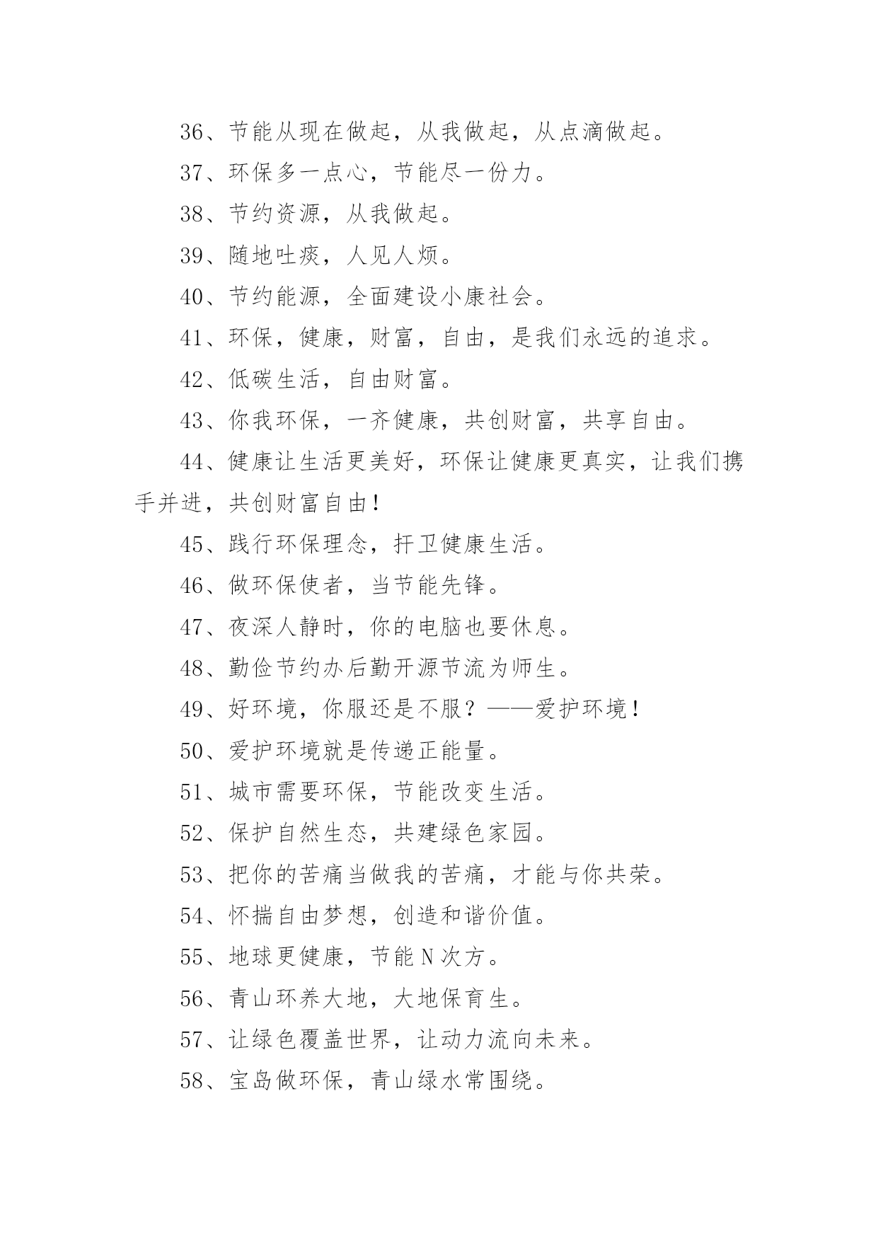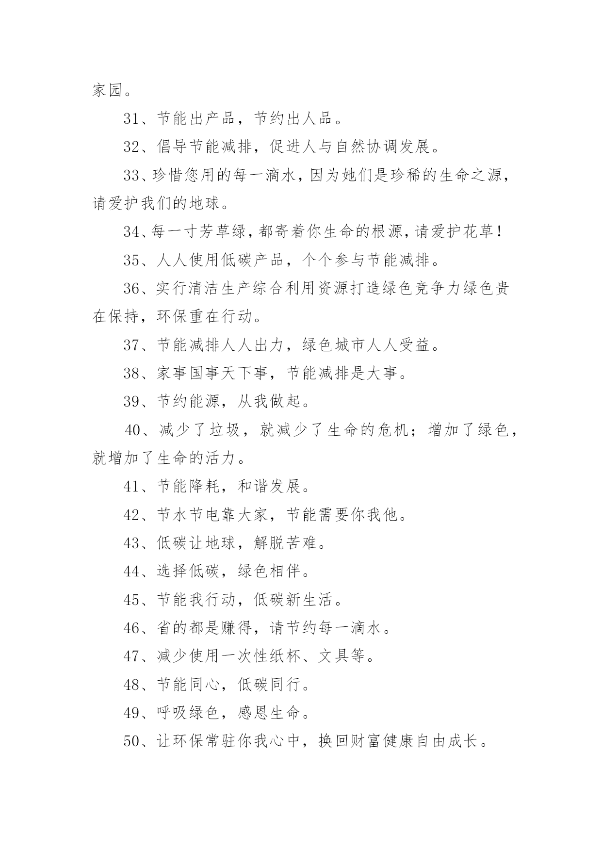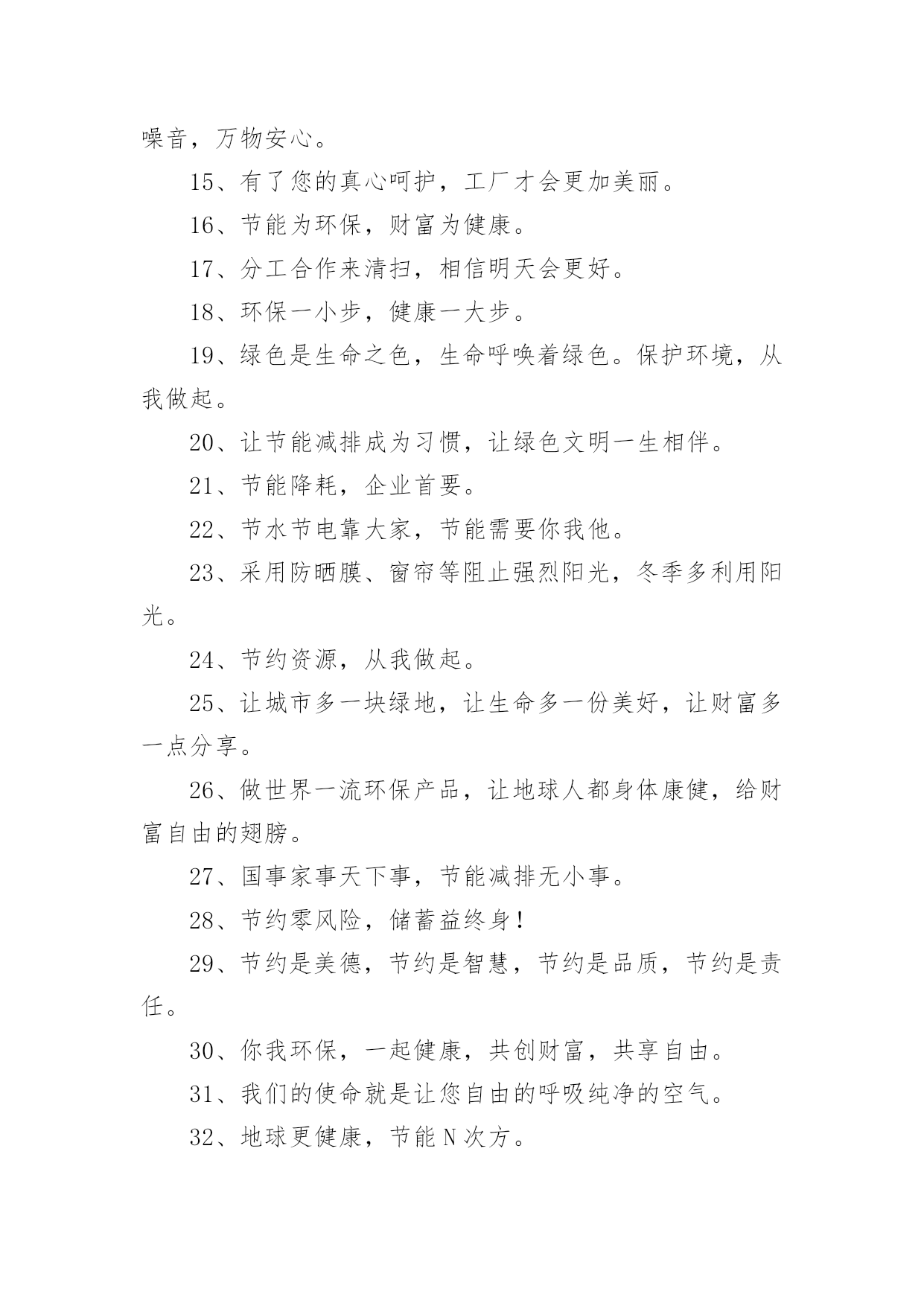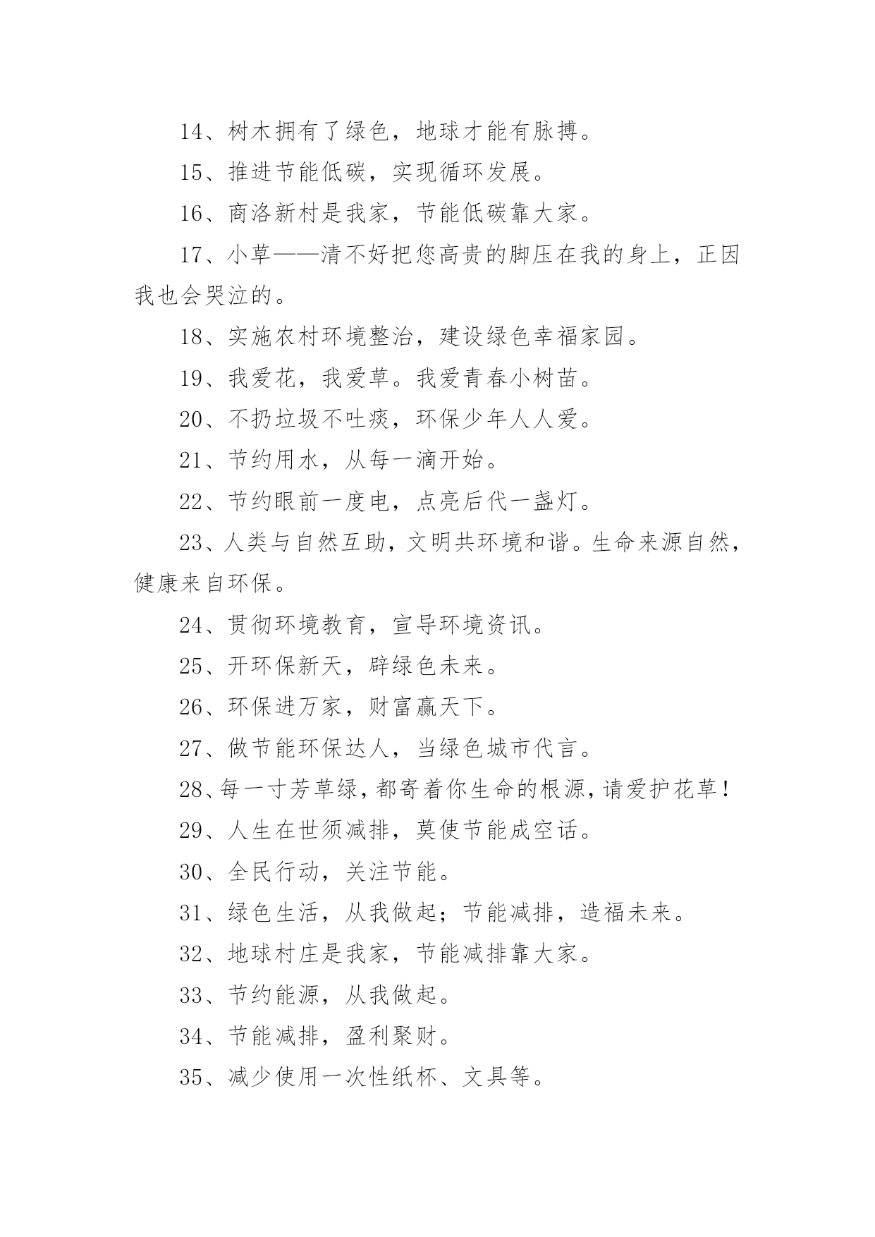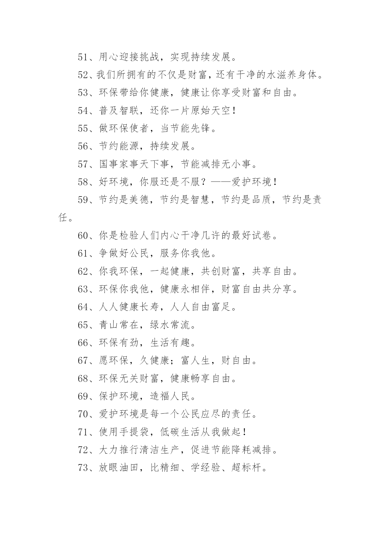 有特色的环保标语有特色的环保标语集锦15篇在平平淡淡的日常中,大家都接触过比较经典的标语吧,标语起着警示人们的作用。还苦于找不到好的标语?以下是小编整理的有特色的环保标语,欢迎大家借鉴与参考,希望对大家有所帮助。有特色的环保标语11、花儿红,草儿绿,世界更美丽。2、用我奔放情,饰你智慧心。3、你栽一棵树,我栽一棵树,我们共同为校园添绿。4、树立企业形象,协调人与自然。5、诚信力皇,环保担当。6、节能环保缔造健康生活,健康生活成就财富自由。7、享受低碳生活,不再被OUT。8、建立环保模范城市促进社会可持续发展。9、不好让咱们此刻拥有的,成为咱们将来所羡慕的!10、绿色是性命之源绿色是人类之根。11、生活垃圾不乱倒,村庄洁净风光好。12、我爱花,我爱草。我爱青春小树苗。13、人人做整理,场地有条理,全员做清扫,环境更美好。14、让文明之花处处开放。噪音噪音,产生耳鸣,消灭噪音,万物安心。15、有了您的真心呵护,工厂才会更加美丽。16、节能为环保,财富为健康。17、分工合作来清扫,相信明天会更好。18、环保一小步,健康一大步。19、绿色是生命之色,生命呼唤着绿色。保护环境,从我做起。20、让节能减排成为习惯,让绿色文明一生相伴。21、节能降耗,企业首要。22、节水节电靠大家,节能需要你我他。23、采用防晒膜、窗帘等阻止强烈阳光,冬季多利用阳光。24、节约资源,从我做起。25、让城市多一块绿地,让生命多一份美好,让财富多一点分享。26、做世界一流环保产品,让地球人都身体康健,给财富自由的翅膀。27、国事家事天下事,节能减排无小事。28、节约零风险,储蓄益终身!29、节约是美德,节约是智慧,节约是品质,节约是责任。30、你我环保,一起健康,共创财富,共享自由。31、我们的使命就是让您自由的呼吸纯净的空气。32、地球更健康,节能N次方。33、环养绿色大地,保育永续生命。34、咱们的财富需要健康,咱们的健康需要环保。35、环保标章,绿色消费。36、环境你我他,绿色靠大家。个性签名。37、依靠科技进步,合理使用能源,提高用能效率。38、保护环境就是选择了宁静。39、节能减排我行动,绿色低碳靠大家。40、爱护绿色生态环境,就是保护人类家园。41、南平生态是金,生态南平是福。42、11,11,保护树木是第一。43、我们需要和平更需要象征和平的绿色世界。44、力皇,绿水青山的肺。45、绿水天长(地久天长),诚信力皇。46、托起您的信任,牢记您的钟爱——托爱。47、加快生态县创建,优化遂昌环境。48、节能低碳新生活,公共机构做表率。有特色的环保标语21、自然有没有朋友?水泥地上的野花。2、心随环境而变,为你打造心的空间。3、节约能源有诀窍,建筑节能很重要。4、请勿把垃圾扔入河内。5、节能环保缔造健康生活,健康生活成就财富自由。6、保护人居环境,享受美好人生。7、别在绿色消失时,咱们才去后悔。8、爱护碧水蓝天,拥抱完美明天。9、节约资源就是创造财富。10、节能低碳大舞台,企业有你更精彩。11、推进节能低碳,实现循环发展。12、地球能源有穷时,节能低碳无尽期。13、低碳环保靠大家,绿色走进你我他。14、菁菁校园,学习静地。15、多一份绿色,少一份遗憾。16、少一个脚印,多一片绿色。17、人人节能,绿色人生。18、推进绿色办公,促进资源节约。19、人离机停,人离灯熄。20、建节约型机关,做低碳型表率。21、你我他多一份自觉,办公环境多一份清洁。22、让文明之花处处开放。噪音噪音,产生耳鸣,消灭噪音,万物安心。23、开环保新天,辟绿色未来。24、做工厂主人,当环卫先锋!25、健康新节能,绿色自由风。26、左手金山银山,右手绿水青山。27、健康环保,财富一生。28、君子爱财,取于环保。29、与环保同行,与财富共进。30、自然在身边,保护在心中。爱护大自然,建设美好家园。31、节能出产品,节约出人品。32、倡导节能减排,促进人与自然协调发展。33、珍惜您用的每一滴水,因为她们是珍稀的生命之源,请爱护我们的地球。34、每一寸芳草绿,都寄着你生命的根源,请爱护花草!35、人人使用低碳产品,个个参与节能减排。36、实行清洁生产综合利用资源打造绿色竞争力绿色贵在保持,环保重在行动。37、节能减排人人出力,绿色城市人人受益。38、家事国事天下事,节能减排是大事。39、节约能源,从我做起。40、减少了垃圾,就减少了生命的危机;增加了绿色,就增加了生命的活力。41、节能降耗,和谐发展。42、节水节电靠大家,节能需要你我他。43、低碳让地球,解脱苦难。44、选择低碳,绿色相伴。45、节能我行动,低碳新生活。46、省的都是赚得,请节约每一滴水。47、减少使用一次性纸杯、文具等。48、节能同心,低碳同行。49、呼吸绿色,感恩生命。50、让环保常驻你我心中,换回财富健康自由成长。