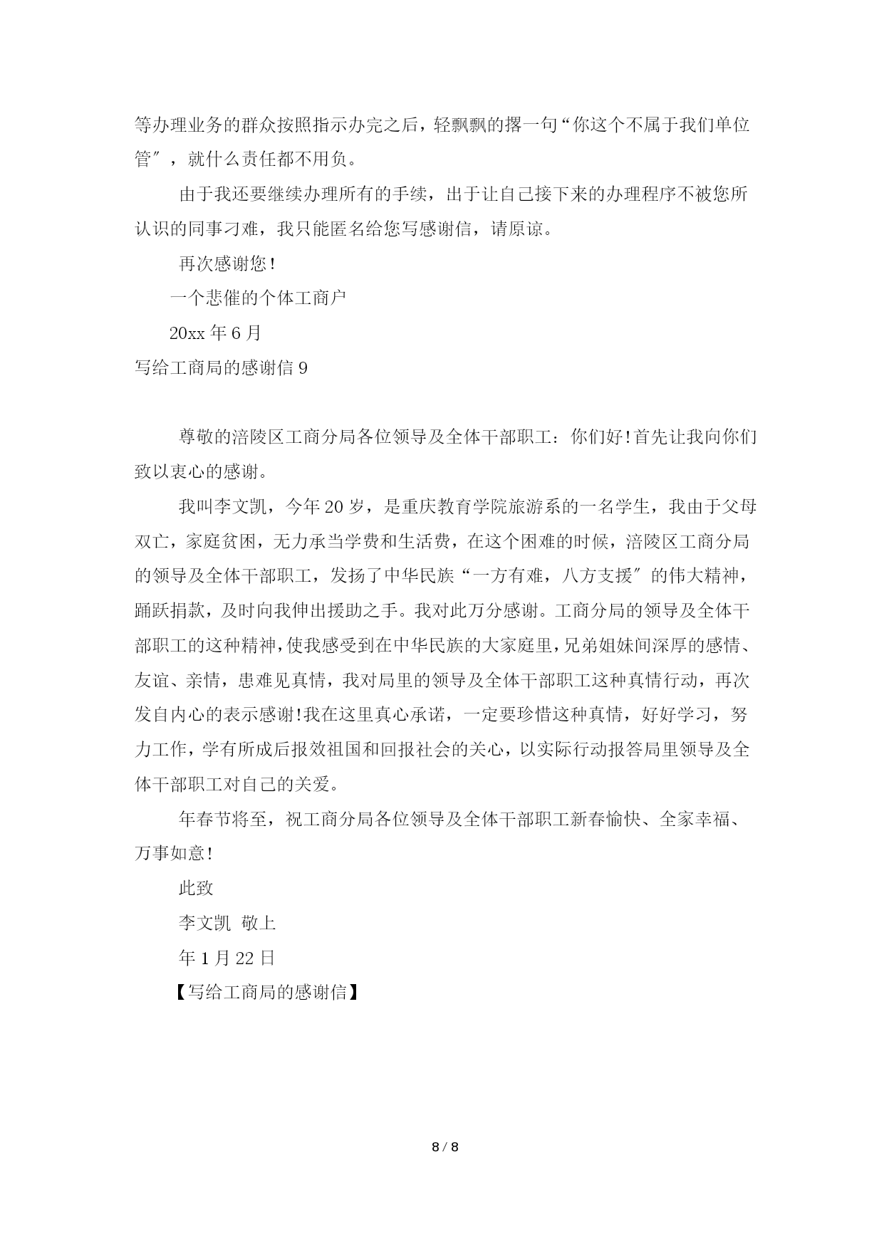 PAGE8/NUMPAGES8写给工商局的感谢信写给工商局的感谢信随着感恩思想的积极提倡,我们都可能会用到感谢信,我们在写感谢信的时候要注意态度要真挚。那么我们该怎么去写感谢信呢?下面是小编帮大家整理的写给工商局的感谢信,希望对大家有所帮助。写给工商局的感谢信1扎赉特旗康美食品在办理各项业务过程中,对扎赉特旗行政审批中心工商窗口的几位同志为我公司提供热情、优质的效劳,使我们每次在最短的时间内完成业务办理,在此特致信向你们表示衷心的感谢。我公司是江苏雨润集团全资子公司,于20xx年5月开始筹建,20xx年12月正式进入试生产阶段。至今为止,各项业务连续办理,面对大量的文书资料和工作手续令人生畏,但是旗行政审批中心工商窗口却给了我一颗明心丸、定心丸。每次来到窗口前,见到的总是微笑的面容,听到的总是娓娓的解答、客气的回应,让我们满意而归。特别是此次我公司办理营业执照注销与地址变更业务,效劳窗口的同志们审批工作、查验资料快而细致,言而有据,查询答疑明确,使用术语标准,热情有节,对材料中不符合工程改正通知标准明确,这让我公司办理人员一目了然,从而更加提高了工作效率和工作质量。效劳窗口的同志们用他们的实际行动践行了优质高效、真诚效劳的窗口诺言。万语千言写不尽的感谢之情,我公司只有送上“企业公仆、廉明高效〞的锦旗并通过日常工作中遵章经营、守法纳税的实际行动来对旗行政审批中心工商窗口为我公司提供的优质效劳作出真情报答。最后祝全体工商局工作人员工作愉快,身体健康,万事如意!此致敬礼扎赉特旗康美食品六月六日写给工商局的感谢信2你们好!首先让我向你们致以衷心的感谢。我叫李文凯,今年20岁,是重庆教育学院旅游系的一名学生,我由于父母双亡,家庭贫困,无力承当学费和生活费,在这个困难的时候,xxx工商分局的领导及全体干部职工,发扬了中华民族“一方有难,八方支援〞的伟大精神,踊跃捐款,及时向我伸出援助之手,感谢信《写给工商局的感谢信范文》。我对此万分感谢。工商分局的领导及全体干部职工的这种精神,使我感受到在中华民族的大家庭里,兄弟姐妹间深厚的感情、友谊、亲情,患难见真情,我对局里的领导及全体干部职工这种真情行动,再次发自内心的表示感谢!我在这里真心承诺,一定要珍惜这种真情,好好学习,努力工作,学有所成后报效祖国和回报社会的关心,以实际行动报答局里领导及全体干部职工对自己的关爱。年春节将至,祝工商分局各位领导及全体干部职工新春愉快、全家幸福、万事如意!此致20xx年1月22日写给工商局的感谢信3刘菲同志:我怀着万分感谢的心情,在奔波于各部门两个月后,终于在本周再次见到了您,写给工商局的感谢信。我还记得我们第一次见面,是从3月底开始我屡次去年单位找您但缘吝一面,而您的业务,您的其他同事又不能越俎代庖。终于在4月初,清明节放假前两三天吧,您百忙中给了我一次时机见到了您,虽然您告诉我,等清明收假后再来办理业务,虽然您没有理会我咨询需要带什么材料,但我还是在公示牌上找到了自己需要的内容,您极大的锻炼了我发现事物的能力。我丝毫没有因此而对您有任何怨气,尽管我每次来您单位找您的时间和交通费没人报销,但这都跟您没关系,至于那高额的房租因为没有办理完手续而闲置到今天,那根本就是我自己的错。我不认识您,这是我最大的错误,我来咨询办理的业务,本不属于您单位辖区,而您还是仔细的查看了我提交的资料(营业地址租房证明、身份证等等)热心的受理了我的业务(个体工商户名称预核准),并用几句话就给我指明了道路“到区环保局去办环评〞“拿着环评到食药局办理健康证和餐饮效劳许可证〞“办好了来这办执照〞。直到最近,我办理完了您所需要的各种材料,虽然这些材料费了不少时间、费用和精力,但我还是按照要求一一办理了。当我兴冲冲跑去办理执照的时候,却被告知“你所申请营业的场所不在我辖区!!!〞这意味着,我办理的各种手续全部要重来,时间、费用、精力,居然全都白费了!!!我是真心感谢您,是您,让我领略了什么叫“门难进、事难办〞,是您,让我知道了行政管理部门的工作时间是多么自由,对工作的态度可以是兴之所至,上班时间不来就不来,来了之后不想办理就不办理,办理业务也可以超辖区范围,等办理业务的群众按照指示办完之后,轻飘飘的撂一句“你这个不属于我们单位管〞,就什么责任都不用负。由于我还要继续办理所有的手续,出于让自己接下来的'办理程序不被您所认识的同事刁难,我只能匿名给您写感谢信,请原谅。再次感谢您!(我上过学,知道宋丹丹那句“感谢您八辈祖宗〞的含义,所以就不感谢您八辈祖宗了)一个悲催的个体工商户20xx年6月写给工商局的感谢信4刘菲同志:我怀着万分感谢的心情,在奔波于各部门两个月后,终于在本周再次见到了您。我还记得我们第一
