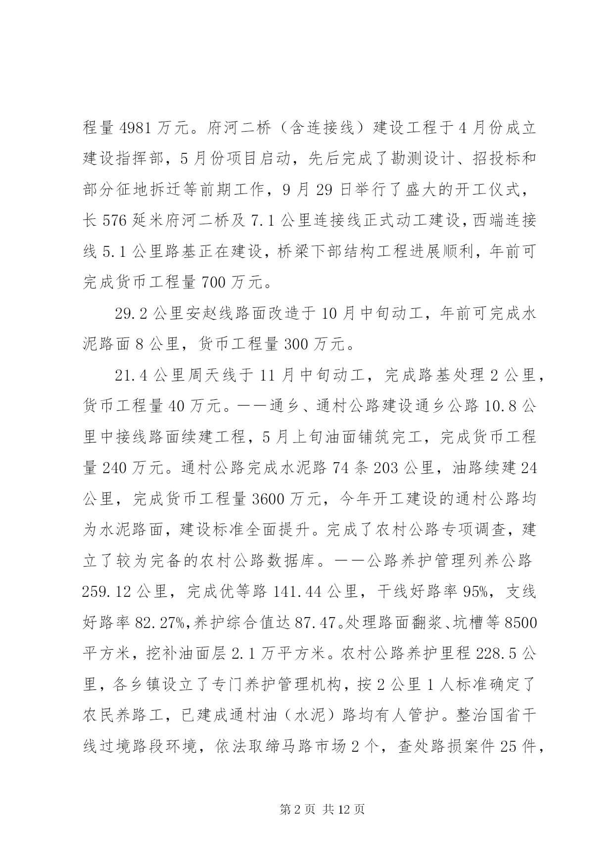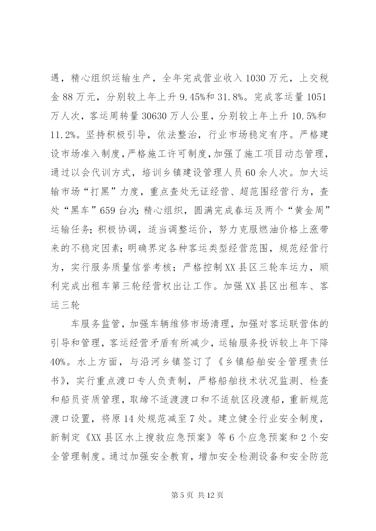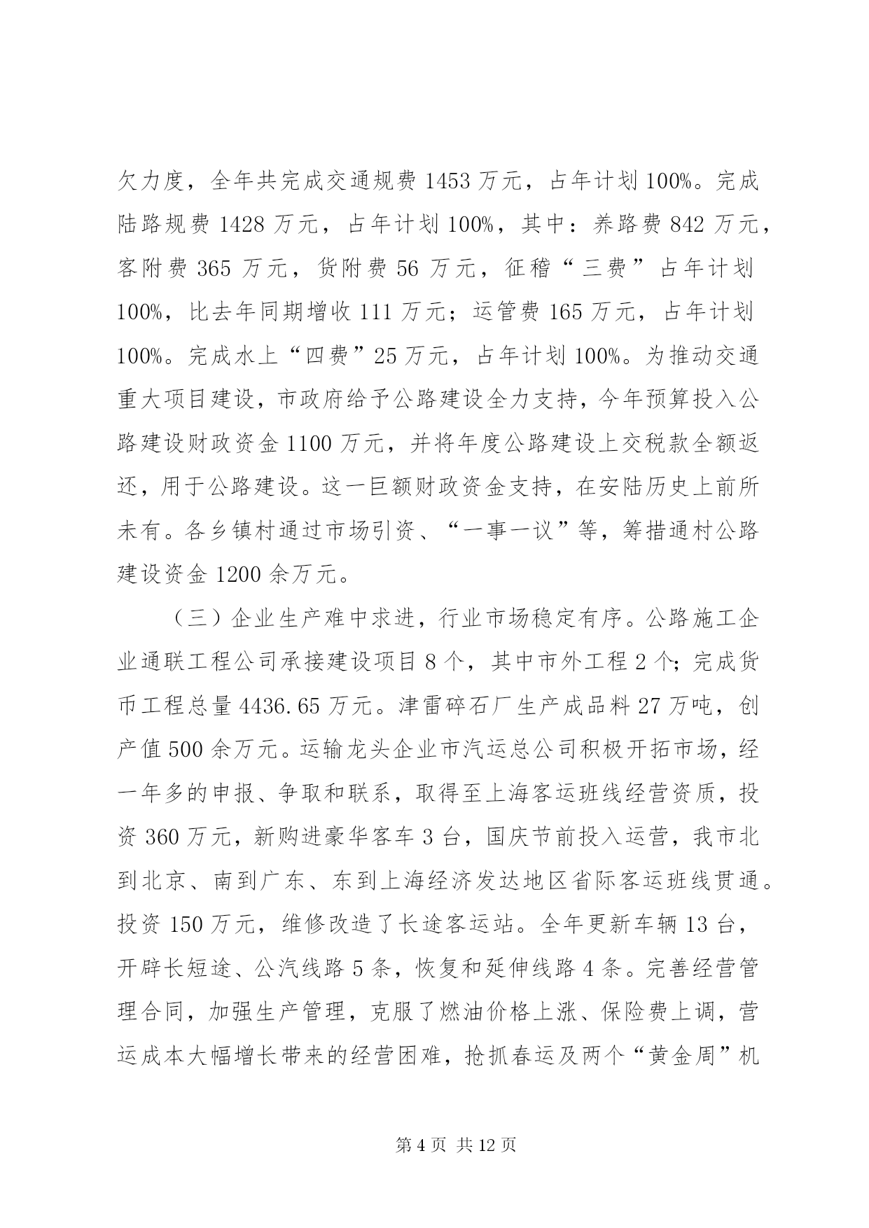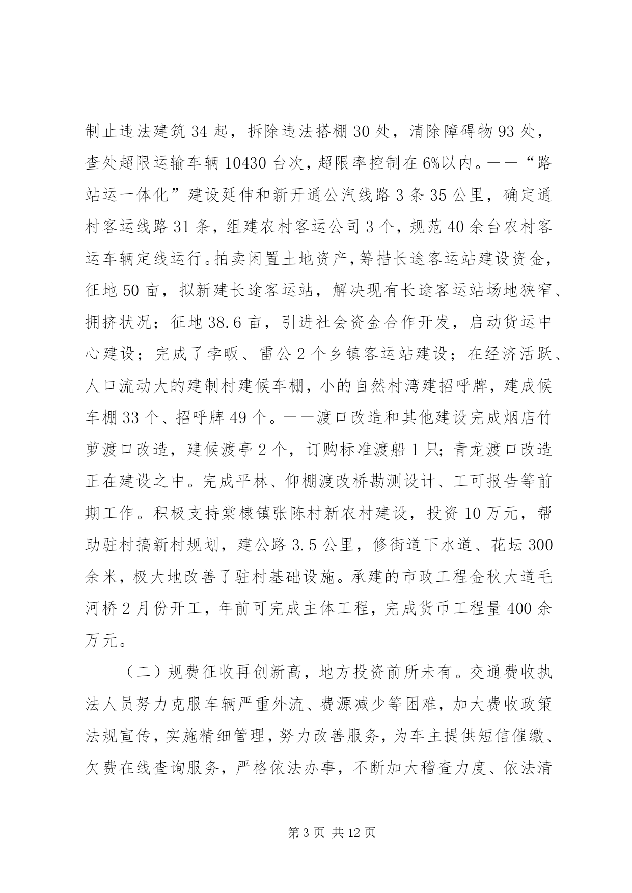 第PAGE\*Arabic\*MERGEFORMAT12页共NUMPAGES\*MERGEFORMAT12页交通局工作总结总结xx年,在市委市政府和___市交通局正确领导下,我局紧紧围绕年初确立的目标任务,高扬科学发展旗帜,转变发展观念,积极适应交通管理体制和运行机制“四个转变”新形势,应对新挑战,求真务实,奋力拼搏,扎实开展“交通发展提速创优年”和“项目建设年”活动,加快形成社会办交通工作格局,努力推进交通发展提速创优,基础设施建设步伐不断加快,服务经济和社会质量明显提升,较好地完成了年度各项工作任务,交通各项事业起步稳,步子快,“十一五”开局良好,交通局工作总结。一、主要工作完成情况:(一)基础设施建设加快,质量效益明显提升。“十一五”投资过千万元的交通重大建设项目均已开工。全市路网在建和开工建设里程336.83公里,完成交通建设投资1.2971亿元,分别占年计划171.48%和100.46%,较上年同期增长47.28%和35.12%。――干线路网建设14.7公里孛桃线改造工程,元月份开工,6月底完成路面基层,10月上旬全线油面铺筑竣工,完成货币工程量2950万元。316国道路面刷黑改造工程于3月底动工,经过破碎、挖除混凝土板,铺筑水泥稳定砂基层、水稳调平层、油面下封层、油面下层及上面层多道工序施工,至10月底,除汉丹铁路跨线桥和毛河桥加宽改建两端连接线未完成外,全线路面竣工,其中XX县区段3.86公里加宽至34米,完成货币工程量4981万元。府河二桥(含连接线)建设工程于4月份成立建设指挥部,5月份项目启动,先后完成了勘测设计、招投标和部分征地拆迁等前期工作,9月29日举行了盛大的开工仪式,长576延米府河二桥及7.1公里连接线正式动工建设,西端连接线5.1公里路基正在建设,桥梁下部结构工程进展顺利,年前可完成货币工程量700万元。29.2公里安赵线路面改造于10月中旬动工,年前可完成水泥路面8公里,货币工程量300万元。21.4公里周天线于11月中旬动工,完成路基处理2公里,货币工程量40万元。――通乡、通村公路建设通乡公路10.8公里中接线路面续建工程,5月上旬油面铺筑完工,完成货币工程量240万元。通村公路完成水泥路74条203公里,油路续建24公里,完成货币工程量3600万元,今年开工建设的通村公路均为水泥路面,建设标准全面提升。完成了农村公路专项调查,建立了较为完备的农村公路数据库。――公路养护管理列养公路259.12公里,完成优等路141.44公里,干线好路率95%,支线好路率82.27%,养护综合值达87.47。处理路面翻浆、坑槽等8500平方米,挖补油面层2.1万平方米。农村公路养护里程228.5公里,各乡镇设立了专门养护管理机构,按2公里1人标准确定了农民养路工,已建成通村油(水泥)路均有人管护。整治国省干线过境路段环境,依法取缔马路市场2个,查处路损案件25件,制止违法建筑34起,拆除违法搭棚30处,清除障碍物93处,查处超限运输车辆10430台次,超限率控制在6%以内。――“路站运一体化”建设延伸和新开通公汽线路3条35公里,确定通村客运线路31条,组建农村客运公司3个,规范40余台农村客运车辆定线运行。拍卖闲置土地资产,筹措长途客运站建设资金,征地50亩,拟新建长途客运站,解决现有长途客运站场地狭窄、拥挤状况;征地38.6亩,引进社会资金合作开发,启动货运中心建设;完成了孛畈、雷公2个乡镇客运站建设;在经济活跃、人口流动大的建制村建候车棚,小的自然村湾建招呼牌,建成候车棚33个、招呼牌49个。――渡口改造和其他建设完成烟店竹萝渡口改造,建候渡亭2个,订购标准渡船1只;青龙渡口改造正在建设之中。完成平林、仰棚渡改桥勘测设计、工可报告等前期工作。积极支持棠棣镇张陈村新农村建设,投资10万元,帮助驻村搞新村规划,建公路3.5公里,修街道下水道、花坛300余米,极大地改善了驻村基础设施。承建的市政工程金秋大道毛河桥2月份开工,年前可完成主体工程,完成货币工程量400余万元。(二)规费征收再创新高,地方投资前所未有。交通费收执法人员努力克服车辆严重外流、费源减少等困难,加大费收政策法规宣传,实施精细管理,努力改善服务,为车主提供短信催缴、欠费在线查询服务,严格依法办事,不断加大稽查力度、依法清欠力度,全年共完成交通规费1453万元,占年计划100%。完成陆路规费1428万元,占年计划100%,其中:养路费842万元,客附费365万元,货附费56万元,征稽“三费”占年计划100%,比去年同期增收111万元;运管费165万元,占年计划100%。完成水上“四费”25万元,占年计划100%。为推动交通重大项目建设,市政府给予公路建设全力支持,今年预算投入公路建设财政资金1100万元,并将年