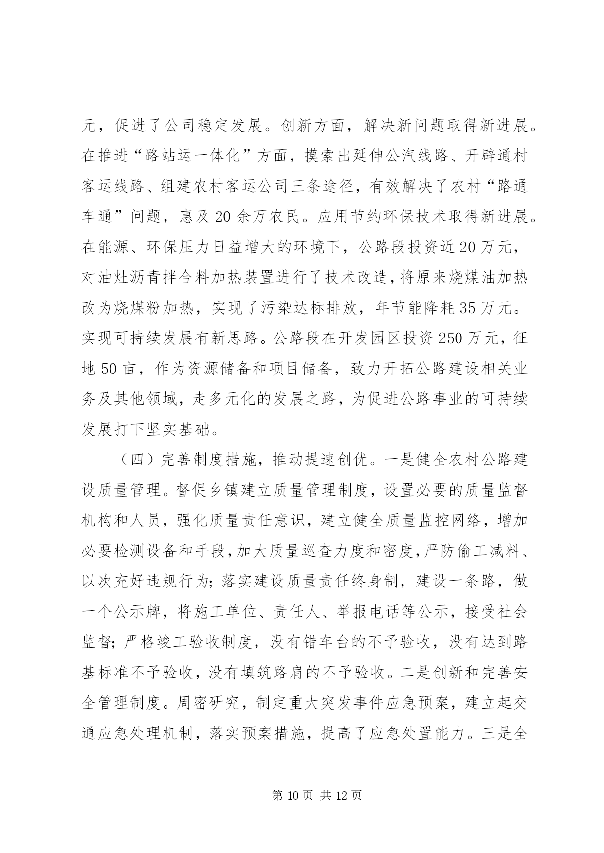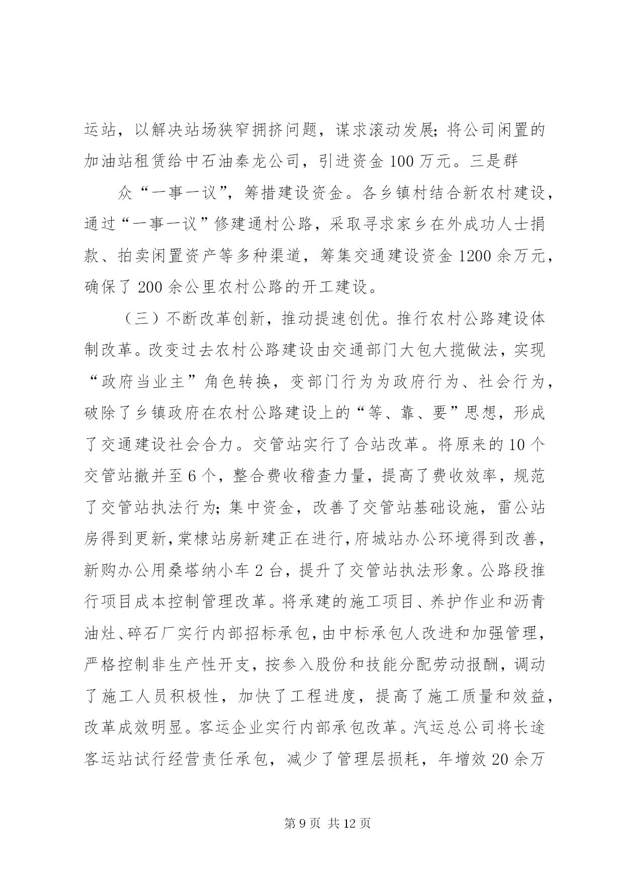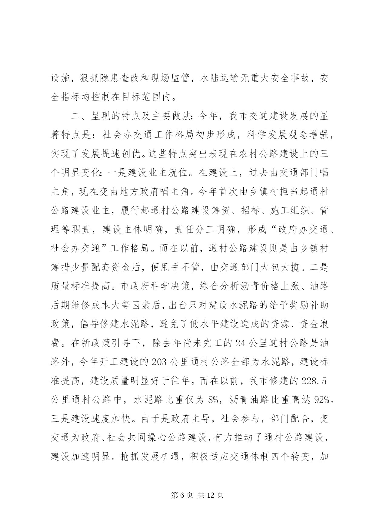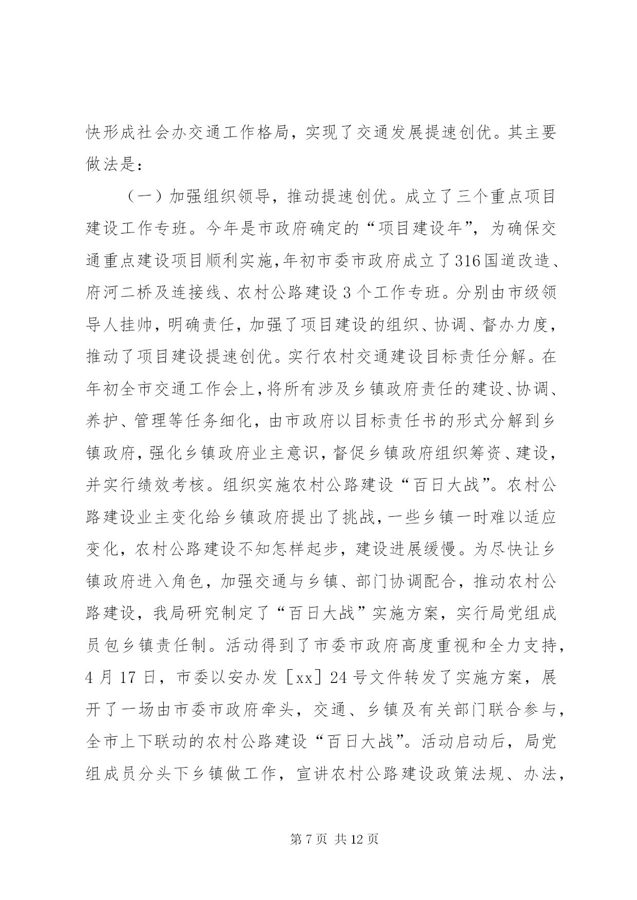 第PAGE\*Arabic\*MERGEFORMAT12页共NUMPAGES\*MERGEFORMAT12页交通局工作总结总结xx年,在市委市政府和___市交通局正确领导下,我局紧紧围绕年初确立的目标任务,高扬科学发展旗帜,转变发展观念,积极适应交通管理体制和运行机制“四个转变”新形势,应对新挑战,求真务实,奋力拼搏,扎实开展“交通发展提速创优年”和“项目建设年”活动,加快形成社会办交通工作格局,努力推进交通发展提速创优,基础设施建设步伐不断加快,服务经济和社会质量明显提升,较好地完成了年度各项工作任务,交通各项事业起步稳,步子快,“十一五”开局良好,交通局工作总结。一、主要工作完成情况:(一)基础设施建设加快,质量效益明显提升。“十一五”投资过千万元的交通重大建设项目均已开工。全市路网在建和开工建设里程336.83公里,完成交通建设投资1.2971亿元,分别占年计划171.48%和100.46%,较上年同期增长47.28%和35.12%。――干线路网建设14.7公里孛桃线改造工程,元月份开工,6月底完成路面基层,10月上旬全线油面铺筑竣工,完成货币工程量2950万元。316国道路面刷黑改造工程于3月底动工,经过破碎、挖除混凝土板,铺筑水泥稳定砂基层、水稳调平层、油面下封层、油面下层及上面层多道工序施工,至10月底,除汉丹铁路跨线桥和毛河桥加宽改建两端连接线未完成外,全线路面竣工,其中XX县区段3.86公里加宽至34米,完成货币工程量4981万元。府河二桥(含连接线)建设工程于4月份成立建设指挥部,5月份项目启动,先后完成了勘测设计、招投标和部分征地拆迁等前期工作,9月29日举行了盛大的开工仪式,长576延米府河二桥及7.1公里连接线正式动工建设,西端连接线5.1公里路基正在建设,桥梁下部结构工程进展顺利,年前可完成货币工程量700万元。29.2公里安赵线路面改造于10月中旬动工,年前可完成水泥路面8公里,货币工程量300万元。21.4公里周天线于11月中旬动工,完成路基处理2公里,货币工程量40万元。――通乡、通村公路建设通乡公路10.8公里中接线路面续建工程,5月上旬油面铺筑完工,完成货币工程量240万元。通村公路完成水泥路74条203公里,油路续建24公里,完成货币工程量3600万元,今年开工建设的通村公路均为水泥路面,建设标准全面提升。完成了农村公路专项调查,建立了较为完备的农村公路数据库。――公路养护管理列养公路259.12公里,完成优等路141.44公里,干线好路率95%,支线好路率82.27%,养护综合值达87.47。处理路面翻浆、坑槽等8500平方米,挖补油面层2.1万平方米。农村公路养护里程228.5公里,各乡镇设立了专门养护管理机构,按2公里1人标准确定了农民养路工,已建成通村油(水泥)路均有人管护。整治国省干线过境路段环境,依法取缔马路市场2个,查处路损案件25件,制止违法建筑34起,拆除违法搭棚30处,清除障碍物93处,查处超限运输车辆10430台次,超限率控制在6%以内。――“路站运一体化”建设延伸和新开通公汽线路3条35公里,确定通村客运线路31条,组建农村客运公司3个,规范40余台农村客运车辆定线运行。拍卖闲置土地资产,筹措长途客运站建设资金,征地50亩,拟新建长途客运站,解决现有长途客运站场地狭窄、拥挤状况;征地38.6亩,引进社会资金合作开发,启动货运中心建设;完成了孛畈、雷公2个乡镇客运站建设;在经济活跃、人口流动大的建制村建候车棚,小的自然村湾建招呼牌,建成候车棚33个、招呼牌49个。――渡口改造和其他建设完成烟店竹萝渡口改造,建候渡亭2个,订购标准渡船1只;青龙渡口改造正在建设之中。完成平林、仰棚渡改桥勘测设计、工可报告等前期工作。积极支持棠棣镇张陈村新农村建设,投资10万元,帮助驻村搞新村规划,建公路3.5公里,修街道下水道、花坛300余米,极大地改善了驻村基础设施。承建的市政工程金秋大道毛河桥2月份开工,年前可完成主体工程,完成货币工程量400余万元。(二)规费征收再创新高,地方投资前所未有。交通费收执法人员努力克服车辆严重外流、费源减少等困难,加大费收政策法规宣传,实施精细管理,努力改善服务,为车主提供短信催缴、欠费在线查询服务,严格依法办事,不断加大稽查力度、依法清欠力度,全年共完成交通规费1453万元,占年计划100%。完成陆路规费1428万元,占年计划100%,其中:养路费842万元,客附费365万元,货附费56万元,征稽“三费”占年计划100%,比去年同期增收111万元;运管费165万元,占年计划100%。完成水上“四费”25万元,占年计划100%。为推动交通重大项目建设,市政府给予公路建设全力支持,今年预算投入公路建设财政资金1100万元,并将年