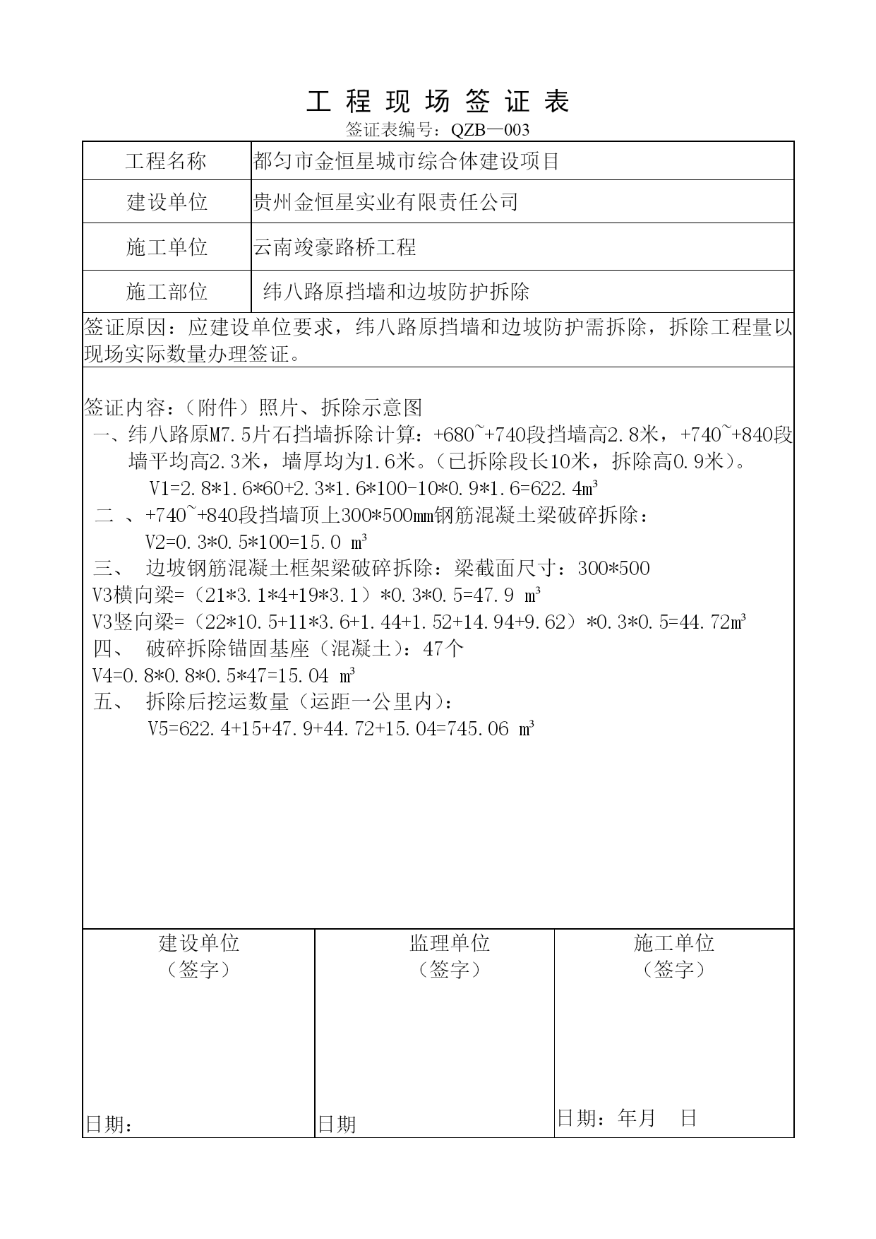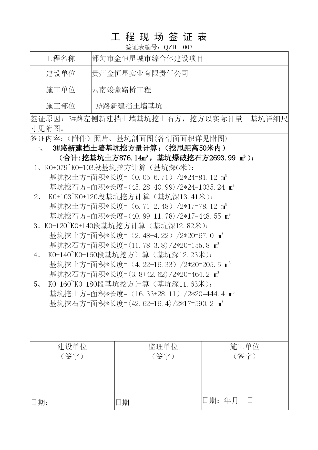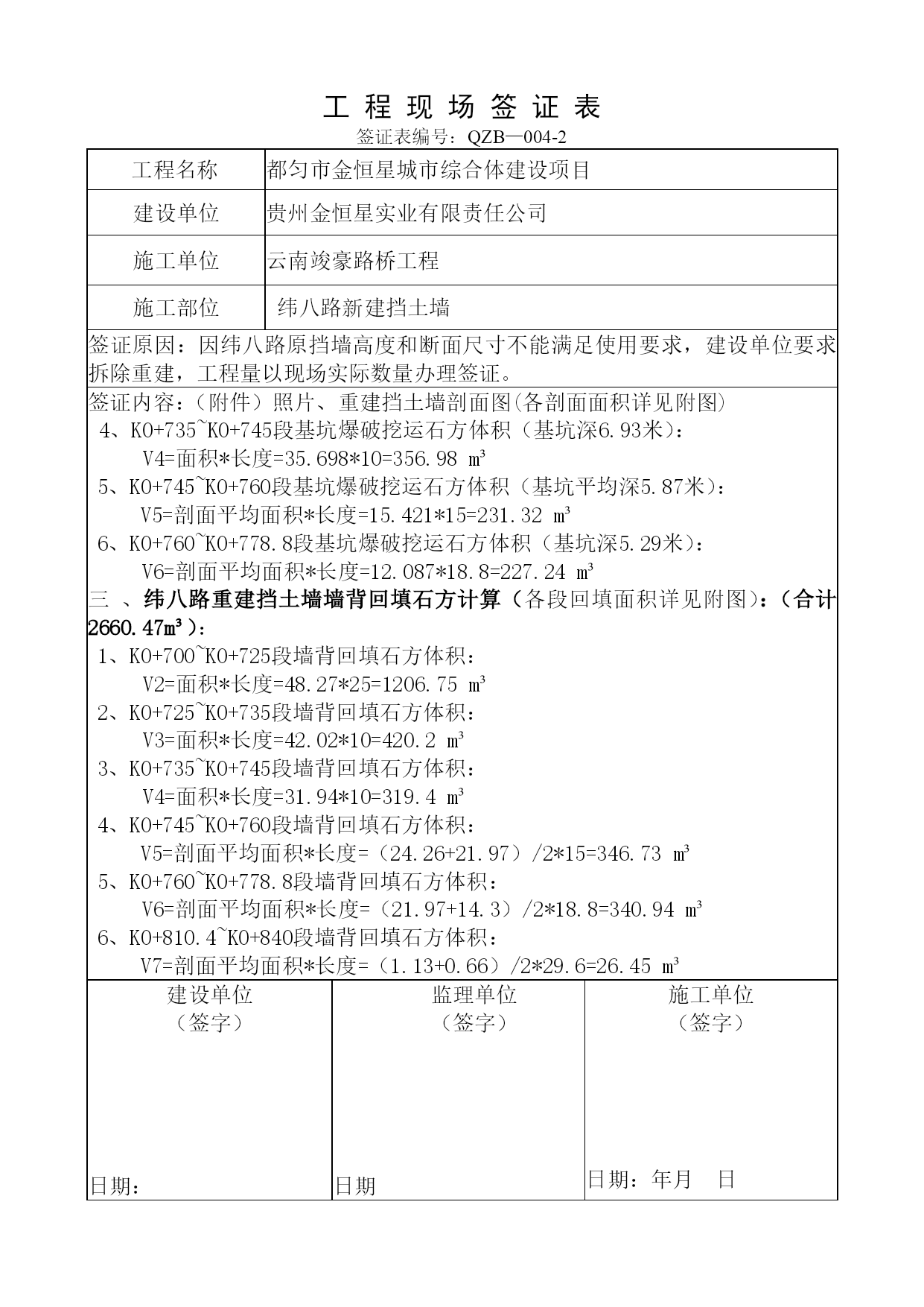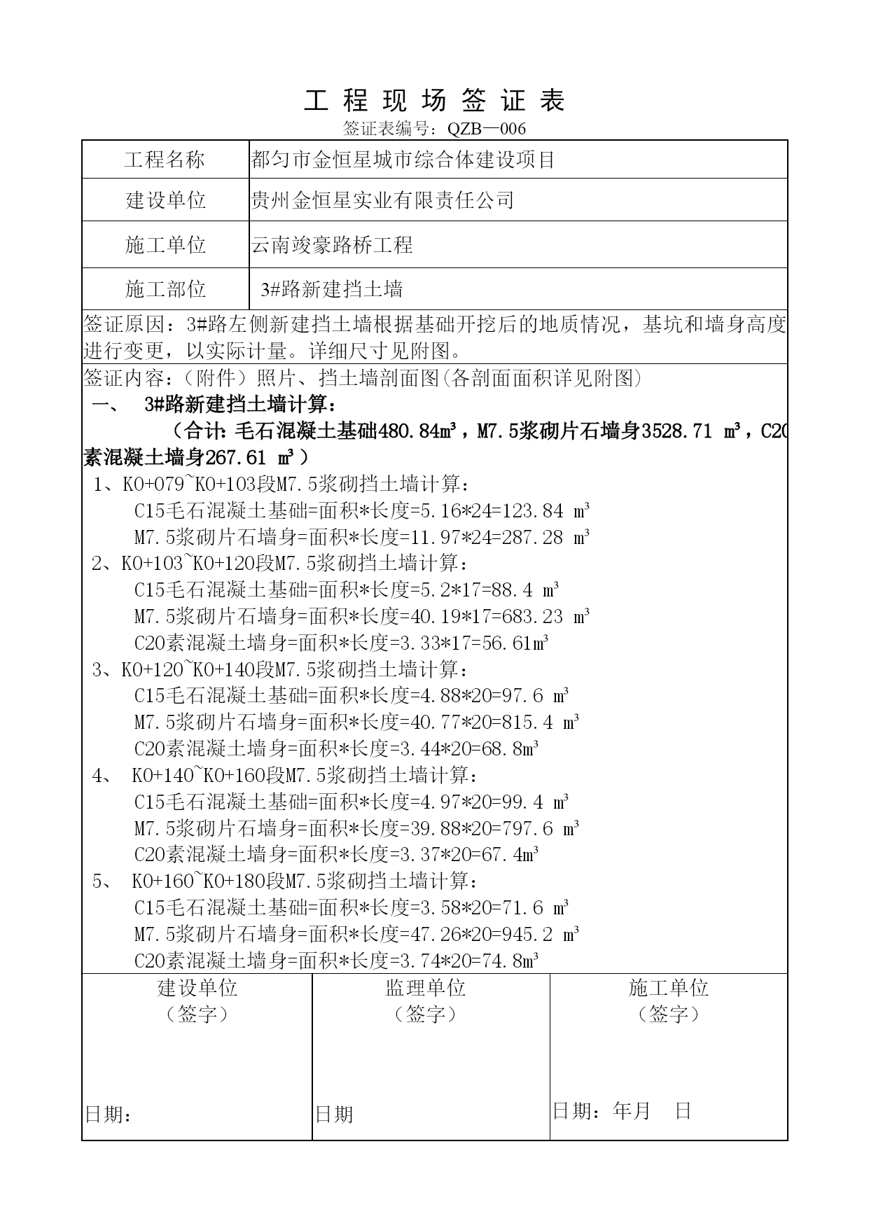 工程现场签证表优质资料(可以直接使用,可编辑优质资料,欢迎下载)工程现场签证表编号:QZB—001工程名称都匀市金恒星城市综合体建设项目建设单位贵州金恒星实业有限责任公司施工单位云南竣豪路桥工程施工部位3号路挡土墙基础地勘签证原因:3号路挡土墙基础做地勘,建设单位要求为地勘单位吊钻探设备至3号路KO+040处。签证内容:(附件)一、卡特320挖机为地勘单位吊钻探设备至3号路K0+040处:0.5台班建设单位(签字)日期:监理单位(签字)日期施工单位(签字)日期:2021年11月18工程现场签证表签证表编号:QZB—002工程名称都匀市金恒星城市综合体建设项目建设单位贵州金恒星实业有限责任公司施工单位云南竣豪路桥工程施工部位吊卸水泥管签证原因:卡特挖机吊卸水泥管至地面。签证内容:(附件)一、卡特320挖机吊卸直径1.5米水泥管:2台班建设单位(签字)日期:监理单位(签字)日期施工单位(签字)日期:年月日工程现场签证表签证表编号:QZB—003工程名称都匀市金恒星城市综合体建设项目建设单位贵州金恒星实业有限责任公司施工单位云南竣豪路桥工程施工部位纬八路原挡墙和边坡防护拆除签证原因:应建设单位要求,纬八路原挡墙和边坡防护需拆除,拆除工程量以现场实际数量办理签证。签证内容:(附件)照片、拆除示意图纬八路原M7.5片石挡墙拆除计算:+680~+740段挡墙高2.8米,+740~+840段墙平均高2.3米,墙厚均为1.6米。(已拆除段长10米,拆除高0.9米)。V1=2.8*1.6*60+2.3*1.6*100-10*0.9*1.6=622.4m³二、+740~+840段挡墙顶上300*500mm钢筋混凝土梁破碎拆除:V2=0.3*0.5*100=15.0m³边坡钢筋混凝土框架梁破碎拆除:梁截面尺寸:300*500V3横向梁=(21*3.1*4+19*3.1)*0.3*0.5=47.9m³V3竖向梁=(22*10.5+11*3.6+1.44+1.52+14.94+9.62)*0.3*0.5=44.72m³破碎拆除锚固基座(混凝土):47个V4=0.8*0.8*0.5*47=15.04m³拆除后挖运数量(运距一公里内):V5=622.4+15+47.9+44.72+15.04=745.06m³建设单位(签字)日期:监理单位(签字)日期施工单位(签字)日期:年月日工程现场签证表签证表编号:QZB—004-1工程名称都匀市金恒星城市综合体建设项目建设单位贵州金恒星实业有限责任公司施工单位云南竣豪路桥工程施工部位纬八路新建挡土墙签证原因:因纬八路原挡墙高度和断面尺寸不能满足使用要求,建设单位要求拆除重建,工程量以现场实际数量办理签证。签证内容:(附件)照片、重建挡土墙剖面图(各剖面面积详见附图)纬八路重建挡土墙(M7.5浆砌片石)砌筑量计算:(合计1463.5m³):KO+700~K0+725段M7.5浆砌挡土墙体积:V1=面积*长度=27.402*25=685.05m³2、K0+725~K0+735段M7.5浆砌挡土墙体积:V2=面积*长度=24.33*10=243.3m³3、K0+735~K0+745段M7.5浆砌挡土墙体积:V3=面积*长度=19.436*10=194.36m³4、K0+745~K0+760段M7.5浆砌挡土墙体积:V4=剖面平均面积*长度=8.365*15=125.48m³5、K0+760~K0+778.8段M7.5浆砌挡土墙体积:V5=剖面平均面积*长度=7.54*18.8=141.75m³6、K0+810.4~K0+840段M7.5浆砌挡土墙体积:V6=剖面平均面积*长度=2.485*29.6=73.56m³二、纬八路重建挡土墙基坑石方爆破挖运计算(运距均为一公里内):(合计4008.13m³):1、KO+680~K0+700段基坑爆破挖运石方体积(基坑深10.25米):V1=面积*长度=69.85*20=1397.0m³2、K0+700~K0+725段基坑爆破挖运石方体积(基坑深8.6米):V2=面积*长度=52.827*25=1320.68m³3、K0+725~K0+735段基坑爆破挖运石方体积(基坑深8米):V3=面积*长度=47.491*10=474.91m³建设单位(签字)日期:监理单位(签字)日期施工单位(签字)日期:年月日工程现场签证表签证表编号:QZ