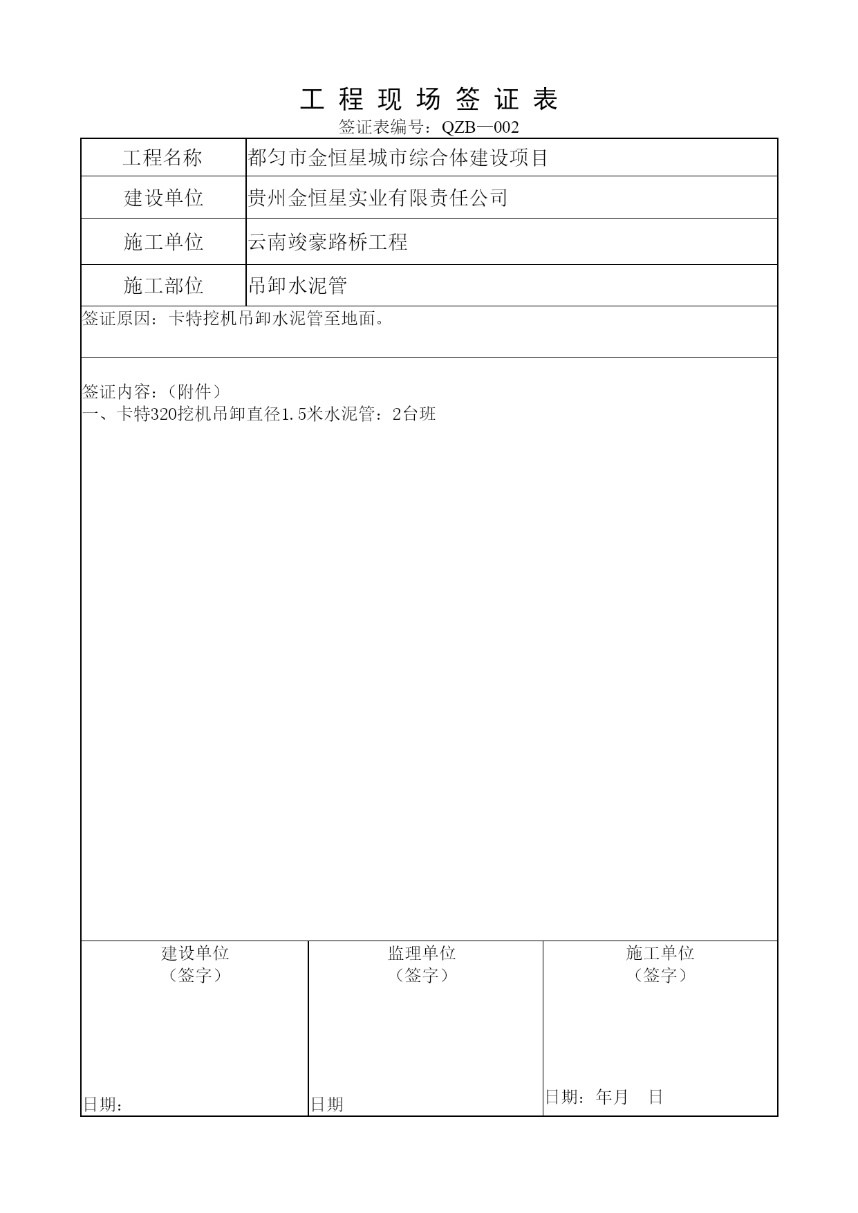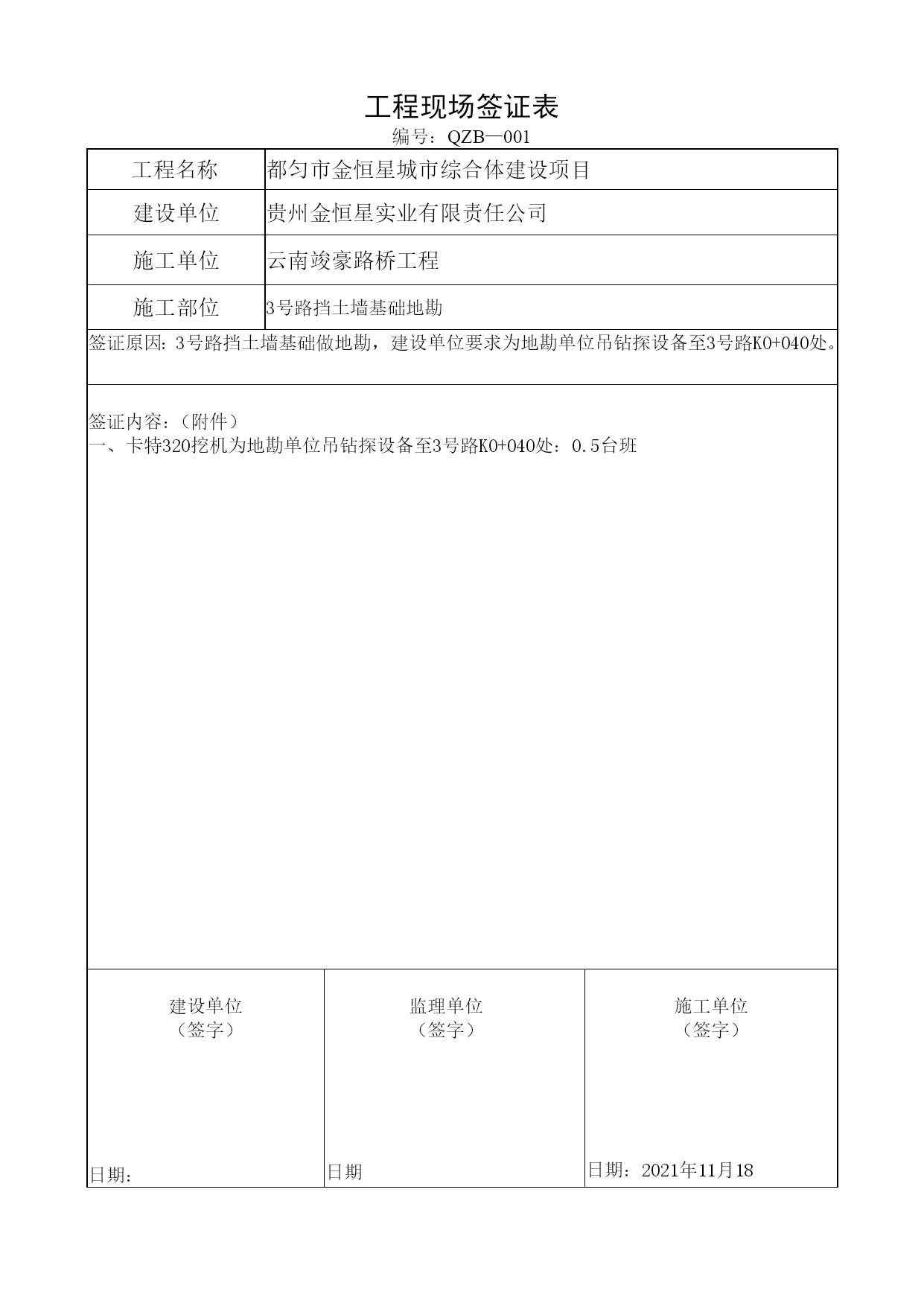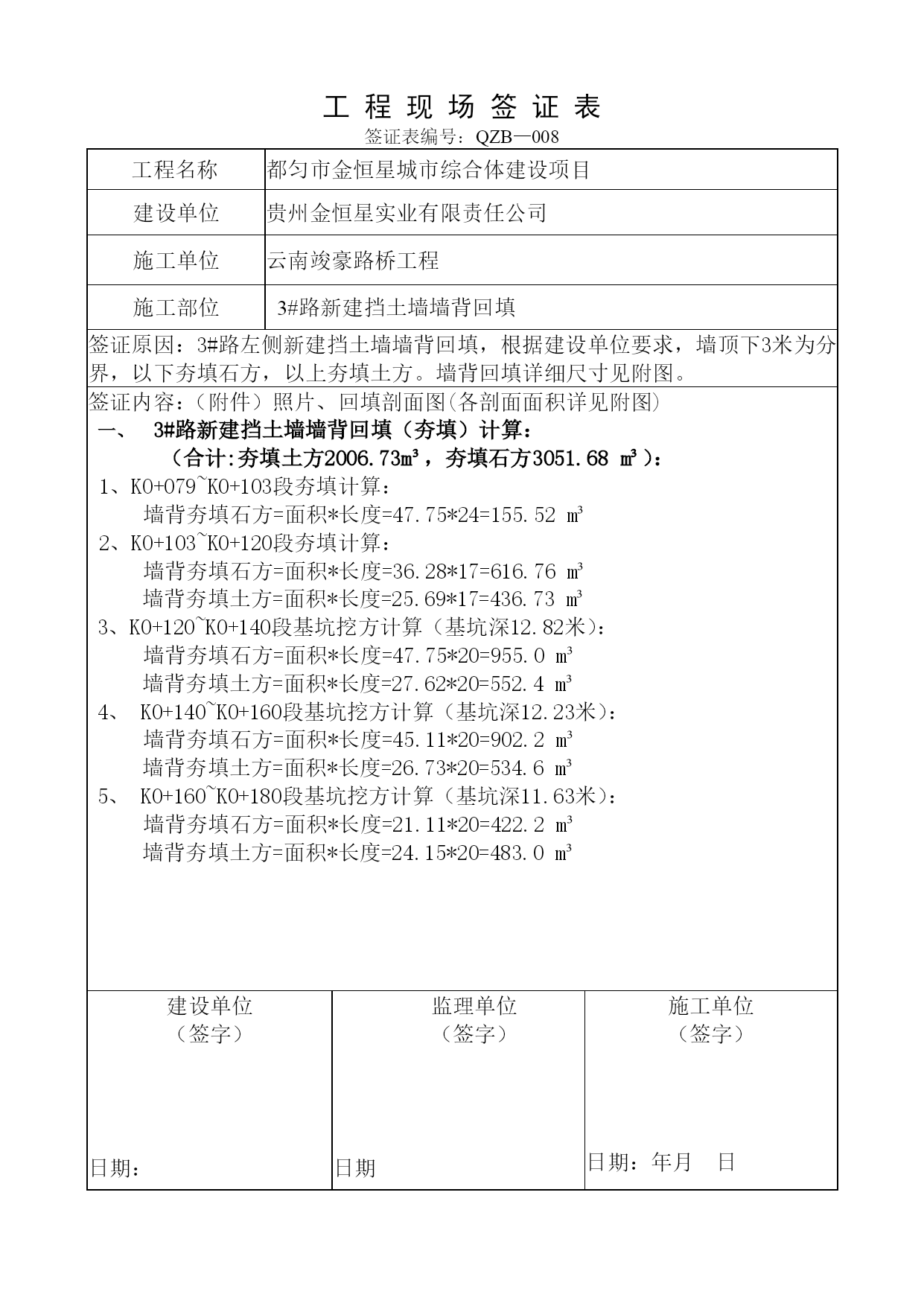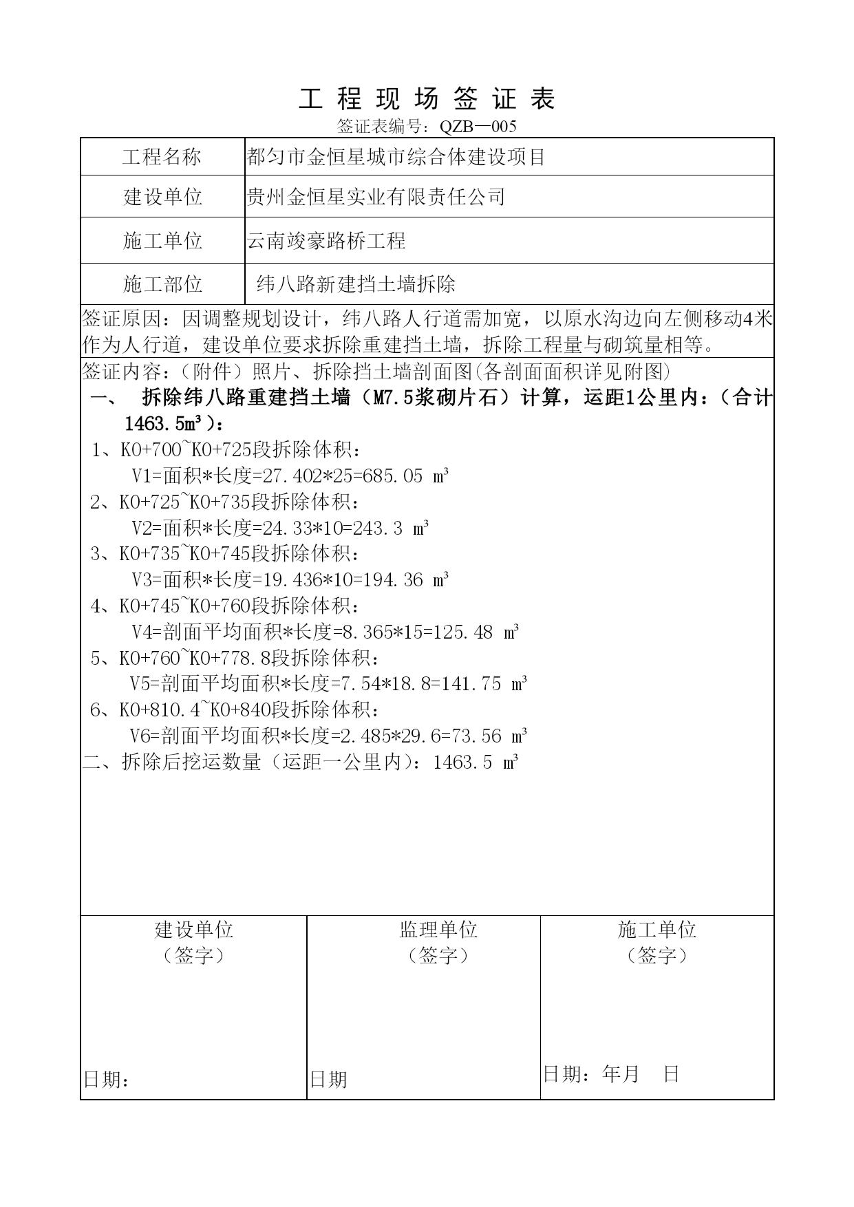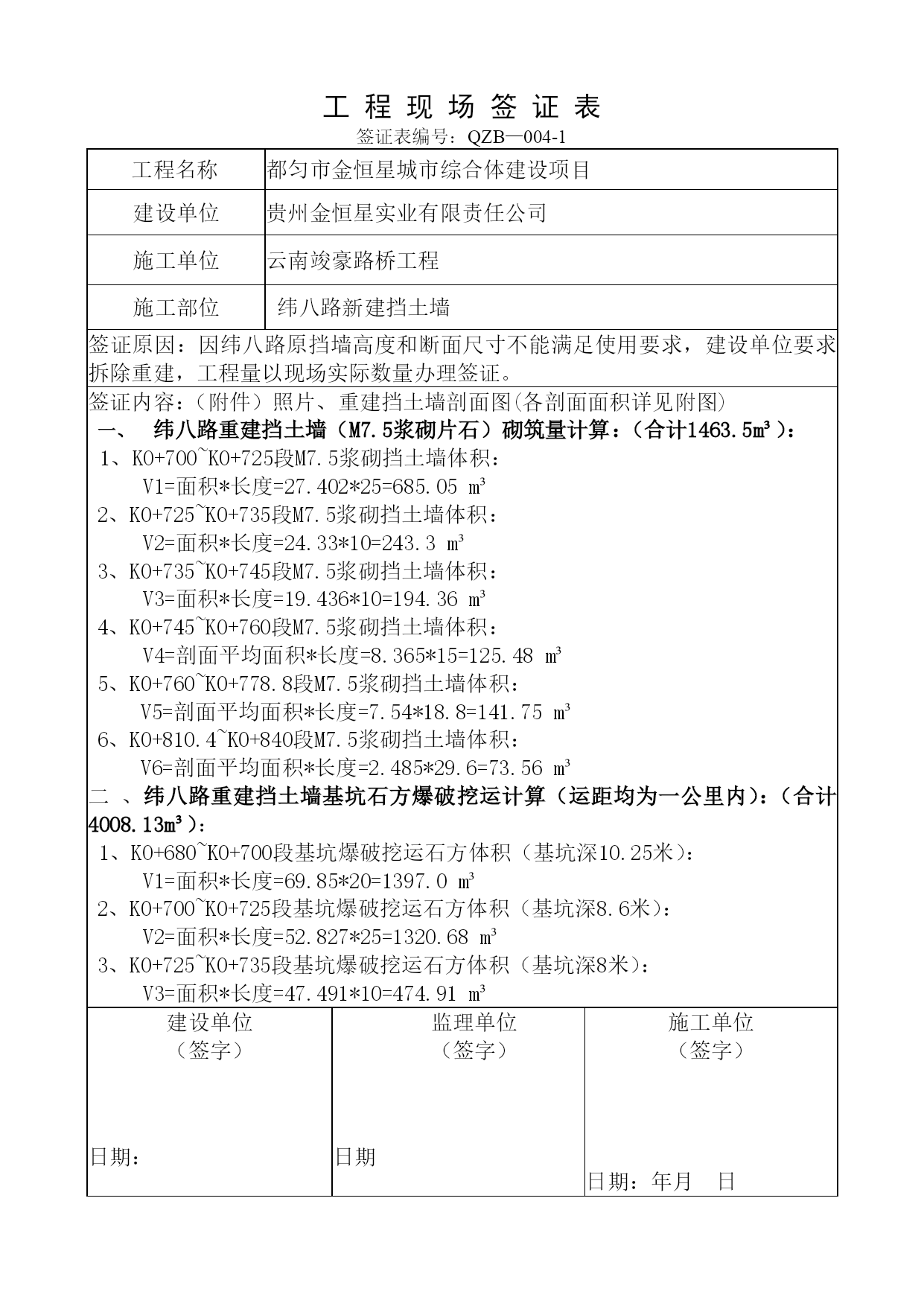 工程现场签证表优质资料(可以直接使用,可编辑优质资料,欢迎下载)工程现场签证表编号:QZB—001工程名称都匀市金恒星城市综合体建设项目建设单位贵州金恒星实业有限责任公司施工单位云南竣豪路桥工程施工部位3号路挡土墙基础地勘签证原因:3号路挡土墙基础做地勘,建设单位要求为地勘单位吊钻探设备至3号路KO+040处。签证内容:(附件)一、卡特320挖机为地勘单位吊钻探设备至3号路K0+040处:0.5台班建设单位(签字)日期:监理单位(签字)日期施工单位(签字)日期:2021年11月18工程现场签证表签证表编号:QZB—002工程名称都匀市金恒星城市综合体建设项目建设单位贵州金恒星实业有限责任公司施工单位云南竣豪路桥工程施工部位吊卸水泥管签证原因:卡特挖机吊卸水泥管至地面。签证内容:(附件)一、卡特320挖机吊卸直径1.5米水泥管:2台班建设单位(签字)日期:监理单位(签字)日期施工单位(签字)日期:年月日工程现场签证表签证表编号:QZB—003工程名称都匀市金恒星城市综合体建设项目建设单位贵州金恒星实业有限责任公司施工单位云南竣豪路桥工程施工部位纬八路原挡墙和边坡防护拆除签证原因:应建设单位要求,纬八路原挡墙和边坡防护需拆除,拆除工程量以现场实际数量办理签证。签证内容:(附件)照片、拆除示意图纬八路原M7.5片石挡墙拆除计算:+680~+740段挡墙高2.8米,+740~+840段墙平均高2.3米,墙厚均为1.6米。(已拆除段长10米,拆除高0.9米)。V1=2.8*1.6*60+2.3*1.6*100-10*0.9*1.6=622.4m³二、+740~+840段挡墙顶上300*500mm钢筋混凝土梁破碎拆除:V2=0.3*0.5*100=15.0m³边坡钢筋混凝土框架梁破碎拆除:梁截面尺寸:300*500V3横向梁=(21*3.1*4+19*3.1)*0.3*0.5=47.9m³V3竖向梁=(22*10.5+11*3.6+1.44+1.52+14.94+9.62)*0.3*0.5=44.72m³破碎拆除锚固基座(混凝土):47个V4=0.8*0.8*0.5*47=15.04m³拆除后挖运数量(运距一公里内):V5=622.4+15+47.9+44.72+15.04=745.06m³建设单位(签字)日期:监理单位(签字)日期施工单位(签字)日期:年月日工程现场签证表签证表编号:QZB—004-1工程名称都匀市金恒星城市综合体建设项目建设单位贵州金恒星实业有限责任公司施工单位云南竣豪路桥工程施工部位纬八路新建挡土墙签证原因:因纬八路原挡墙高度和断面尺寸不能满足使用要求,建设单位要求拆除重建,工程量以现场实际数量办理签证。签证内容:(附件)照片、重建挡土墙剖面图(各剖面面积详见附图)纬八路重建挡土墙(M7.5浆砌片石)砌筑量计算:(合计1463.5m³):KO+700~K0+725段M7.5浆砌挡土墙体积:V1=面积*长度=27.402*25=685.05m³2、K0+725~K0+735段M7.5浆砌挡土墙体积:V2=面积*长度=24.33*10=243.3m³3、K0+735~K0+745段M7.5浆砌挡土墙体积:V3=面积*长度=19.436*10=194.36m³4、K0+745~K0+760段M7.5浆砌挡土墙体积:V4=剖面平均面积*长度=8.365*15=125.48m³5、K0+760~K0+778.8段M7.5浆砌挡土墙体积:V5=剖面平均面积*长度=7.54*18.8=141.75m³6、K0+810.4~K0+840段M7.5浆砌挡土墙体积:V6=剖面平均面积*长度=2.485*29.6=73.56m³二、纬八路重建挡土墙基坑石方爆破挖运计算(运距均为一公里内):(合计4008.13m³):1、KO+680~K0+700段基坑爆破挖运石方体积(基坑深10.25米):V1=面积*长度=69.85*20=1397.0m³2、K0+700~K0+725段基坑爆破挖运石方体积(基坑深8.6米):V2=面积*长度=52.827*25=1320.68m³3、K0+725~K0+735段基坑爆破挖运石方体积(基坑深8米):V3=面积*长度=47.491*10=474.91m³建设单位(签字)日期:监理单位(签字)日期施工单位(签字)日期:年月日工程现场签证表签证表编号:QZ
