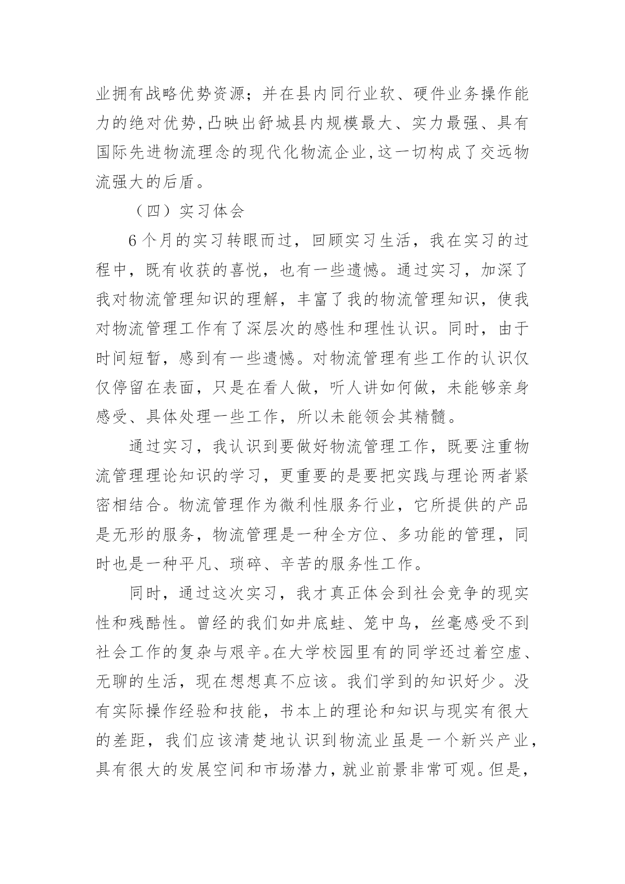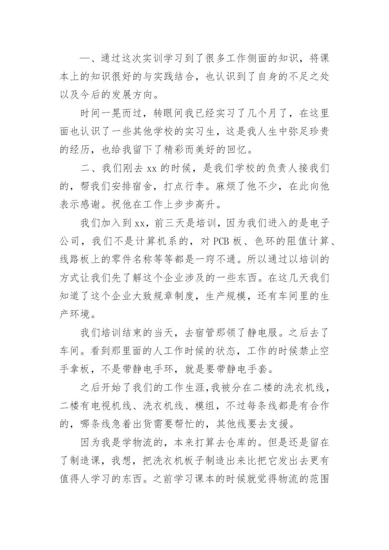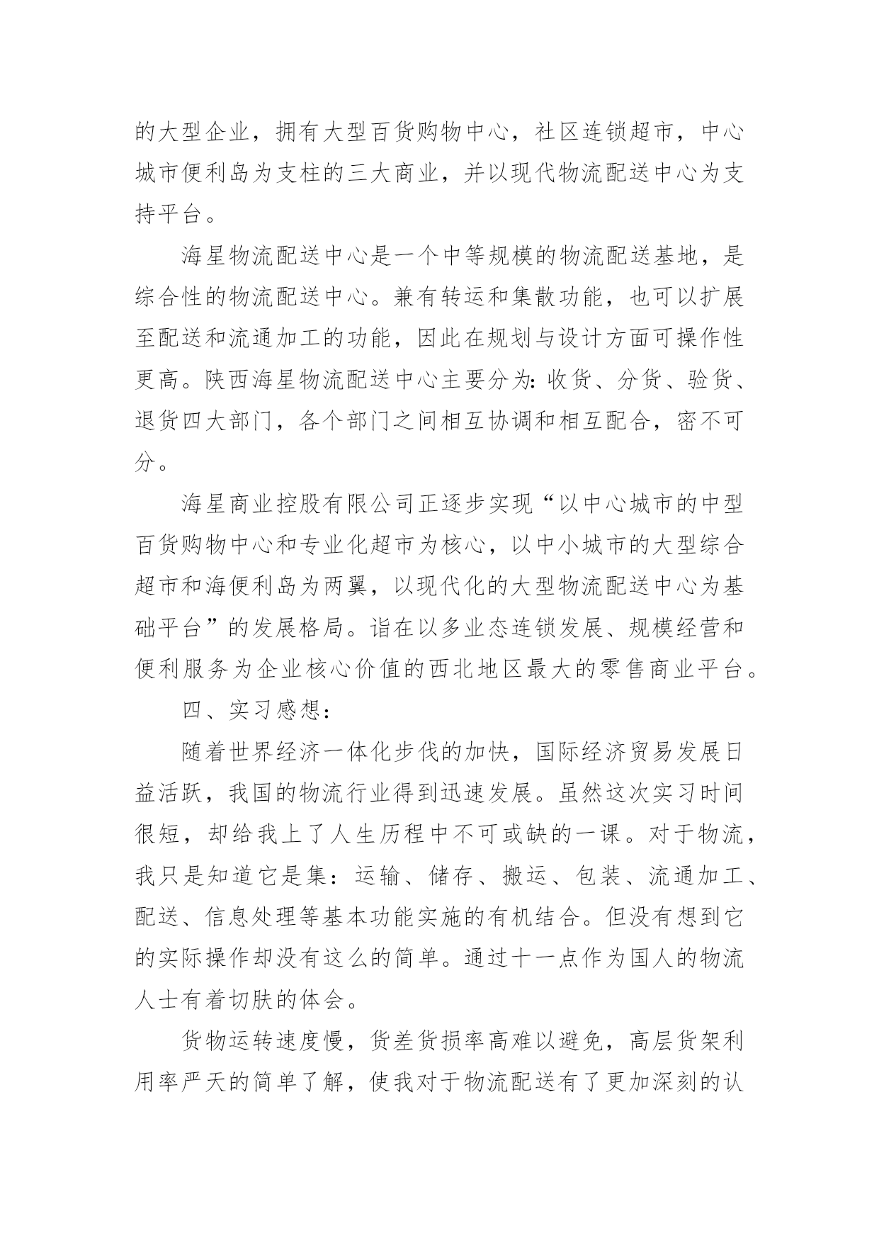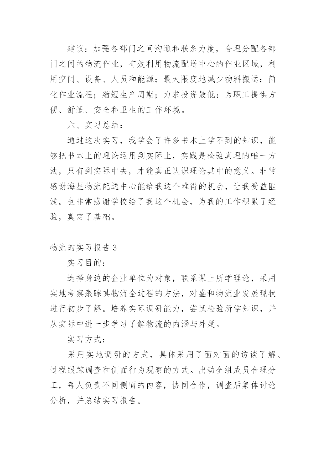 物流的实习报告[荐]物流的实习报告15篇在人们越来越注重自身素养的今天,报告与我们的生活紧密相连,不同种类的报告具有不同的用途。其实写报告并没有想象中那么难,下面是小编为大家收集的物流的实习报告,希望能够帮助到大家。物流的实习报告1实习目的:以xx经济建设发展中的各个类型物流企业和企业物流管理的相关内容作为对象,进行实地学习与实践。运用所学习的专业知识来了解物流的工作流程和工作内容,加深对物理工作的认识,将理论联系于实践,培养实际工作能力和分析解决问题的能力,达到学以致用的目的,为成功走向社会做准备。实习地点:xx市经开区xx电子实习内容:熟悉电子厂的流通加工,掌握了洗衣机主板的生产、包装、已经入库过程,并在此过程中联系生产实际检验和强化所学专业知识,了解当前我市物流管理现状,为毕业以后的工作做好充分准备。—、通过这次实训学习到了很多工作侧面的知识,将课本上的知识很好的与实践结合,也认识到了自身的不足之处以及今后的发展方向。时间一晃而过,转眼间我已经实习了几个月了,在这里面也认识了一些其他学校的实习生,这是我人生中弥足珍贵的经历,也给我留下了精彩而美好的回忆。二、我们刚去xx的时候,是我们学校的负责人接我们的,帮我们安排宿舍,打点行李。麻烦了他不少,在此向他表示感谢。祝他在工作上步步高升。我们加入到xx,前三天是培训,因为我们进入的是电子公司,我们不是计算机系的,对PCB板、色环的阻值计算、线路板上的零件名称等等都是一窍不通。所以通过以培训的方式让我们先了解这个企业涉及的一些东西。在这几天我们知道了这个企业大致规章制度,生产规模,还有车间里的生产环境。我们培训结束的当天,去宿管那领了静电服。之后去了车间。看到那里面的人工作时候的状态,工作的时候禁止空手拿板,不是带静电手环,就是要带静电手套。之后开始了我们的工作生涯,我被分在二楼的洗衣机线,二楼有电视机线、洗衣机线、模组,不过每条线都是有合作的,哪条线急着出货需要帮忙的,其他线要去支援。因为我是学物流的,本来打算去仓库的。但是还是留在了制造课,我想,把洗衣机板子制造出来比把它发出去更有值得人学习的东西。之前学习课本的时候就觉得物流的范围太广了,实在是很难拿捏,尤其是我还没有掌握物流核心的的.职能。只能通过企业物流来侧面了解物流企业的工作。通过这次学习我明白了一个道理“实践是检验真理的唯一标准”,只有到实际中去,才能真正认识理论其中的意义。在这几个月的实习中,我学到了很多东西,很多在学校所学不到的,我对人际关系有了新的认识。在工作上不是你不喜欢谁,就不与他交流的。不能单凭自己的喜好就能否定对方的工作能力,只要站在对方的角度就能理解了。站在不同的位置所做的事也就不一样。在这次实习过程中我成长了不少。对工作本身,工作环境以及与同事上司之间处理关系的技巧有了新的了解感悟和体会,这对我以后的工作大有裨益。物流的实习报告2一、实习目的:为了以后能更好的适应工作和学习,学校组织到海星物流配送中心进行为期十天的实习。主要是为了了解物流的作业流程,以便对我国的物流业能有更深的了解。二、实习要求:了解物流的特点,主要设备和作业流程,对其进行分析。并依据学习的理论提出自己的意见。三、实习单位简介:配送中心是以组织配送性销售或供应,执行实物配送为主要职能的流通型结点。具有集货中心、分货中心的职能。海星商业控股有限公司是在海星连锁超市基础了发展起来的大型企业,拥有大型百货购物中心,社区连锁超市,中心城市便利岛为支柱的三大商业,并以现代物流配送中心为支持平台。海星物流配送中心是一个中等规模的物流配送基地,是综合性的物流配送中心。兼有转运和集散功能,也可以扩展至配送和流通加工的功能,因此在规划与设计方面可操作性更高。陕西海星物流配送中心主要分为:收货、分货、验货、退货四大部门,各个部门之间相互协调和相互配合,密不可分。海星商业控股有限公司正逐步实现“以中心城市的中型百货购物中心和专业化超市为核心,以中小城市的大型综合超市和海便利岛为两翼,以现代化的大型物流配送中心为基础平台”的发展格局。诣在以多业态连锁发展、规模经营和便利服务为企业核心价值的西北地区最大的零售商业平台。四、实习感想:随着世界经济一体化步伐的加快,国际经济贸易发展日益活跃,我国的物流行业得到迅速发展。虽然这次实习时间很短,却给我上了人生历程中不可或缺的一课。对于物流,我只是知道它是集:运输、储存、搬运、包装、流通加工、配送、信息处理等基本功能实施的有机结合。但没有想到它的实际操作却没有这么的简单。通过十一点作为国人的物流人士有着切肤的体会。货物运转速度慢,货差货损率高难以避免,高层货架利用率严天的简单了解,使我对于物流配送有了更加深刻的认识。中国的物流业虽然没有国外发达,但这并代表中国物流业的落后,一些原则性[譬如中国劳动力廉价的国情]严