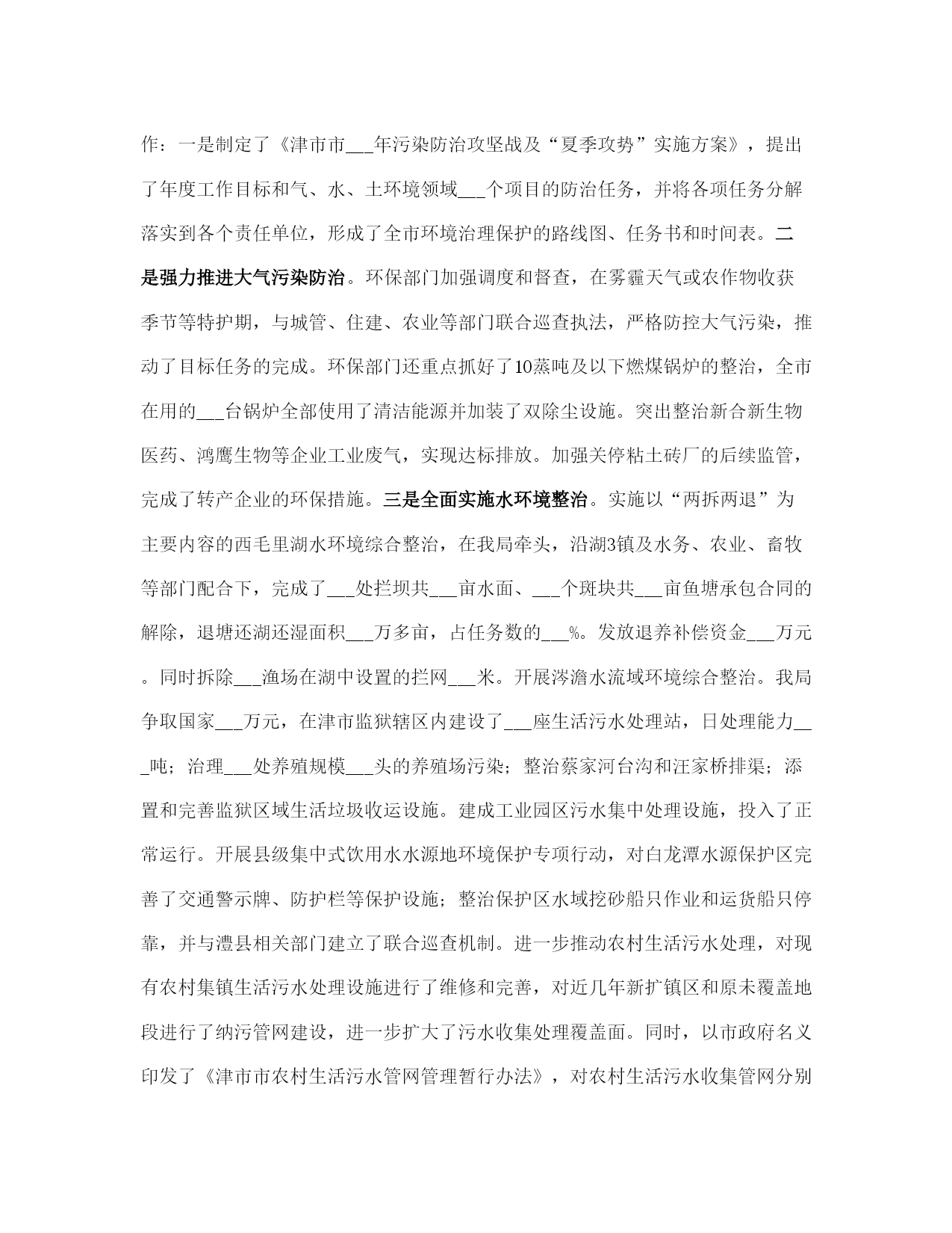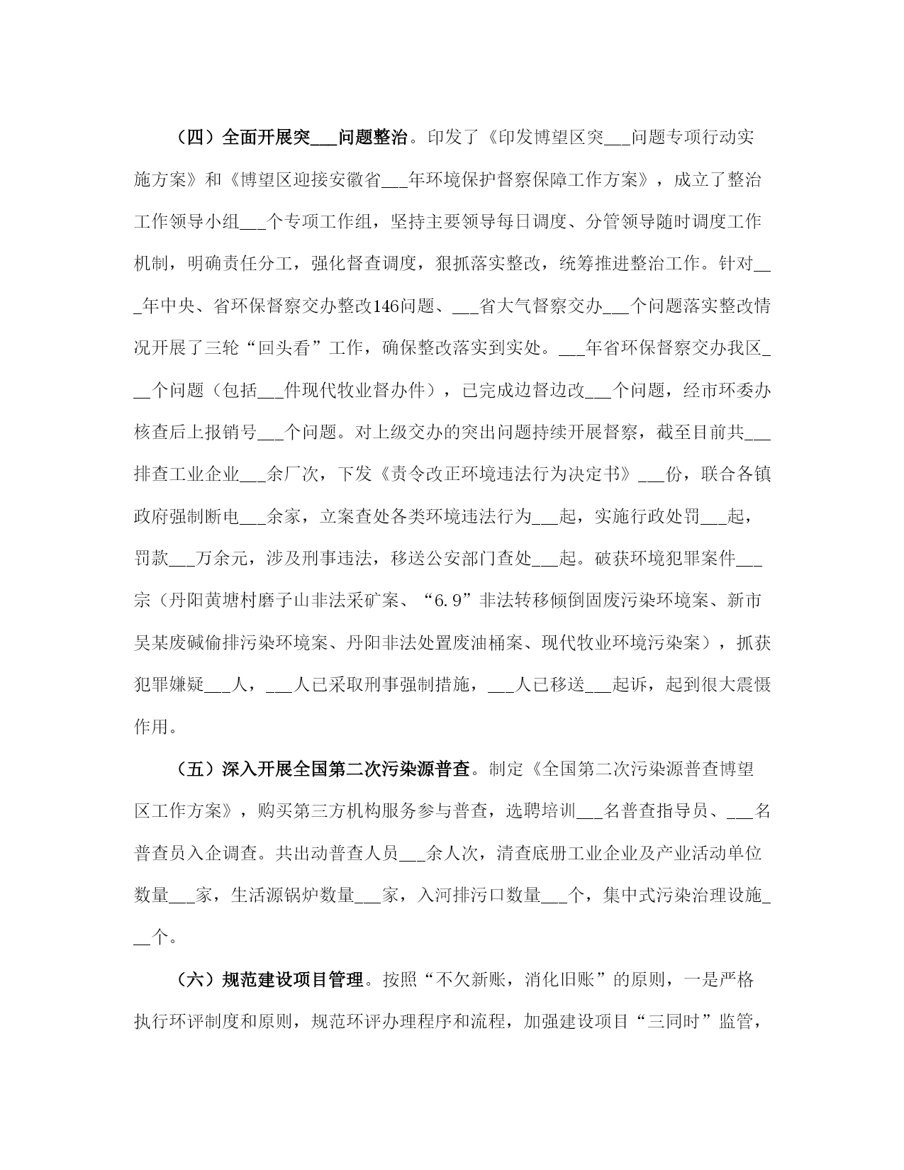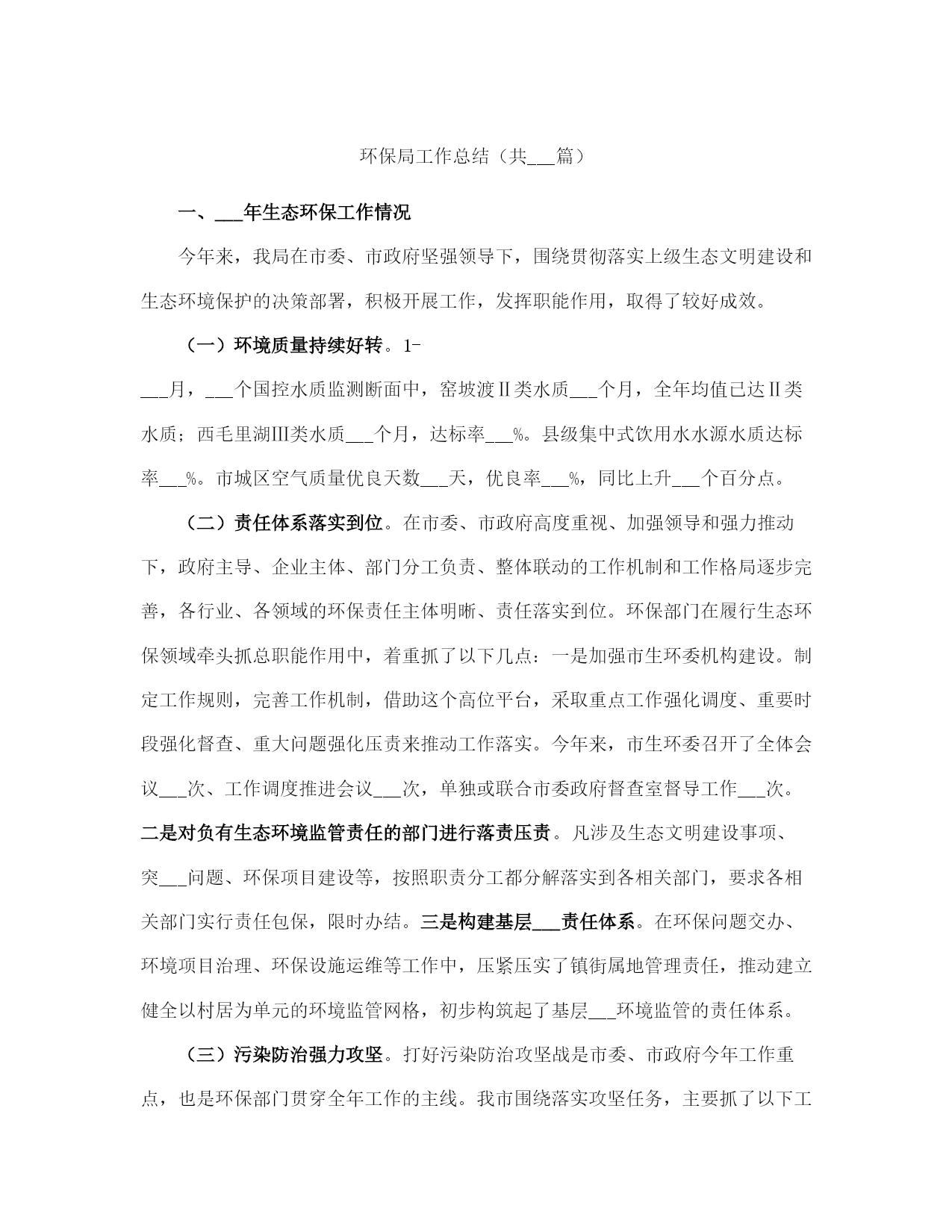 环保局工作总结5(完整版)文档资料可直接使用,可编辑,欢迎下载环保局工作总结(共___篇)一、___年生态环保工作情况今年来,我局在市委、市政府坚强领导下,围绕贯彻落实上级生态文明建设和生态环境保护的决策部署,积极开展工作,发挥职能作用,取得了较好成效。(一)环境质量持续好转。1-___月,___个国控水质监测断面中,窑坡渡Ⅱ类水质___个月,全年均值已达Ⅱ类水质;西毛里湖Ⅲ类水质___个月,达标率___%。县级集中式饮用水水源水质达标率___%。市城区空气质量优良天数___天,优良率___%,同比上升___个百分点。(二)责任体系落实到位。在市委、市政府高度重视、加强领导和强力推动下,政府主导、企业主体、部门分工负责、整体联动的工作机制和工作格局逐步完善,各行业、各领域的环保责任主体明晰、责任落实到位。环保部门在履行生态环保领域牵头抓总职能作用中,着重抓了以下几点:一是加强市生环委机构建设。制定工作规则,完善工作机制,借助这个高位平台,采取重点工作强化调度、重要时段强化督查、重大问题强化压责来推动工作落实。今年来,市生环委召开了全体会议___次、工作调度推进会议___次,单独或联合市委政府督查室督导工作___次。二是对负有生态环境监管责任的部门进行落责压责。凡涉及生态文明建设事项、突___问题、环保项目建设等,按照职责分工都分解落实到各相关部门,要求各相关部门实行责任包保,限时办结。三是构建基层___责任体系。在环保问题交办、环境项目治理、环保设施运维等工作中,压紧压实了镇街属地管理责任,推动建立健全以村居为单元的环境监管网格,初步构筑起了基层___环境监管的责任体系。(三)污染防治强力攻坚。打好污染防治攻坚战是市委、市政府今年工作重点,也是环保部门贯穿全年工作的主线。我市围绕落实攻坚任务,主要抓了以下工作:一是制定了《津市市___年污染防治攻坚战及“夏季攻势”实施方案》,提出了年度工作目标和气、水、土环境领域___个项目的防治任务,并将各项任务分解落实到各个责任单位,形成了全市环境治理保护的路线图、任务书和时间表。二是强力推进大气污染防治。环保部门加强调度和督查,在雾霾天气或农作物收获季节等特护期,与城管、住建、农业等部门联合巡查执法,严格防控大气污染,推动了目标任务的完成。环保部门还重点抓好了10蒸吨及以下燃煤锅炉的整治,全市在用的___台锅炉全部使用了清洁能源并加装了双除尘设施。突出整治新合新生物医药、鸿鹰生物等企业工业废气,实现达标排放。加强关停粘土砖厂的后续监管,完成了转产企业的环保措施。三是全面实施水环境整治。实施以“两拆两退”为主要内容的西毛里湖水环境综合整治,在我局牵头,沿湖3镇及水务、农业、畜牧等部门配合下,完成了___处拦坝共___亩水面、___个斑块共___亩鱼塘承包合同的解除,退塘还湖还湿面积___万多亩,占任务数的___%。发放退养补偿资金___万元。同时拆除___渔场在湖中设置的拦网___米。开展涔澹水流域环境综合整治。我局争取国家___万元,在津市监狱辖区内建设了___座生活污水处理站,日处理能力___吨;治理___处养殖规模___头的养殖场污染;整治蔡家河台沟和汪家桥排渠;添置和完善监狱区域生活垃圾收运设施。建成工业园区污水集中处理设施,投入了正常运行。开展县级集中式饮用水水源地环境保护专项行动,对白龙潭水源保护区完善了交通警示牌、防护栏等保护设施;整治保护区水域挖砂船只作业和运货船只停靠,并与澧县相关部门建立了联合巡查机制。进一步推动农村生活污水处理,对现有农村集镇生活污水处理设施进行了维修和完善,对近几年新扩镇区和原未覆盖地段进行了纳污管网建设,进一步扩大了污水收集处理覆盖面。同时,以市政府名义印发了《津市市农村生活污水管网管理暂行办法》,对农村生活污水收集管网分别明确了镇村属地管理责任、市直相关部门监督管理责任和污水处理站运营企业的相关责任,建立起了切合实际、便于操作的农村生活污水处理设施管理体系和长效机制。四是扎实开展土壤污染治理。以市政府名义印发了《津市市土壤污染防治工作方案》。启动了土壤污染详查工作;编制了《津市市土壤污染源、污染地块调查报告》。开展了重点行业企业用地调查及信息采集工作,完成调查企业___家,其中在产企业___家,关闭搬迁企业___家。完成了原香料厂厂区土壤污染治理项目。加强对畜禽养殖污染防治工作的监管。对畜禽养殖违规建设项目进行了专项整治,为___家规模养殖场办理了环评手续。开展规模养殖企业污染设施建设和运行情况的专项检查,对___家治污设施不完善的企业督促整改,强制___家规模养殖业企业建设了环保设施。(四)督察整改基本完成。___年中央环保督察期间,群众向中央环保督察组反映的我市环境问题信访___件共___件,其中___件已于___年办结,只有