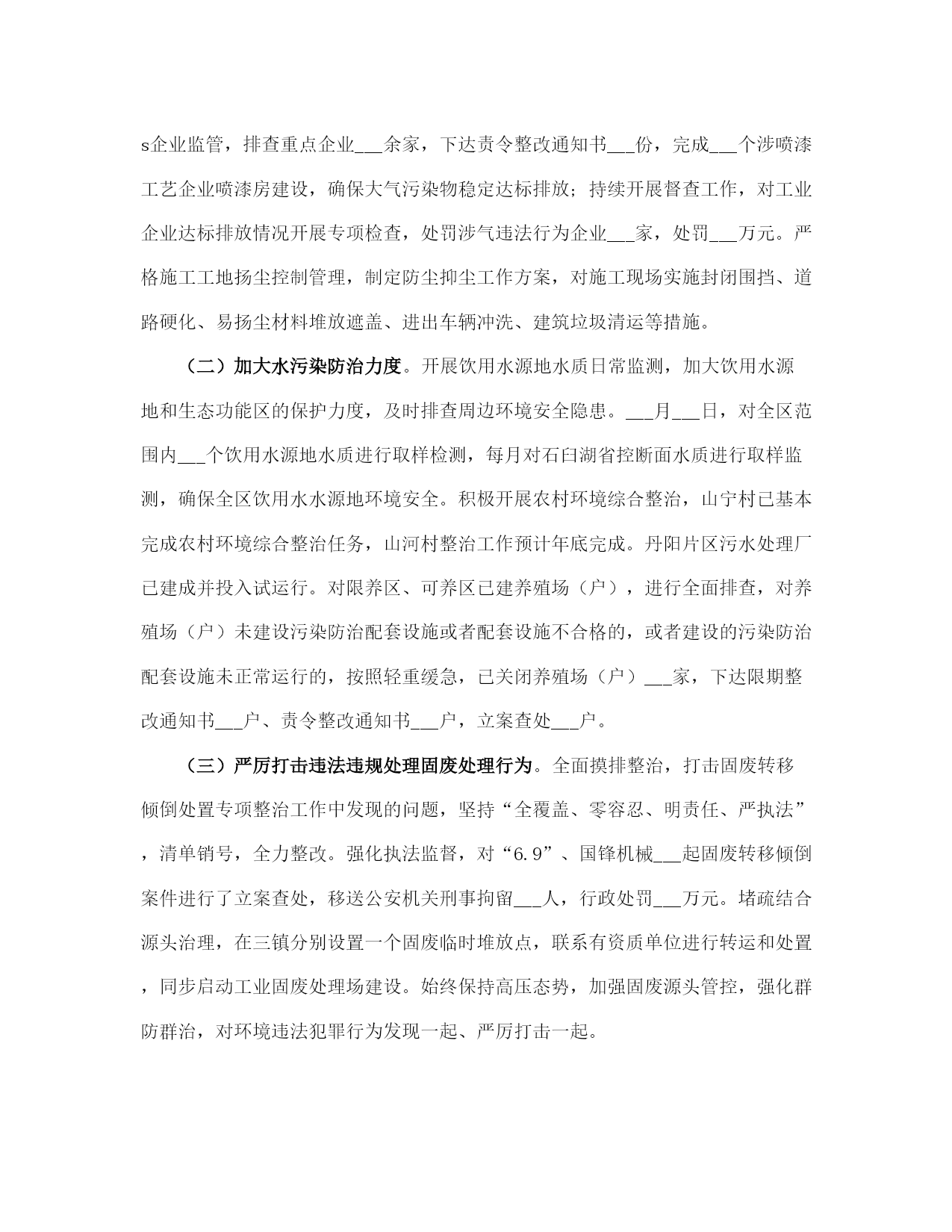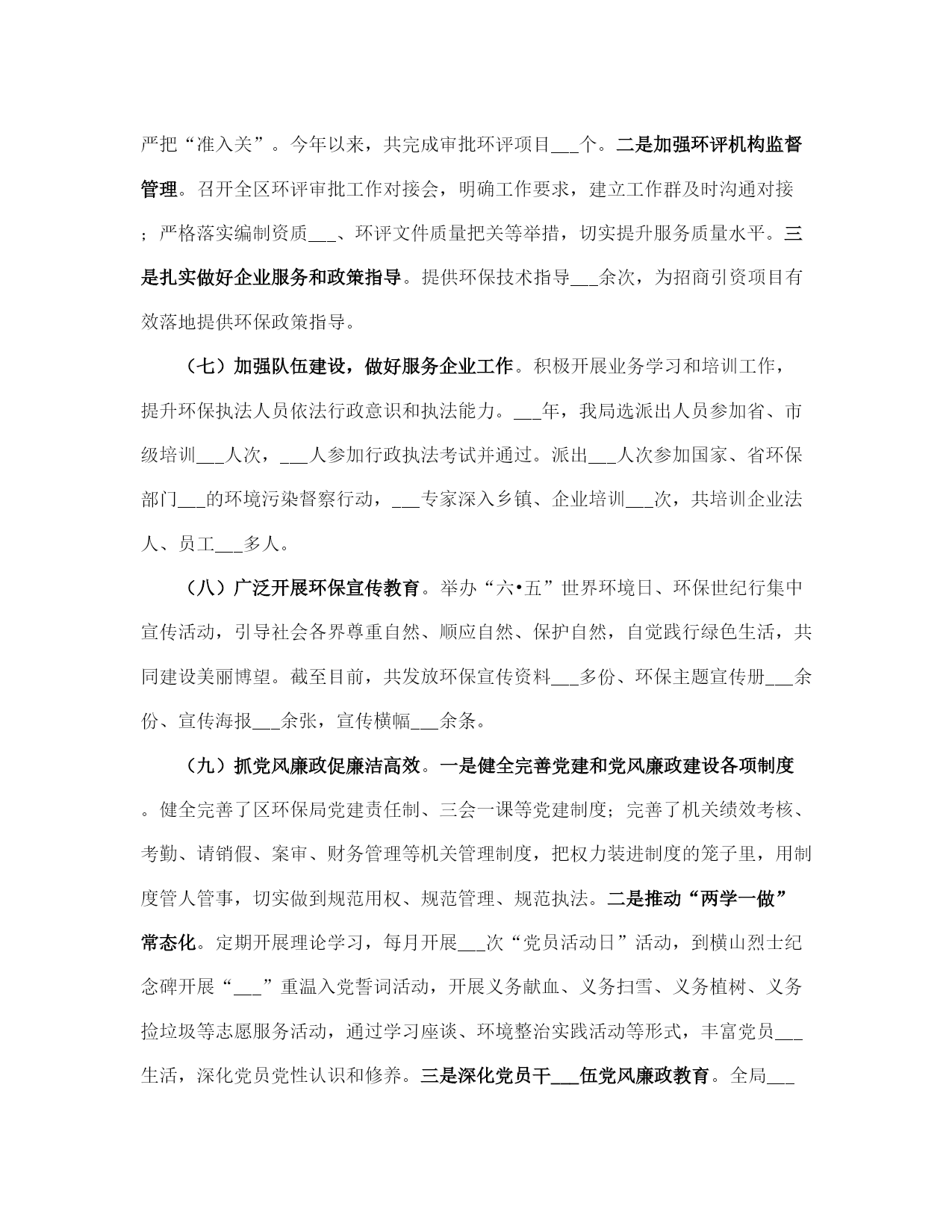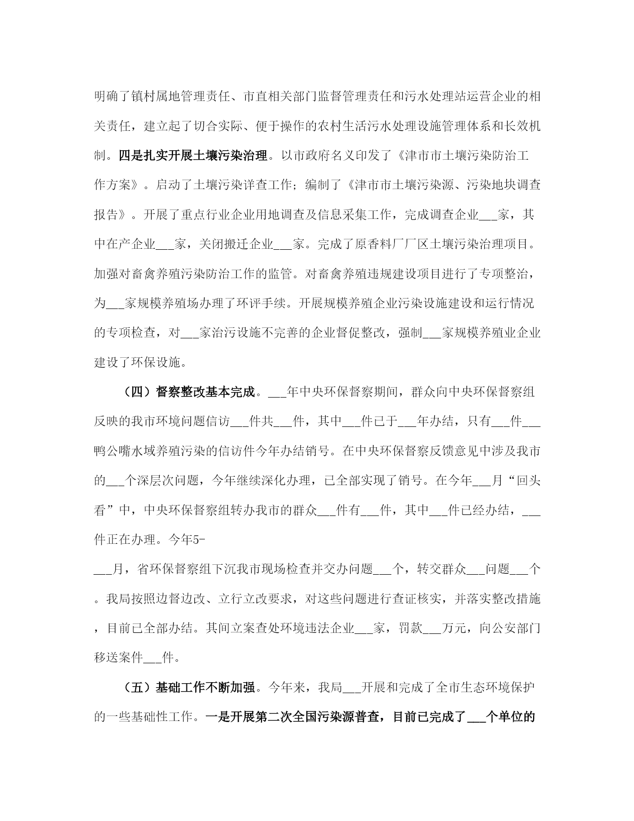 环保局工作总结5(完整版)文档资料可直接使用,可编辑,欢迎下载环保局工作总结(共___篇)一、___年生态环保工作情况今年来,我局在市委、市政府坚强领导下,围绕贯彻落实上级生态文明建设和生态环境保护的决策部署,积极开展工作,发挥职能作用,取得了较好成效。(一)环境质量持续好转。1-___月,___个国控水质监测断面中,窑坡渡Ⅱ类水质___个月,全年均值已达Ⅱ类水质;西毛里湖Ⅲ类水质___个月,达标率___%。县级集中式饮用水水源水质达标率___%。市城区空气质量优良天数___天,优良率___%,同比上升___个百分点。(二)责任体系落实到位。在市委、市政府高度重视、加强领导和强力推动下,政府主导、企业主体、部门分工负责、整体联动的工作机制和工作格局逐步完善,各行业、各领域的环保责任主体明晰、责任落实到位。环保部门在履行生态环保领域牵头抓总职能作用中,着重抓了以下几点:一是加强市生环委机构建设。制定工作规则,完善工作机制,借助这个高位平台,采取重点工作强化调度、重要时段强化督查、重大问题强化压责来推动工作落实。今年来,市生环委召开了全体会议___次、工作调度推进会议___次,单独或联合市委政府督查室督导工作___次。二是对负有生态环境监管责任的部门进行落责压责。凡涉及生态文明建设事项、突___问题、环保项目建设等,按照职责分工都分解落实到各相关部门,要求各相关部门实行责任包保,限时办结。三是构建基层___责任体系。在环保问题交办、环境项目治理、环保设施运维等工作中,压紧压实了镇街属地管理责任,推动建立健全以村居为单元的环境监管网格,初步构筑起了基层___环境监管的责任体系。(三)污染防治强力攻坚。打好污染防治攻坚战是市委、市政府今年工作重点,也是环保部门贯穿全年工作的主线。我市围绕落实攻坚任务,主要抓了以下工作:一是制定了《津市市___年污染防治攻坚战及“夏季攻势”实施方案》,提出了年度工作目标和气、水、土环境领域___个项目的防治任务,并将各项任务分解落实到各个责任单位,形成了全市环境治理保护的路线图、任务书和时间表。二是强力推进大气污染防治。环保部门加强调度和督查,在雾霾天气或农作物收获季节等特护期,与城管、住建、农业等部门联合巡查执法,严格防控大气污染,推动了目标任务的完成。环保部门还重点抓好了10蒸吨及以下燃煤锅炉的整治,全市在用的___台锅炉全部使用了清洁能源并加装了双除尘设施。突出整治新合新生物医药、鸿鹰生物等企业工业废气,实现达标排放。加强关停粘土砖厂的后续监管,完成了转产企业的环保措施。三是全面实施水环境整治。实施以“两拆两退”为主要内容的西毛里湖水环境综合整治,在我局牵头,沿湖3镇及水务、农业、畜牧等部门配合下,完成了___处拦坝共___亩水面、___个斑块共___亩鱼塘承包合同的解除,退塘还湖还湿面积___万多亩,占任务数的___%。发放退养补偿资金___万元。同时拆除___渔场在湖中设置的拦网___米。开展涔澹水流域环境综合整治。我局争取国家___万元,在津市监狱辖区内建设了___座生活污水处理站,日处理能力___吨;治理___处养殖规模___头的养殖场污染;整治蔡家河台沟和汪家桥排渠;添置和完善监狱区域生活垃圾收运设施。建成工业园区污水集中处理设施,投入了正常运行。开展县级集中式饮用水水源地环境保护专项行动,对白龙潭水源保护区完善了交通警示牌、防护栏等保护设施;整治保护区水域挖砂船只作业和运货船只停靠,并与澧县相关部门建立了联合巡查机制。进一步推动农村生活污水处理,对现有农村集镇生活污水处理设施进行了维修和完善,对近几年新扩镇区和原未覆盖地段进行了纳污管网建设,进一步扩大了污水收集处理覆盖面。同时,以市政府名义印发了《津市市农村生活污水管网管理暂行办法》,对农村生活污水收集管网分别明确了镇村属地管理责任、市直相关部门监督管理责任和污水处理站运营企业的相关责任,建立起了切合实际、便于操作的农村生活污水处理设施管理体系和长效机制。四是扎实开展土壤污染治理。以市政府名义印发了《津市市土壤污染防治工作方案》。启动了土壤污染详查工作;编制了《津市市土壤污染源、污染地块调查报告》。开展了重点行业企业用地调查及信息采集工作,完成调查企业___家,其中在产企业___家,关闭搬迁企业___家。完成了原香料厂厂区土壤污染治理项目。加强对畜禽养殖污染防治工作的监管。对畜禽养殖违规建设项目进行了专项整治,为___家规模养殖场办理了环评手续。开展规模养殖企业污染设施建设和运行情况的专项检查,对___家治污设施不完善的企业督促整改,强制___家规模养殖业企业建设了环保设施。(四)督察整改基本完成。___年中央环保督察期间,群众向中央环保督察组反映的我市环境问题信访___件共___件,其中___件已于___年办结,只有