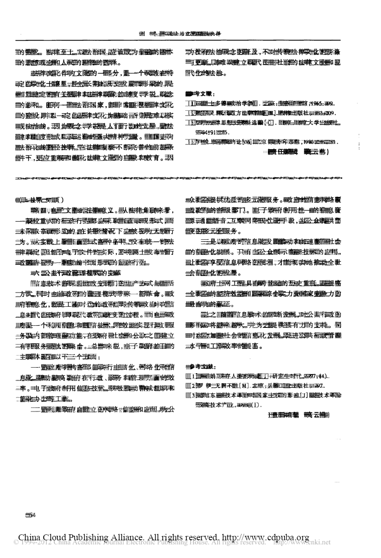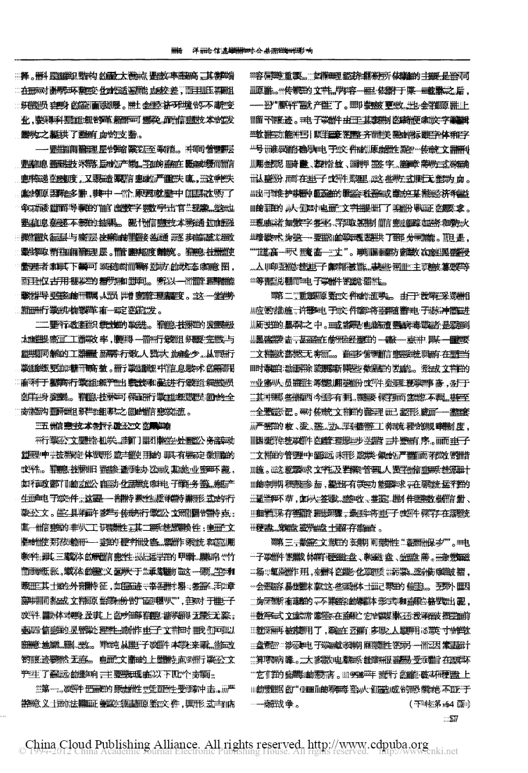 2(X拓年9月包头职业技术学院学报SePtember2(X场..第7卷第3期JOURNALOFBAOTOUVOCA皿ONA工&1下CHNICALCOU卫GEVol7卜论信息技术对公共行政的影响杨洋,(辽宁锦华工业有限公司团委辽宁兴城125125)摘要:社会信息化是当代社会的一种大趋势,它正推动着公共行政现代化的进程。信J息技术的发、、、、展对诸如行政人员、行政决策行政组织行政方法行政公文政府管理模式等公共行政要素和过。程产生着深远的影响关键词:信息技术;公共行政TheEfeetofInfermationTechnologyonthePublicA山ministrationYangYang.aguettee,aingnuaustrio,,ingcenging12512玫CoznuuonJigh玩dalC玖dXhUaon5),,-Abstract:Beingbeterinformedthetrendofthemode饥society15promotingthedevelopmentofpubliead.-mi币stzationmode功izarion仆edeveloPmentofl刊Fo训atlonteehno】。群willhaveafurtherinflueneeonthead,,,,而nist皿ivefacto拍suehasad而nistrativeofieialsad而nistrative卯liey叨dad而nistrativeo招anization。etCKcywords:i刊FOnationteehnology;四bliead而nistration在信息时代,信息技术是最基本和最为普遍的互联网提供了获取信息的极大便利,使得行政人员。、、技术手段在人类社会生活的每一个领域每一个“秀才不出门,候知天下事”“运筹帷握之中,决胜千。方面都必然会普遍应用着信息技术,公共行政的领里之外”成为可能。。域也不例外当前,我们正处在公共行政信息技术三是时间和精力的节约信息技术节约了原来。化的起点,预测信息技术在公共行政中带来变革的靠人脑处理信息所消耗的大量时间和精力跨越时、。合理形态,对于我们在公共行政领域中自觉接纳和空,降低了信息传输的时间成本人力成本。。应用信息技术是非常有意义的四是观念的更新行政人员要适应信息时代的、、一信息技术对行政人员的影响要求,就必须更新传统观念,树立效率观念创新观、、、、行政人员由于身处现代信息社会,不可避免地念服务观念竞争观念民主观念法治观念等现代。。要受到信息技术发展的影响具体表现为:化观念。。一是体能的延伸与增强借助于信息技术,打五是激励行政人员的全面发展信息技术的应、、破了时空限制,行政人员可以看到听到触觉到以用既对行政人员的知识和技能提出了更高的要求,。前无法感知的事物,可以完成以前体能无法完成的又节约了行政人员的精力与时间前者成为行政人。工作员不断学习与培训的直接动力,后者则提供了可能,、。二是开阔视野提高判断分析和解决问题的能与机会信息技术带来教育方式的更新(如网络学。力信息技术的开发可使行政人员及时获得大量信校)为行政人员学习现代化的管理知识,掌握与运用、。。息,有助于他们逻辑地辩证地和系统地思考问题现代化的行政管理技术和工具提供了极大的便利收稿日期:2(X场一一072.,,,,作者简介:杨洋(1977一)男焦龙江依安县人199年毕业于我院数控技术应用(75941准)专业辽宁娜华工业有限公司团委书记主。要从事共青团工作ChinaCloudPublishingAlliance.Allrightsreserved.http://www.cdpuba.org杨洋:论信息技术对公共行政的影响、。二信息技术对行政决策的影响算机处理程序化决策的成功范例而对于非程序化。行政决策是行政决策者为达到某一特定目标,决策,信息技术也可以提供强有力的信息支持,。,对若干备选方案进行选择以确定行动方案的过程1952年下半年美国朝野都忙于为次年大选做准。信息技术发展对行政决策的影响是围绕着提高行政备候选人分别是在二战中立下赫赫战功的62岁。·决策的有效性和行政决策的效率展开的的艾森豪威尔将军和演说家阿德莱史蒂文森,由于。第一,对行政决策目标的影响信息技术发展前者早已解甲归田,新闻界舆论对后者获胜的把握。,改变了人类生活的环境,为此对公共行政提出了新几乎一边倒出于好奇新闻界请出UNWAC来做。。,的要求对于公共产品的提供者政府而言,一个预测数据分析结果出乎人们的意料电脑认为切应