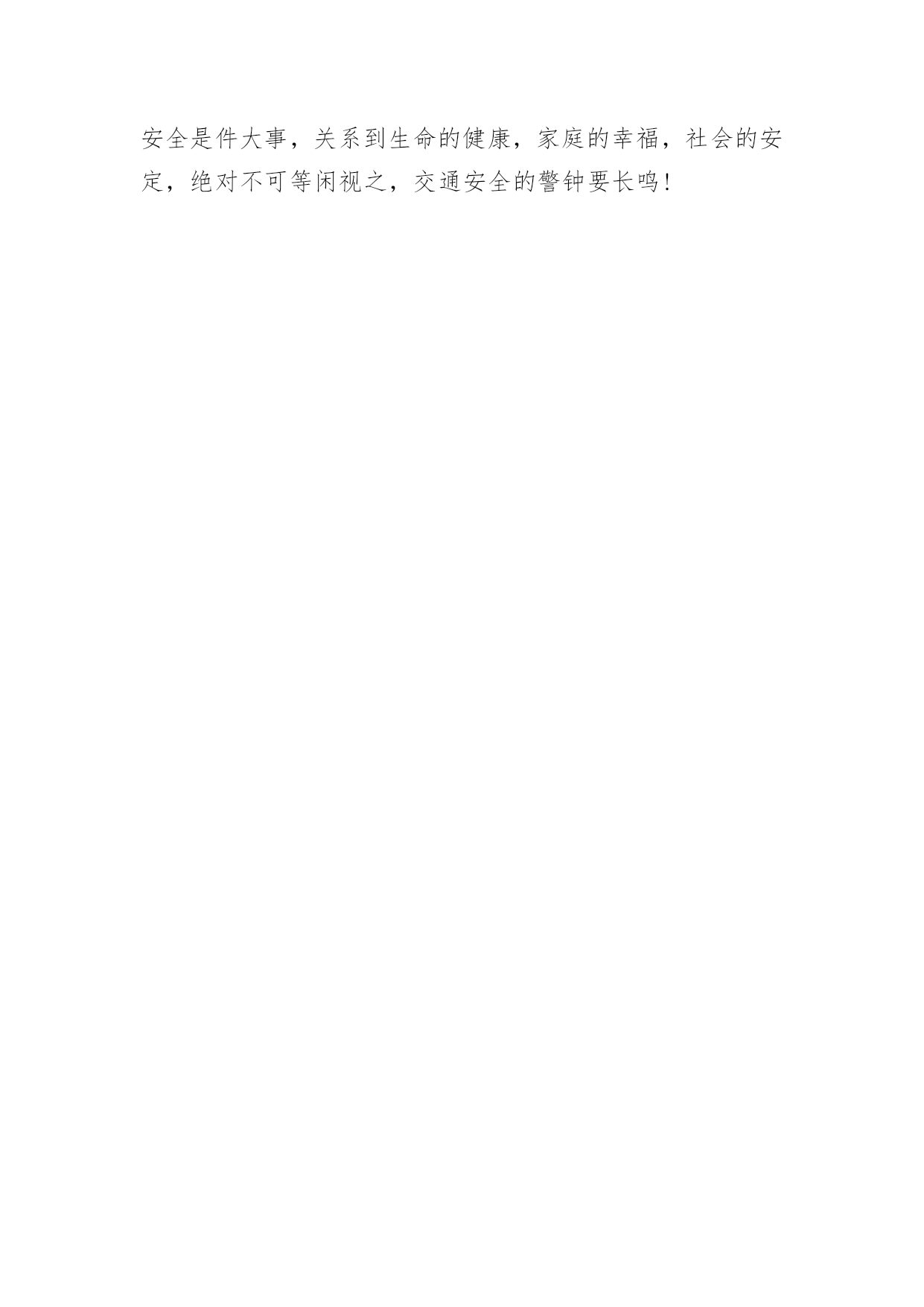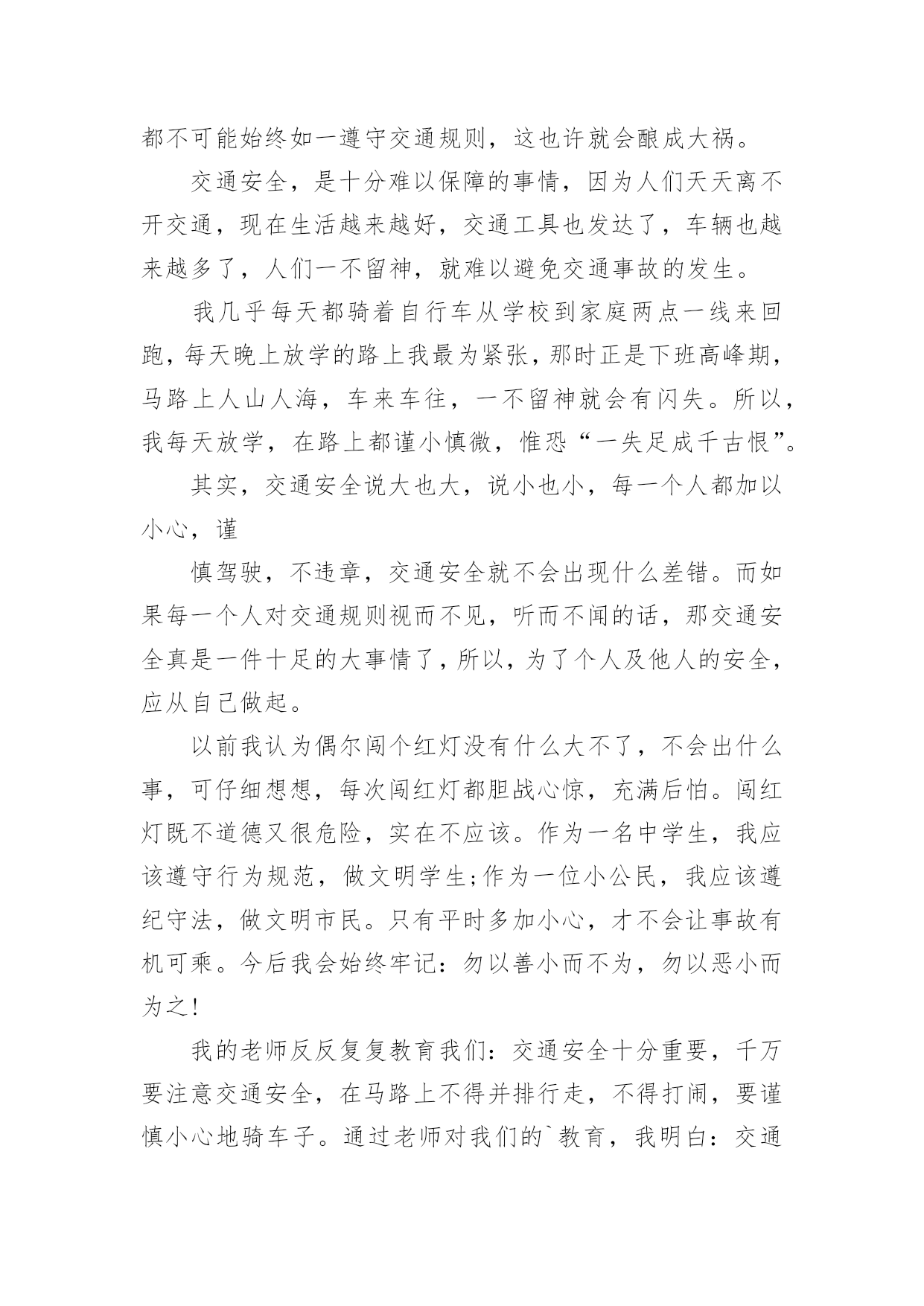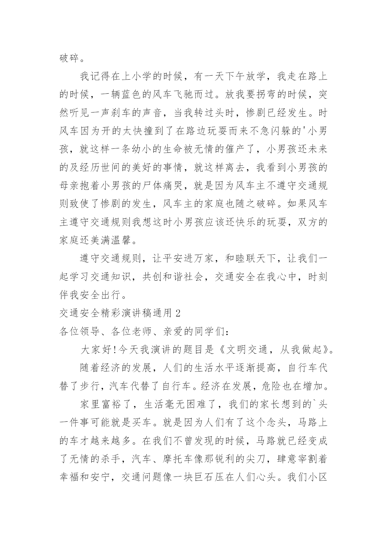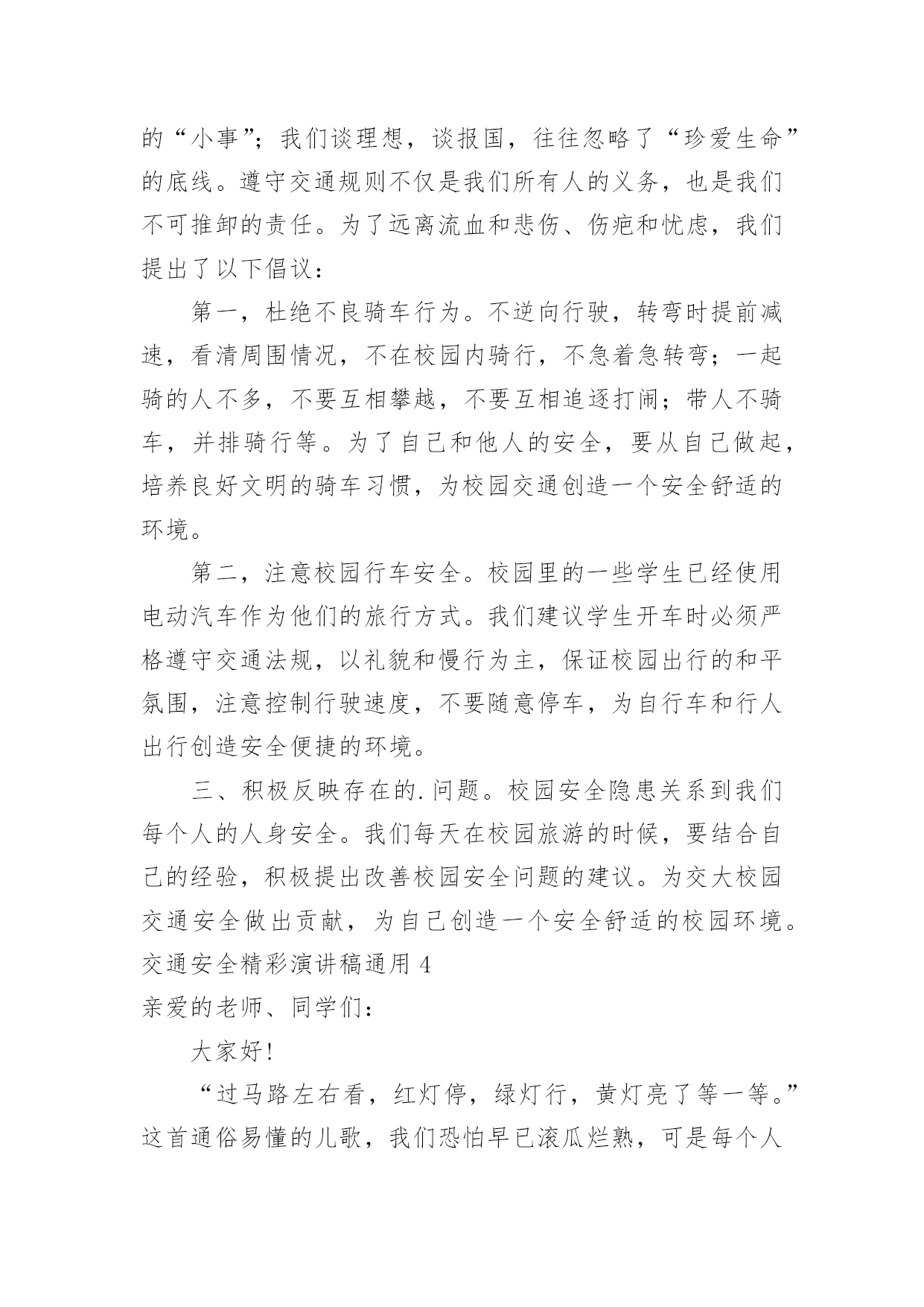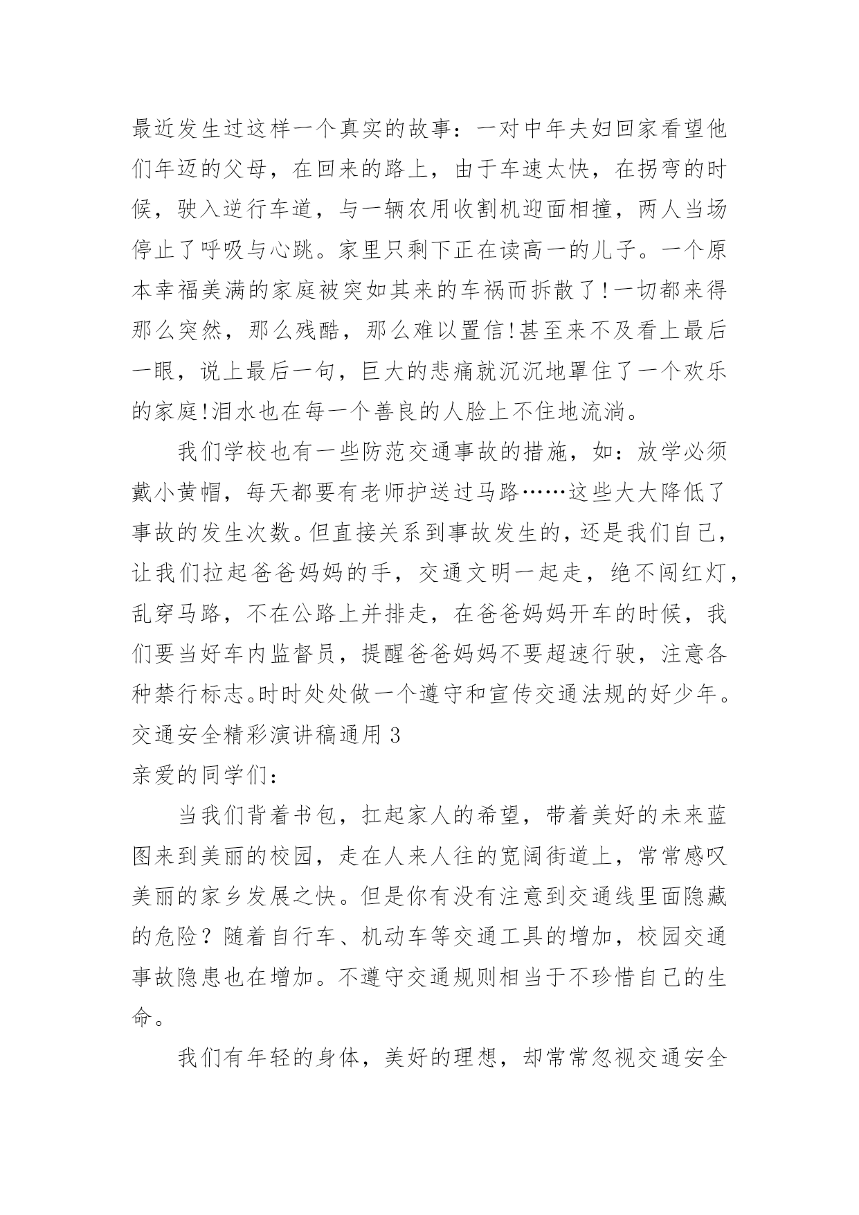 交通安全精彩演讲稿交通安全精彩演讲稿通用演讲稿可以帮助发言者更好的表达。在发展不断提速的社会中,演讲稿在我们的视野里出现的频率越来越高,怎么写演讲稿才能避免踩雷呢?下面是小编整理的交通安全精彩演讲稿通用,仅供参考,大家一起来看看吧。交通安全精彩演讲稿通用1尊敬的老师和亲爱的同学:你们好!“安全牵动万人心,平安幸福你我他”。随着科技的发展,人们的生活也跟着好起来,一栋栋楼房平地而起,一辆辆汽车在马路上飞奔。安全对人们越来越重要。小的时候,妈妈教我一些安全小知识,到现在我还记忆犹新,一:在路上行走要向走在右边。二:见着车的时候,不与车抢着走,要让车先走。三:不再马路上追逐打闹、四:红灯停绿灯行。我一直都记得这些交通规则。交通越来越发达,人们的友谊意识也应该增强。小轿车也越来越多了,司机也越来越多,司机也必须要遵守交通规则,司机也应该对他人负责对自己负责、对家庭负责,不应醉酒驾车,闯红灯,导致有的司机不遵守交通规则。导致一场场悲剧的发生,致使无辜的生命,使得原有幸福美满的家庭在一瞬间变得支离破碎。我记得在上小学的时候,有一天下午放学,我走在路上的时候,一辆蓝色的风车飞驰而过。放我要拐弯的时候,突然听见一声刹车的声音,当我转过头时,惨剧已经发生。时风车因为开的太快撞到了在路边玩耍而来不急闪躲的'小男孩,就这样一条幼小的生命被无情的催产了,小男孩还未来的及经历世间的美好的事情,就这样离去,我看到小男孩的母亲抱着小男孩的尸体痛哭,就是因为风车主不遵守交通规则致使了惨剧的发生,风车主的家庭也随之破碎。如果风车主遵守交通规则我想这时小男孩应该还快乐的玩耍,双方的家庭还美满温馨。遵守交通规则,让平安进万家,和睦联天下,让我们一起学习交通知识,共创和谐社会,交通安全在我心中,时刻伴我安全出行。交通安全精彩演讲稿通用2各位领导、各位老师、亲爱的同学们:大家好!今天我演讲的题目是《文明交通,从我做起》。随着经济的发展,人们的生活水平逐渐提高,自行车代替了步行,汽车代替了自行车。经济在发展,危险也在增加。家里富裕了,生活毫无困难了,我们的家长想到的`头一件事可能就是买车。就是因为人们有了这个念头,马路上的车才越来越多。在我们不曾发现的时候,马路就已经变成了无情的杀手,汽车、摩托车像那锐利的尖刀,肆意宰割着幸福和安宁,交通问题像一块巨石压在人们心头。我们小区最近发生过这样一个真实的故事:一对中年夫妇回家看望他们年迈的父母,在回来的路上,由于车速太快,在拐弯的时候,驶入逆行车道,与一辆农用收割机迎面相撞,两人当场停止了呼吸与心跳。家里只剩下正在读高一的儿子。一个原本幸福美满的家庭被突如其来的车祸而拆散了!一切都来得那么突然,那么残酷,那么难以置信!甚至来不及看上最后一眼,说上最后一句,巨大的悲痛就沉沉地罩住了一个欢乐的家庭!泪水也在每一个善良的人脸上不住地流淌。我们学校也有一些防范交通事故的措施,如:放学必须戴小黄帽,每天都要有老师护送过马路……这些大大降低了事故的发生次数。但直接关系到事故发生的,还是我们自己,让我们拉起爸爸妈妈的手,交通文明一起走,绝不闯红灯,乱穿马路,不在公路上并排走,在爸爸妈妈开车的时候,我们要当好车内监督员,提醒爸爸妈妈不要超速行驶,注意各种禁行标志。时时处处做一个遵守和宣传交通法规的好少年。交通安全精彩演讲稿通用3亲爱的同学们:当我们背着书包,扛起家人的希望,带着美好的未来蓝图来到美丽的校园,走在人来人往的宽阔街道上,常常感叹美丽的家乡发展之快。但是你有没有注意到交通线里面隐藏的危险?随着自行车、机动车等交通工具的增加,校园交通事故隐患也在增加。不遵守交通规则相当于不珍惜自己的生命。我们有年轻的身体,美好的理想,却常常忽视交通安全的“小事”;我们谈理想,谈报国,往往忽略了“珍爱生命”的底线。遵守交通规则不仅是我们所有人的义务,也是我们不可推卸的责任。为了远离流血和悲伤、伤疤和忧虑,我们提出了以下倡议:第一,杜绝不良骑车行为。不逆向行驶,转弯时提前减速,看清周围情况,不在校园内骑行,不急着急转弯;一起骑的人不多,不要互相攀越,不要互相追逐打闹;带人不骑车,并排骑行等。为了自己和他人的安全,要从自己做起,培养良好文明的骑车习惯,为校园交通创造一个安全舒适的环境。第二,注意校园行车安全。校园里的一些学生已经使用电动汽车作为他们的旅行方式。我们建议学生开车时必须严格遵守交通法规,以礼貌和慢行为主,保证校园出行的和平氛围,注意控制行驶速度,不要随意停车,为自行车和行人出行创造安全便捷的环境。三、积极反映存在的.问题。校园安全隐患关系到我们每个人的人身安全。我们每天在校园旅游的时候,要结合自己的经验,积极提出改善校园安全问题的建议。为交大校园交通安全做出贡献,为自己创造一个安全舒适的校园环境。交通安全精彩演讲稿通用4亲爱的老师、同学们: