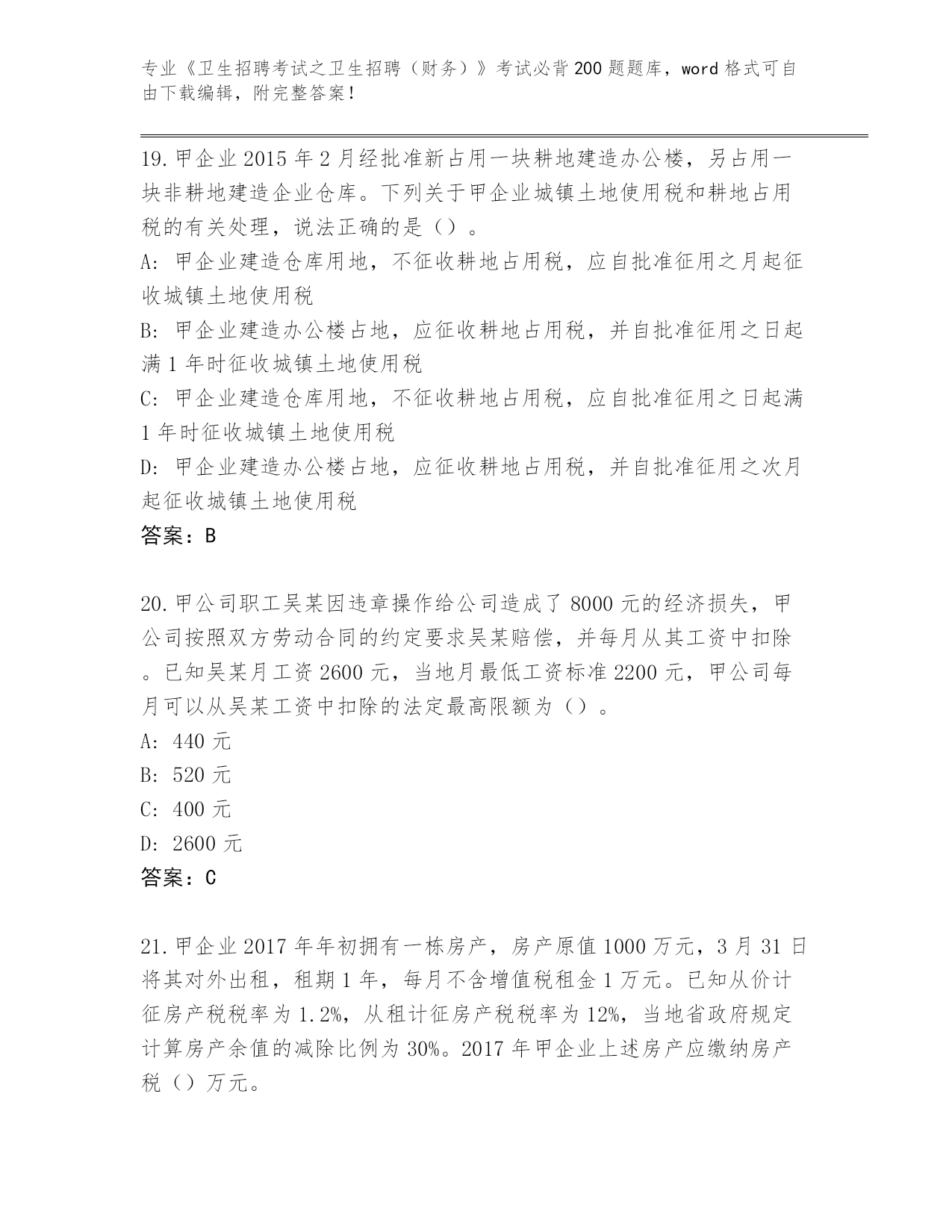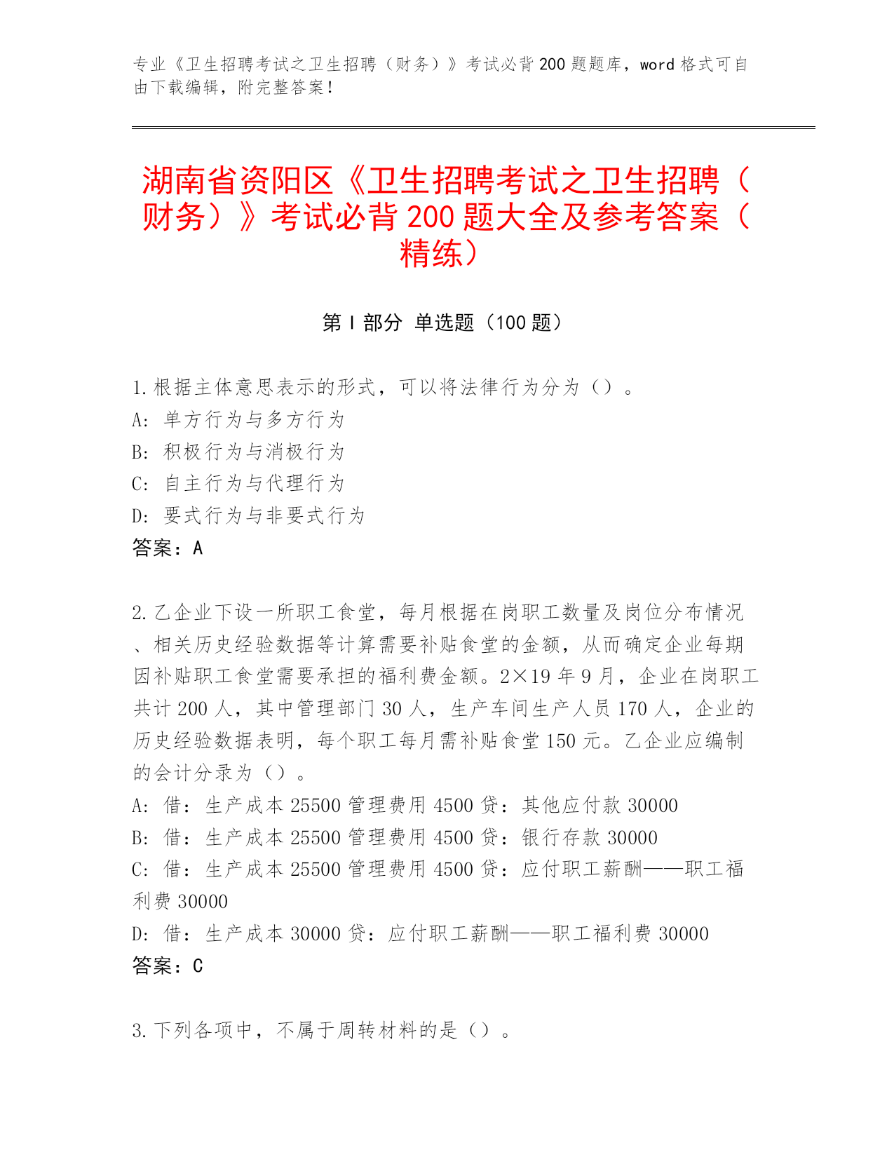 湖南省资兴市《卫生招聘考试之卫生招聘(财务)》资格考试必背200题大全(精练)