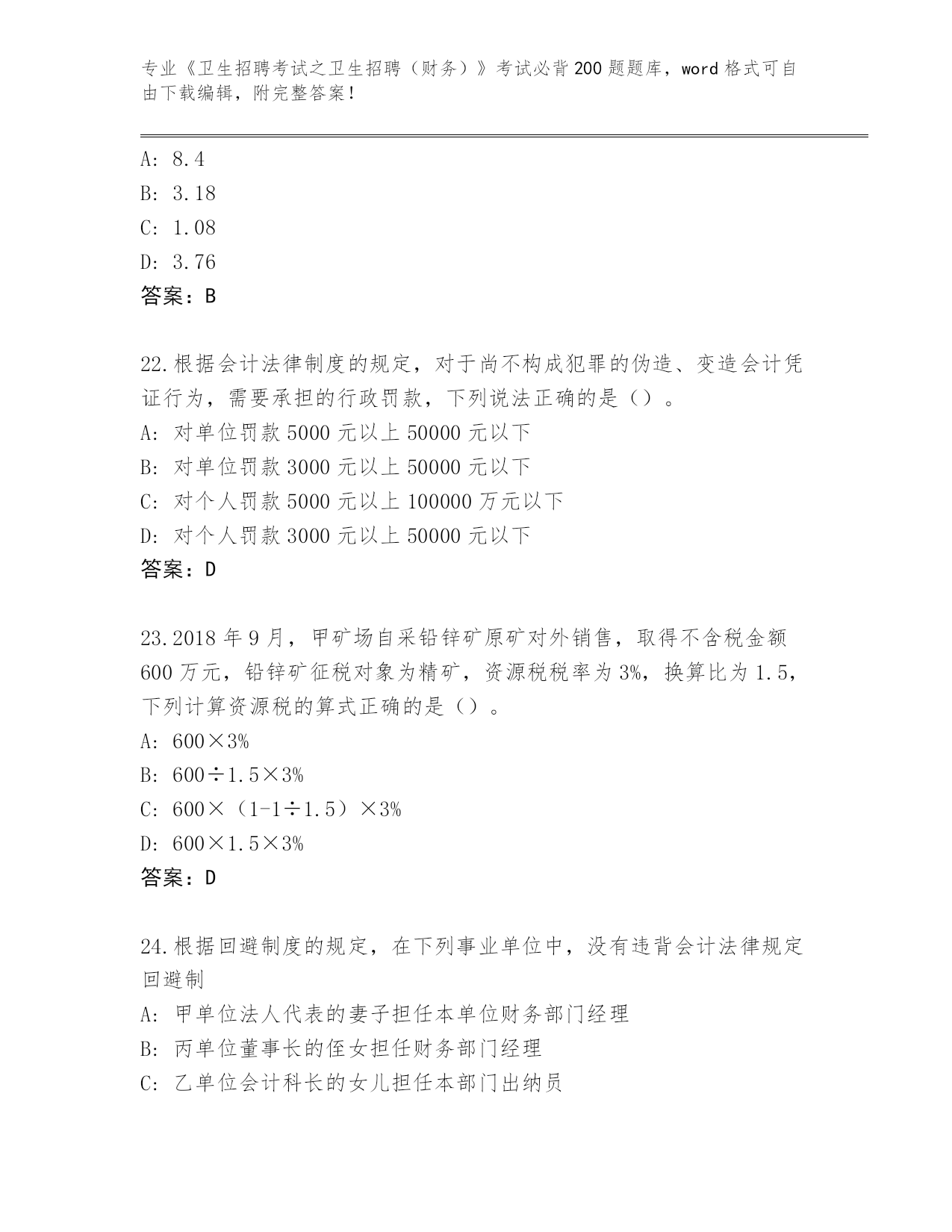2024年湖南省资阳区《卫生招聘考试之卫生招聘(财务)》考试必背200题题库大全附答案(培优B卷)