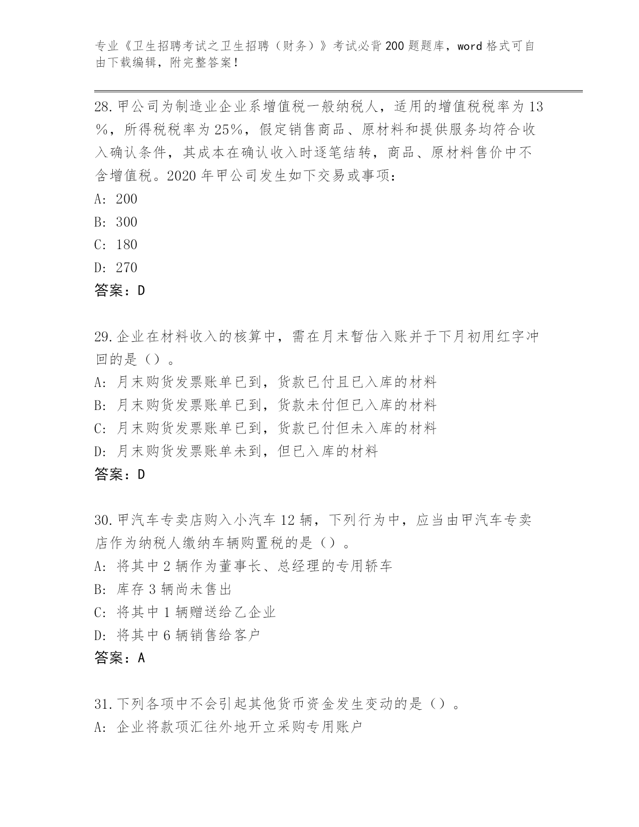湖南省《卫生招聘考试之卫生招聘(财务)》考试必背200题题库大全及答案参考