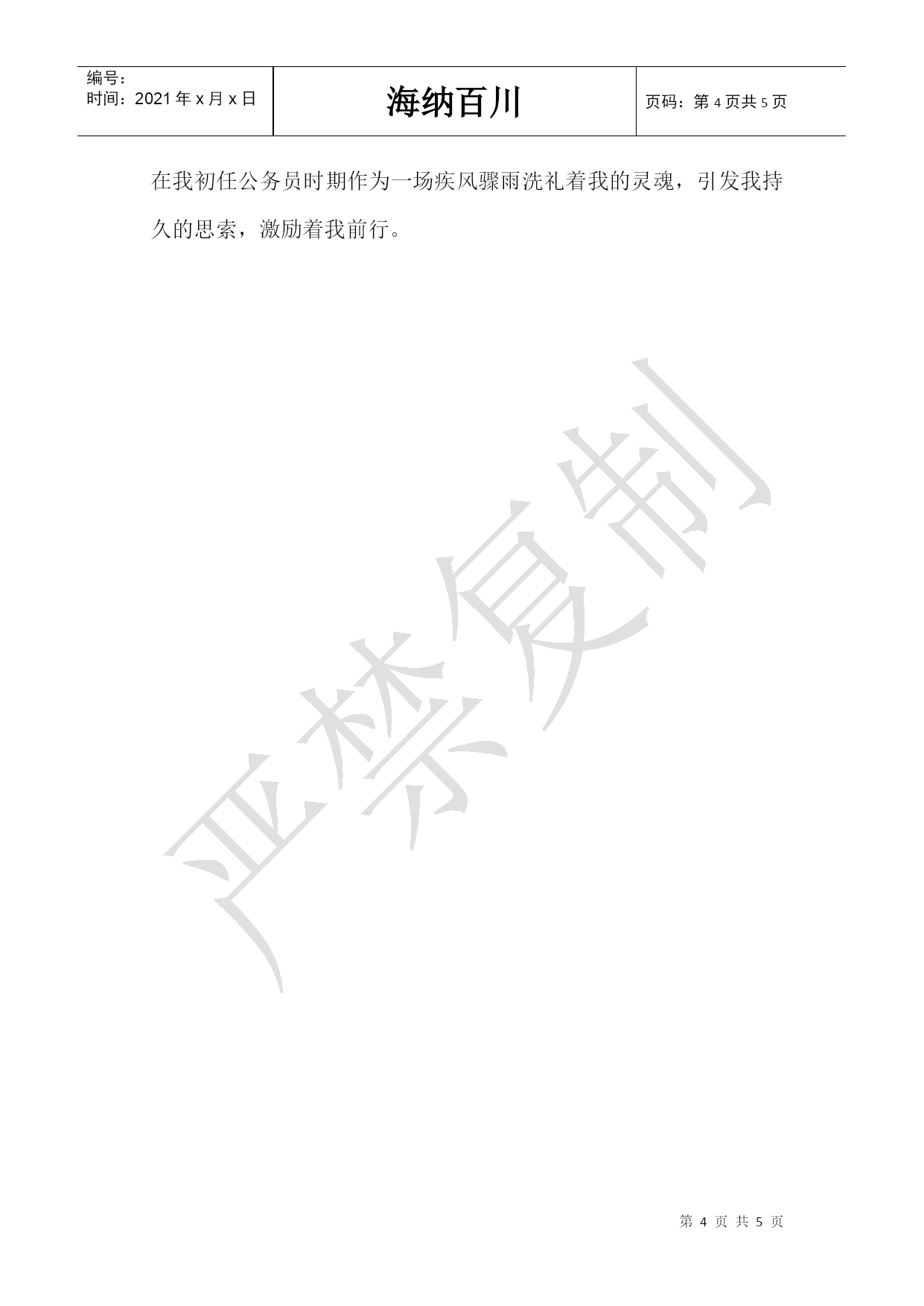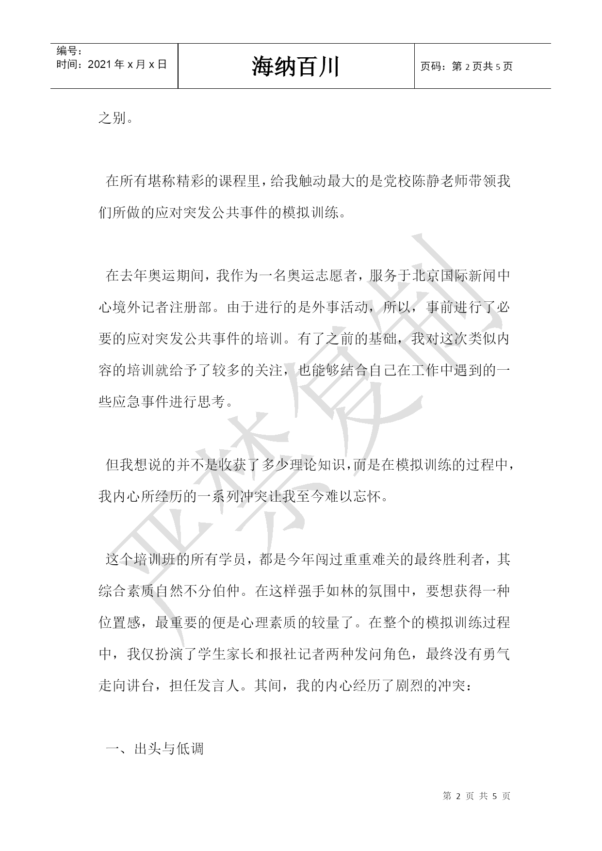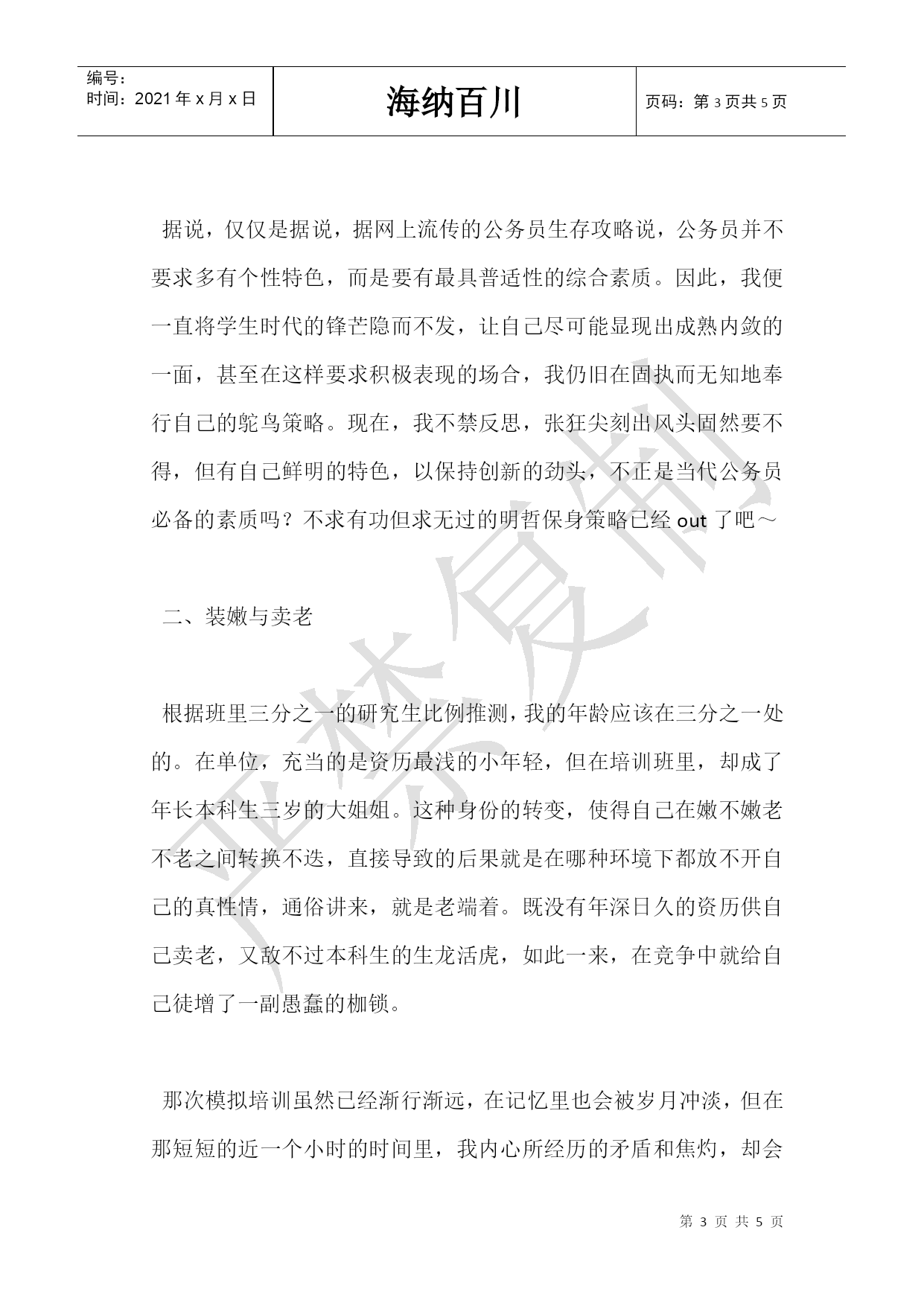 编号:时间:2021年x月x日海纳百川页码:第PAGE5页共NUMPAGES5页第PAGE\*MERGEFORMAT5页共NUMPAGES\*MERGEFORMAT5页公务员培训班学习心得2021年公务员培训班学习心得醍醐灌顶正认识疾风骤雨洗魂灵——记初任公务员培训班学习心得读了二十多年的书,拥有的只是满腹的书本知识,怀着知识分子的小情小调,初踏上工作岗位,却对实际工作有着恰恰最不合实际的想望,眼前是一片茫茫然的无所适从。工作中一切都要去适应,去学习,去重新体味另一种别样的生活——在这种生活里,没有肆无忌惮,没有无法无天,更没有我行我素,有的是要以一种成人的姿态对工作对生活负起全部责任。走进这个培训班之前,对公务员培训的认识仍旧停留在“官僚”、“冗长”、“大而无当”……等一系列负性印象上。但两周的培训下来,我之前的刻板认识被彻底颠覆了。听单位的前辈介绍,较之先前的’培训班,这届的培训内容最为丰富多样,有理论讲授,有学员论坛,还有主题演讲;有观影,有参观,还有军体训练,丰富多彩的内容编排将短短两周的培训时间填充的紧张而充实。那么多位授课领导,虽然主题不一,重点各异,但风格无一不是深入浅出,通俗易懂,与我印象里的官僚有着天壤之别。在所有堪称精彩的课程里,给我触动最大的是党校陈静老师带领我们所做的应对突发公共事件的模拟训练。在去年奥运期间,我作为一名奥运志愿者,服务于北京国际新闻中心境外记者注册部。由于进行的是外事活动,所以,事前进行了必要的应对突发公共事件的培训。有了之前的基础,我对这次类似内容的培训就给予了较多的关注,也能够结合自己在工作中遇到的一些应急事件进行思考。但我想说的并不是收获了多少理论知识,而是在模拟训练的过程中,我内心所经历的一系列冲突让我至今难以忘怀。这个培训班的所有学员,都是今年闯过重重难关的最终胜利者,其综合素质自然不分伯仲。在这样强手如林的氛围中,要想获得一种位置感,最重要的便是心理素质的较量了。在整个的模拟训练过程中,我仅扮演了学生家长和报社记者两种发问角色,最终没有勇气走向讲台,担任发言人。其间,我的内心经历了剧烈的冲突:一、出头与低调据说,仅仅是据说,据网上流传的公务员生存攻略说,公务员并不要求多有个性特色,而是要有最具普适性的综合素质。因此,我便一直将学生时代的锋芒隐而不发,让自己尽可能显现出成熟内敛的一面,甚至在这样要求积极表现的场合,我仍旧在固执而无知地奉行自己的鸵鸟策略。现在,我不禁反思,张狂尖刻出风头固然要不得,但有自己鲜明的特色,以保持创新的劲头,不正是当代公务员必备的素质吗?不求有功但求无过的明哲保身策略已经out了吧~二、装嫩与卖老根据班里三分之一的研究生比例推测,我的年龄应该在三分之一处的。在单位,充当的是资历最浅的小年轻,但在培训班里,却成了年长本科生三岁的大姐姐。这种身份的转变,使得自己在嫩不嫩老不老之间转换不迭,直接导致的后果就是在哪种环境下都放不开自己的真性情,通俗讲来,就是老端着。既没有年深日久的资历供自己卖老,又敌不过本科生的生龙活虎,如此一来,在竞争中就给自己徒增了一副愚蠢的枷锁。那次模拟培训虽然已经渐行渐远,在记忆里也会被岁月冲淡,但在那短短的近一个小时的时间里,我内心所经历的矛盾和焦灼,却会在我初任公务员时期作为一场疾风骤雨洗礼着我的灵魂,引发我持久的思索,激励着我前行。