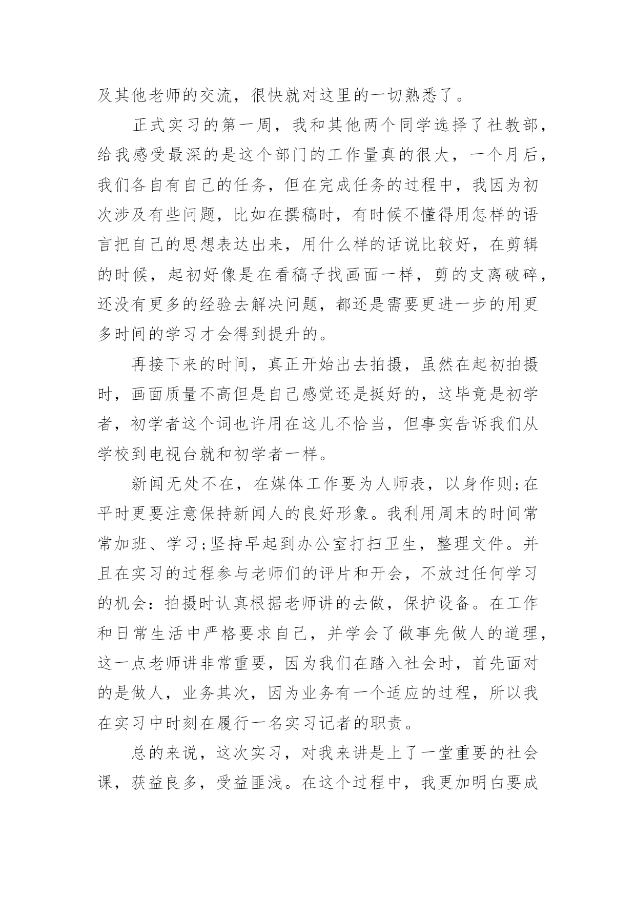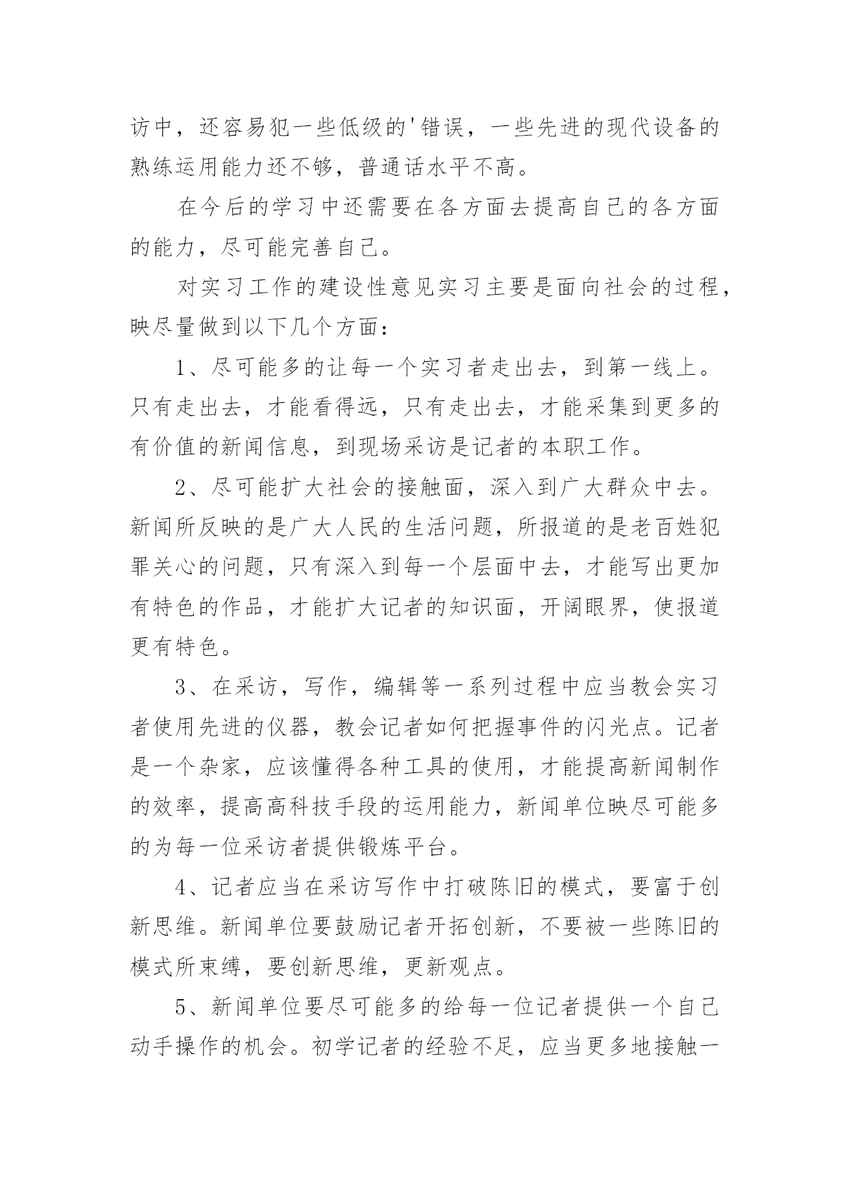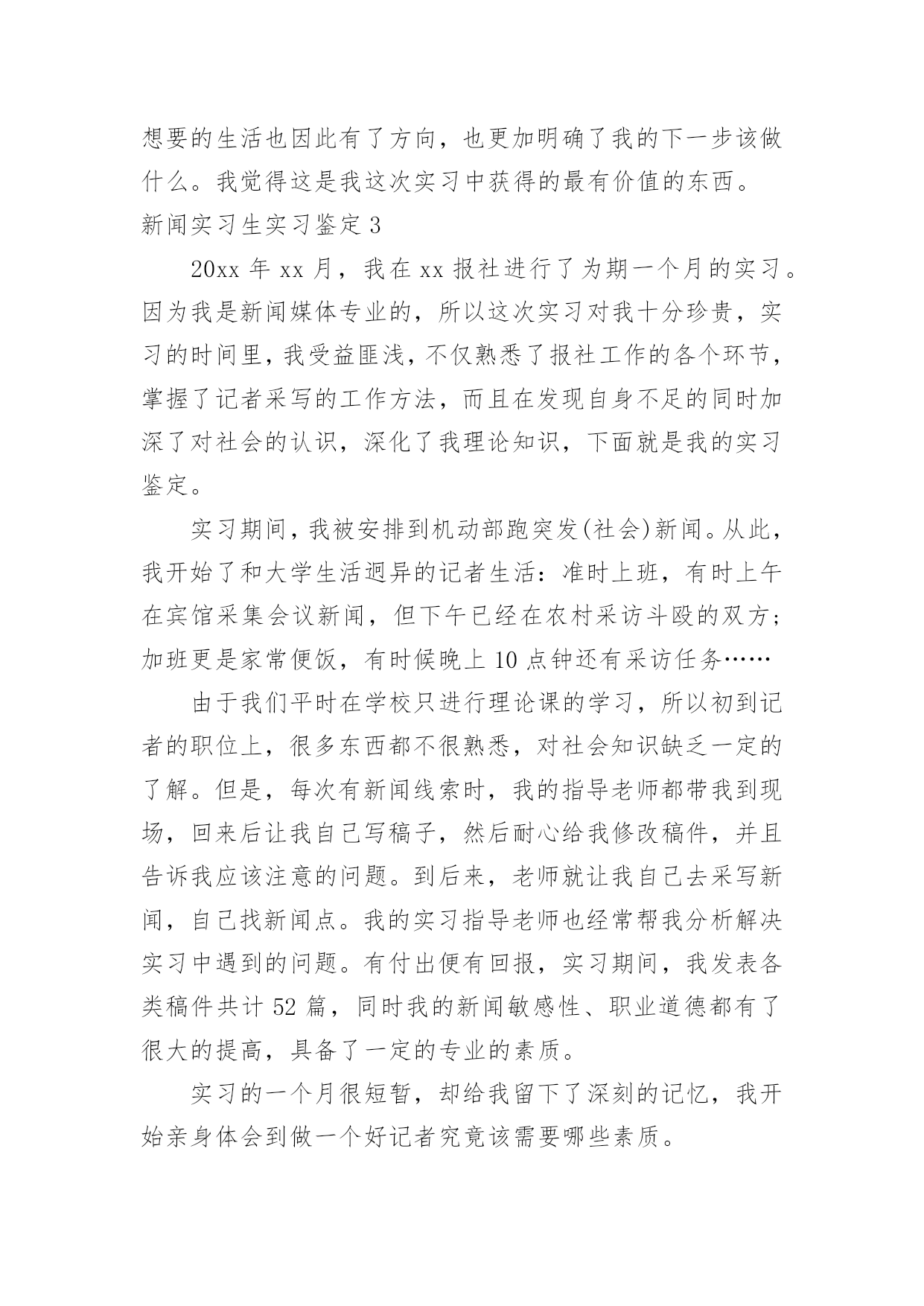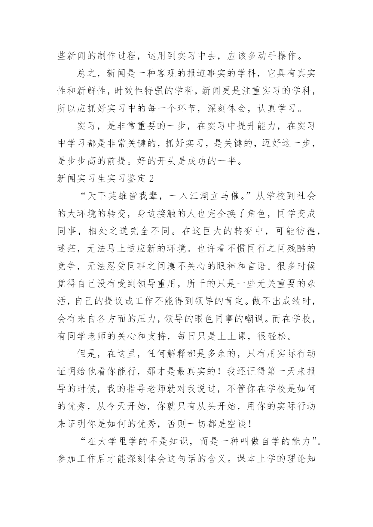 新闻实习生实习鉴定新闻实习生实习鉴定新闻实习生实习鉴定1在短短的实习期内,我深入到各地去采访,真正的锻炼自己的采访能力,提高了自己的提问水平,锻炼了心理素质。真正做到了不怯场,运用自如,现场处理灵活。在采访后写了很多的新闻稿件,熟练地掌握了各种新闻文体的写法,尤其是消息和通讯的写法,包括各种新闻文体,如动态消息、综合消息、人物消息、评述性消息、特写性消息、人物通讯、事件通讯、工作通讯、风貌通讯、人物专访等。还有电视新闻的写作,广播新闻的写作,涉及到了经济、社会等各个领域。深刻地认识到了作为一名记者应该具备哪些素质?体会到了记者的角色,怎样才能做到记者的识、才、学,认识到了记者和编辑的关系。通过这次实习,自己的社会实习能力大大地提高了,适应社会的能力强了,语言运用能力增强了,写作能力提升了,真正跨出了,走好了新闻道路上的第一步。实习中存在的主要问题通过实习发现,自己还存在着不少问题,包括文化知识的欠缺,真是书到用时方恨少。学习涉及的面太窄,学到的知识太单一,没有形成一个很好的体系。联系实际的能力太差,将学到的知识不能运用到实习中去,没有一个知识储备体系,用到哪学到哪。在采访中,还容易犯一些低级的'错误,一些先进的现代设备的熟练运用能力还不够,普通话水平不高。在今后的学习中还需要在各方面去提高自己的各方面的能力,尽可能完善自己。对实习工作的建设性意见实习主要是面向社会的过程,映尽量做到以下几个方面:1、尽可能多的让每一个实习者走出去,到第一线上。只有走出去,才能看得远,只有走出去,才能采集到更多的有价值的新闻信息,到现场采访是记者的本职工作。2、尽可能扩大社会的接触面,深入到广大群众中去。新闻所反映的是广大人民的生活问题,所报道的是老百姓犯罪关心的问题,只有深入到每一个层面中去,才能写出更加有特色的作品,才能扩大记者的知识面,开阔眼界,使报道更有特色。3、在采访,写作,编辑等一系列过程中应当教会实习者使用先进的仪器,教会记者如何把握事件的闪光点。记者是一个杂家,应该懂得各种工具的使用,才能提高新闻制作的效率,提高高科技手段的运用能力,新闻单位映尽可能多的为每一位采访者提供锻炼平台。4、记者应当在采访写作中打破陈旧的模式,要富于创新思维。新闻单位要鼓励记者开拓创新,不要被一些陈旧的模式所束缚,要创新思维,更新观点。5、新闻单位要尽可能多的给每一位记者提供一个自己动手操作的机会。初学记者的经验不足,应当更多地接触一些新闻的制作过程,运用到实习中去,应该多动手操作。总之,新闻是一种客观的报道事实的学科,它具有真实性和新鲜性,时效性特强的学科,新闻更是注重实习的学科,所以应抓好实习中的每一个环节,深刻体会,认真学习。实习,是非常重要的一步,在实习中提升能力,在实习中学习都是非常关键的,抓好实习,是关键的,迈好这一步,是步步高的前提。好的开头是成功的一半。新闻实习生实习鉴定2“天下英雄皆我辈,一入江湖立马催。”从学校到社会的大环境的转变,身边接触的人也完全换了角色,同学变成同事,相处之道完全不同。在这巨大的转变中,可能彷徨,迷茫,无法马上适应新的环境。也许看不惯同行之间残酷的竞争,无法忍受同事之间漠不关心的眼神和言语。很多时候觉得自己没有受到领导重用,所干的只是一些无关重要的杂活,自己的提议或工作不能得到领导的肯定。做不出成绩时,会有来自各方面的压力,领导的眼色同事的嘲讽。而在学校,有同学老师的关心和支持,每日只是上上课,很轻松。但是,在这里,任何解释都是多余的,只有用实际行动证明给他看你能行,那才是最真实的!我还记得第一天来报导的时候,我的指导老师就对我说过,不管你在学校是如何的优秀,从今天开始,你就只有从头开始,用你的实际行动来证明你是如何的优秀,否则一切都是空谈!“在大学里学的不是知识,而是一种叫做自学的能力”。参加工作后才能深刻体会这句话的含义。课本上学的理论知识用到的很少很少。平时我的工作只是帮忙更新新闻、帮老师写写稿子,几乎没用上自己所学的专业知识。修改稿件时,我只能在自己以前的基础上努力自学尽快掌握有关新闻学的知识。平日里勤动脑、动手、好学多问。为了能够学到我想要的知识,于是一有时间我就找指导老师借相机出去采风,经过了一段时间的探索,我开始进入状态。得到了很多不同岗位的实习锻炼机会,学到了很多实用的东西,也逐渐认识了我自己,明白眼前的我需要做的`和必须做的事情,对学习和生活也有了新的认识和打算。应该说这整个过程就像海绵吸水一样,是个大量吸收的过程。但是短短的X个月的时间,不可能说学到所有的技术和能力。老师说得对,实习机会最重要的不是说要学怎样的写新闻,而是要看到在信息发达的社会,作为一个媒体人是怎样做的或者作为记者,是怎样做新闻的。我觉得很有道理。每一天,我都会记录下自己看到的学到的和自己的感触,因为我觉得记录是一种习惯,