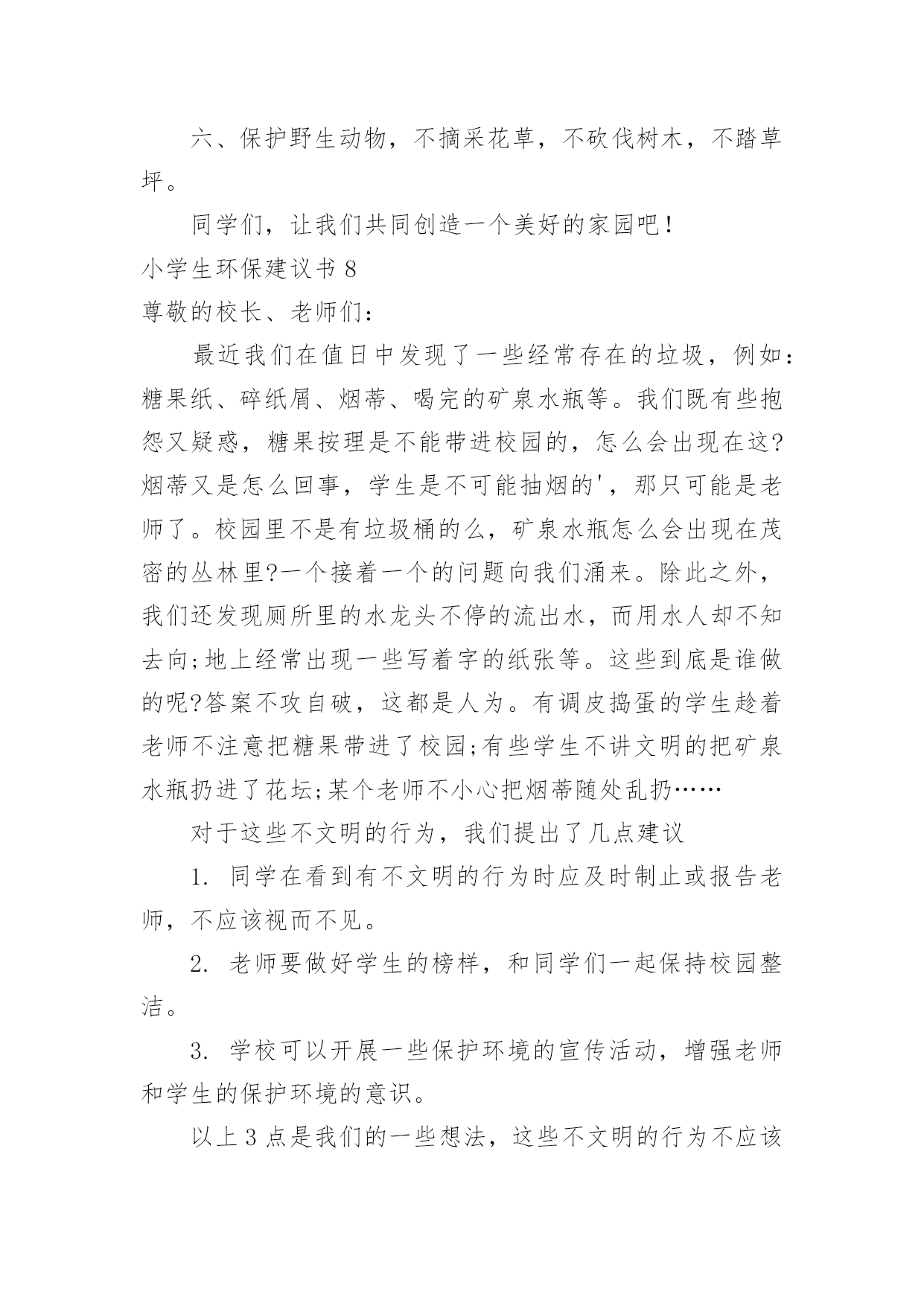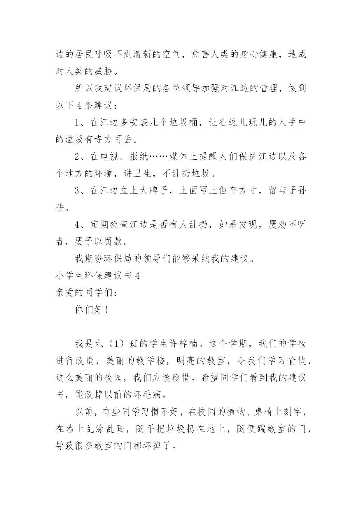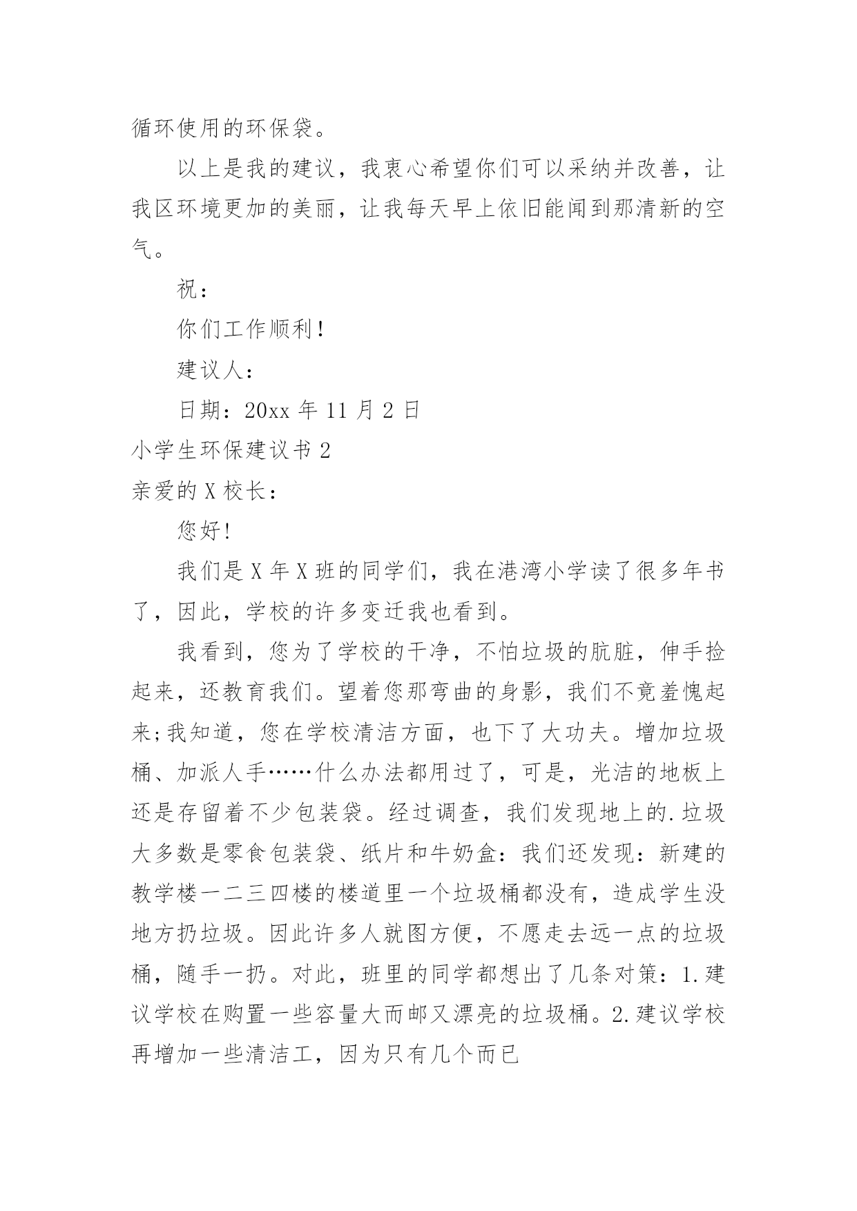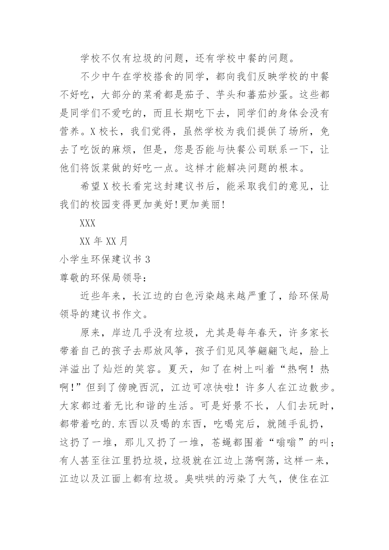 小学生环保建议书小学生环保建议书(15篇)在社会发展不断提速的今天,建议书在我们的视野里出现的频率越来越高,建议书是人们发表意见,提供建议的一种工具。如何写一份恰当的建议书呢?以下是小编整理的小学生环保建议书,仅供参考,欢迎大家阅读。小学生环保建议书1尊敬的环保部门:你们好!我是一名小学生。每天早上,走出家门,我都能闻到新鲜的空气,看到路边的美景,令人神清气爽,心情自然也好了起来。但是最近,我发现了我区的'卫生环境变差了,针对这些问题,我想给您提出一些建议:一、我们这里的垃圾桶较少,且大多数垃圾桶都没有分类,大家也容易把垃圾扔到外面,造成垃圾的堆积,散发出臭味。希望你们可以多增加一些垃圾桶,最好可以是分类垃圾桶。二、我区的空气环境较差,是因为有许多酒楼排放出的污气、污水,和汽车尾气排放导致的,希望你人向市民们提出低碳出行,向市民们提倡多骑骑自行车,和改善酒楼污水污气的排放。三、这里的许多小食店(如面店、快餐店等)都使用一次性筷子,还有很多超市都用一次性塑料袋,希望可以换成循环使用的环保袋。以上是我的建议,我衷心希望你们可以采纳并改善,让我区环境更加的美丽,让我每天早上依旧能闻到那清新的空气。祝:你们工作顺利!建议人:日期:20xx年11月2日小学生环保建议书2亲爱的X校长:您好!我们是X年X班的同学们,我在港湾小学读了很多年书了,因此,学校的许多变迁我也看到。我看到,您为了学校的干净,不怕垃圾的肮脏,伸手捡起来,还教育我们。望着您那弯曲的身影,我们不竟羞愧起来;我知道,您在学校清洁方面,也下了大功夫。增加垃圾桶、加派人手……什么办法都用过了,可是,光洁的地板上还是存留着不少包装袋。经过调查,我们发现地上的.垃圾大多数是零食包装袋、纸片和牛奶盒:我们还发现:新建的教学楼一二三四楼的楼道里一个垃圾桶都没有,造成学生没地方扔垃圾。因此许多人就图方便,不愿走去远一点的垃圾桶,随手一扔。对此,班里的同学都想出了几条对策:1.建议学校在购置一些容量大而邮又漂亮的垃圾桶。2.建议学校再增加一些清洁工,因为只有几个而已学校不仅有垃圾的问题,还有学校中餐的问题。不少中午在学校搭食的同学,都向我们反映学校的中餐不好吃,大部分的菜肴都是茄子、芋头和蕃茄炒蛋。这些都是同学们不爱吃的,而且长期吃下去,同学们的身体会没有营养。X校长,我们觉得,虽然学校为我们提供了场所,免去了吃饭的麻烦,但是,您是否能与快餐公司联系一下,让他们将饭菜做的好吃一点。这样才能解决问题的根本。希望X校长看完这封建议书后,能采取我们的意见,让我们的校园变得更加美好!更加美丽!XXXXX年XX月小学生环保建议书3尊敬的环保局领导:近些年来,长江边的白色污染越来越严重了,给环保局领导的建议书作文。原来,岸边几乎没有垃圾,尤其是每年春天,许多家长带着自己的孩子去那放风筝,孩子们见风筝翩翩飞起,脸上洋溢出了灿烂的笑容。夏天,知了在树上叫着“热啊!热啊!”但到了傍晚西沉,江边可凉快啦!许多人在江边散步。大家都过着无比和谐的生活。可是好景不长,人们去玩时,都带着吃的.东西以及喝的东西,吃喝完后,就随手乱扔,这扔了一堆,那儿又扔了一堆,苍蝇都围着“嗡嗡”的叫;有人甚至往江里扔垃圾,垃圾就在江边上荡啊荡,这样一来,江边以及江面上都有垃圾。臭哄哄的污染了大气,使住在江边的居民呼吸不到清新的空气,危害人类的身心健康,造成对人类的威胁。所以我建议环保局的各位领导加强对江边的管理,做到以下4条建议:1、在江边多安装几个垃圾桶,让在这儿玩儿的人手中的垃圾有寺方可丢。2、在电视、报纸……媒体上提醒人们保护江边以及各个地方的环境,讲卫生,不乱扔垃圾。3、在江边立上大牌子,上面写上但存方寸,留与子孙耕。4、定期检查江边是否有人乱扔,如果发现,屡劝不听者,要予以罚款。我期盼环保局的领导们能够采纳我的建议。小学生环保建议书4亲爱的同学们:你们好!我是六(1)班的学生许梓楠。这个学期,我们的学校进行改造,美丽的教学楼,明亮的教室,令我们学习愉快,这么美丽的校园,我们应该珍惜。希望同学们看到我的建议书,能改掉以前的坏毛病。以前,有些同学习惯不好,在校园的植物、桌椅上刻字,在墙上乱涂乱画,随手把垃圾扔在地上,随便踹教室的门,导致很多教室的门都坏掉了。这个学期,我们不能再这样了,对此,我提出以下建议:1.爱护学校的公共财产和一草一木。2.把垃圾扔到相应的垃圾箱,洗手后不要洒水,不然踩过后很脏。3.不要带零食上学,例如口香糖,吐到地上很难清理。保护校园是我们每个人都应该做到的,大家都应该做到上面几条,让我们每天都能在干净漂亮的`校园里学习,这样得益的还不是我们自己。希望我的建议书能使我们的校园更美丽。建议人:日期:小学生环保建议书5尊敬的各位老师,亲爱的同学们:大家好!我是育才学校六⑥班中的一员。学校,是我们大家一起生活