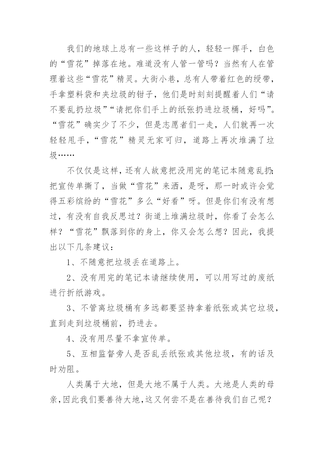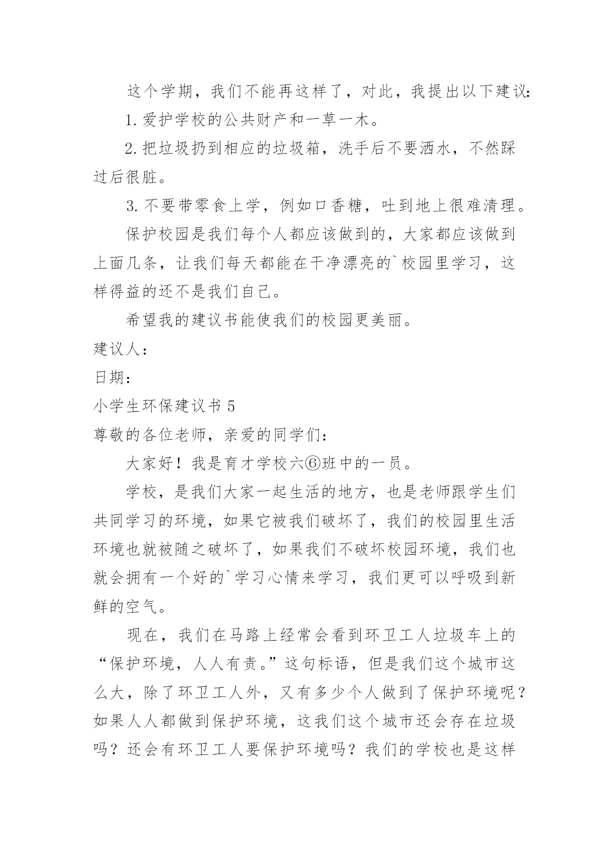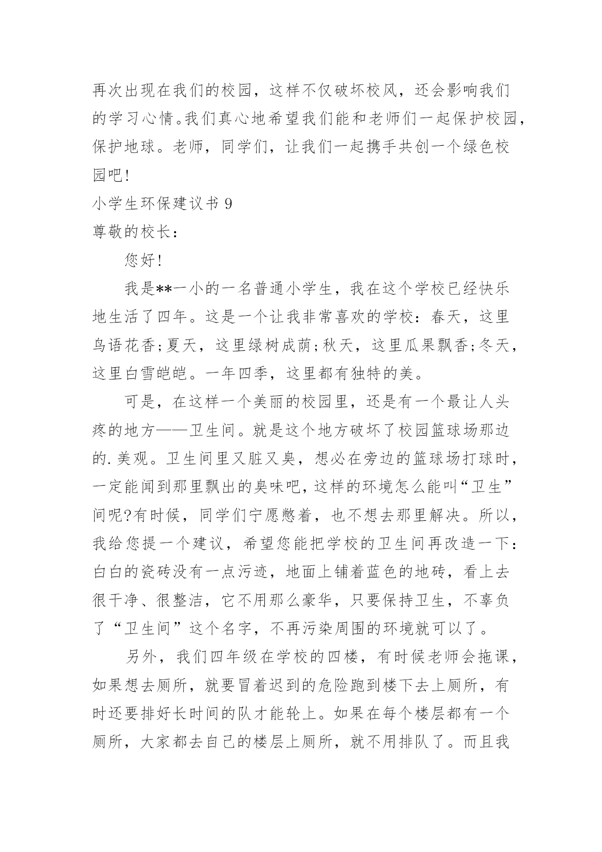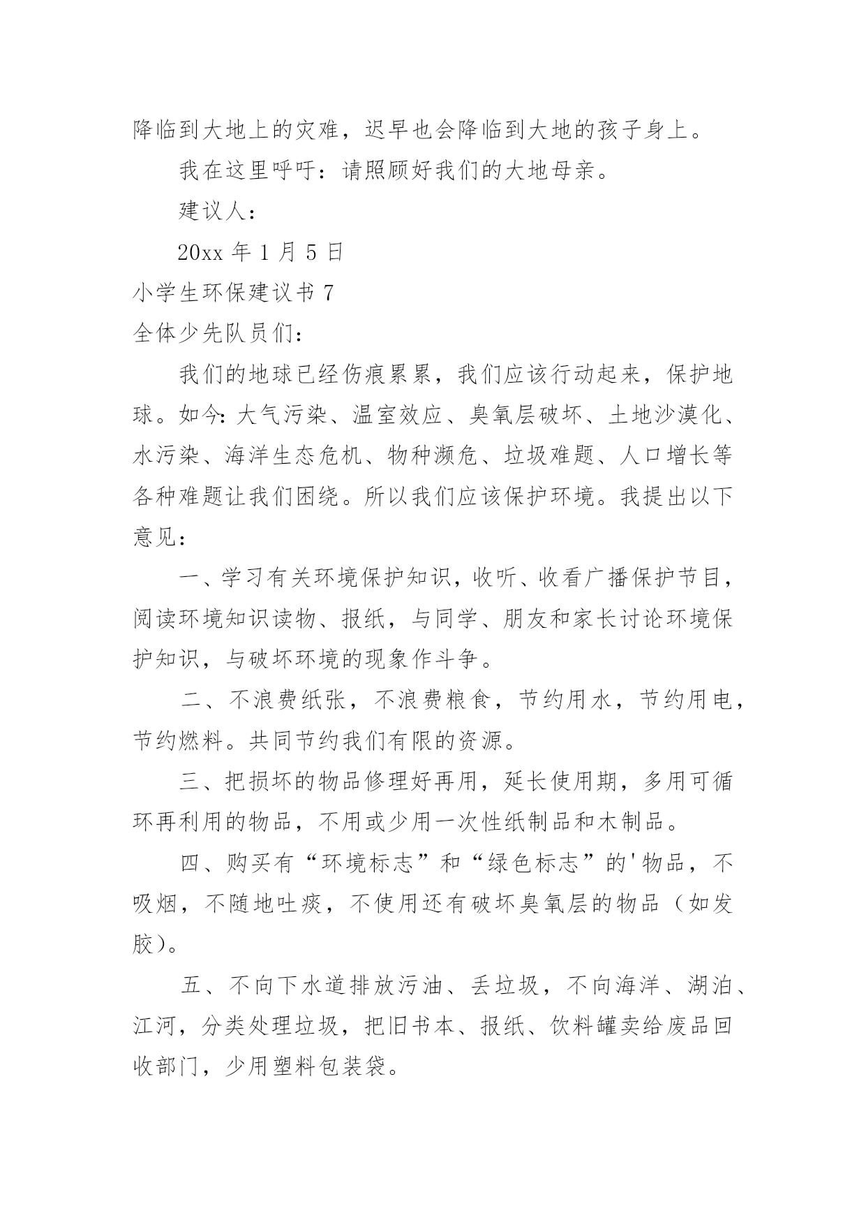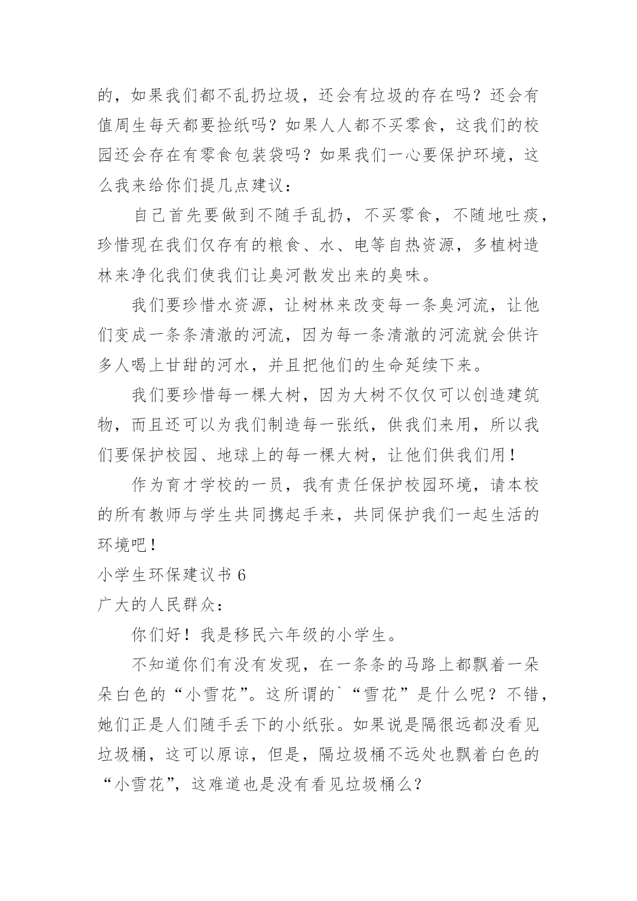 小学生环保建议书小学生环保建议书(15篇)在社会发展不断提速的今天,建议书在我们的视野里出现的频率越来越高,建议书是人们发表意见,提供建议的一种工具。如何写一份恰当的建议书呢?以下是小编整理的小学生环保建议书,仅供参考,欢迎大家阅读。小学生环保建议书1尊敬的环保部门:你们好!我是一名小学生。每天早上,走出家门,我都能闻到新鲜的空气,看到路边的美景,令人神清气爽,心情自然也好了起来。但是最近,我发现了我区的'卫生环境变差了,针对这些问题,我想给您提出一些建议:一、我们这里的垃圾桶较少,且大多数垃圾桶都没有分类,大家也容易把垃圾扔到外面,造成垃圾的堆积,散发出臭味。希望你们可以多增加一些垃圾桶,最好可以是分类垃圾桶。二、我区的空气环境较差,是因为有许多酒楼排放出的污气、污水,和汽车尾气排放导致的,希望你人向市民们提出低碳出行,向市民们提倡多骑骑自行车,和改善酒楼污水污气的排放。三、这里的许多小食店(如面店、快餐店等)都使用一次性筷子,还有很多超市都用一次性塑料袋,希望可以换成循环使用的环保袋。以上是我的建议,我衷心希望你们可以采纳并改善,让我区环境更加的美丽,让我每天早上依旧能闻到那清新的空气。祝:你们工作顺利!建议人:日期:20xx年11月2日小学生环保建议书2亲爱的X校长:您好!我们是X年X班的同学们,我在港湾小学读了很多年书了,因此,学校的许多变迁我也看到。我看到,您为了学校的干净,不怕垃圾的肮脏,伸手捡起来,还教育我们。望着您那弯曲的身影,我们不竟羞愧起来;我知道,您在学校清洁方面,也下了大功夫。增加垃圾桶、加派人手……什么办法都用过了,可是,光洁的地板上还是存留着不少包装袋。经过调查,我们发现地上的.垃圾大多数是零食包装袋、纸片和牛奶盒:我们还发现:新建的教学楼一二三四楼的楼道里一个垃圾桶都没有,造成学生没地方扔垃圾。因此许多人就图方便,不愿走去远一点的垃圾桶,随手一扔。对此,班里的同学都想出了几条对策:1.建议学校在购置一些容量大而邮又漂亮的垃圾桶。2.建议学校再增加一些清洁工,因为只有几个而已学校不仅有垃圾的问题,还有学校中餐的问题。不少中午在学校搭食的同学,都向我们反映学校的中餐不好吃,大部分的菜肴都是茄子、芋头和蕃茄炒蛋。这些都是同学们不爱吃的,而且长期吃下去,同学们的身体会没有营养。X校长,我们觉得,虽然学校为我们提供了场所,免去了吃饭的麻烦,但是,您是否能与快餐公司联系一下,让他们将饭菜做的好吃一点。这样才能解决问题的根本。希望X校长看完这封建议书后,能采取我们的意见,让我们的校园变得更加美好!更加美丽!XXXXX年XX月小学生环保建议书3尊敬的环保局领导:近些年来,长江边的白色污染越来越严重了,给环保局领导的建议书作文。原来,岸边几乎没有垃圾,尤其是每年春天,许多家长带着自己的孩子去那放风筝,孩子们见风筝翩翩飞起,脸上洋溢出了灿烂的笑容。夏天,知了在树上叫着“热啊!热啊!”但到了傍晚西沉,江边可凉快啦!许多人在江边散步。大家都过着无比和谐的生活。可是好景不长,人们去玩时,都带着吃的.东西以及喝的东西,吃喝完后,就随手乱扔,这扔了一堆,那儿又扔了一堆,苍蝇都围着“嗡嗡”的叫;有人甚至往江里扔垃圾,垃圾就在江边上荡啊荡,这样一来,江边以及江面上都有垃圾。臭哄哄的污染了大气,使住在江边的居民呼吸不到清新的空气,危害人类的身心健康,造成对人类的威胁。所以我建议环保局的各位领导加强对江边的管理,做到以下4条建议:1、在江边多安装几个垃圾桶,让在这儿玩儿的人手中的垃圾有寺方可丢。2、在电视、报纸……媒体上提醒人们保护江边以及各个地方的环境,讲卫生,不乱扔垃圾。3、在江边立上大牌子,上面写上但存方寸,留与子孙耕。4、定期检查江边是否有人乱扔,如果发现,屡劝不听者,要予以罚款。我期盼环保局的领导们能够采纳我的建议。小学生环保建议书4亲爱的同学们:你们好!我是六(1)班的学生许梓楠。这个学期,我们的学校进行改造,美丽的教学楼,明亮的教室,令我们学习愉快,这么美丽的校园,我们应该珍惜。希望同学们看到我的建议书,能改掉以前的坏毛病。以前,有些同学习惯不好,在校园的植物、桌椅上刻字,在墙上乱涂乱画,随手把垃圾扔在地上,随便踹教室的门,导致很多教室的门都坏掉了。这个学期,我们不能再这样了,对此,我提出以下建议:1.爱护学校的公共财产和一草一木。2.把垃圾扔到相应的垃圾箱,洗手后不要洒水,不然踩过后很脏。3.不要带零食上学,例如口香糖,吐到地上很难清理。保护校园是我们每个人都应该做到的,大家都应该做到上面几条,让我们每天都能在干净漂亮的`校园里学习,这样得益的还不是我们自己。希望我的建议书能使我们的校园更美丽。建议人:日期:小学生环保建议书5尊敬的各位老师,亲爱的同学们:大家好!我是育才学校六⑥班中的一员。学校,是我们大家一起生活