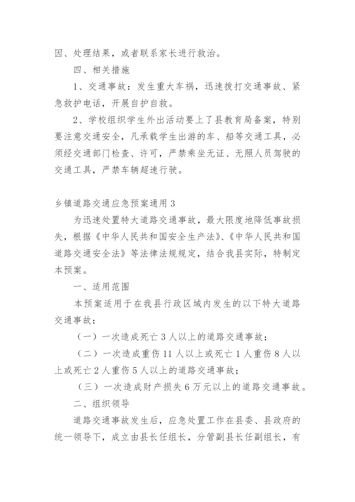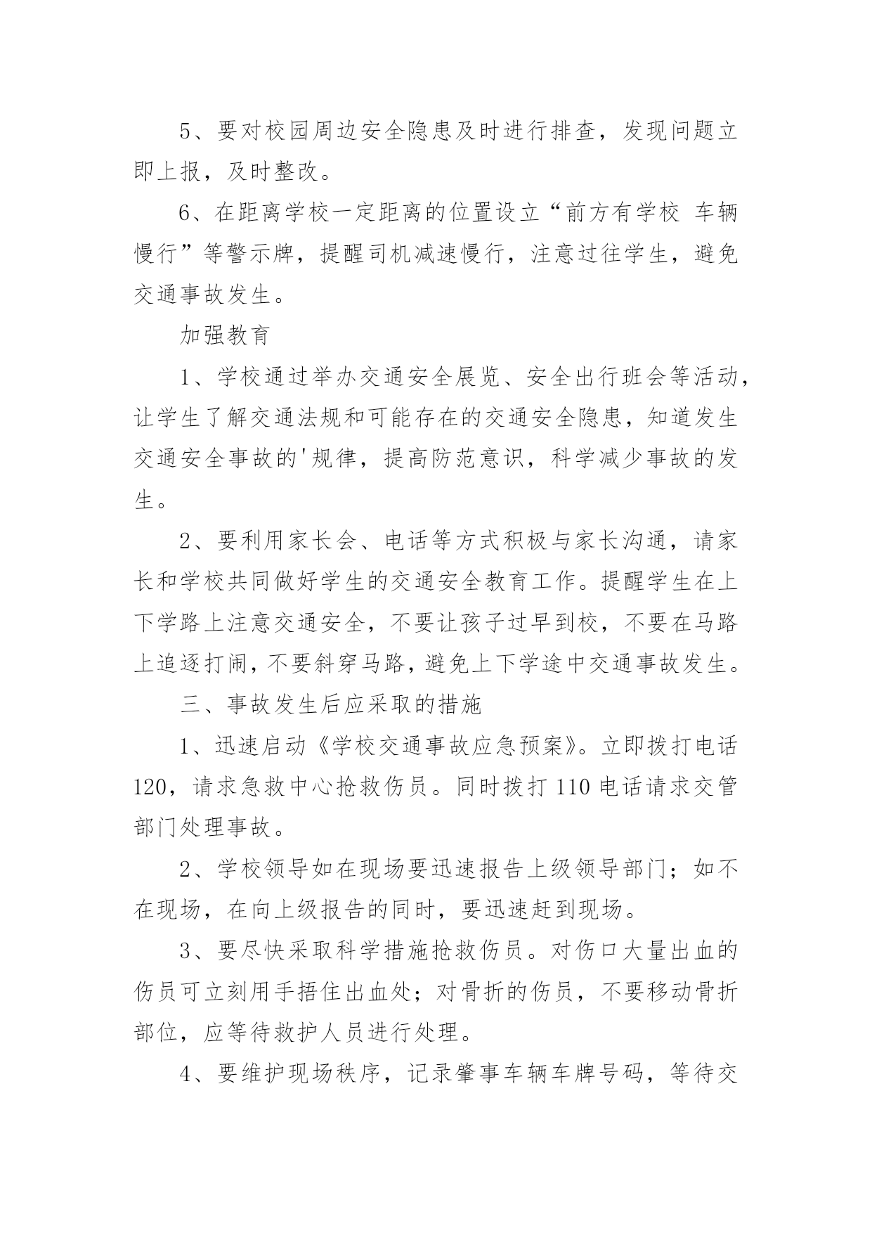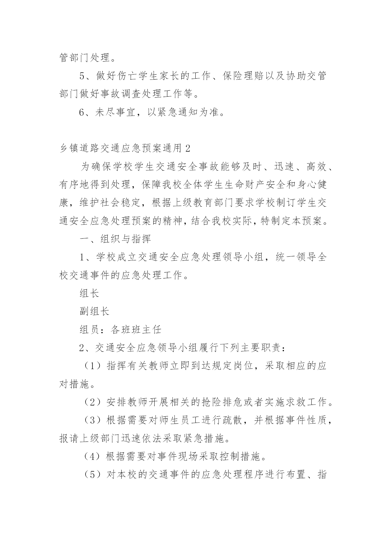 乡镇道路交通应急预案乡镇道路交通应急预案通用在学习、工作或是生活中,有时会面对自然灾害、重特大事故、环境公害及人为破坏等突发事件,为了控制事故的发展,时常需要预先编制应急预案。应急预案应该怎么编制呢?以下是小编精心整理的乡镇道路交通应急预案通用,欢迎大家借鉴与参考,希望对大家有所帮助。乡镇道路交通应急预案通用1一、成立安全领导小组组长:副组长:成员:二、安全工作措施加强管理1、建立在开学初和节假日前集中对学生进行交通安全教育制度。2、建立路队制度。结合学校实际情况放学统一排队,在路上要求学生靠右边行走,确保安全。3、值班人员要按时到岗,在学生集中上下学的时段,维护好校门前道路交通秩序,以确保学生人身安全。4、遇到雨雪天气时应提前通知各年级学生提前放学或者延迟上学,并在大门口引导学生安全离开学校。5、要对校园周边安全隐患及时进行排查,发现问题立即上报,及时整改。6、在距离学校一定距离的位置设立“前方有学校车辆慢行”等警示牌,提醒司机减速慢行,注意过往学生,避免交通事故发生。加强教育1、学校通过举办交通安全展览、安全出行班会等活动,让学生了解交通法规和可能存在的交通安全隐患,知道发生交通安全事故的'规律,提高防范意识,科学减少事故的发生。2、要利用家长会、电话等方式积极与家长沟通,请家长和学校共同做好学生的交通安全教育工作。提醒学生在上下学路上注意交通安全,不要让孩子过早到校,不要在马路上追逐打闹,不要斜穿马路,避免上下学途中交通事故发生。三、事故发生后应采取的措施1、迅速启动《学校交通事故应急预案》。立即拨打电话120,请求急救中心抢救伤员。同时拨打110电话请求交管部门处理事故。2、学校领导如在现场要迅速报告上级领导部门;如不在现场,在向上级报告的同时,要迅速赶到现场。3、要尽快采取科学措施抢救伤员。对伤口大量出血的伤员可立刻用手捂住出血处;对骨折的伤员,不要移动骨折部位,应等待救护人员进行处理。4、要维护现场秩序,记录肇事车辆车牌号码,等待交管部门处理。5、做好伤亡学生家长的工作、保险理赔以及协助交管部门做好事故调查处理工作等。6、未尽事宜,以紧急通知为准。乡镇道路交通应急预案通用2为确保学校学生交通安全事故能够及时、迅速、高效、有序地得到处理,保障我校全体学生生命财产安全和身心健康,维护社会稳定,根据上级教育部门要求学校制订学生交通安全应急处理预案的精神,结合我校实际,特制定本预案。一、组织与指挥1、学校成立交通安全应急处理领导小组,统一领导全校交通事件的应急处理工作。组长副组长组员:各班班主任2、交通安全应急领导小组履行下列主要职责:(1)指挥有关教师立即到达规定岗位,采取相应的应对措施。(2)安排教师开展相关的抢险排危或者实施求救工作。(3)根据需要对师生员工进行疏散,并根据事件性质,报请上级部门迅速依法采取紧急措施。(4)根据需要对事件现场采取控制措施。(5)对本校的交通事件的应急处理程序进行布置、指导。二、制定学生交通安全守则1、校内:(1)学生在校内不准骑自行车。(2)学生自行车要按学校规定停放的地方放好并上好“两锁”,按要求摆放整齐。(3)学生自行车不得放到老师的车棚、各楼梯口及其它非停车的公共地方,只可放到指定的地点。(4)学生自行车要锁、牌齐全,严禁骑“黑车”。2、行人须在人行道上行走,没有人行道的.靠右边行走。3、横过马路先看清是否有来车,并要按交通指示灯走人行横道或斑马线。不准在车辆临近时突然横穿硬闯。4、不准在公路上追逐、嬉戏、猛跑。5、不准在公路上踢球、跳绳、溜冰、表演玩耍。6、不能边走路边看书。7、不准扒车追车,不准强行拦车、不准抛物击车。8、不准跨越,倚坐人行道、车行道和铁道口护栏。9、学生一律不准驾驶机动车辆,学生骑自行车上学时必须遵守以下规定:(1)自行车上学时的车铃、车掣反应器必须齐全有效。(2)不准双手离开车把,不准站在后架上,不准一人蹬车一人扶把。(3)不准赛车或玩车技,不准追汽车斗气。(4)不准牵引、拖带车辆或被其他车辆牵引、拖带。(5)骑车时不准勾肩搭背,不准互相追逐,不准并排行车。(6)不准在车把上悬挂影响转向的物品。(7)不准在人行道上骑车,不准在马路上学骑车。(8)通过陡坡时不要高速滑行,连串或曲线竞驶。(9)骑车转弯前须减速慢行,向后望,并伸手示意,不准突然猛拐。(10)进出校门必须下车推行。10、要增强交通安全意识,走路,骑车都必须自觉遵守交通规则。11、中午未到校门开启时间不准在校门口聚集,更不准追逐打闹。三、应急调查与救治1、交通事件发生后,校应急处理领导小组及有关部门,负责组织对交通事件进行调查处理。通过对交通事件调查、现场勘验,采取控制措施等,对危害程度做出评估。2、交通事件发生后,在进行事件调查和现场处理的同时,学校应当立即将交通事件所致的伤亡病人送向学校医