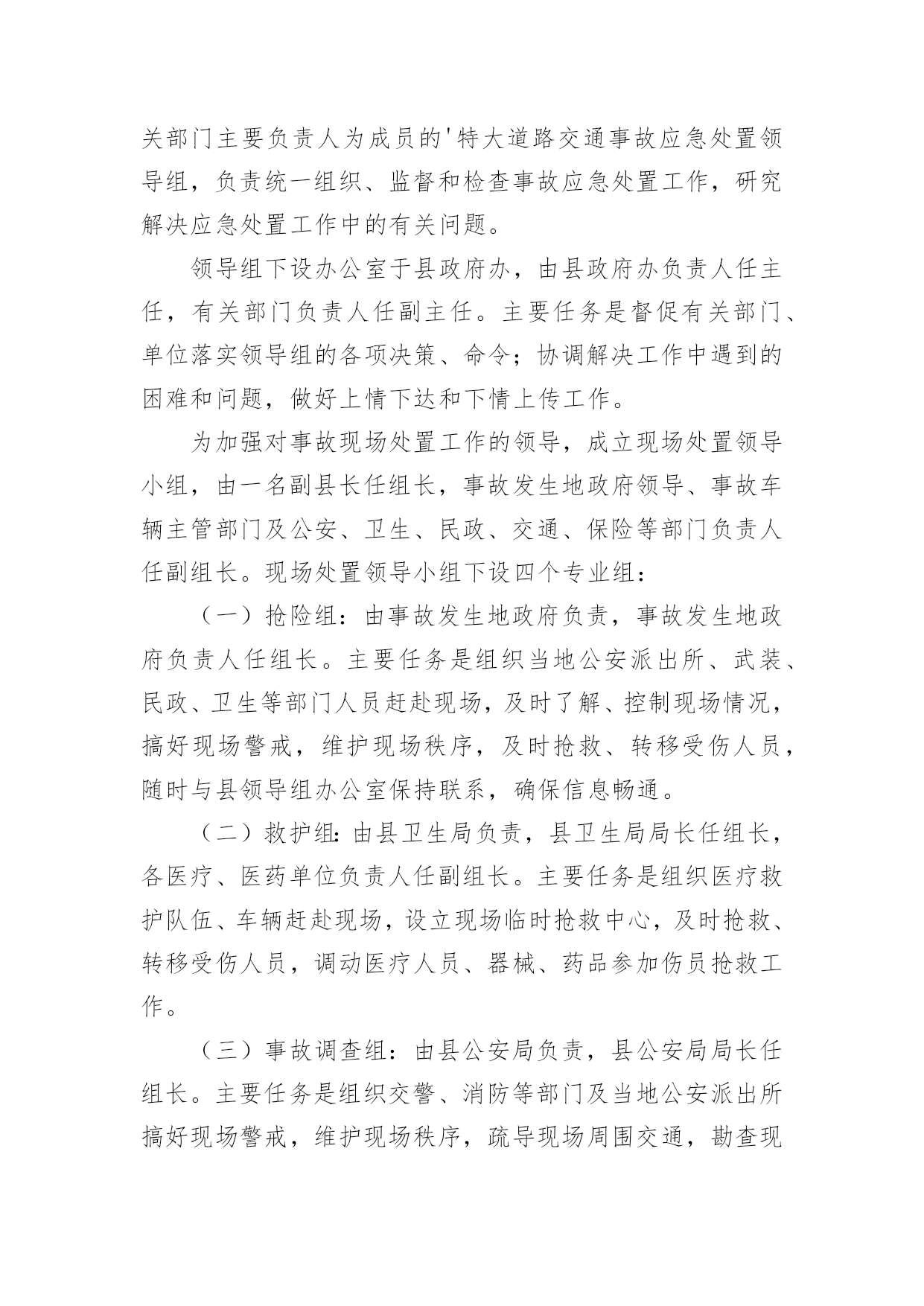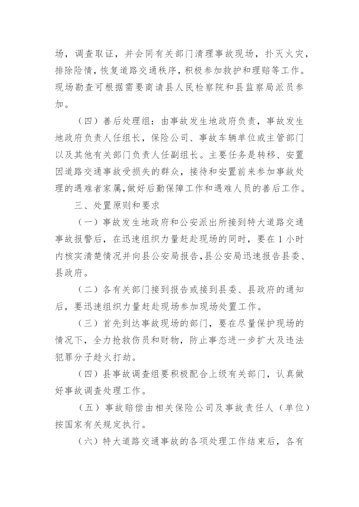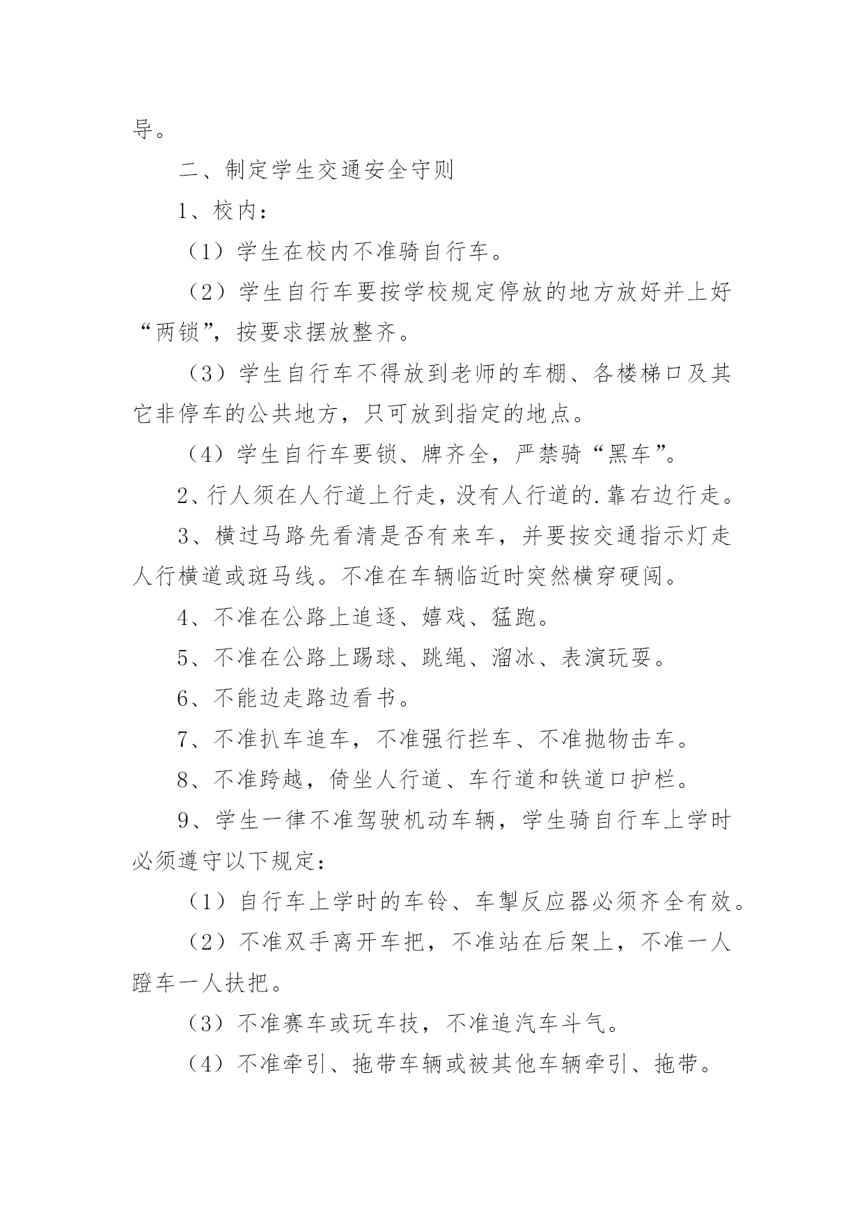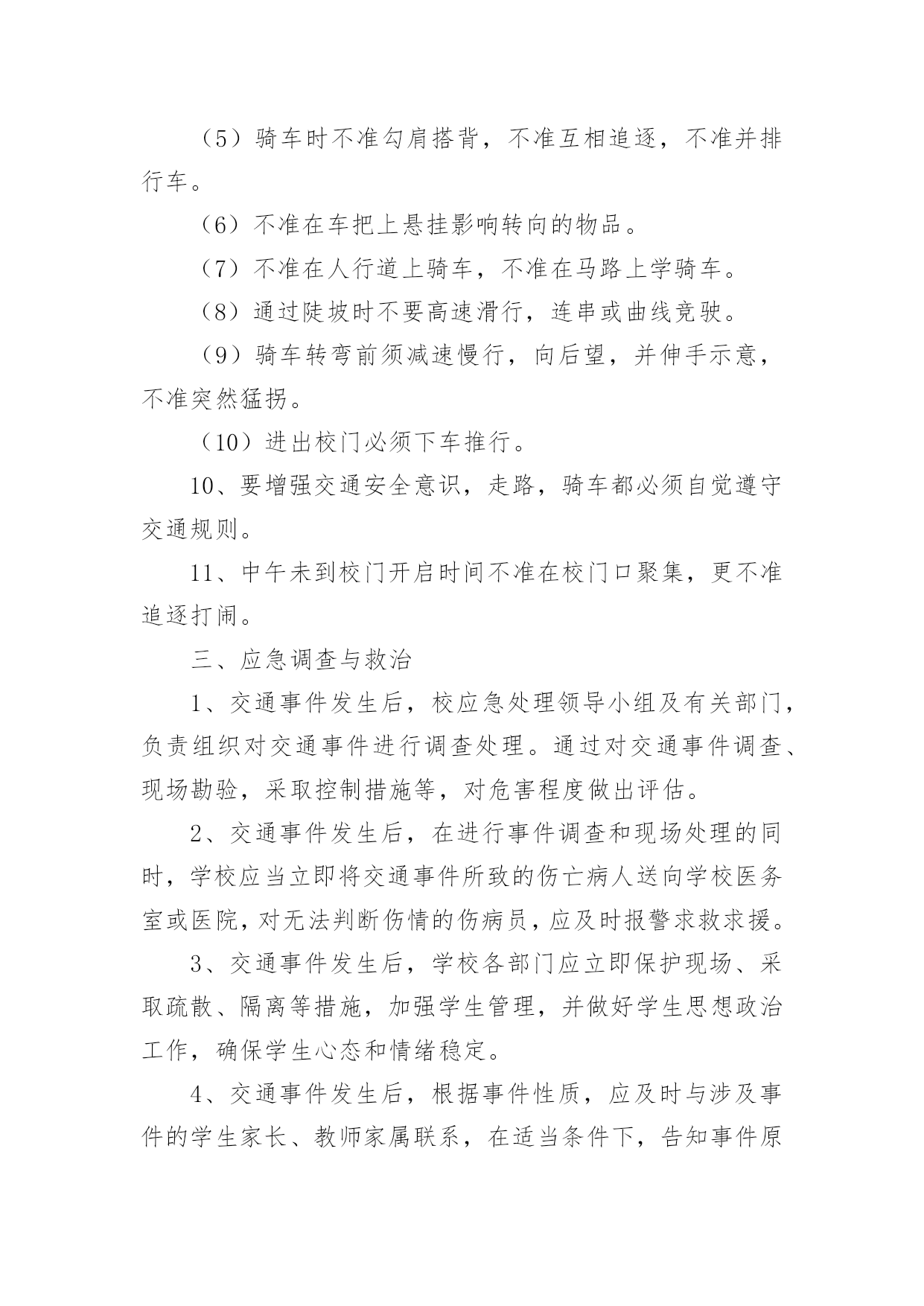 乡镇道路交通应急预案乡镇道路交通应急预案通用在学习、工作或是生活中,有时会面对自然灾害、重特大事故、环境公害及人为破坏等突发事件,为了控制事故的发展,时常需要预先编制应急预案。应急预案应该怎么编制呢?以下是小编精心整理的乡镇道路交通应急预案通用,欢迎大家借鉴与参考,希望对大家有所帮助。乡镇道路交通应急预案通用1一、成立安全领导小组组长:副组长:成员:二、安全工作措施加强管理1、建立在开学初和节假日前集中对学生进行交通安全教育制度。2、建立路队制度。结合学校实际情况放学统一排队,在路上要求学生靠右边行走,确保安全。3、值班人员要按时到岗,在学生集中上下学的时段,维护好校门前道路交通秩序,以确保学生人身安全。4、遇到雨雪天气时应提前通知各年级学生提前放学或者延迟上学,并在大门口引导学生安全离开学校。5、要对校园周边安全隐患及时进行排查,发现问题立即上报,及时整改。6、在距离学校一定距离的位置设立“前方有学校车辆慢行”等警示牌,提醒司机减速慢行,注意过往学生,避免交通事故发生。加强教育1、学校通过举办交通安全展览、安全出行班会等活动,让学生了解交通法规和可能存在的交通安全隐患,知道发生交通安全事故的'规律,提高防范意识,科学减少事故的发生。2、要利用家长会、电话等方式积极与家长沟通,请家长和学校共同做好学生的交通安全教育工作。提醒学生在上下学路上注意交通安全,不要让孩子过早到校,不要在马路上追逐打闹,不要斜穿马路,避免上下学途中交通事故发生。三、事故发生后应采取的措施1、迅速启动《学校交通事故应急预案》。立即拨打电话120,请求急救中心抢救伤员。同时拨打110电话请求交管部门处理事故。2、学校领导如在现场要迅速报告上级领导部门;如不在现场,在向上级报告的同时,要迅速赶到现场。3、要尽快采取科学措施抢救伤员。对伤口大量出血的伤员可立刻用手捂住出血处;对骨折的伤员,不要移动骨折部位,应等待救护人员进行处理。4、要维护现场秩序,记录肇事车辆车牌号码,等待交管部门处理。5、做好伤亡学生家长的工作、保险理赔以及协助交管部门做好事故调查处理工作等。6、未尽事宜,以紧急通知为准。乡镇道路交通应急预案通用2为确保学校学生交通安全事故能够及时、迅速、高效、有序地得到处理,保障我校全体学生生命财产安全和身心健康,维护社会稳定,根据上级教育部门要求学校制订学生交通安全应急处理预案的精神,结合我校实际,特制定本预案。一、组织与指挥1、学校成立交通安全应急处理领导小组,统一领导全校交通事件的应急处理工作。组长副组长组员:各班班主任2、交通安全应急领导小组履行下列主要职责:(1)指挥有关教师立即到达规定岗位,采取相应的应对措施。(2)安排教师开展相关的抢险排危或者实施求救工作。(3)根据需要对师生员工进行疏散,并根据事件性质,报请上级部门迅速依法采取紧急措施。(4)根据需要对事件现场采取控制措施。(5)对本校的交通事件的应急处理程序进行布置、指导。二、制定学生交通安全守则1、校内:(1)学生在校内不准骑自行车。(2)学生自行车要按学校规定停放的地方放好并上好“两锁”,按要求摆放整齐。(3)学生自行车不得放到老师的车棚、各楼梯口及其它非停车的公共地方,只可放到指定的地点。(4)学生自行车要锁、牌齐全,严禁骑“黑车”。2、行人须在人行道上行走,没有人行道的.靠右边行走。3、横过马路先看清是否有来车,并要按交通指示灯走人行横道或斑马线。不准在车辆临近时突然横穿硬闯。4、不准在公路上追逐、嬉戏、猛跑。5、不准在公路上踢球、跳绳、溜冰、表演玩耍。6、不能边走路边看书。7、不准扒车追车,不准强行拦车、不准抛物击车。8、不准跨越,倚坐人行道、车行道和铁道口护栏。9、学生一律不准驾驶机动车辆,学生骑自行车上学时必须遵守以下规定:(1)自行车上学时的车铃、车掣反应器必须齐全有效。(2)不准双手离开车把,不准站在后架上,不准一人蹬车一人扶把。(3)不准赛车或玩车技,不准追汽车斗气。(4)不准牵引、拖带车辆或被其他车辆牵引、拖带。(5)骑车时不准勾肩搭背,不准互相追逐,不准并排行车。(6)不准在车把上悬挂影响转向的物品。(7)不准在人行道上骑车,不准在马路上学骑车。(8)通过陡坡时不要高速滑行,连串或曲线竞驶。(9)骑车转弯前须减速慢行,向后望,并伸手示意,不准突然猛拐。(10)进出校门必须下车推行。10、要增强交通安全意识,走路,骑车都必须自觉遵守交通规则。11、中午未到校门开启时间不准在校门口聚集,更不准追逐打闹。三、应急调查与救治1、交通事件发生后,校应急处理领导小组及有关部门,负责组织对交通事件进行调查处理。通过对交通事件调查、现场勘验,采取控制措施等,对危害程度做出评估。2、交通事件发生后,在进行事件调查和现场处理的同时,学校应当立即将交通事件所致的伤亡病人送向学校医