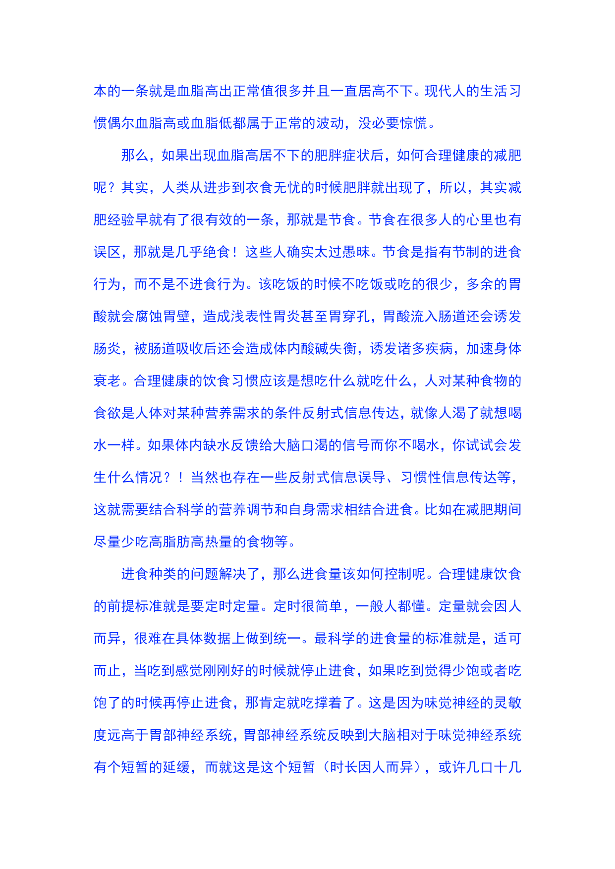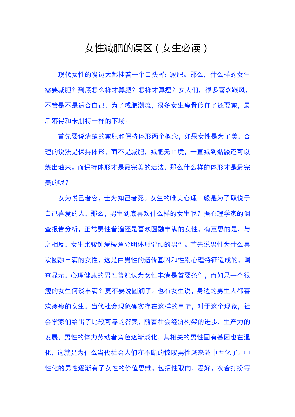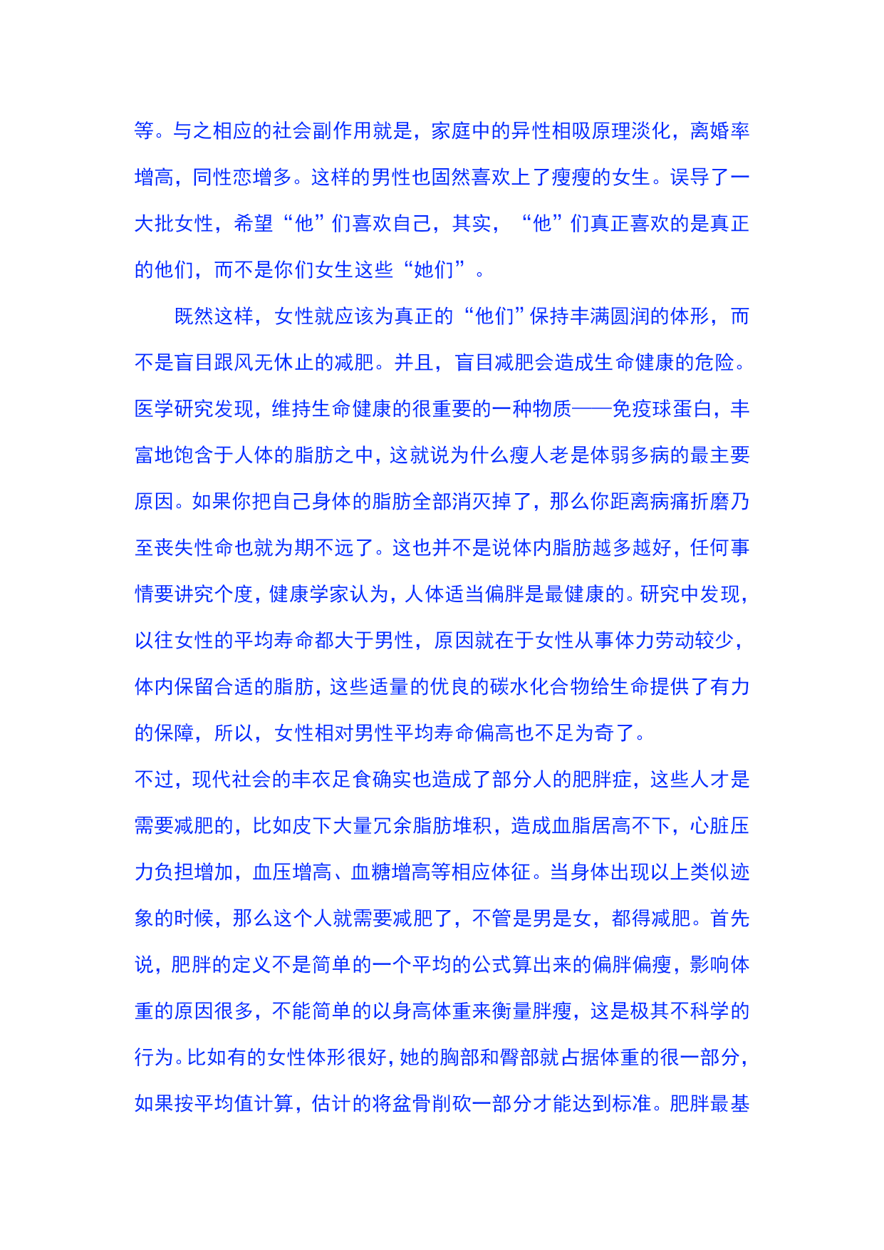 女性减肥的误区(女生必读)现代女性的嘴边大都挂着一个口头禅:减肥。那么,什么样的女生需要减肥?到底怎么样才算肥?怎样才算瘦?女人们,很多喜欢跟风,不管是不是适合自己,为了减肥潮流,很多女生瘦骨伶仃了还要减,最后落得和卡朋特一样的下场。首先要说清楚的减肥和保持体形两个概念,如果女性是为了美,合理的说法是保持体形,而不是减肥,减肥无止境,一直减到骷髅还可以炼出油来。而保持体形才是最完美的活法,那么什么样的体形才是最完美的呢?女为悦己者容,士为知己者死。女生的唯美心理一般是为了取悦于自己喜爱的人,那么,男生到底喜欢什么样的女生呢?据心理学家的调查报告分析,正常男性普遍还是喜欢圆融丰满的女性,有意思的是,与之相反,女生比较钟爱棱角分明体形健硕的男性。首先说男性为什么喜欢圆融丰满的女性,这是由男性的遗传基因和性别心理特征造成的,调查显示,心理健康的男性普遍认为女性丰满是首要条件,而如果一个很瘦的女生何谈丰满?更不要说圆润了。也有女生说,身边的男生大都喜欢瘦瘦的女生,当代社会现象确实存在这样的事情,对于这个现象,社会学家们给出了比较可靠的答案,随着社会经济构架的进步,生产力的发展,男性的体力劳动者角色逐渐淡化,其相关的男性固有基因也在退化,这就是为什么当代社会人们在不断的惊叹男性越来越中性化了。中性化的男性逐渐有了女性的价值思维,包括性取向、爱好、衣着打扮等等。与之相应的社会副作用就是,家庭中的异性相吸原理淡化,离婚率增高,同性恋增多。这样的男性也固然喜欢上了瘦瘦的女生。误导了一大批女性,希望“他”们喜欢自己,其实,“他”们真正喜欢的是真正的他们,而不是你们女生这些“她们”。既然这样,女性就应该为真正的“他们”保持丰满圆润的体形,而不是盲目跟风无休止的减肥。并且,盲目减肥会造成生命健康的危险。医学研究发现,维持生命健康的很重要的一种物质——免疫球蛋白,丰富地饱含于人体的脂肪之中,这就说为什么瘦人老是体弱多病的最主要原因。如果你把自己身体的脂肪全部消灭掉了,那么你距离病痛折磨乃至丧失性命也就为期不远了。这也并不是说体内脂肪越多越好,任何事情要讲究个度,健康学家认为,人体适当偏胖是最健康的。研究中发现,以往女性的平均寿命都大于男性,原因就在于女性从事体力劳动较少,体内保留合适的脂肪,这些适量的优良的碳水化合物给生命提供了有力的保障,所以,女性相对男性平均寿命偏高也不足为奇了。不过,现代社会的丰衣足食确实也造成了部分人的肥胖症,这些人才是需要减肥的,比如皮下大量冗余脂肪堆积,造成血脂居高不下,心脏压力负担增加,血压增高、血糖增高等相应体征。当身体出现以上类似迹象的时候,那么这个人就需要减肥了,不管是男是女,都得减肥。首先说,肥胖的定义不是简单的一个平均的公式算出来的偏胖偏瘦,影响体重的原因很多,不能简单的以身高体重来衡量胖瘦,这是极其不科学的行为。比如有的女性体形很好,她的胸部和臀部就占据体重的很一部分,如果按平均值计算,估计的将盆骨削砍一部分才能达到标准。肥胖最基本的一条就是血脂高出正常值很多并且一直居高不下。现代人的生活习惯偶尔血脂高或血脂低都属于正常的波动,没必要惊慌。那么,如果出现血脂高居不下的肥胖症状后,如何合理健康的减肥呢?其实,人类从进步到衣食无忧的时候肥胖就出现了,所以,其实减肥经验早就有了很有效的一条,那就是节食。节食在很多人的心里也有误区,那就是几乎绝食!这些人确实太过愚昧。节食是指有节制的进食行为,而不是不进食行为。该吃饭的时候不吃饭或吃的很少,多余的胃酸就会腐蚀胃壁,造成浅表性胃炎甚至胃穿孔,胃酸流入肠道还会诱发肠炎,被肠道吸收后还会造成体内酸碱失衡,诱发诸多疾病,加速身体衰老。合理健康的饮食习惯应该是想吃什么就吃什么,人对某种食物的食欲是人体对某种营养需求的条件反射式信息传达,就像人渴了就想喝水一样。如果体内缺水反馈给大脑口渴的信号而你不喝水,你试试会发生什么情况?!当然也存在一些反射式信息误导、习惯性信息传达等,这就需要结合科学的营养调节和自身需求相结合进食。比如在减肥期间尽量少吃高脂肪高热量的食物等。进食种类的问题解决了,那么进食量该如何控制呢。合理健康饮食的前提标准就是要定时定量。定时很简单,一般人都懂。定量就会因人而异,很难在具体数据上做到统一。最科学的进食量的标准就是,适可而止,当吃到感觉刚刚好的时候就停止进食,如果吃到觉得少饱或者吃饱了的时候再停止进食,那肯定就吃撑着了。这是因为味觉神经的灵敏度远高于胃部神经系统,胃部神经系统反映到大脑相对于味觉神经系统有个短暂的延缓,而就这是这个短暂(时长因人而异),或许几口十几口食物就进去了,胃本来相对就那么大的地方,几口十几口的食物进去了,能不撑着吗?所以,进食的时候要预留出这个感觉信息传达时差,吃到刚好就停止进食,休息一会儿,你就会有饱的感觉了。按照
