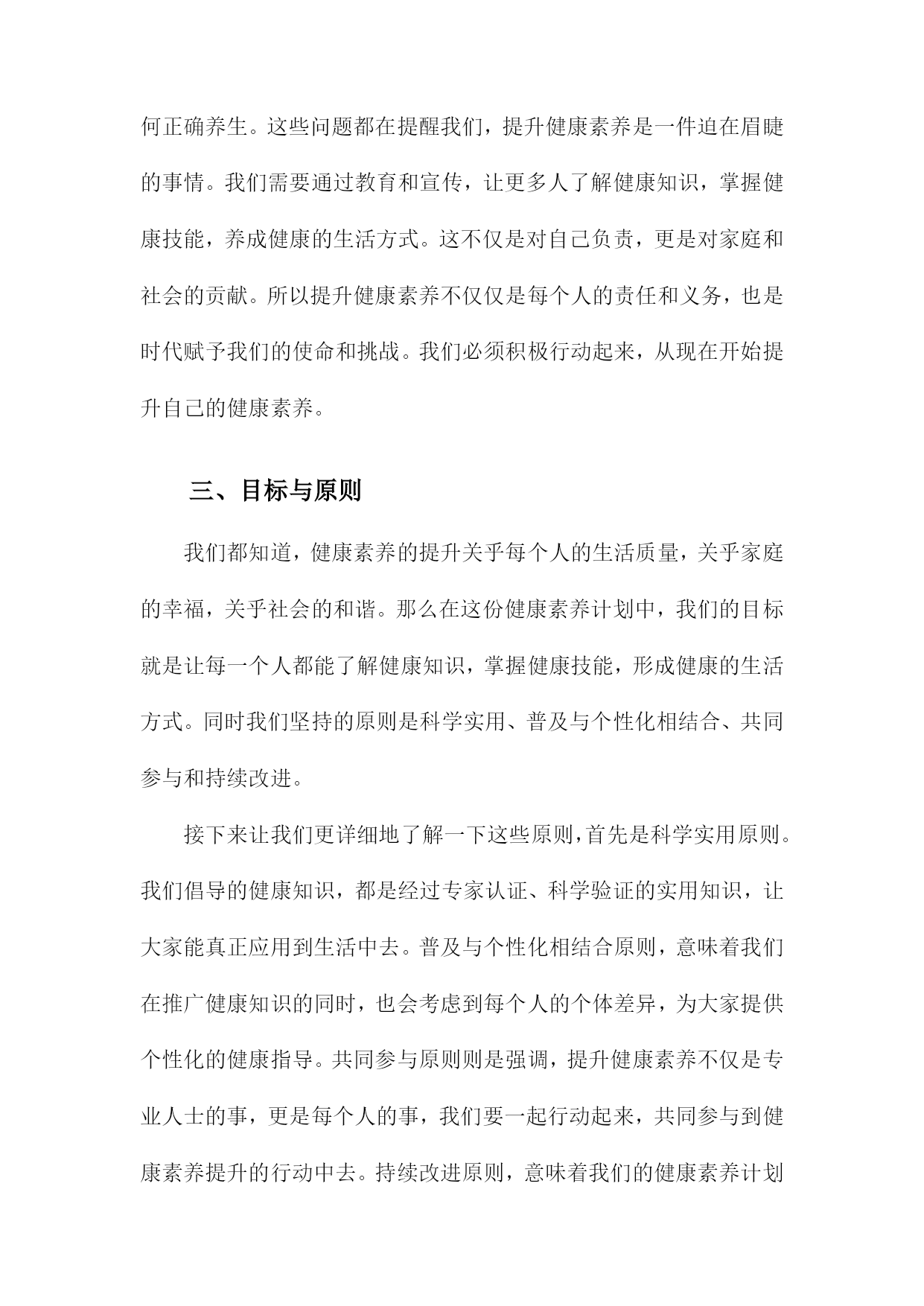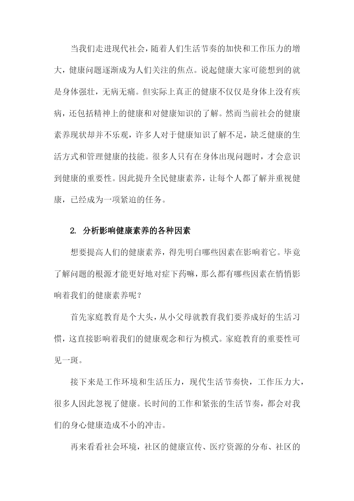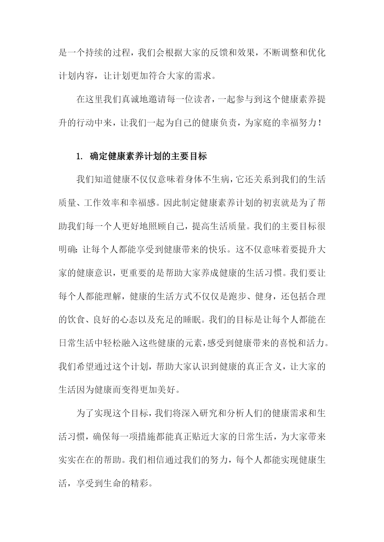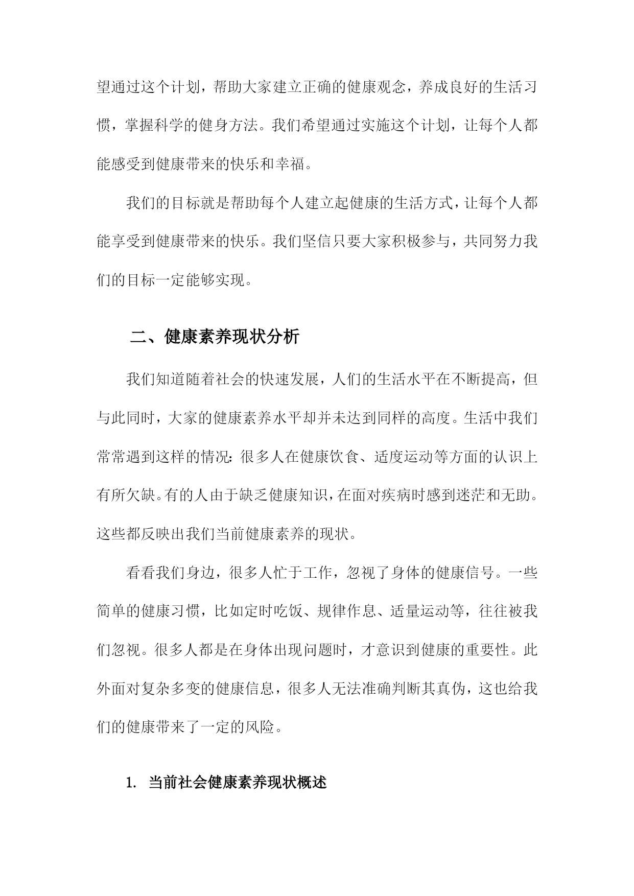 健康素养计划及方案一、概述我们都知道,健康是生活的基石,是我们追求幸福和成功的前提。无论是对于我们每一个人还是整个社会来说,保持健康都至关重要。为此我们需要了解基础的健康知识,养成健康的生活习惯。因此我们制定了这份《健康素养计划及方案》。接下来让我们一起走进这份计划,共同探索如何更好地守护我们的健康。1.阐述健康素养的重要性及其对个人和社会的意义健康素养听起来好像是个很专业的词汇,但其实它与我们每个人的生活息息相关。简单地说健康素养就是我们在生活中理解和实践健康知识、技能的能力。它关乎我们的生活质量,关乎我们的幸福感受,甚至关乎我们的未来。想象一下如果我们不了解基本的健康知识,不懂得如何照顾自己,那么我们的身体可能会经常出问题,影响到我们的工作、学习和生活。而健康素养的提高,就像给我们身体里注入一股强大的力量,让我们能更好地应对生活中的各种挑战。不仅如此当我们掌握了更多的健康知识和技能时,我们就能更好地为自己和家人提供保护,减少疾病的发生,这也是对社会的一种贡献。个人方面健康素养的提升意味着我们能更好地管理自己的健康,享受更高质量的生活。当我们掌握了足够的健康知识,就能做出更健康的选择,比如选择吃什么、如何运动等。这样我们不仅能拥有更好的身体状态,还能拥有更多的精力和时间去追求我们的梦想。社会方面公民的健康素养提高意味着整个社会将更富有活力、更和谐。一个充满健康素养的社会,将拥有更低的医疗负担,更高的生产力。此外健康素养的提升还能推动社会形成良好的健康氛围,促进社区之间的互助合作,共同构建一个更加美好的生活环境。所以无论是对于个人还是社会,健康素养的提升都是至关重要的。它就像一盏明灯,照亮我们追求健康和幸福的道路。让我们携手努力,共同提高健康素养,为我们的生活和社会做出贡献吧!2.介绍健康素养计划的目的、宗旨及预期成果接下来让我们深入了解《健康素养计划及方案》的第二部分:介绍健康素养计划的目的、宗旨及预期成果。大家都知道,健康是我们最宝贵的财富。为了提升大家的健康水平,我们制定了这份健康素养计划。我们的目的很简单,就是希望通过这个计划,让每个人都能明白健康的重要性,并知道如何去维护和提升自己的健康水平。我们的宗旨是:人人享有健康生活,人人享有健康权利。我们希望通过这个计划,帮助大家建立正确的健康观念,养成良好的生活习惯,掌握科学的健身方法。我们希望通过实施这个计划,让每个人都能感受到健康带来的快乐和幸福。我们的目标就是帮助每个人建立起健康的生活方式,让每个人都能享受到健康带来的快乐。我们坚信只要大家积极参与,共同努力我们的目标一定能够实现。二、健康素养现状分析我们知道随着社会的快速发展,人们的生活水平在不断提高,但与此同时,大家的健康素养水平却并未达到同样的高度。生活中我们常常遇到这样的情况:很多人在健康饮食、适度运动等方面的认识上有所欠缺。有的人由于缺乏健康知识,在面对疾病时感到迷茫和无助。这些都反映出我们当前健康素养的现状。看看我们身边,很多人忙于工作,忽视了身体的健康信号。一些简单的健康习惯,比如定时吃饭、规律作息、适量运动等,往往被我们忽视。很多人都是在身体出现问题时,才意识到健康的重要性。此外面对复杂多变的健康信息,很多人无法准确判断其真伪,这也给我们的健康带来了一定的风险。1.当前社会健康素养现状概述当我们走进现代社会,随着人们生活节奏的加快和工作压力的增大,健康问题逐渐成为人们关注的焦点。说起健康大家可能想到的就是身体强壮,无病无痛。但实际上真正的健康不仅仅是身体上没有疾病,还包括精神上的健康和对健康知识的了解。然而当前社会的健康素养现状却并不乐观,许多人对于健康知识了解不足,缺乏健康的生活方式和管理健康的技能。很多人只有在身体出现问题时,才会意识到健康的重要性。因此提升全民健康素养,让每个人都了解并重视健康,已经成为一项紧迫的任务。2.分析影响健康素养的各种因素想要提高人们的健康素养,得先明白哪些因素在影响着它。毕竟了解问题的根源才能更好地对症下药嘛,那么都有哪些因素在悄悄影响着我们的健康素养呢?首先家庭教育是个大头,从小父母就教育我们要养成好的生活习惯,这直接影响着我们的健康观念和行为模式。家庭教育的重要性可见一斑。接下来是工作环境和生活压力,现代生活节奏快,工作压力大,很多人因此忽视了健康。长时间的工作和紧张的生活节奏,都会对我们的身心健康造成不小的冲击。再来看看社会环境,社区的健康宣传、医疗资源的分布、社区的整体卫生状况等,都会影响到人们的健康素养。比如说如果社区经常组织健康讲座,大家的健康意识就会更高。当然还有个人的知识和认知程度,了解越多关于健康的知识,我们越能更好地做出健康的选择和行为。比如知道哪种食物更有营养,哪种运动更适合自己。媒体宣传和信息传播