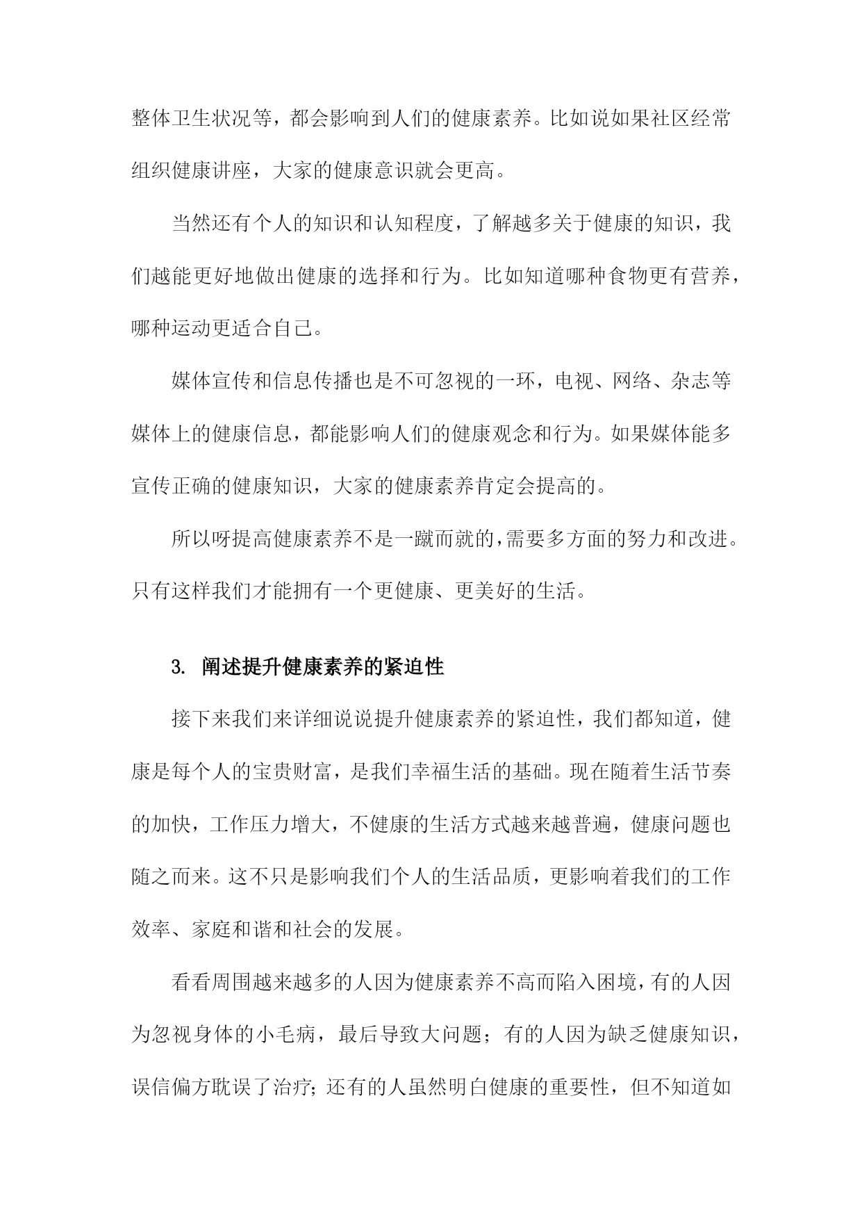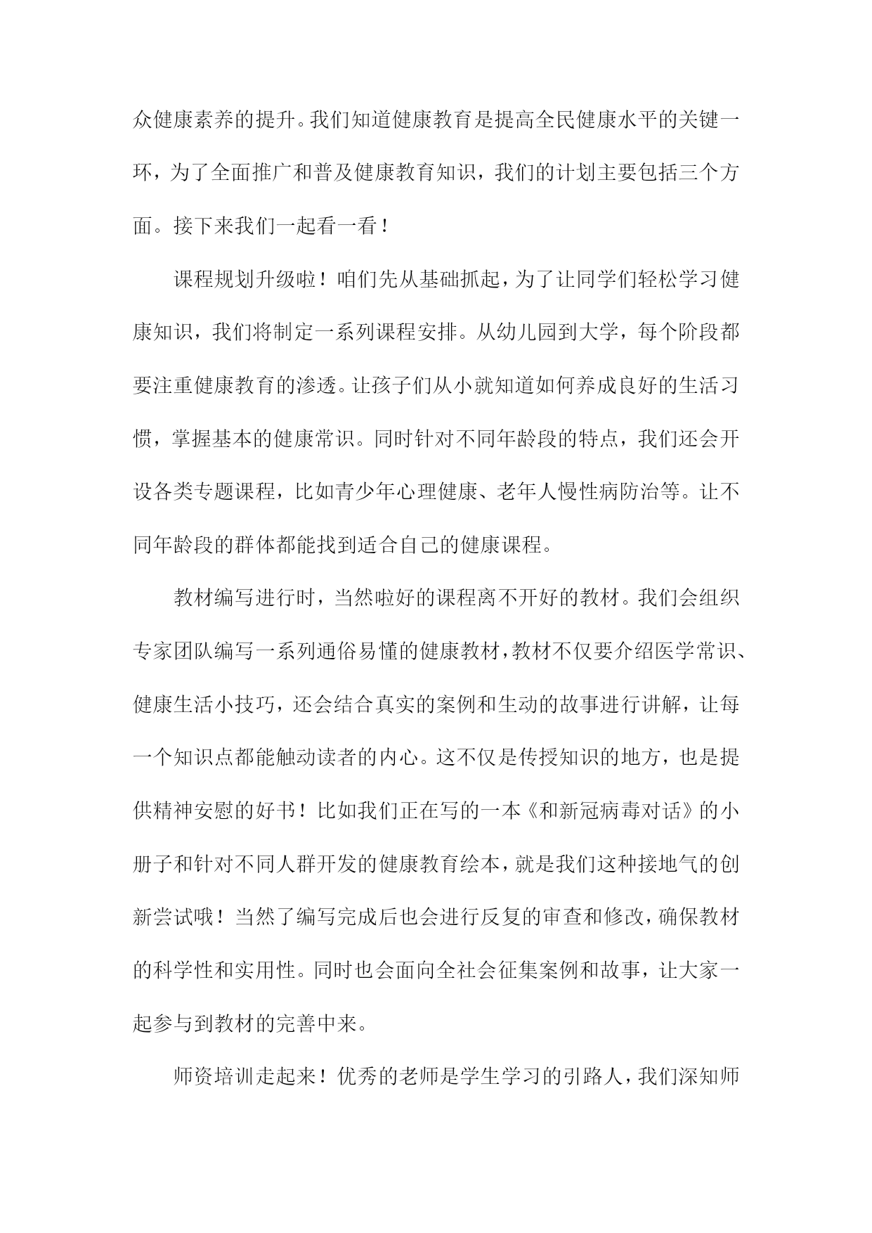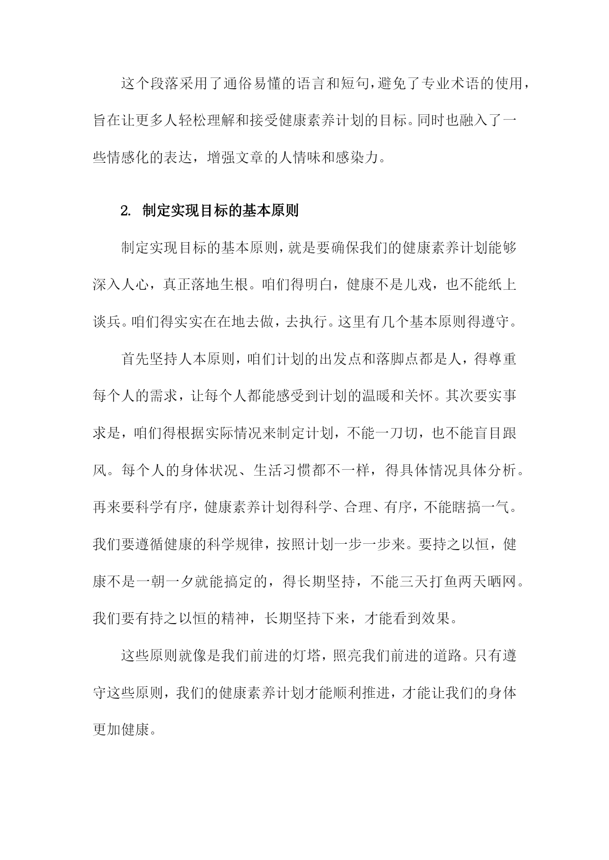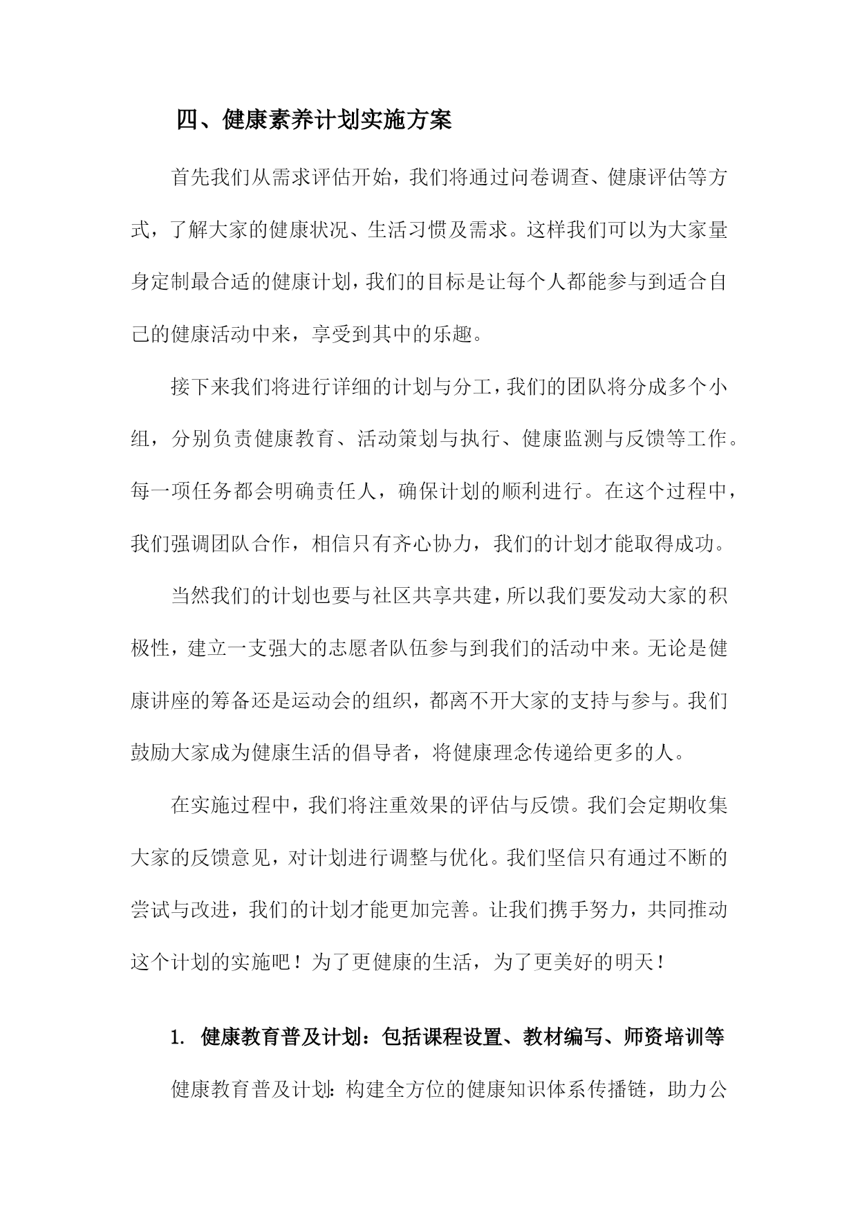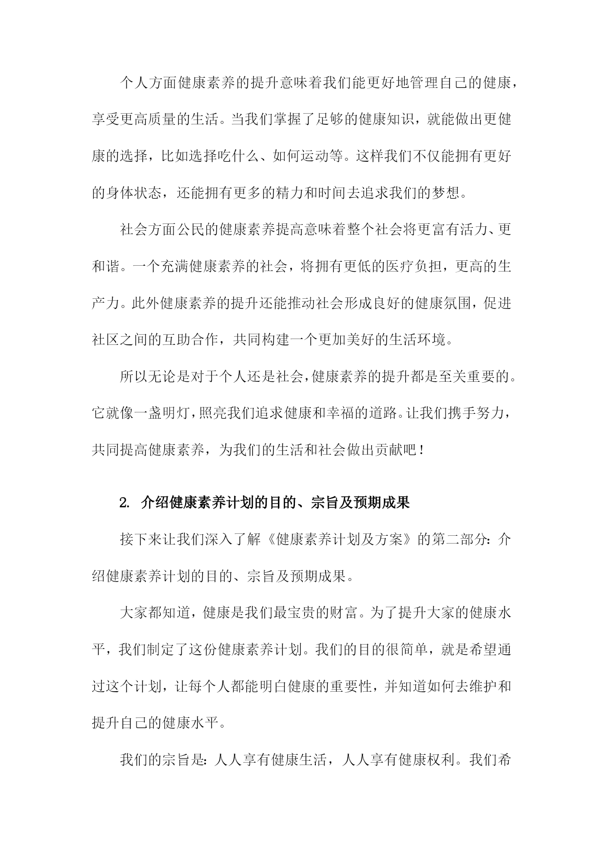 健康素养计划及方案一、概述我们都知道,健康是生活的基石,是我们追求幸福和成功的前提。无论是对于我们每一个人还是整个社会来说,保持健康都至关重要。为此我们需要了解基础的健康知识,养成健康的生活习惯。因此我们制定了这份《健康素养计划及方案》。接下来让我们一起走进这份计划,共同探索如何更好地守护我们的健康。1.阐述健康素养的重要性及其对个人和社会的意义健康素养听起来好像是个很专业的词汇,但其实它与我们每个人的生活息息相关。简单地说健康素养就是我们在生活中理解和实践健康知识、技能的能力。它关乎我们的生活质量,关乎我们的幸福感受,甚至关乎我们的未来。想象一下如果我们不了解基本的健康知识,不懂得如何照顾自己,那么我们的身体可能会经常出问题,影响到我们的工作、学习和生活。而健康素养的提高,就像给我们身体里注入一股强大的力量,让我们能更好地应对生活中的各种挑战。不仅如此当我们掌握了更多的健康知识和技能时,我们就能更好地为自己和家人提供保护,减少疾病的发生,这也是对社会的一种贡献。个人方面健康素养的提升意味着我们能更好地管理自己的健康,享受更高质量的生活。当我们掌握了足够的健康知识,就能做出更健康的选择,比如选择吃什么、如何运动等。这样我们不仅能拥有更好的身体状态,还能拥有更多的精力和时间去追求我们的梦想。社会方面公民的健康素养提高意味着整个社会将更富有活力、更和谐。一个充满健康素养的社会,将拥有更低的医疗负担,更高的生产力。此外健康素养的提升还能推动社会形成良好的健康氛围,促进社区之间的互助合作,共同构建一个更加美好的生活环境。所以无论是对于个人还是社会,健康素养的提升都是至关重要的。它就像一盏明灯,照亮我们追求健康和幸福的道路。让我们携手努力,共同提高健康素养,为我们的生活和社会做出贡献吧!2.介绍健康素养计划的目的、宗旨及预期成果接下来让我们深入了解《健康素养计划及方案》的第二部分:介绍健康素养计划的目的、宗旨及预期成果。大家都知道,健康是我们最宝贵的财富。为了提升大家的健康水平,我们制定了这份健康素养计划。我们的目的很简单,就是希望通过这个计划,让每个人都能明白健康的重要性,并知道如何去维护和提升自己的健康水平。我们的宗旨是:人人享有健康生活,人人享有健康权利。我们希望通过这个计划,帮助大家建立正确的健康观念,养成良好的生活习惯,掌握科学的健身方法。我们希望通过实施这个计划,让每个人都能感受到健康带来的快乐和幸福。我们的目标就是帮助每个人建立起健康的生活方式,让每个人都能享受到健康带来的快乐。我们坚信只要大家积极参与,共同努力我们的目标一定能够实现。二、健康素养现状分析我们知道随着社会的快速发展,人们的生活水平在不断提高,但与此同时,大家的健康素养水平却并未达到同样的高度。生活中我们常常遇到这样的情况:很多人在健康饮食、适度运动等方面的认识上有所欠缺。有的人由于缺乏健康知识,在面对疾病时感到迷茫和无助。这些都反映出我们当前健康素养的现状。看看我们身边,很多人忙于工作,忽视了身体的健康信号。一些简单的健康习惯,比如定时吃饭、规律作息、适量运动等,往往被我们忽视。很多人都是在身体出现问题时,才意识到健康的重要性。此外面对复杂多变的健康信息,很多人无法准确判断其真伪,这也给我们的健康带来了一定的风险。1.当前社会健康素养现状概述当我们走进现代社会,随着人们生活节奏的加快和工作压力的增大,健康问题逐渐成为人们关注的焦点。说起健康大家可能想到的就是身体强壮,无病无痛。但实际上真正的健康不仅仅是身体上没有疾病,还包括精神上的健康和对健康知识的了解。然而当前社会的健康素养现状却并不乐观,许多人对于健康知识了解不足,缺乏健康的生活方式和管理健康的技能。很多人只有在身体出现问题时,才会意识到健康的重要性。因此提升全民健康素养,让每个人都了解并重视健康,已经成为一项紧迫的任务。2.分析影响健康素养的各种因素想要提高人们的健康素养,得先明白哪些因素在影响着它。毕竟了解问题的根源才能更好地对症下药嘛,那么都有哪些因素在悄悄影响着我们的健康素养呢?首先家庭教育是个大头,从小父母就教育我们要养成好的生活习惯,这直接影响着我们的健康观念和行为模式。家庭教育的重要性可见一斑。接下来是工作环境和生活压力,现代生活节奏快,工作压力大,很多人因此忽视了健康。长时间的工作和紧张的生活节奏,都会对我们的身心健康造成不小的冲击。再来看看社会环境,社区的健康宣传、医疗资源的分布、社区的整体卫生状况等,都会影响到人们的健康素养。比如说如果社区经常组织健康讲座,大家的健康意识就会更高。当然还有个人的知识和认知程度,了解越多关于健康的知识,我们越能更好地做出健康的选择和行为。比如知道哪种食物更有营养,哪种运动更适合自己。媒体宣传和信息传播