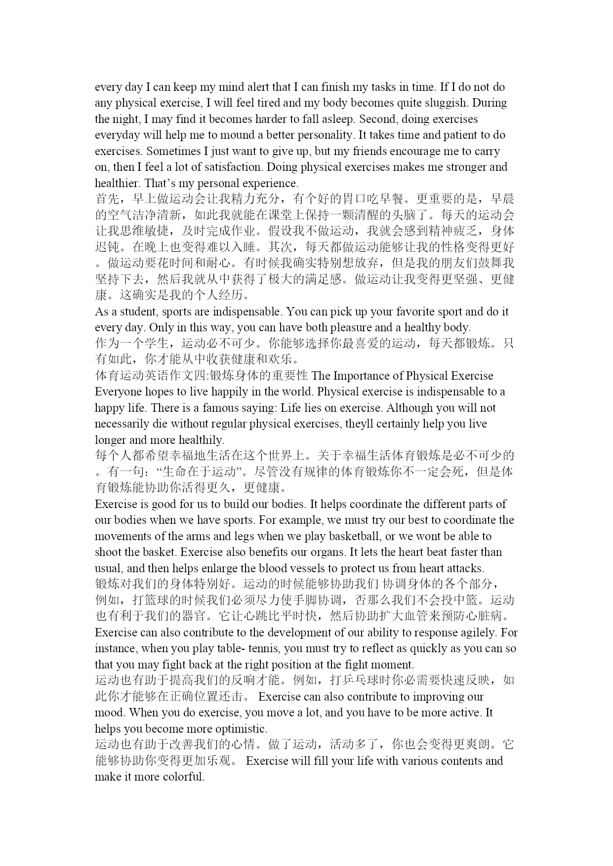 我喜爱的运动英语作文篇一:我最喜爱的运动英语作文带翻译两分钟做个小测试,看看你的英语水平://m.meten/test/waijiao.aspx?tid=16-73675-0美联英语提供:我最喜爱的运动英语作文带翻译我喜爱运动,更喜爱运动后的沉醉,我把运动看成生活中的一种心情。本文是学习啦小编为大家整理的我最喜爱的运动英语作文带翻译范文,欢迎阅读。我最喜爱的运动英语作文带翻译篇一TabletennisisoneofthemostpopularsportsinChina.It’smyfavorite,too.It’sagoodwayofexercise,andit’seasytoplay.Youdon’tneedmanyskills.Ioftenplaytabletennisafterclass.Mostofmyclassmateslikeit.Sowealwayshavepartners.Butifyouwanttoplaywell,it’snotsoeasy.Youmustfocusonyourgesture,yourhandsandyoursteps.Iwanttobebetter,soIpracticeitveryoften.Ihavemyownteachertoteachme.Iworkhardonit.乒乓球是中国最受欢迎的运动之一,也是我最喜爱的运动。乒乓球是一个锻炼的好方式,也特别容易学会,你不需要太多的技巧。课后,我经常打乒乓球。我们班上大部分的同学都喜爱打乒乓球,因而我们总是有特别多伙伴。但是,假设你想要打得好就没有那么简单。你必须留意你的姿态,手势以及步伐。我想打得更好,因而我经常练习。我有本人的教师来教我,我特别努力学习它。我最喜爱的运动英语作文带翻译篇二Therearemanykindsofinterestingsports,suchasbasketball,football,swimmingandrunning,butthemostIlikeisswimming.WhenIwasalittlechild,myfathertookmetotheriverwhichnearmyhousetolearnswimming.Then,IfounditsreallyfunandcoolwhenIswiminthewater,especiallyinsummer,Itsthemostexcitingthingtodowhensummercomes.Ilikeswimming.Itssowonderful.有特别多种有趣的运动,比方说篮球,足球,游泳和跑步,但是我最喜爱的是游泳。当我仍然个小孩的时候,我父亲就带我到附近的河里学游泳。后来,我觉察游泳确实特别有趣,在水里游的时候特别凉爽,特别是在夏天。当夏天到来的时候,最令人兴奋的事确实是游泳。我喜爱游泳,感受好极了。我最喜爱的运动英语作文带翻译篇三Ilikeplayingvolleyballthatit’smyfavoritesport.SinceIlearnedtoplayvolleyballinPEtwoyearsago,Iwasbadlyinterestedinit.Therefore,Ilearneditwithmyvolleyballteacher.Andhalfayearlater,Ijoinedtheschoolvolleyballteam.It’ssuchanexcellentteamthatIhaveagreattime.Ipracticewithmyteammateseveryafternoon.Andwehaveplayedmanymatchestogether.Excepttheawardsweget,Icherishthepreciousaffectionbetweenmeandteammatesandvolleyball.Andplayingvolleyballmakesmerealizehowimportantofunionandteamwork.Aslongasweunittogether,wecanbeatanyopponents.Iwillalwayscherishmylovetovolleyball.我喜爱打排球,它是我最喜爱的体育运动。自从两年前我在体育课上了学习了排球之后,我就疯狂地喜爱上了它。因而,我和我的排球教师学习。半年后,我参加了校排球队。这是一支特别棒的队伍,我过得特别精彩。每天下午,我都和队友们一起训练。我们一起打了特别多竞赛,通过排球,我也认识到了团结和团队精神的重要性。只要我们团结在一起,就能战胜任何对手。我会永远珍惜对排球的热爱。我最喜爱的运动英语作文带翻译篇四Ilovesport