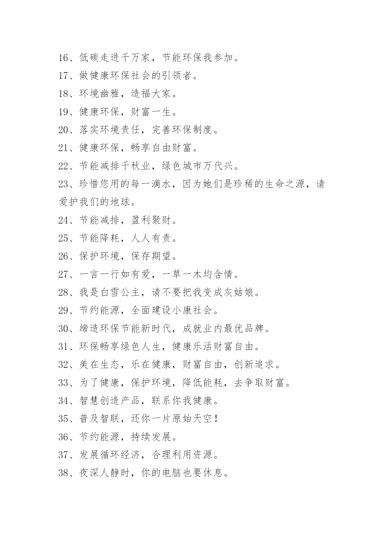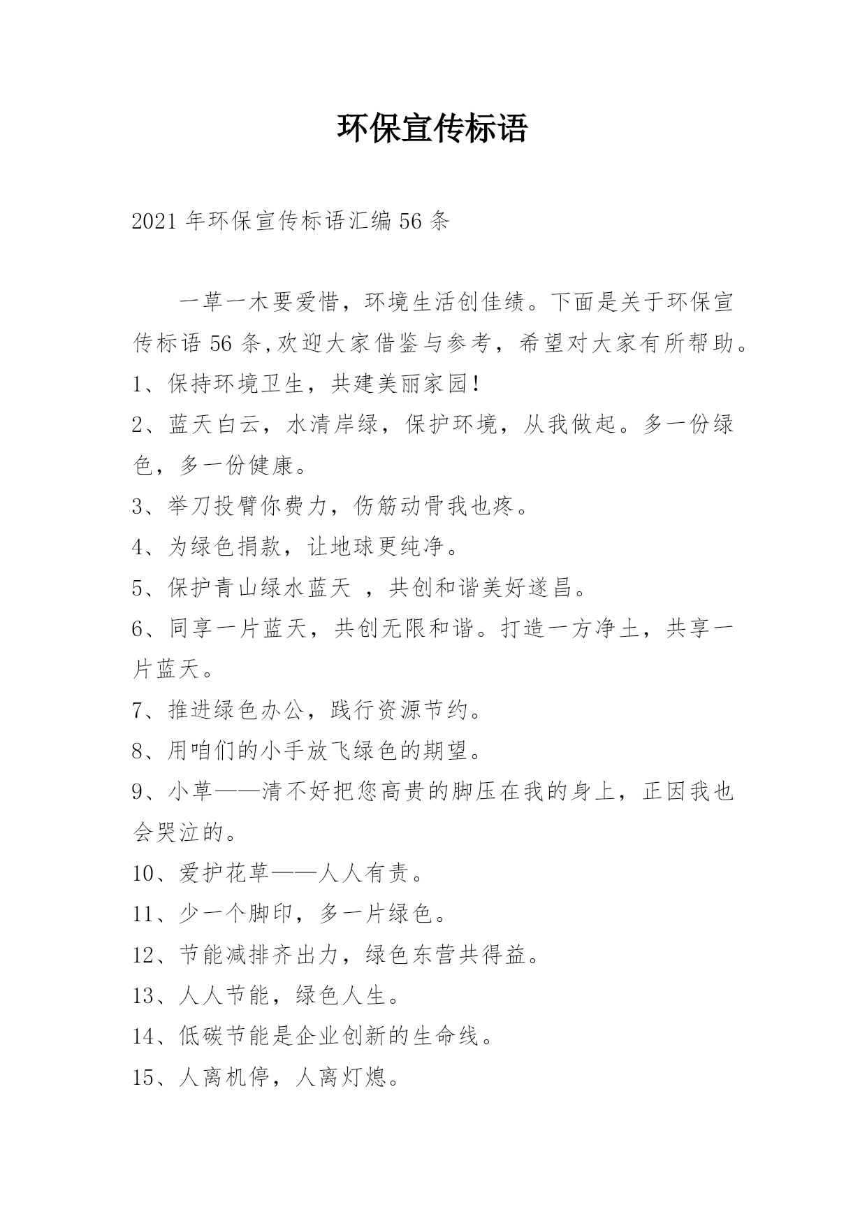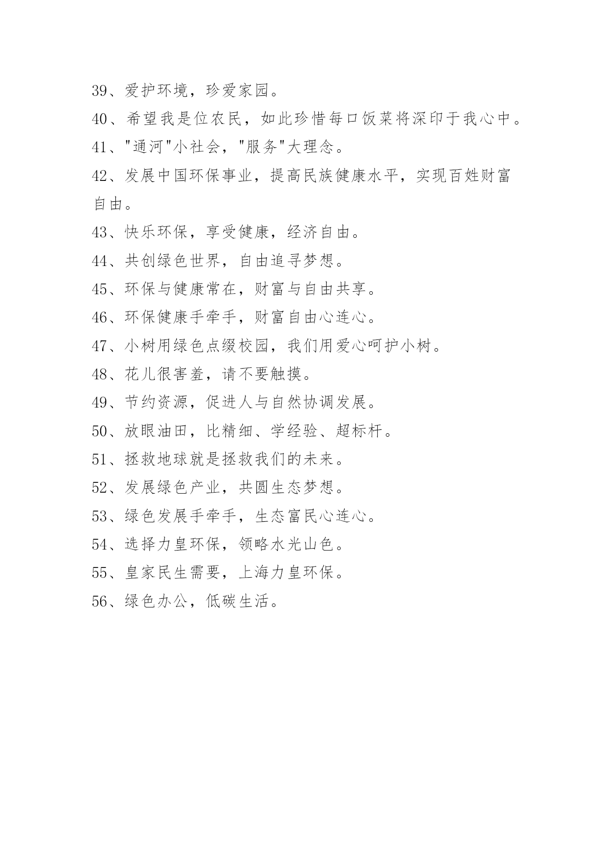 环保宣传标语2021年环保宣传标语汇编56条一草一木要爱惜,环境生活创佳绩。下面是关于环保宣传标语56条,欢迎大家借鉴与参考,希望对大家有所帮助。1、保持环境卫生,共建美丽家园!2、蓝天白云,水清岸绿,保护环境,从我做起。多一份绿色,多一份健康。3、举刀投臂你费力,伤筋动骨我也疼。4、为绿色捐款,让地球更纯净。5、保护青山绿水蓝天,共创和谐美好遂昌。6、同享一片蓝天,共创无限和谐。打造一方净土,共享一片蓝天。7、推进绿色办公,践行资源节约。8、用咱们的小手放飞绿色的期望。9、小草——清不好把您高贵的脚压在我的身上,正因我也会哭泣的。10、爱护花草——人人有责。11、少一个脚印,多一片绿色。12、节能减排齐出力,绿色东营共得益。13、人人节能,绿色人生。14、低碳节能是企业创新的生命线。15、人离机停,人离灯熄。16、低碳走进千万家,节能环保我参加。17、做健康环保社会的引领者。18、环境幽雅,造福大家。19、健康环保,财富一生。20、落实环境责任,完善环保制度。21、健康环保,畅享自由财富。22、节能减排千秋业,绿色城市万代兴。23、珍惜您用的每一滴水,因为她们是珍稀的生命之源,请爱护我们的地球。24、节能减排,盈利聚财。25、节能降耗,人人有责。26、保护环境,保存期望。27、一言一行如有爱,一草一木均含情。28、我是白雪公主,请不要把我变成灰姑娘。29、节约能源,全面建设小康社会。30、缔造环保节能新时代,成就业内最优品牌。31、环保畅享绿色人生,健康乐活财富自由。32、美在生态,乐在健康,财富自由,创新追求。33、为了健康,保护环境,降低能耗,去争取财富。34、智慧创造产品,联系你我健康。35、普及智联,还你一片原始天空!36、节约能源,持续发展。37、发展循环经济,合理利用资源。38、夜深人静时,你的电脑也要休息。39、爱护环境,珍爱家园。40、希望我是位农民,如此珍惜每口饭菜将深印于我心中。41、"通河"小社会,"服务"大理念。42、发展中国环保事业,提高民族健康水平,实现百姓财富自由。43、快乐环保,享受健康,经济自由。44、共创绿色世界,自由追寻梦想。45、环保与健康常在,财富与自由共享。46、环保健康手牵手,财富自由心连心。47、小树用绿色点缀校园,我们用爱心呵护小树。48、花儿很害羞,请不要触摸。49、节约资源,促进人与自然协调发展。50、放眼油田,比精细、学经验、超标杆。51、拯救地球就是拯救我们的未来。52、发展绿色产业,共圆生态梦想。53、绿色发展手牵手,生态富民心连心。54、选择力皇环保,领略水光山色。55、皇家民生需要,上海力皇环保。56、绿色办公,低碳生活。