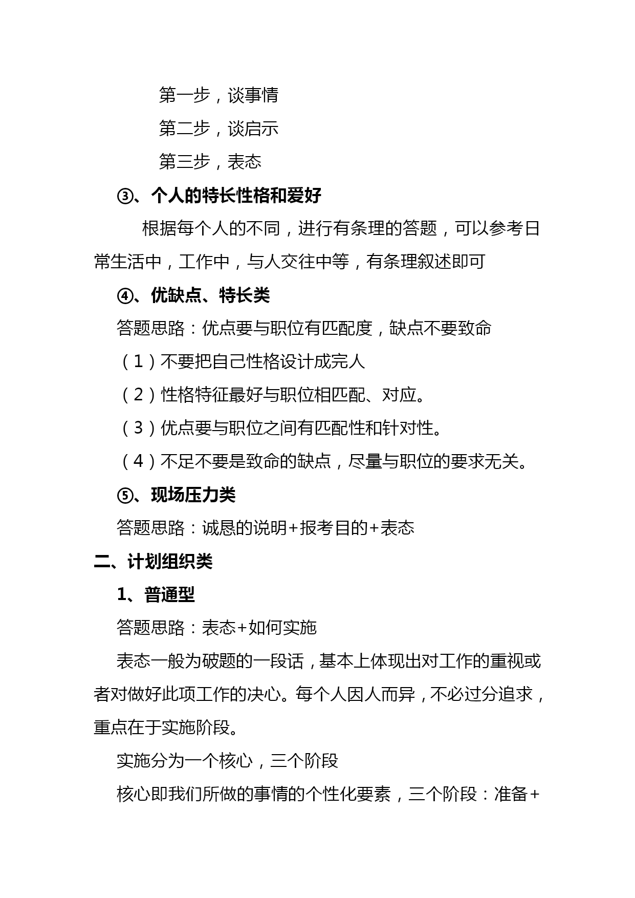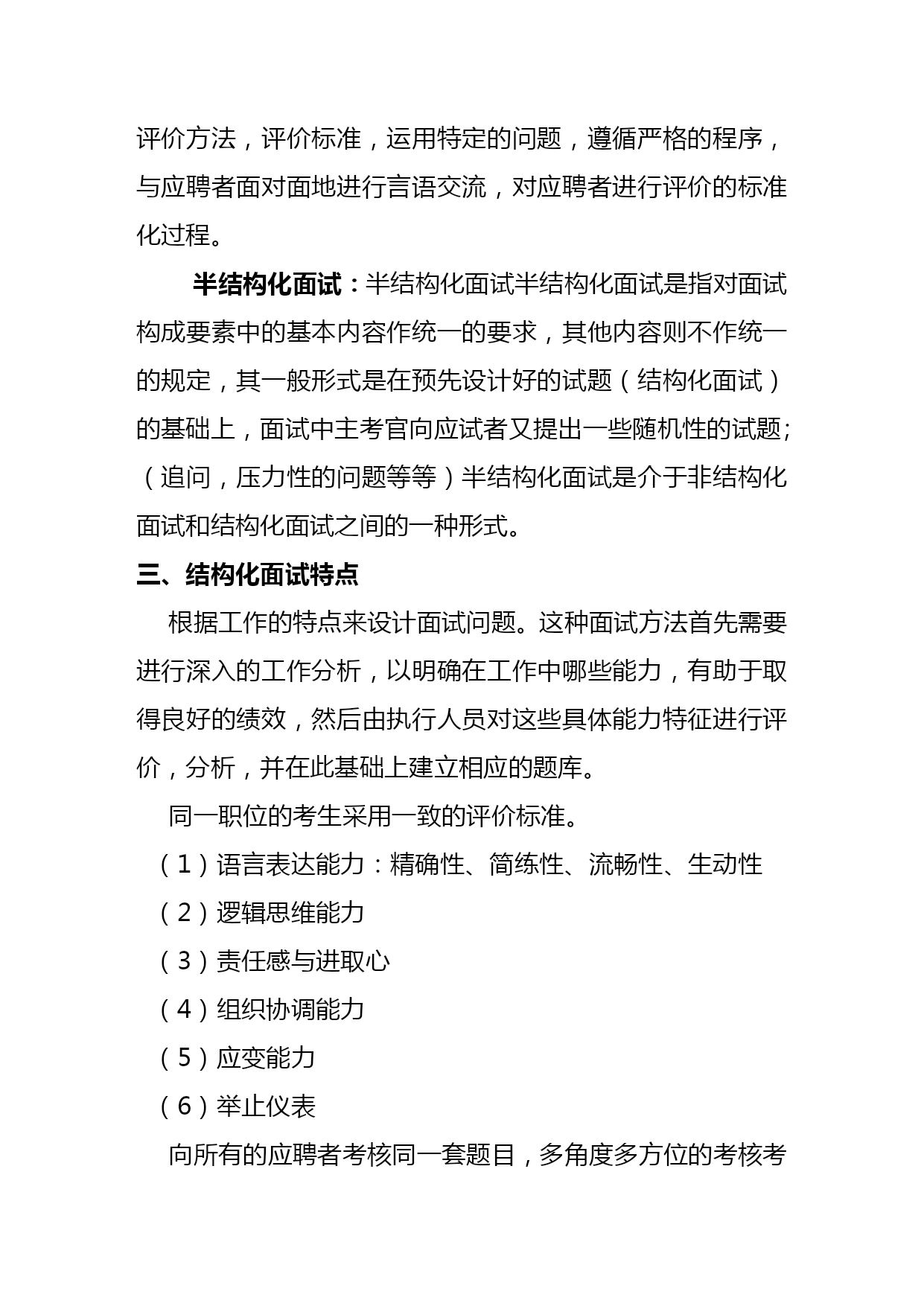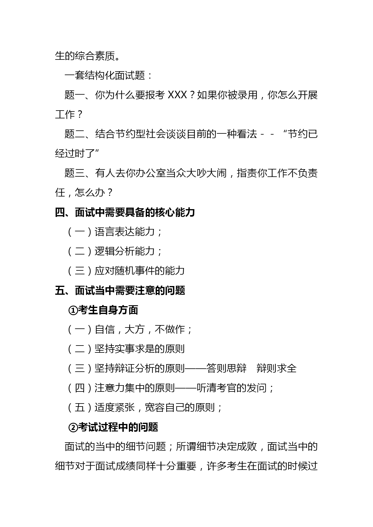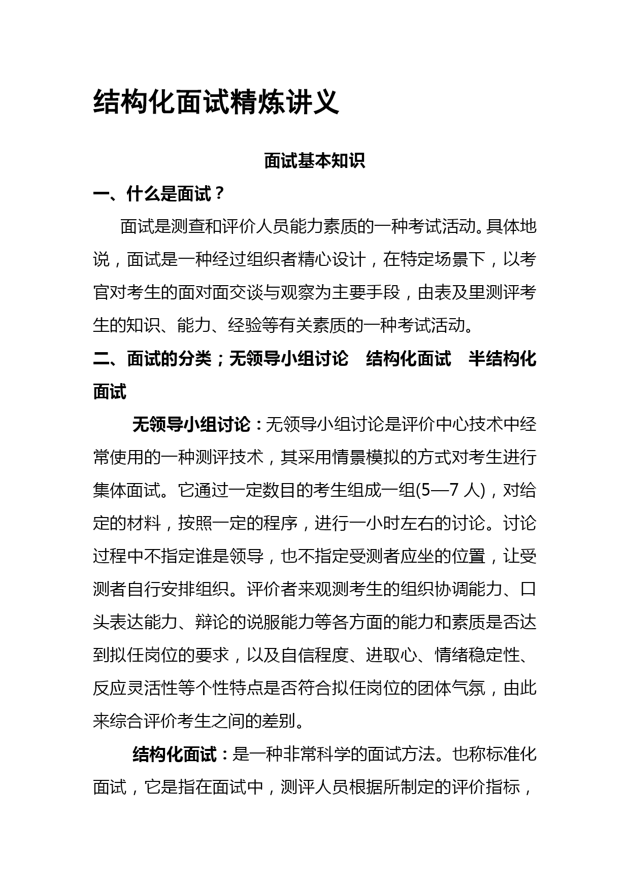 结构化面试精炼讲义(完整版)资料(可以直接使用,可编辑优秀版资料,欢迎下载)结构化面试精炼讲义面试基本知识一、什么是面试?面试是测查和评价人员能力素质的一种考试活动。具体地说,面试是一种经过组织者精心设计,在特定场景下,以考官对考生的面对面交谈与观察为主要手段,由表及里测评考生的知识、能力、经验等有关素质的一种考试活动。二、面试的分类;无领导小组讨论结构化面试半结构化面试无领导小组讨论:无领导小组讨论是评价中心技术中经常使用的一种测评技术,其采用情景模拟的方式对考生进行集体面试。它通过一定数目的考生组成一组(5—7人),对给定的材料,按照一定的程序,进行一小时左右的讨论。讨论过程中不指定谁是领导,也不指定受测者应坐的位置,让受测者自行安排组织。评价者来观测考生的组织协调能力、口头表达能力、辩论的说服能力等各方面的能力和素质是否达到拟任岗位的要求,以及自信程度、进取心、情绪稳定性、反应灵活性等个性特点是否符合拟任岗位的团体气氛,由此来综合评价考生之间的差别。结构化面试:是一种非常科学的面试方法。也称标准化面试,它是指在面试中,测评人员根据所制定的评价指标,评价方法,评价标准,运用特定的问题,遵循严格的程序,与应聘者面对面地进行言语交流,对应聘者进行评价的标准化过程。半结构化面试:半结构化面试半结构化面试是指对面试构成要素中的基本内容作统一的要求,其他内容则不作统一的规定,其一般形式是在预先设计好的试题(结构化面试)的基础上,面试中主考官向应试者又提出一些随机性的试题;(追问,压力性的问题等等)半结构化面试是介于非结构化面试和结构化面试之间的一种形式。三、结构化面试特点根据工作的特点来设计面试问题。这种面试方法首先需要进行深入的工作分析,以明确在工作中哪些能力,有助于取得良好的绩效,然后由执行人员对这些具体能力特征进行评价,分析,并在此基础上建立相应的题库。同一职位的考生采用一致的评价标准。(1)语言表达能力:精确性、简练性、流畅性、生动性(2)逻辑思维能力(3)责任感与进取心(4)组织协调能力(5)应变能力(6)举止仪表向所有的应聘者考核同一套题目,多角度多方位的考核考生的综合素质。一套结构化面试题:题一、你为什么要报考XXX?如果你被录用,你怎么开展工作?题二、结合节约型社会谈谈目前的一种看法--“节约已经过时了”题三、有人去你办公室当众大吵大闹,指责你工作不负责任,怎么办?四、面试中需要具备的核心能力(一)语言表达能力;(二)逻辑分析能力;(三)应对随机事件的能力五、面试当中需要注意的问题①考生自身方面(一)自信,大方,不做作;(二)坚持实事求是的原则(三)坚持辩证分析的原则——答则思辩辩则求全(四)注意力集中的原则——听清考官的发问;(五)适度紧张,宽容自己的原则;②考试过程中的问题面试的当中的细节问题;所谓细节决定成败,面试当中的细节对于面试成绩同样十分重要,许多考生在面试的时候过分注重试题,而忽略了整体细节,殊不知细节对于面试来说十分重要,以下简单罗列一些考试当中的细节问题,请广大考生参考和注意:面试中注意的细节问题:入考场前的准备:鞋油,擦鞋布,小镜,矮个子男同学要增高鞋或增高鞋垫(事前试穿)。女同学高跟鞋,纸巾,湿巾,女同学自带化妆品,饮用水,药品,一些题,杂志,食品自备。面试的侯考过程总调整好自己的心态,不要过分紧张,适度的放松自己。不要被别人的语言所打击。面试中整个过程当中的细节问题还有很多,在这里不一一列举,考生要根据自身的实际进行全面准备。③考官的心理把握定式心理;这种心理贯穿于面试的整个过程,面试当中的考官大多参加过多次面试工作,对面试已经有了一种固定的思维模式,对考生评价的过程当中往往会不自觉的带有主观色彩,对面试的客观性有一定的降低,对于这种情况,考生要在面试有限的时间内使自己的言辞、动作等尽量完善,避免任何细节上的纰漏,从而给考官留下很好的印象。英雄心理;通常在上午的面试当中较多,考官在面试当中,都会想发挥自己的作用,挑选自己心目中优秀的人才,对于考生的整体答题是十分注意的,所以考生在这个阶段面试中要尽量推荐自己,展示自己的才华,考官看到如此优秀的人才,自然会给相对不错的分数麻木心理;这种心理在下午面试当中极为常见;面试对于考生来说是短暂的时间就能完成的,但是考官是要考察多名考生的,有些考场一天甚至有40余名考生面试,考官在面试的后半段是会非常疲倦的,针对这种情况,下午的考生在答题的时候要切中要害,言简意赅,不要啰嗦或者重复,语调上要有气势,最好在答题过程中有自己的独到见解,让考官感到眼前一亮。“愧疚”心理;这是针对第一名和最后一名考生来说的,面试是一个全面权衡的过程,所以第一名考生的分数