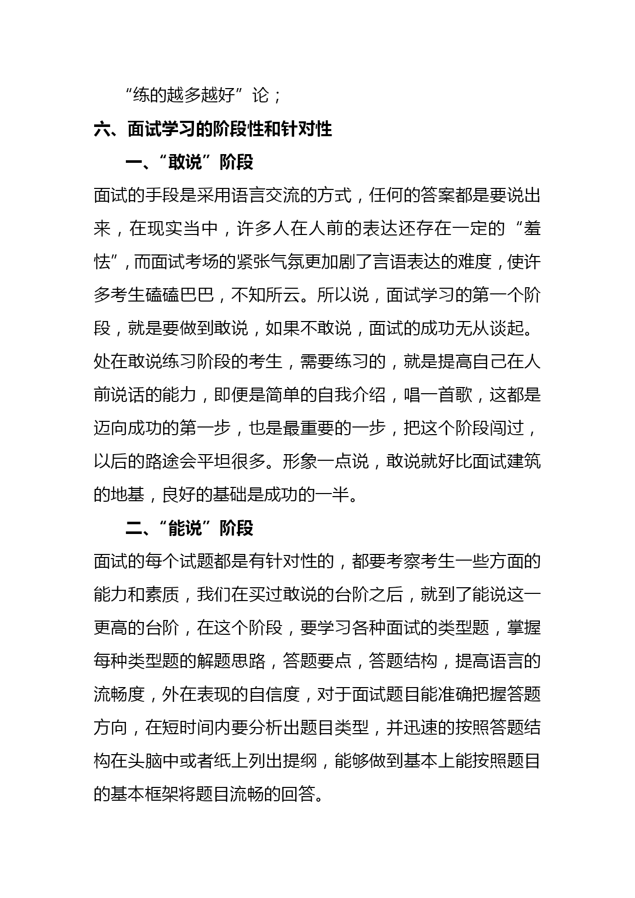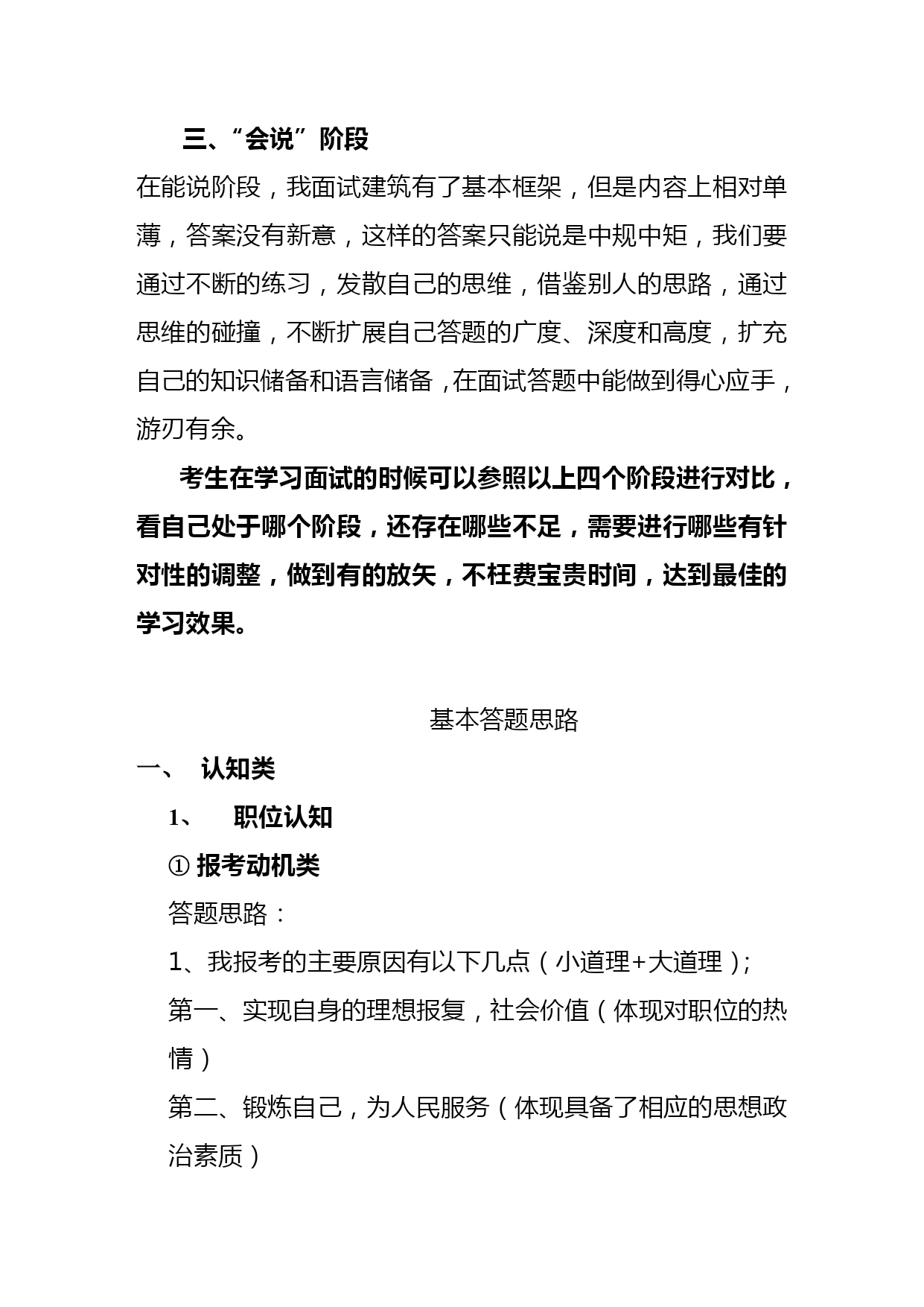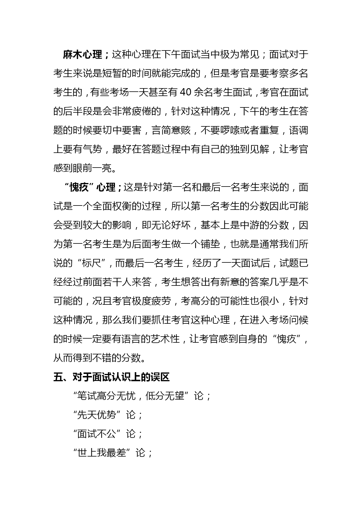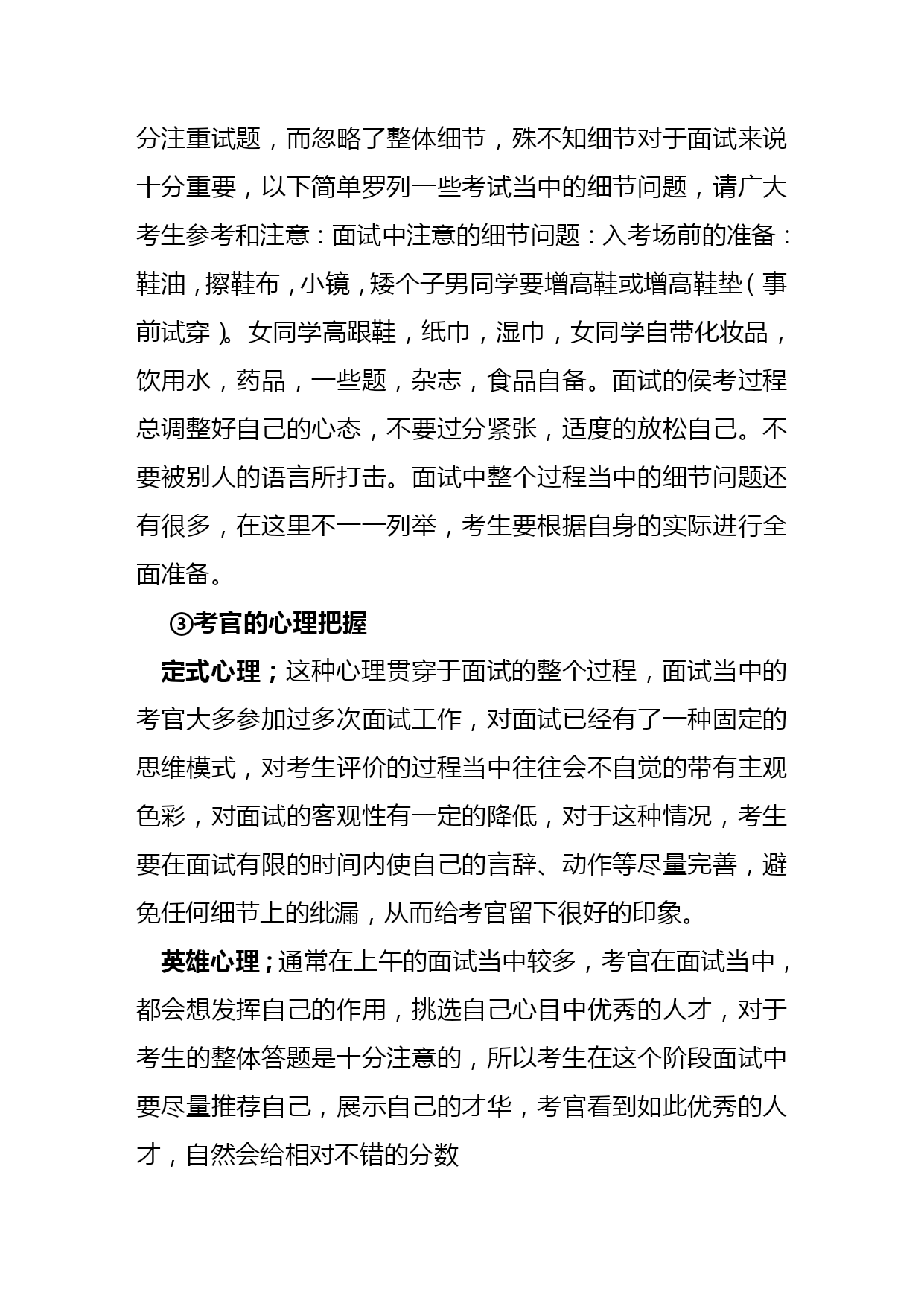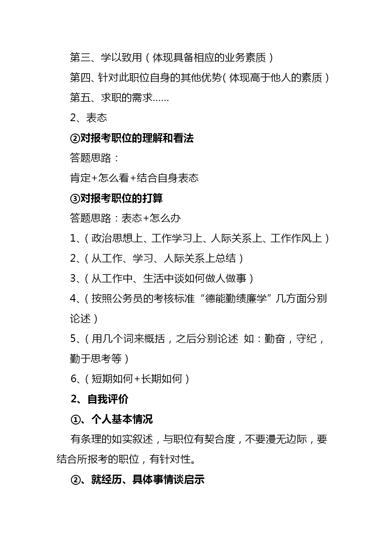 结构化面试精炼讲义(完整版)资料(可以直接使用,可编辑优秀版资料,欢迎下载)结构化面试精炼讲义面试基本知识一、什么是面试?面试是测查和评价人员能力素质的一种考试活动。具体地说,面试是一种经过组织者精心设计,在特定场景下,以考官对考生的面对面交谈与观察为主要手段,由表及里测评考生的知识、能力、经验等有关素质的一种考试活动。二、面试的分类;无领导小组讨论结构化面试半结构化面试无领导小组讨论:无领导小组讨论是评价中心技术中经常使用的一种测评技术,其采用情景模拟的方式对考生进行集体面试。它通过一定数目的考生组成一组(5—7人),对给定的材料,按照一定的程序,进行一小时左右的讨论。讨论过程中不指定谁是领导,也不指定受测者应坐的位置,让受测者自行安排组织。评价者来观测考生的组织协调能力、口头表达能力、辩论的说服能力等各方面的能力和素质是否达到拟任岗位的要求,以及自信程度、进取心、情绪稳定性、反应灵活性等个性特点是否符合拟任岗位的团体气氛,由此来综合评价考生之间的差别。结构化面试:是一种非常科学的面试方法。也称标准化面试,它是指在面试中,测评人员根据所制定的评价指标,评价方法,评价标准,运用特定的问题,遵循严格的程序,与应聘者面对面地进行言语交流,对应聘者进行评价的标准化过程。半结构化面试:半结构化面试半结构化面试是指对面试构成要素中的基本内容作统一的要求,其他内容则不作统一的规定,其一般形式是在预先设计好的试题(结构化面试)的基础上,面试中主考官向应试者又提出一些随机性的试题;(追问,压力性的问题等等)半结构化面试是介于非结构化面试和结构化面试之间的一种形式。三、结构化面试特点根据工作的特点来设计面试问题。这种面试方法首先需要进行深入的工作分析,以明确在工作中哪些能力,有助于取得良好的绩效,然后由执行人员对这些具体能力特征进行评价,分析,并在此基础上建立相应的题库。同一职位的考生采用一致的评价标准。(1)语言表达能力:精确性、简练性、流畅性、生动性(2)逻辑思维能力(3)责任感与进取心(4)组织协调能力(5)应变能力(6)举止仪表向所有的应聘者考核同一套题目,多角度多方位的考核考生的综合素质。一套结构化面试题:题一、你为什么要报考XXX?如果你被录用,你怎么开展工作?题二、结合节约型社会谈谈目前的一种看法--“节约已经过时了”题三、有人去你办公室当众大吵大闹,指责你工作不负责任,怎么办?四、面试中需要具备的核心能力(一)语言表达能力;(二)逻辑分析能力;(三)应对随机事件的能力五、面试当中需要注意的问题①考生自身方面(一)自信,大方,不做作;(二)坚持实事求是的原则(三)坚持辩证分析的原则——答则思辩辩则求全(四)注意力集中的原则——听清考官的发问;(五)适度紧张,宽容自己的原则;②考试过程中的问题面试的当中的细节问题;所谓细节决定成败,面试当中的细节对于面试成绩同样十分重要,许多考生在面试的时候过分注重试题,而忽略了整体细节,殊不知细节对于面试来说十分重要,以下简单罗列一些考试当中的细节问题,请广大考生参考和注意:面试中注意的细节问题:入考场前的准备:鞋油,擦鞋布,小镜,矮个子男同学要增高鞋或增高鞋垫(事前试穿)。女同学高跟鞋,纸巾,湿巾,女同学自带化妆品,饮用水,药品,一些题,杂志,食品自备。面试的侯考过程总调整好自己的心态,不要过分紧张,适度的放松自己。不要被别人的语言所打击。面试中整个过程当中的细节问题还有很多,在这里不一一列举,考生要根据自身的实际进行全面准备。③考官的心理把握定式心理;这种心理贯穿于面试的整个过程,面试当中的考官大多参加过多次面试工作,对面试已经有了一种固定的思维模式,对考生评价的过程当中往往会不自觉的带有主观色彩,对面试的客观性有一定的降低,对于这种情况,考生要在面试有限的时间内使自己的言辞、动作等尽量完善,避免任何细节上的纰漏,从而给考官留下很好的印象。英雄心理;通常在上午的面试当中较多,考官在面试当中,都会想发挥自己的作用,挑选自己心目中优秀的人才,对于考生的整体答题是十分注意的,所以考生在这个阶段面试中要尽量推荐自己,展示自己的才华,考官看到如此优秀的人才,自然会给相对不错的分数麻木心理;这种心理在下午面试当中极为常见;面试对于考生来说是短暂的时间就能完成的,但是考官是要考察多名考生的,有些考场一天甚至有40余名考生面试,考官在面试的后半段是会非常疲倦的,针对这种情况,下午的考生在答题的时候要切中要害,言简意赅,不要啰嗦或者重复,语调上要有气势,最好在答题过程中有自己的独到见解,让考官感到眼前一亮。“愧疚”心理;这是针对第一名和最后一名考生来说的,面试是一个全面权衡的过程,所以第一名考生的分数