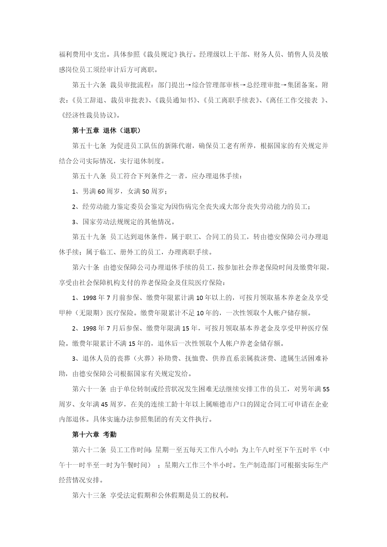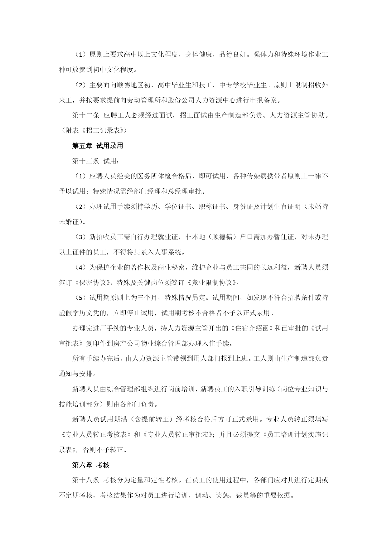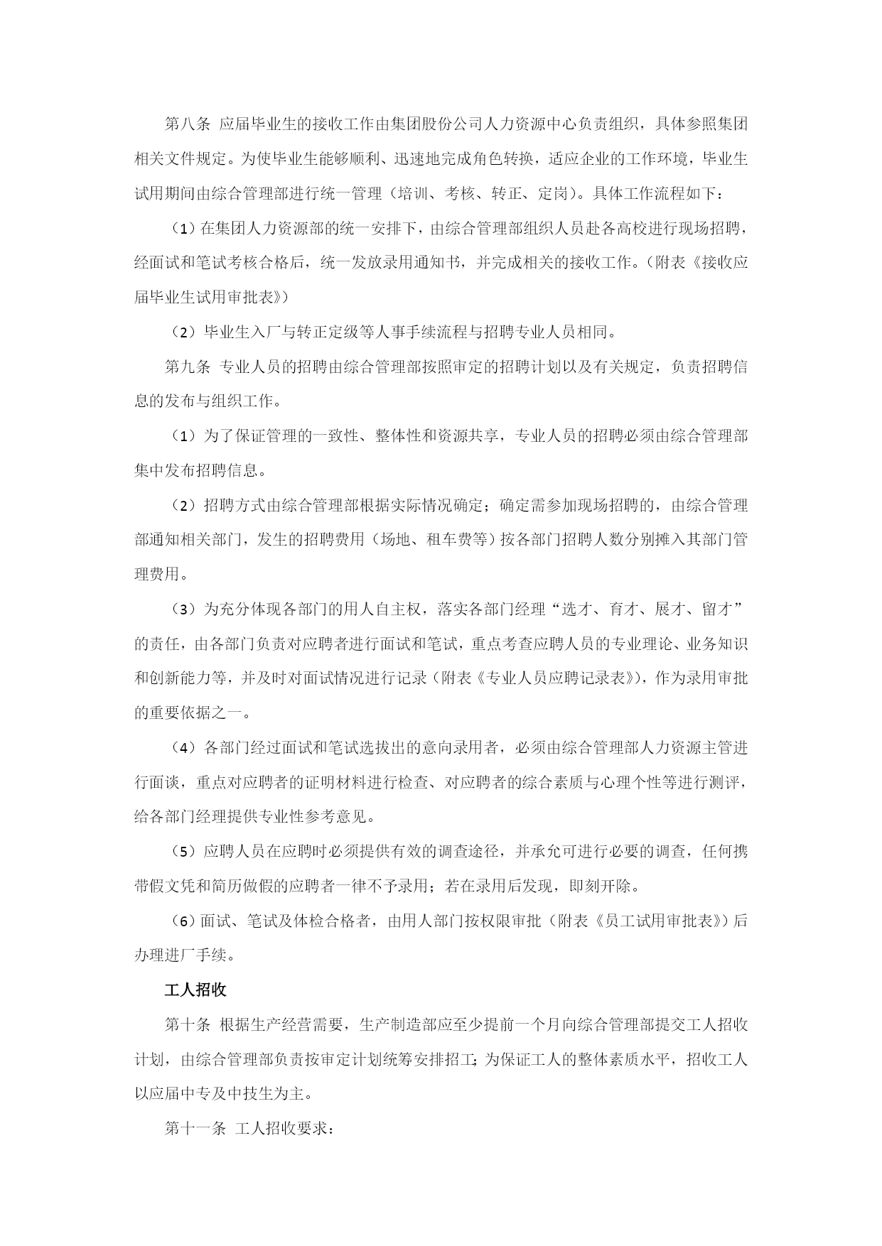 某电子制造公司人力资源管理办法总则第一条为加强人力资源管理,规范人力资源管理行为,明确人力资源管理工作的各项职责,特制定本办法。第二条本办法规范了人力资源管理工作的基本原则、政策及管理操作流程,其主要内容涉及:人力资源规划和计划、招聘、培训、考核、调动、借调、工作轮换、辞职、辞退、裁员、薪酬与福利、劳动合同与考勤等。第三条人力资源管理遵循“以人为本、公正公开、适才适用、依法管理”的原则,按照《分权手册》由综合管理部和各部门共同组成人力资源管理体系。本办法适用于公司各部门。人力资源规划第四条人力资源规划是通过了解公司内外部信息,预测、分析人力资源供给和需求状况,制订科学合理的人力资源发展目标与实施策略,支持公司整体发展战略和经营目标的实现,是其他人力资源管理活动的指导方针。第五条各部门应按照公司发展战略,结合本部门工作实际情况,于每年的10月份编制部门下一年度人力资源规划,内容应包括:部门年度组织架构设置、部门职责、员工岗位工作职责及素质标准、人才需求预测及配置计划、定岗定编定员明细表、员工培训需求计划等。每年6月可根据实际需要对当年规划进行调整。第六条人力资源规划流程:提案(各部门)→汇总(人力资源主管)→审核(综合管理部经理)→审批(总经理)→必要时备案(集团)。专业人员的招聘第七条人力资源需求、招聘计划分以下几类:毕业生需求计划:每年9月由各部门提出对下一年度毕业生的需求,报综合管理部汇总审核,总经理审批,并报股份公司行政管理部人力资源中心备案统筹。年度专业人员整体需求、招聘计划:各部门应结合本单位的实际情况于每年9月份提出,综合管理部审核,总经理审批。月度专业人员需求、招聘计划:根据年度计划分解而成,各部门须于每月25日前提出下一月度招聘需求(填写《招聘申报表》),报综合管理部。附表:《招聘申报表》、《员工需求计划审批表》第八条应届毕业生的接收工作由集团股份公司人力资源中心负责组织,具体参照集团相关文件规定。为使毕业生能够顺利、迅速地完成角色转换,适应企业的工作环境,毕业生试用期间由综合管理部进行统一管理(培训、考核、转正、定岗)。具体工作流程如下:(1)在集团人力资源部的统一安排下,由综合管理部组织人员赴各高校进行现场招聘,经面试和笔试考核合格后,统一发放录用通知书,并完成相关的接收工作。(附表《接收应届毕业生试用审批表》)(2)毕业生入厂与转正定级等人事手续流程与招聘专业人员相同。第九条专业人员的招聘由综合管理部按照审定的招聘计划以及有关规定,负责招聘信息的发布与组织工作。(1)为了保证管理的一致性、整体性和资源共享,专业人员的招聘必须由综合管理部集中发布招聘信息。(2)招聘方式由综合管理部根据实际情况确定;确定需参加现场招聘的,由综合管理部通知相关部门,发生的招聘费用(场地、租车费等)按各部门招聘人数分别摊入其部门管理费用。(3)为充分体现各部门的用人自主权,落实各部门经理“选才、育才、展才、留才”的责任,由各部门负责对应聘者进行面试和笔试,重点考查应聘人员的专业理论、业务知识和创新能力等,并及时对面试情况进行记录(附表《专业人员应聘记录表》),作为录用审批的重要依据之一。(4)各部门经过面试和笔试选拔出的意向录用者,必须由综合管理部人力资源主管进行面谈,重点对应聘者的证明材料进行检查、对应聘者的综合素质与心理个性等进行测评,给各部门经理提供专业性参考意见。(5)应聘人员在应聘时必须提供有效的调查途径,并承允可进行必要的调查,任何携带假文凭和简历做假的应聘者一律不予录用;若在录用后发现,即刻开除。(6)面试、笔试及体检合格者,由用人部门按权限审批(附表《员工试用审批表》)后办理进厂手续。工人招收第十条根据生产经营需要,生产制造部应至少提前一个月向综合管理部提交工人招收计划,由综合管理部负责按审定计划统筹安排招工;为保证工人的整体素质水平,招收工人以应届中专及中技生为主。第十一条工人招收要求:(1)原则上要求高中以上文化程度、身体健康、品德良好。强体力和特殊环境作业工种可放宽到初中文化程度。(2)主要面向顺德地区初、高中毕业生和技工、中专学校毕业生。原则上限制招收外来工,并按要求提前向劳动管理所和股份公司人力资源中心进行申报备案。第十二条应聘工人必须经过面试,招工面试由生产制造部负责、人力资源主管协助。(附表《招工记录表》)第五章试用录用第十三条试用:(1)应聘人员经美的医务所体检合格后,即可试用,各种传染病携带者原则上一律不予以试用;特殊情况需经部门经理和总经理审批。(2)办理试用手续须持学历、学位证书、职称证书、身份证及计划生育证明(未婚持未婚证)。(3)新招收员工需自行办理就业证,非本地(顺德籍)户口需加办暂住证,对未办理以上证件的员工,不