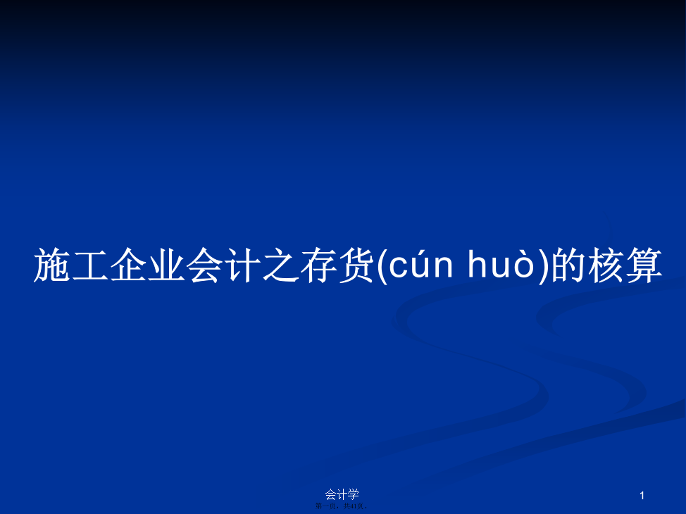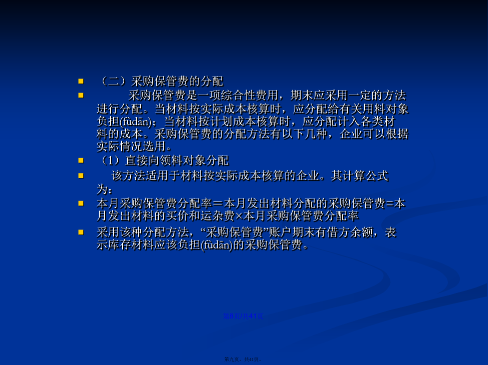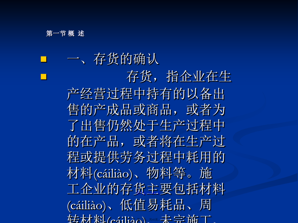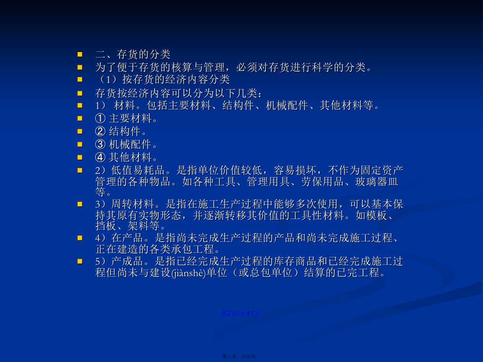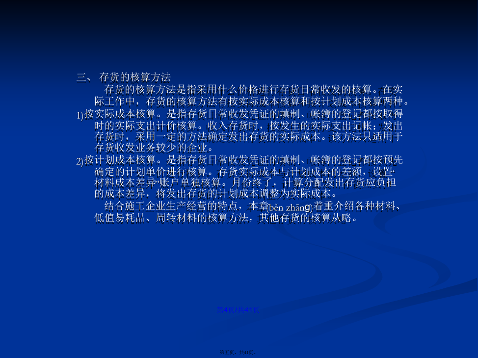 会计学第一节概述二、存货的分类为了便于存货的核算与管理,必须对存货进行科学的分类。(1)按存货的经济内容分类存货按经济内容可以分为以下几类:1)材料。包括主要材料、结构件、机械配件、其他材料等。①主要材料。②结构件。③机械配件。④其他材料。2)低值易耗品。是指单位价值较低,容易损坏,不作为固定资产管理的各种物品。如各种工具、管理用具、劳保用品、玻璃器皿等。3)周转材料。是指在施工生产过程中能够多次使用,可以基本保持其原有实物形态,并逐渐转移其价值的工具性材料。如模板、挡板、架料等。4)在产品。是指尚未完成生产过程的产品和尚未完成施工过程、正在建造的各类承包工程。5)产成品。是指已经完成生产过程的库存商品和已经完成施工过程但尚未与建设(jiànshè)单位(或总包单位)结算的已完工程。(2)按照存货的保管责任和存放地点分类存货按保管责任和存放地点可以分为以下几类:1)库存存货。指储存在仓库或存放在施工现场的各种材料、在产品、产成品等。2)在途存货。指货款已经支付,但尚未运达企业或虽已运达企业但尚未办理入库手续的各种材料、物品(wùpǐn)等。3)委托加工存货。指企业委托外单位正在加工、改制的各种材料物品(wùpǐn)。4)自制存货。指企业正在生产、加工的各种材料物品(wùpǐn)。三、存货的核算方法存货的核算方法是指采用什么价格进行存货日常收发的核算。在实际工作中,存货的核算方法有按实际成本核算和按计划成本核算两种。1)按实际成本核算。是指存货日常收发凭证的填制、帐簿的登记都按取得时的实际支出计价核算。收入存货时,按发生的实际支出记帐;发出存货时,采用一定的方法确定发出存货的实际成本。该方法只适用于存货收发业务较少的企业。2)按计划成本核算。是指存货日常收发凭证的填制、帐簿的登记都按预先确定的计划单价进行核算。存货实际成本与计划成本的差额,设置“材料成本差异”账户单独核算。月份终了,计算分配发出存货应负担的成本差异,将发出存货的计划成本调整为实际成本。结合施工企业生产经营的特点,本章(běnzhānɡ)着重介绍各种材料、低值易耗品、周转材料的核算方法,其他存货的核算从略。第二节材料采购(cǎigòu)的核算二、材料采购成本的构成施工企业材料的采购成本主要包括买价、运杂费和采购保管费。(1)买价。指购入材料取得的发票上所填列(tiánliè)的货款、税金和手续费。(2)运杂费。指材料从供应单位运到工地仓库以前所发生的包装费、运输费、装卸费、保险费以及合理的运输途中损耗等费用。(3)采购保管费。指企业的材料供应部门和仓库在材料采购、供应和保管过程中所发生的费用。三、采购保管费的核算(一)采购保管费的归集施工企业应设置“采购保管费”账户,核算材料供应(gōngyìng)部门为采购、保管和收发材料发生的各种费用。其借方登记实际发生的各项采购保管费,贷方登记分配转出的采购保管费。本账户应按采购保管费的项目设置专栏进行明细核算。采购保管费的费用项目一般包括:1)采购和保管人员的工资、职工福利费及劳动保护费;2)采购和保管人员的办公费;3)采购和保管人员的差旅费;4)固定资产折旧及修理费;5)工具用具使用费;6)材料保险费;;7)检验试验费;8)材料整理及零星运费;9)材料盘亏及毁损(减盘盈);10)其他(二)采购保管费的分配采购保管费是一项综合性费用,期末应采用一定的方法进行分配。当材料按实际成本核算时,应分配给有关用料对象负担(fùdān);当材料按计划成本核算时,应分配计入各类材料的成本。采购保管费的分配方法有以下几种,企业可以根据实际情况选用。(1)直接向领料对象分配该方法适用于材料按实际成本核算的企业。其计算公式为:本月采购保管费分配率=本月发出材料分配的采购保管费=本月发出材料的买价和运杂费×本月采购保管费分配率采用该种分配方法,“采购保管费”账户期末有借方余额,表示库存材料应该负担(fùdān)的采购保管费。(2)按实际分配(fēnpèi)率分配(fēnpèi)该方法适用于材料按计划成本核算的企业。其计算公式为:四、材料购进按实际成本计价(jìjià)的核算材料按实际成本计价(jìjià)进行日常收发核算的企业,应设置“原材料”、“在途物资”、“采购保管费”等账户进行材料的总分类核算。“原材料”账户,核算企业各种原材料的实际成本。其借方登记入库材料的实际成本,贷方登记发出材料的实际成本,期末借方余额反映库存材料的实际成本。本账户应设置“主要材料”、“结构件”、“机械配件”、“其他材料”四个二级明细帐,并按材料的品种、规格和保管地点设置明细账户进行明细分类核算。“在途物资”账户,核算企业已付款或已开出、承兑商业汇票但尚未到达或尚未验收