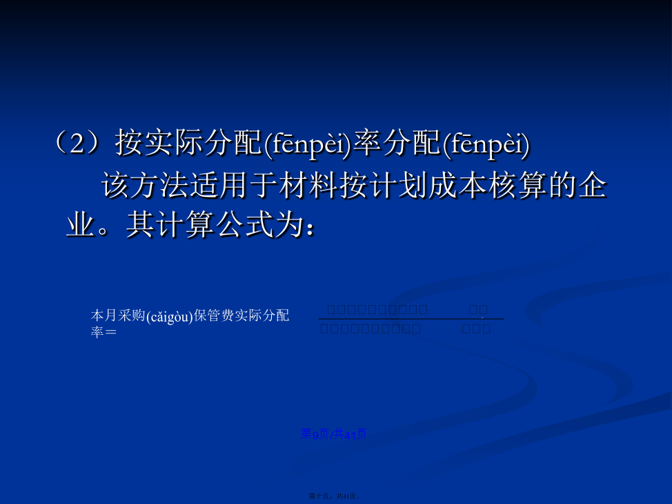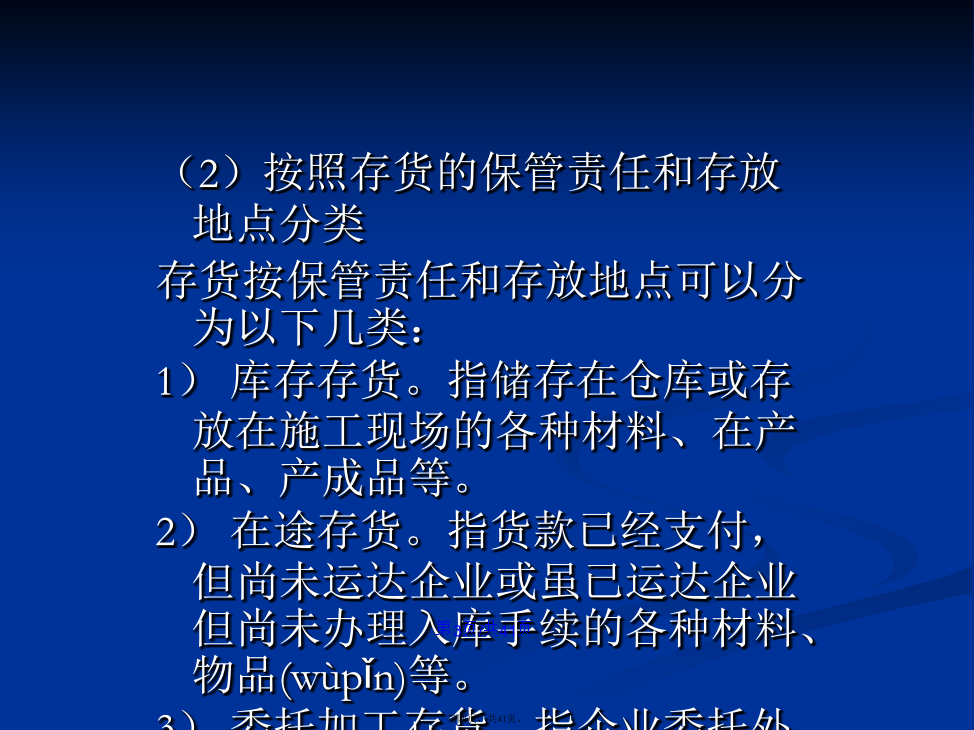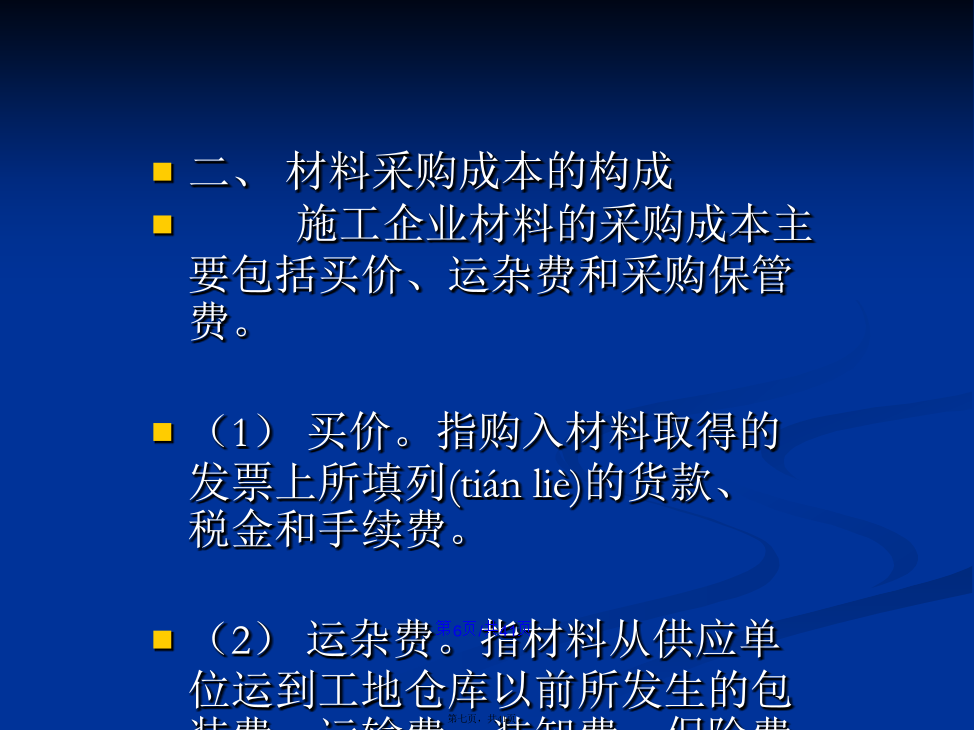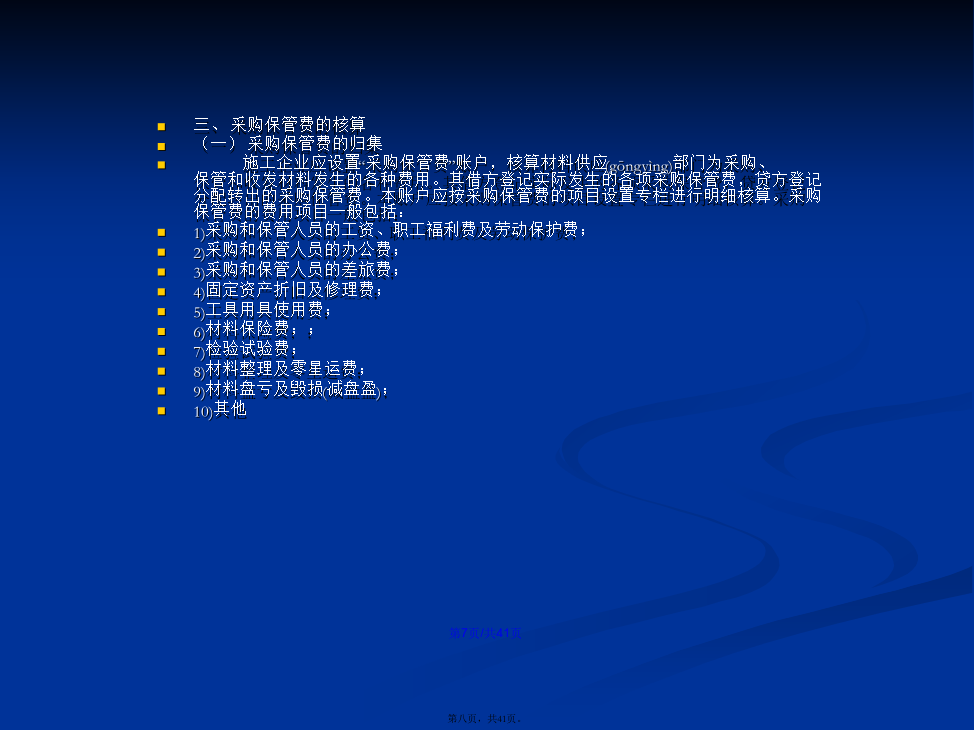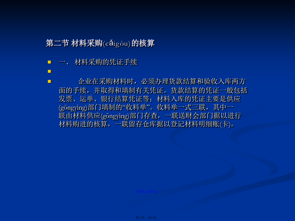 会计学第一节概述二、存货的分类为了便于存货的核算与管理,必须对存货进行科学的分类。(1)按存货的经济内容分类存货按经济内容可以分为以下几类:1)材料。包括主要材料、结构件、机械配件、其他材料等。①主要材料。②结构件。③机械配件。④其他材料。2)低值易耗品。是指单位价值较低,容易损坏,不作为固定资产管理的各种物品。如各种工具、管理用具、劳保用品、玻璃器皿等。3)周转材料。是指在施工生产过程中能够多次使用,可以基本保持其原有实物形态,并逐渐转移其价值的工具性材料。如模板、挡板、架料等。4)在产品。是指尚未完成生产过程的产品和尚未完成施工过程、正在建造的各类承包工程。5)产成品。是指已经完成生产过程的库存商品和已经完成施工过程但尚未与建设(jiànshè)单位(或总包单位)结算的已完工程。(2)按照存货的保管责任和存放地点分类存货按保管责任和存放地点可以分为以下几类:1)库存存货。指储存在仓库或存放在施工现场的各种材料、在产品、产成品等。2)在途存货。指货款已经支付,但尚未运达企业或虽已运达企业但尚未办理入库手续的各种材料、物品(wùpǐn)等。3)委托加工存货。指企业委托外单位正在加工、改制的各种材料物品(wùpǐn)。4)自制存货。指企业正在生产、加工的各种材料物品(wùpǐn)。三、存货的核算方法存货的核算方法是指采用什么价格进行存货日常收发的核算。在实际工作中,存货的核算方法有按实际成本核算和按计划成本核算两种。1)按实际成本核算。是指存货日常收发凭证的填制、帐簿的登记都按取得时的实际支出计价核算。收入存货时,按发生的实际支出记帐;发出存货时,采用一定的方法确定发出存货的实际成本。该方法只适用于存货收发业务较少的企业。2)按计划成本核算。是指存货日常收发凭证的填制、帐簿的登记都按预先确定的计划单价进行核算。存货实际成本与计划成本的差额,设置“材料成本差异”账户单独核算。月份终了,计算分配发出存货应负担的成本差异,将发出存货的计划成本调整为实际成本。结合施工企业生产经营的特点,本章(běnzhānɡ)着重介绍各种材料、低值易耗品、周转材料的核算方法,其他存货的核算从略。第二节材料采购(cǎigòu)的核算二、材料采购成本的构成施工企业材料的采购成本主要包括买价、运杂费和采购保管费。(1)买价。指购入材料取得的发票上所填列(tiánliè)的货款、税金和手续费。(2)运杂费。指材料从供应单位运到工地仓库以前所发生的包装费、运输费、装卸费、保险费以及合理的运输途中损耗等费用。(3)采购保管费。指企业的材料供应部门和仓库在材料采购、供应和保管过程中所发生的费用。三、采购保管费的核算(一)采购保管费的归集施工企业应设置“采购保管费”账户,核算材料供应(gōngyìng)部门为采购、保管和收发材料发生的各种费用。其借方登记实际发生的各项采购保管费,贷方登记分配转出的采购保管费。本账户应按采购保管费的项目设置专栏进行明细核算。采购保管费的费用项目一般包括:1)采购和保管人员的工资、职工福利费及劳动保护费;2)采购和保管人员的办公费;3)采购和保管人员的差旅费;4)固定资产折旧及修理费;5)工具用具使用费;6)材料保险费;;7)检验试验费;8)材料整理及零星运费;9)材料盘亏及毁损(减盘盈);10)其他(二)采购保管费的分配采购保管费是一项综合性费用,期末应采用一定的方法进行分配。当材料按实际成本核算时,应分配给有关用料对象负担(fùdān);当材料按计划成本核算时,应分配计入各类材料的成本。采购保管费的分配方法有以下几种,企业可以根据实际情况选用。(1)直接向领料对象分配该方法适用于材料按实际成本核算的企业。其计算公式为:本月采购保管费分配率=本月发出材料分配的采购保管费=本月发出材料的买价和运杂费×本月采购保管费分配率采用该种分配方法,“采购保管费”账户期末有借方余额,表示库存材料应该负担(fùdān)的采购保管费。(2)按实际分配(fēnpèi)率分配(fēnpèi)该方法适用于材料按计划成本核算的企业。其计算公式为:四、材料购进按实际成本计价(jìjià)的核算材料按实际成本计价(jìjià)进行日常收发核算的企业,应设置“原材料”、“在途物资”、“采购保管费”等账户进行材料的总分类核算。“原材料”账户,核算企业各种原材料的实际成本。其借方登记入库材料的实际成本,贷方登记发出材料的实际成本,期末借方余额反映库存材料的实际成本。本账户应设置“主要材料”、“结构件”、“机械配件”、“其他材料”四个二级明细帐,并按材料的品种、规格和保管地点设置明细账户进行明细分类核算。“在途物资”账户,核算企业已付款或已开出、承兑商业汇票但尚未到达或尚未验收