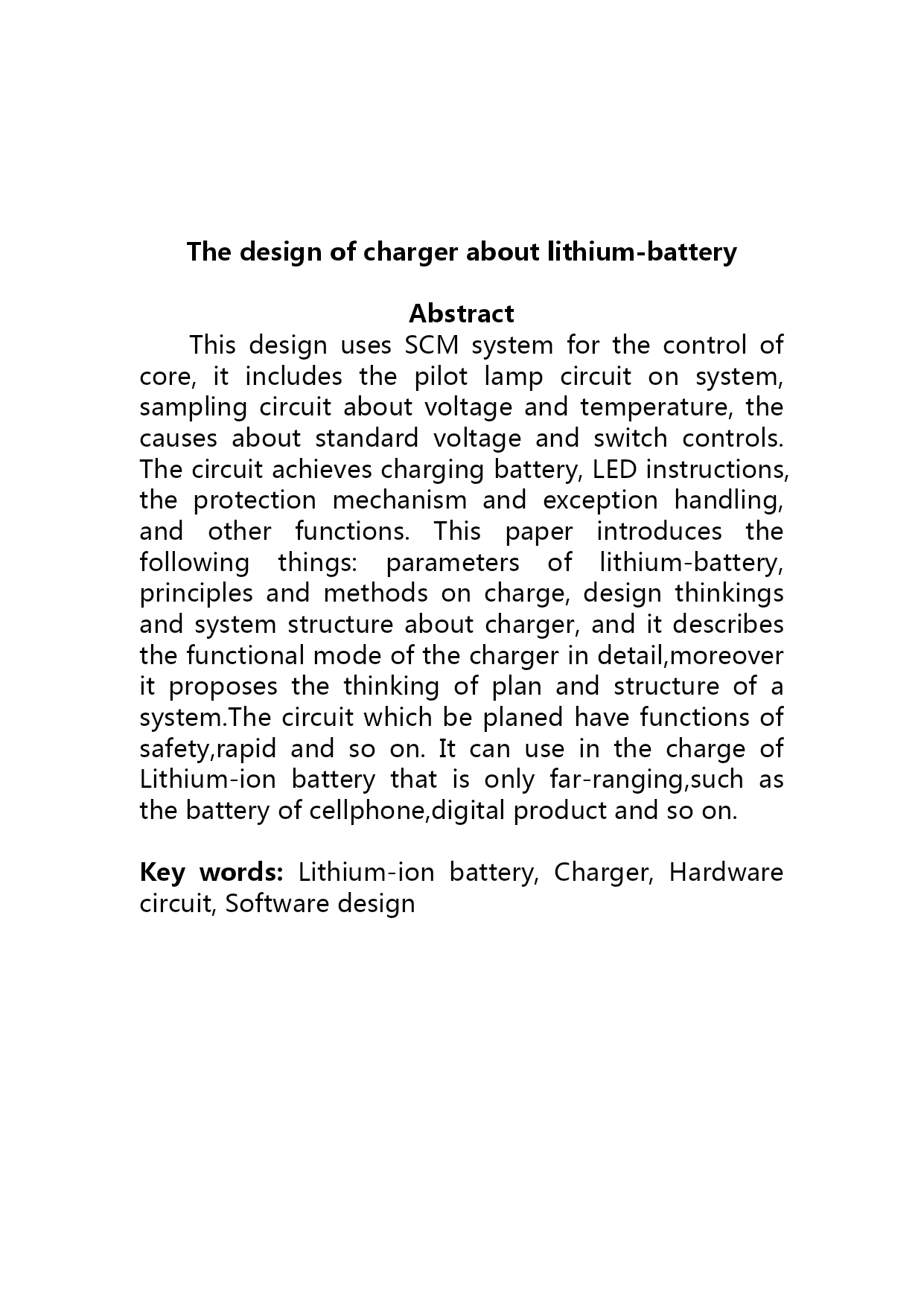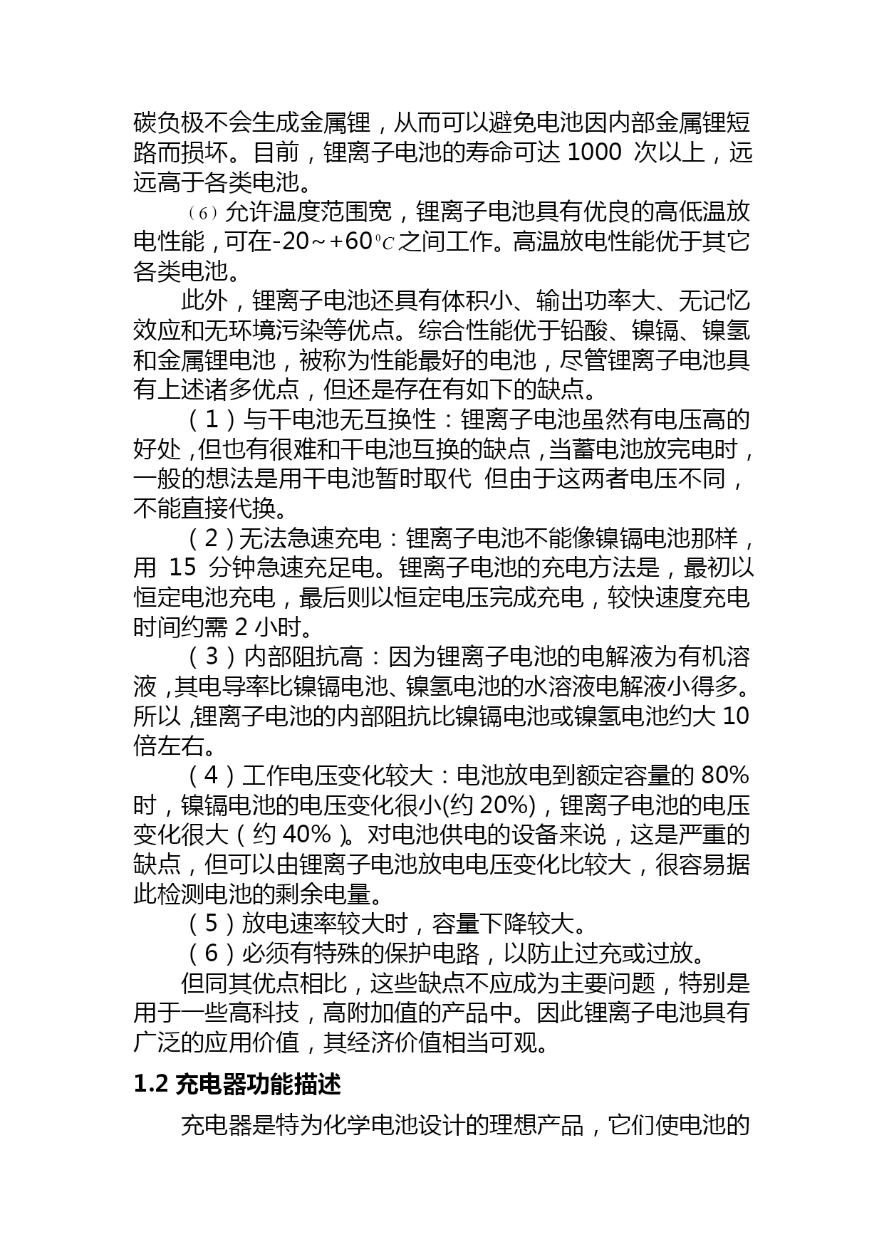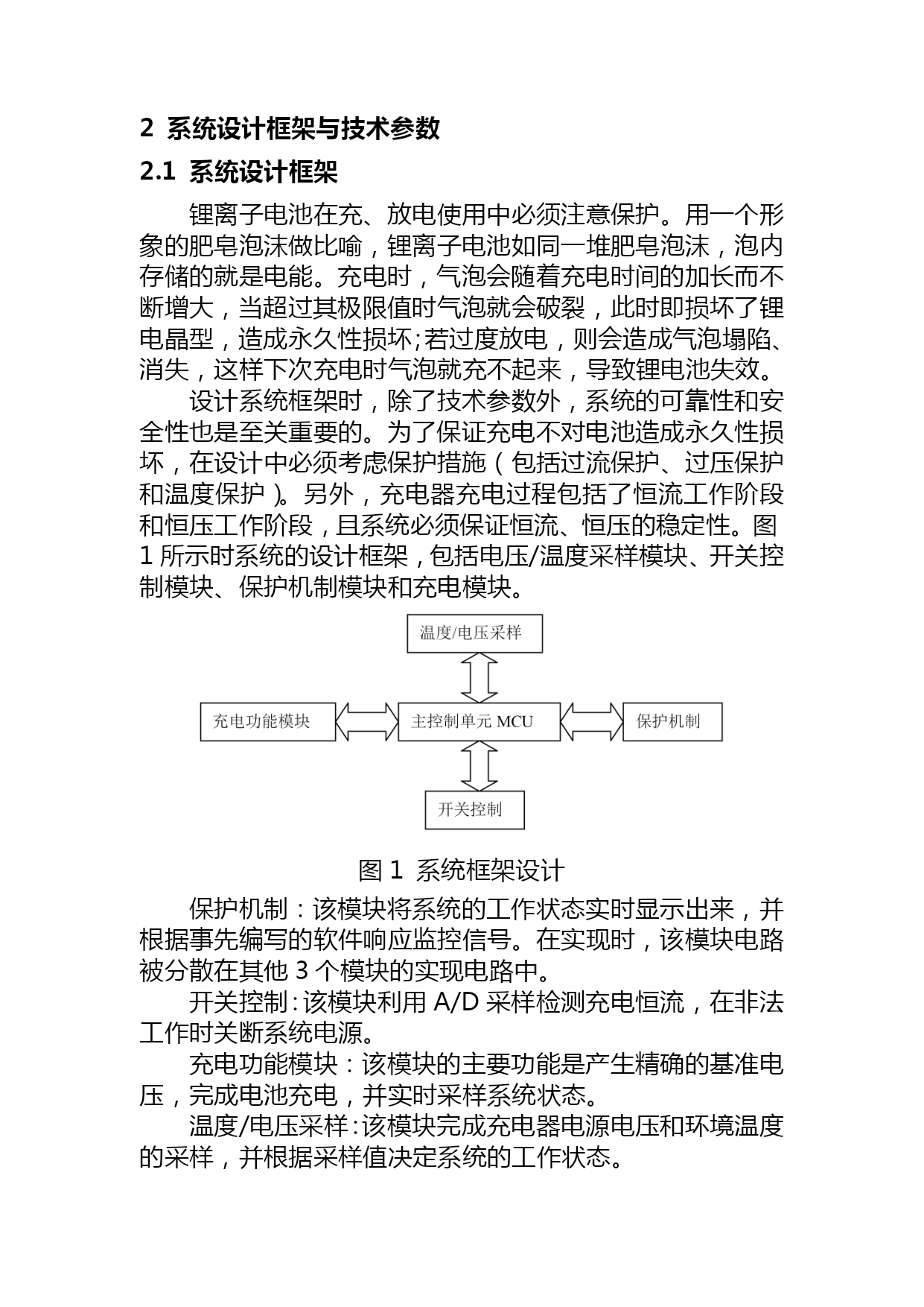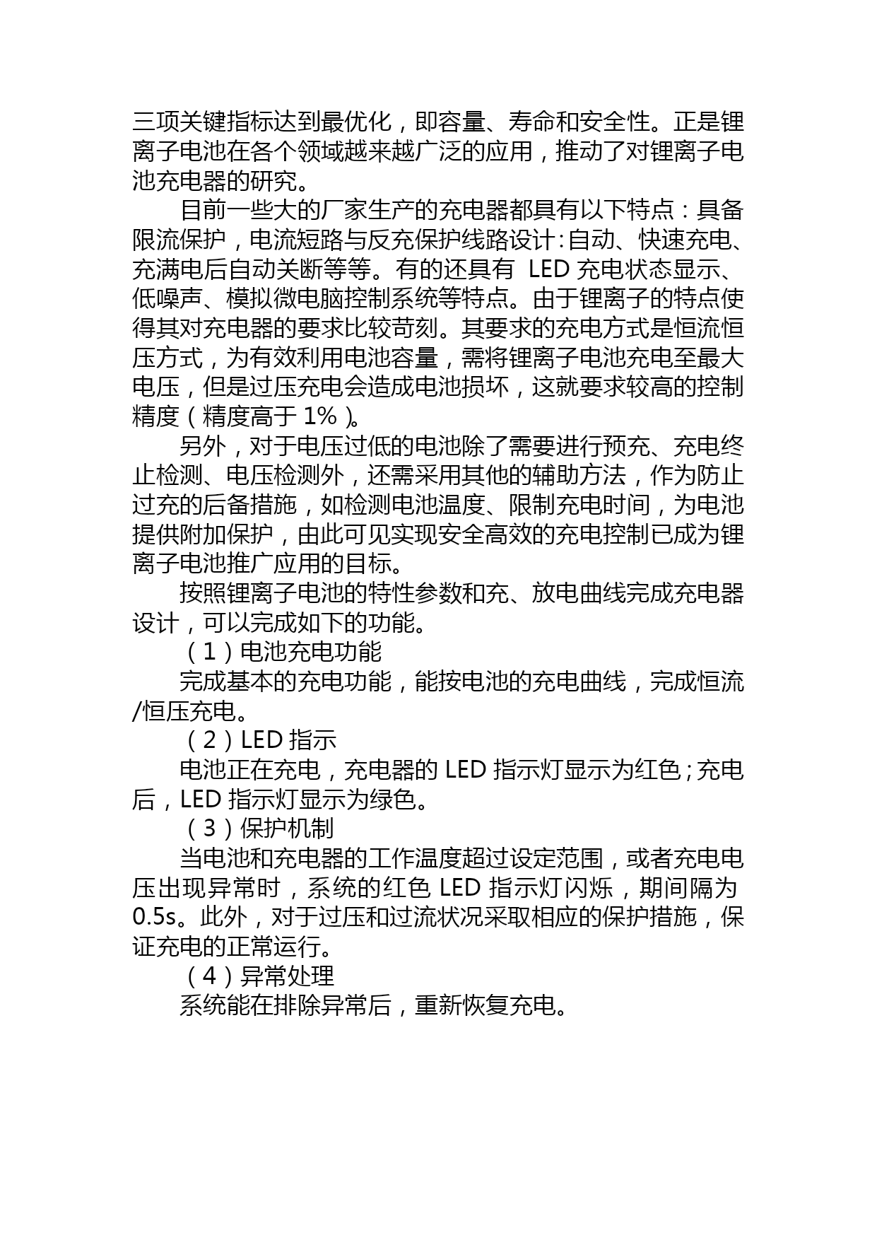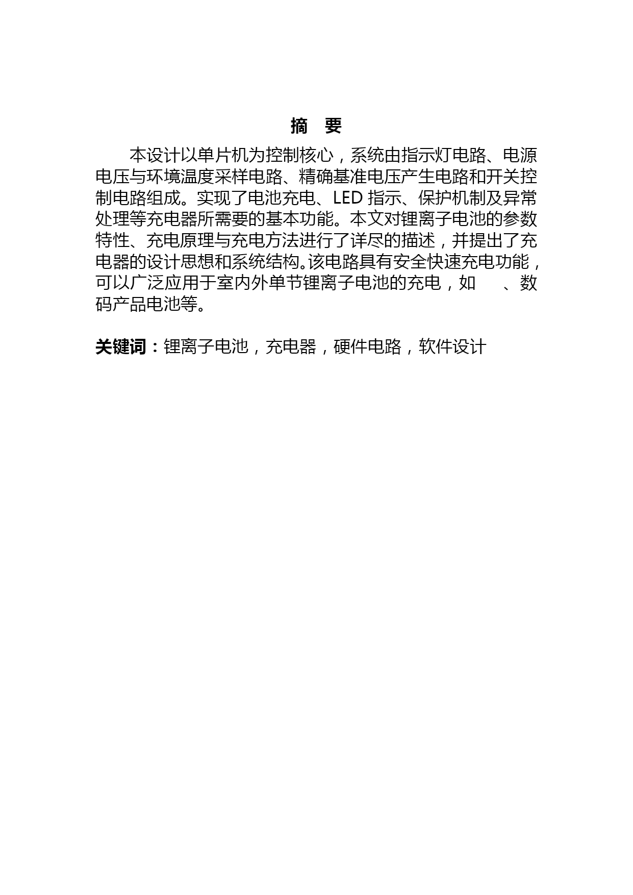 毕业设计:锂离子电池的充电器设计(完整版)资料(可以直接使用,可编辑优秀版资料,欢迎下载)数学N51存放数学成绩returnt=b【答案】A3)使用SQL命令在表stud2.dbf中插入一条记录:学号为“991201”,选课为“VFP程序设计”,命令是:Insert___________。s=area(r2)-area(r1)简历M4B.SELECT学号,姓名,性别FROMSWHERENOTEXISTS(SELECT*FROMSCWHERESC.学号=s.学号AND成绩<=85)55.假设”订单”表中有订单号、职员号、客户号和金额字段,正确的SQL语句只能是________。河南科技学院2021届本科毕业论文(设计)论文题目:锂离子电池的充电器设计学生姓名:毕明迪所在院系:机电学院所学专业:应用电子技术教育导师姓名:张伟完成时间:2021年5月20日摘要本设计以单片机为控制核心,系统由指示灯电路、电源电压与环境温度采样电路、精确基准电压产生电路和开关控制电路组成。实现了电池充电、LED指示、保护机制及异常处理等充电器所需要的基本功能。本文对锂离子电池的参数特性、充电原理与充电方法进行了详尽的描述,并提出了充电器的设计思想和系统结构。该电路具有安全快速充电功能,可以广泛应用于室内外单节锂离子电池的充电,如、数码产品电池等。关键词:锂离子电池,充电器,硬件电路,软件设计Thedesignofchargeraboutlithium-batteryAbstractThisdesignusesSCMsystemforthecontrolofcore,itincludesthepilotlampcircuitonsystem,samplingcircuitaboutvoltageandtemperature,thecausesaboutstandardvoltageandswitchcontrols.Thecircuitachieveschargingbattery,LEDinstructions,theprotectionmechanismandexceptionhandling,andotherfunctions.Thispaperintroducesthefollowingthings:parametersoflithium-battery,principlesandmethodsoncharge,designthinkingsandsystemstructureaboutcharger,anditdescribesthefunctionalmodeofthechargerindetail,moreoveritproposesthethinkingofplanandstructureofasystem.Thecircuitwhichbeplanedhavefunctionsofsafety,rapidandsoon.ItcanuseinthechargeofLithium-ionbatterythatisonlyfar-ranging,suchasthebatteryofcellphone,digitalproductandsoon.Keywords:Lithium-ionbattery,Charger,Hardwarecircuit,Softwaredesign目录TOC\o"1-3"\h\uHYPERLINK\l"_Toc232424589"1引言PAGEREF_Toc232424589\h1HYPERLINK\l"_Toc232424590"1.1课题研究背景PAGEREF_Toc232424590\h1HYPERLINK\l"_Toc232424591"1.2充电器功能描述PAGEREF_Toc232424591\h2HYPERLINK\l"_Toc232424592"2系统设计框架与技术参数PAGEREF_Toc232424592\h3HYPERLINK\l"_Toc232424593"2.1系统设计框架PAGEREF_Toc232424593\h3HYPERLINK\l"_Toc232424594"2.2锂离子电池特性PAGEREF_Toc232424594\h4HYPERLINK\l"_Toc232424595"PAGEREF_Toc232424595\h4HYPERLINK\l"_Toc232424596"PAGEREF_Toc232424596\h