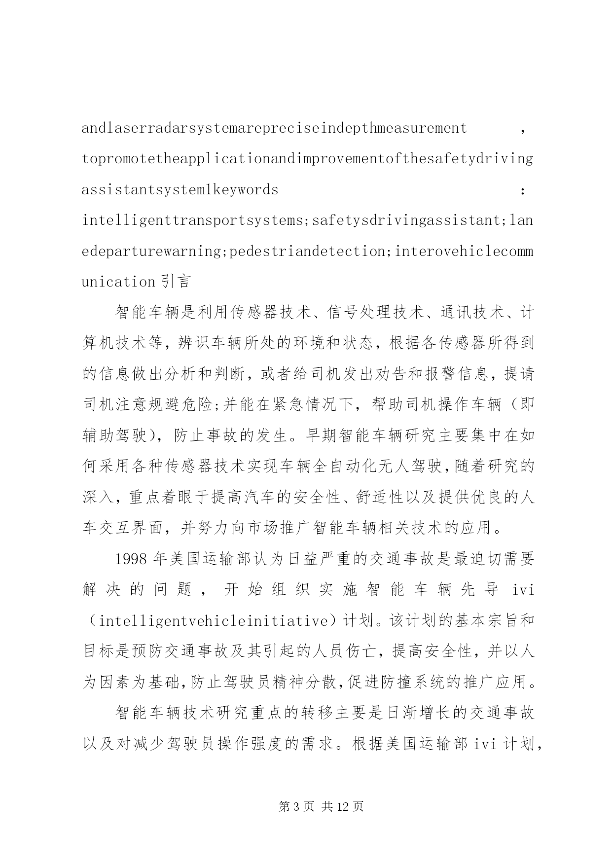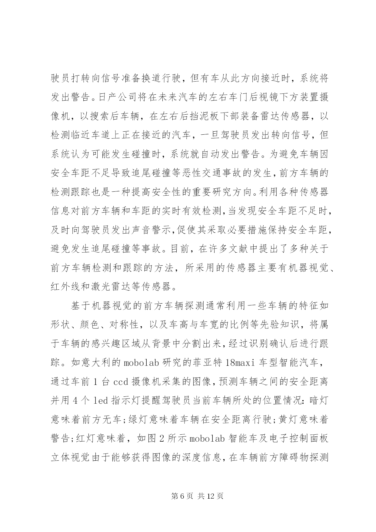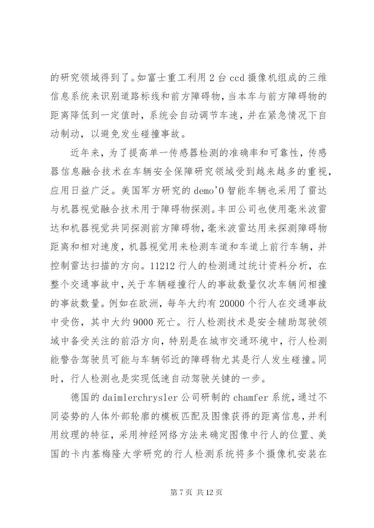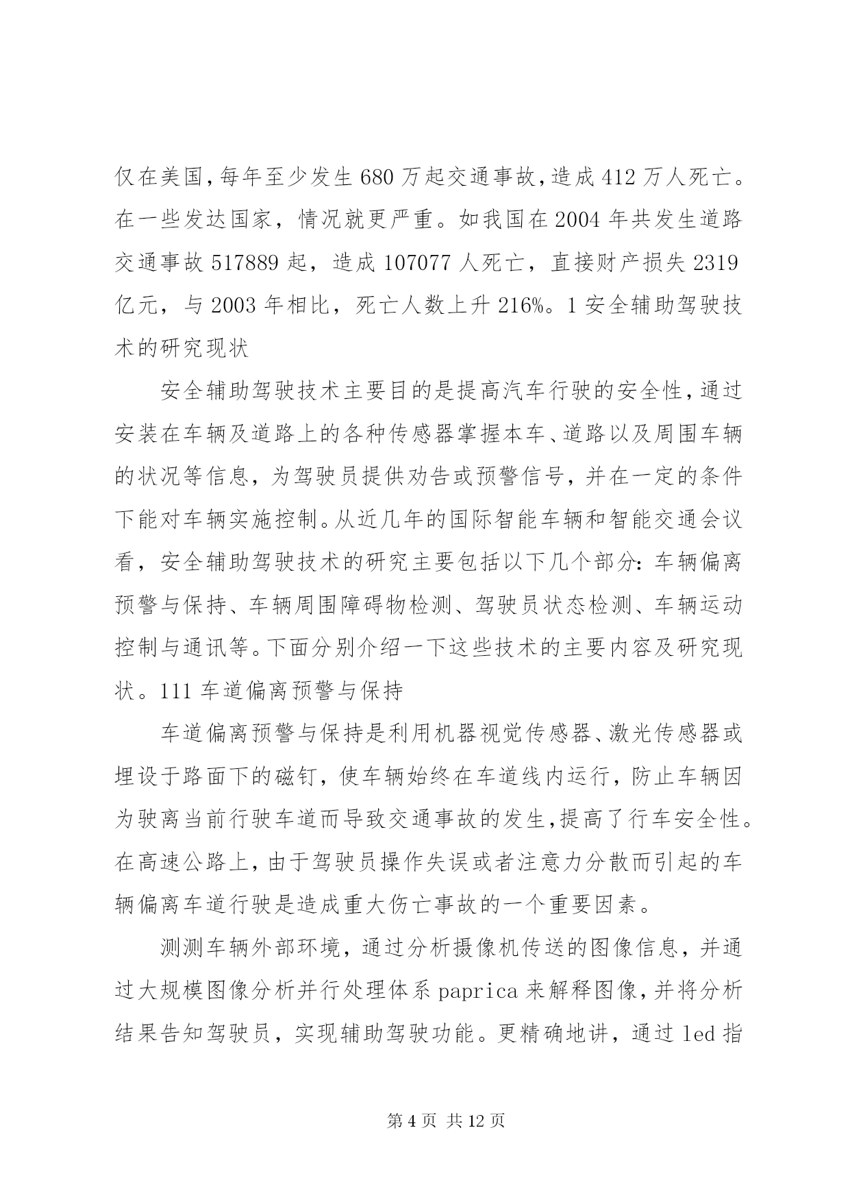 第PAGE\*Arabic\*MERGEFORMAT12页共NUMPAGES\*MERGEFORMAT12页《智能车辆技术》学习总结报告文章编号:1002o0268(2007)07o0107o05智能车辆安全辅助驾驶技术研究近况基金项目:国家自然科学基金资助项目(50175046)作者简介:王荣本(1946-),男,教授,博士生导师,研究方向为智能车辆、汽车安全辅助驾驶、物流自动化王荣本,郭烈,金立生,顾柏园,余天洪(吉林大学交通学院,吉林长春130025)摘要。论述了安全辅助驾驶技术的研究现状、研究的必要性以及研究进展。安全辅助驾驶技术包括车道偏离预警与保持、前方车辆探测及安全车距保持、行人检测、驾驶员行为监测、车辆运动控制与通讯等。分析了各种传感器的优缺点及其在实际应用过程中存在的问题,基于单一传感器不能很好地解决安全辅助驾驶技术可靠性和环境适应能力的要求,应结合激光雷达技术解决图像模糊问题,利用红外传感器增强机器视觉识别的可靠性,未来的安全辅助驾驶技术应该采取多种传感器融合的技术,结合毫米波雷达和激光雷达系统具有深度测量精确的特点,将极大的推动汽车安全辅助驾驶系统的应用和推广。关键词:智能交通系统;安全辅助驾驶;车道偏离预警;行人检测;车间通讯中图分类号:u491文献标识码:areviewontheresearchofintelligentvehiclesafetydrivingassistanttechnologywangrongoben,guolie,jinliosheng,gubaioyuan,yutianohong(schooloftransportation,jilinuniversity,jilinchangchun130025,china)abstract:thepresentresearchstatus,necessityandprogressonsafetydrivingassistanttechnologyarediscussed1thesafetydrivingassistanttechnologyincludeslanedeparturewarning,precedingvehicledetectionandsafedistancemaintainingbetweenvehicles,pedestriandetection,driverbehaviormonitoring,vehiclemotioncontrolandinterovehiclecommunications1theadvantagesanddisadvantagesofdifferenttypeofsensorsandtheproblemsthatexistedinthepracticalapplicationarerepresented1thesinglesensorsolutioncannotmeettherequirementofreliabilityandadaptabilitytodifferentcircumstance,sothelaserandradartechnologyarecombinedtosolvetheblurredimageproblem,theinfraredsensorisusedtoenhancethereliabilityofmachinevisionrecognition1thefuturesafetydrivingassistanttechnologyshouldadoptmultiplesensorsfusiontechnology,associatedwiththecharacteristicthatmillimeterowaveradarandlaserradarsystemarepreciseindepthmeasurement,topromotetheapplicationandimprovementofthesafetydrivingassistantsystem1keywords:intelligenttransportsystems;safetysdrivingassistant;lanedeparturewarning;pedestriandetection;interovehiclecommunication引言智能车辆是利用传感器技术、信号处理技术、通讯技术、计算机技术等,辨识车辆所处的环境和状态,根据各传感器所得到的信息做出分析和判断,或者给司机发出劝告和报警信息,提请司机注意规避危险;并能在紧急情况下,帮助司机操作车辆(即辅助驾驶),防止事故的发生。早期智能车辆研究主要集中在如何采用各种传感器技术实现车辆全自动化无人驾驶,随着研究的深入,重