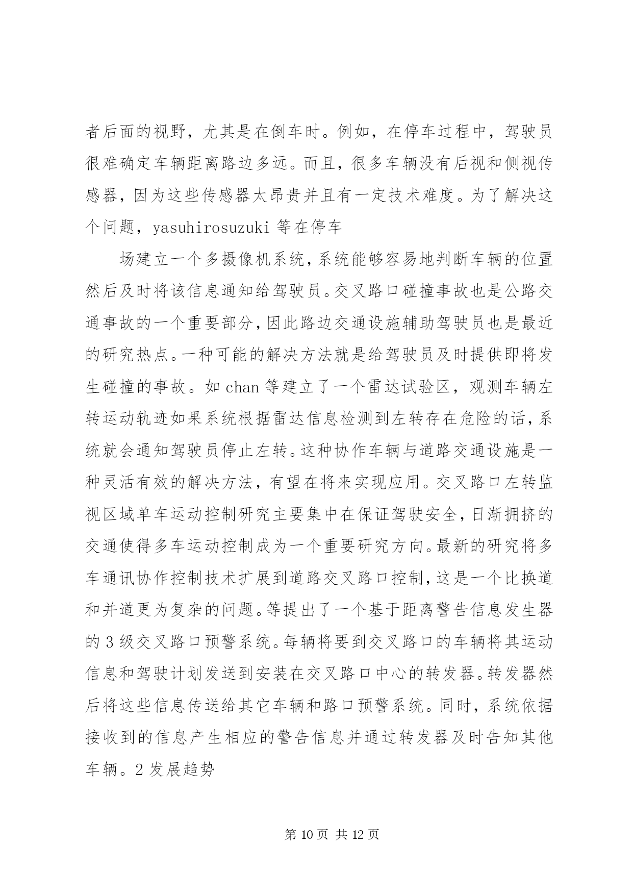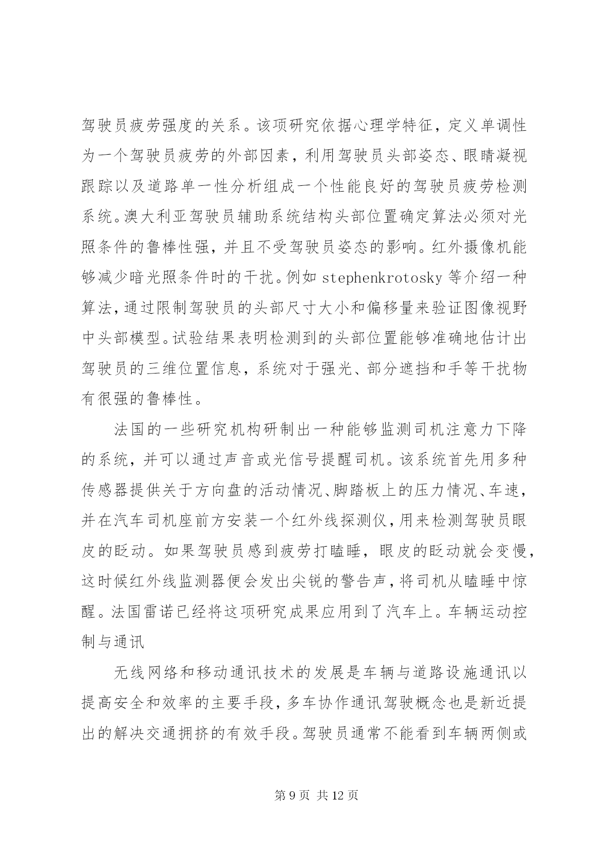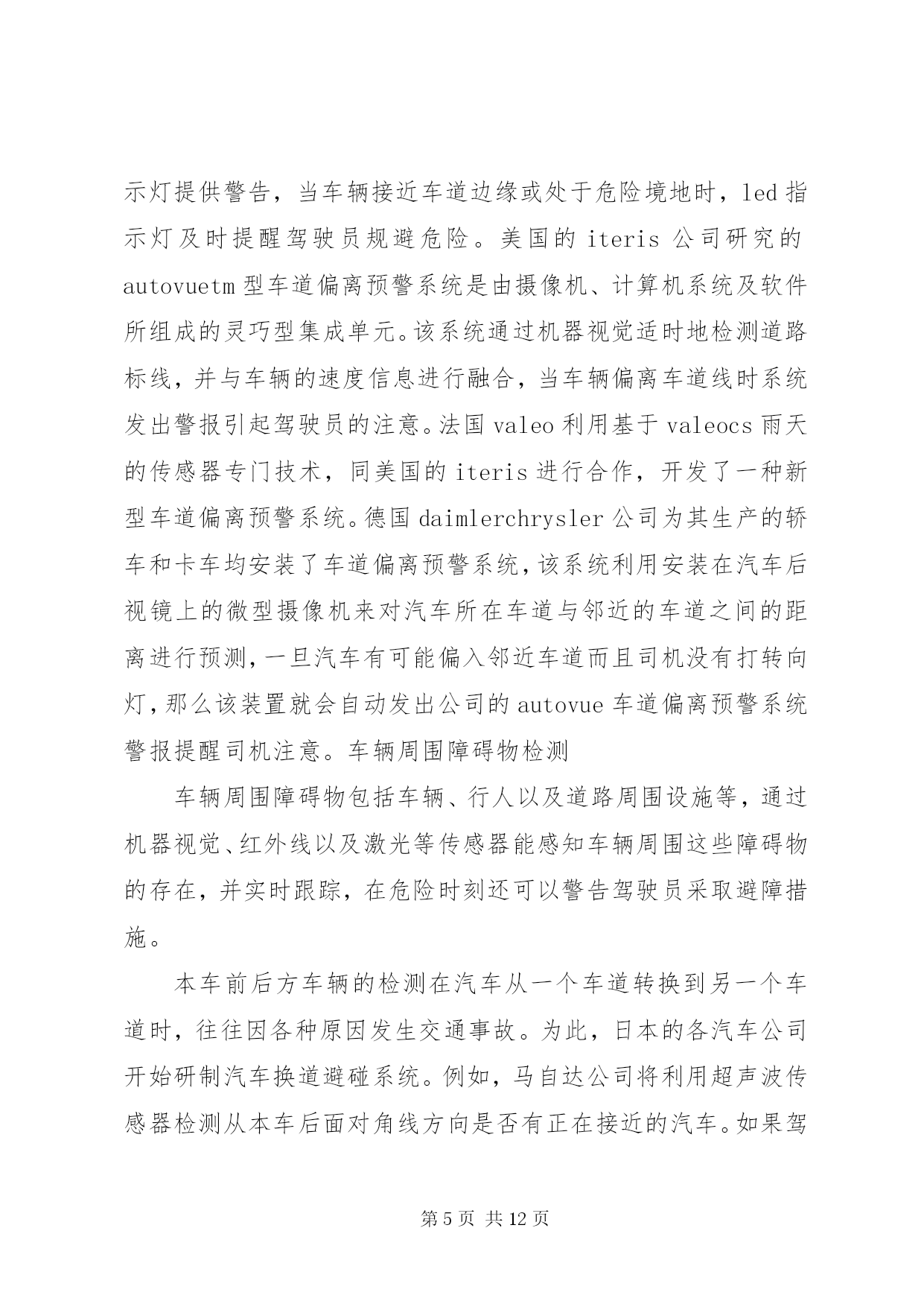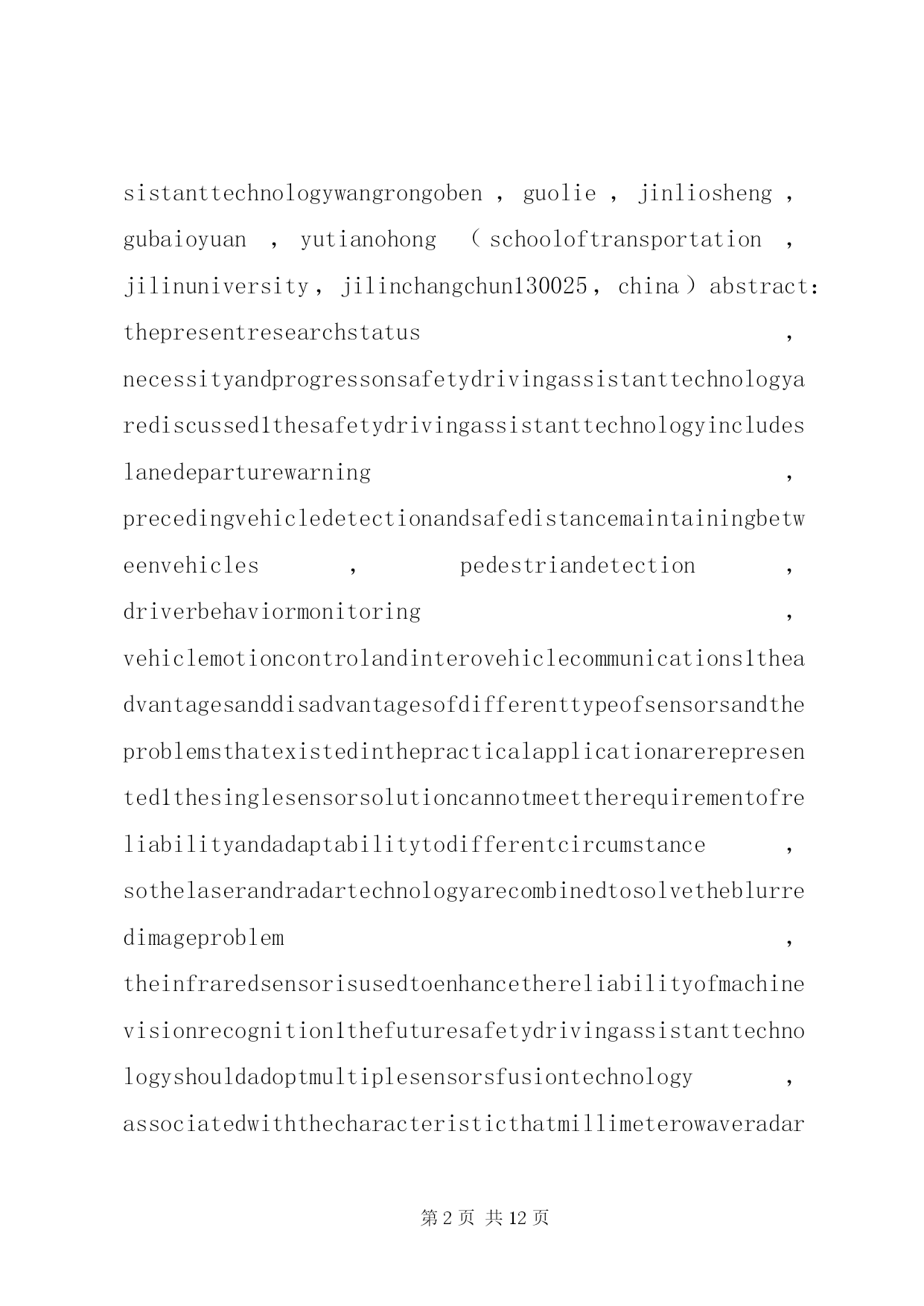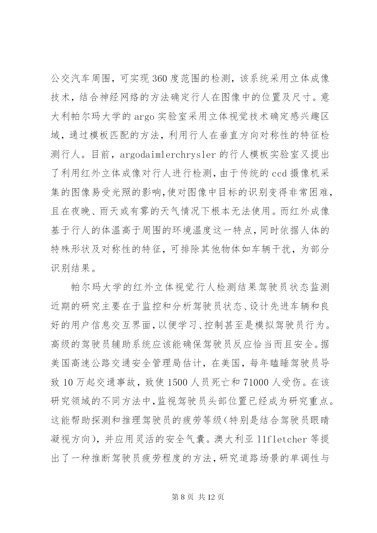 第PAGE\*Arabic\*MERGEFORMAT12页共NUMPAGES\*MERGEFORMAT12页《智能车辆技术》学习总结报告文章编号:1002o0268(2007)07o0107o05智能车辆安全辅助驾驶技术研究近况基金项目:国家自然科学基金资助项目(50175046)作者简介:王荣本(1946-),男,教授,博士生导师,研究方向为智能车辆、汽车安全辅助驾驶、物流自动化王荣本,郭烈,金立生,顾柏园,余天洪(吉林大学交通学院,吉林长春130025)摘要。论述了安全辅助驾驶技术的研究现状、研究的必要性以及研究进展。安全辅助驾驶技术包括车道偏离预警与保持、前方车辆探测及安全车距保持、行人检测、驾驶员行为监测、车辆运动控制与通讯等。分析了各种传感器的优缺点及其在实际应用过程中存在的问题,基于单一传感器不能很好地解决安全辅助驾驶技术可靠性和环境适应能力的要求,应结合激光雷达技术解决图像模糊问题,利用红外传感器增强机器视觉识别的可靠性,未来的安全辅助驾驶技术应该采取多种传感器融合的技术,结合毫米波雷达和激光雷达系统具有深度测量精确的特点,将极大的推动汽车安全辅助驾驶系统的应用和推广。关键词:智能交通系统;安全辅助驾驶;车道偏离预警;行人检测;车间通讯中图分类号:u491文献标识码:areviewontheresearchofintelligentvehiclesafetydrivingassistanttechnologywangrongoben,guolie,jinliosheng,gubaioyuan,yutianohong(schooloftransportation,jilinuniversity,jilinchangchun130025,china)abstract:thepresentresearchstatus,necessityandprogressonsafetydrivingassistanttechnologyarediscussed1thesafetydrivingassistanttechnologyincludeslanedeparturewarning,precedingvehicledetectionandsafedistancemaintainingbetweenvehicles,pedestriandetection,driverbehaviormonitoring,vehiclemotioncontrolandinterovehiclecommunications1theadvantagesanddisadvantagesofdifferenttypeofsensorsandtheproblemsthatexistedinthepracticalapplicationarerepresented1thesinglesensorsolutioncannotmeettherequirementofreliabilityandadaptabilitytodifferentcircumstance,sothelaserandradartechnologyarecombinedtosolvetheblurredimageproblem,theinfraredsensorisusedtoenhancethereliabilityofmachinevisionrecognition1thefuturesafetydrivingassistanttechnologyshouldadoptmultiplesensorsfusiontechnology,associatedwiththecharacteristicthatmillimeterowaveradarandlaserradarsystemarepreciseindepthmeasurement,topromotetheapplicationandimprovementofthesafetydrivingassistantsystem1keywords:intelligenttransportsystems;safetysdrivingassistant;lanedeparturewarning;pedestriandetection;interovehiclecommunication引言智能车辆是利用传感器技术、信号处理技术、通讯技术、计算机技术等,辨识车辆所处的环境和状态,根据各传感器所得到的信息做出分析和判断,或者给司机发出劝告和报警信息,提请司机注意规避危险;并能在紧急情况下,帮助司机操作车辆(即辅助驾驶),防止事故的发生。早期智能车辆研究主要集中在如何采用各种传感器技术实现车辆全自动化无人驾驶,随着研究的深入,重