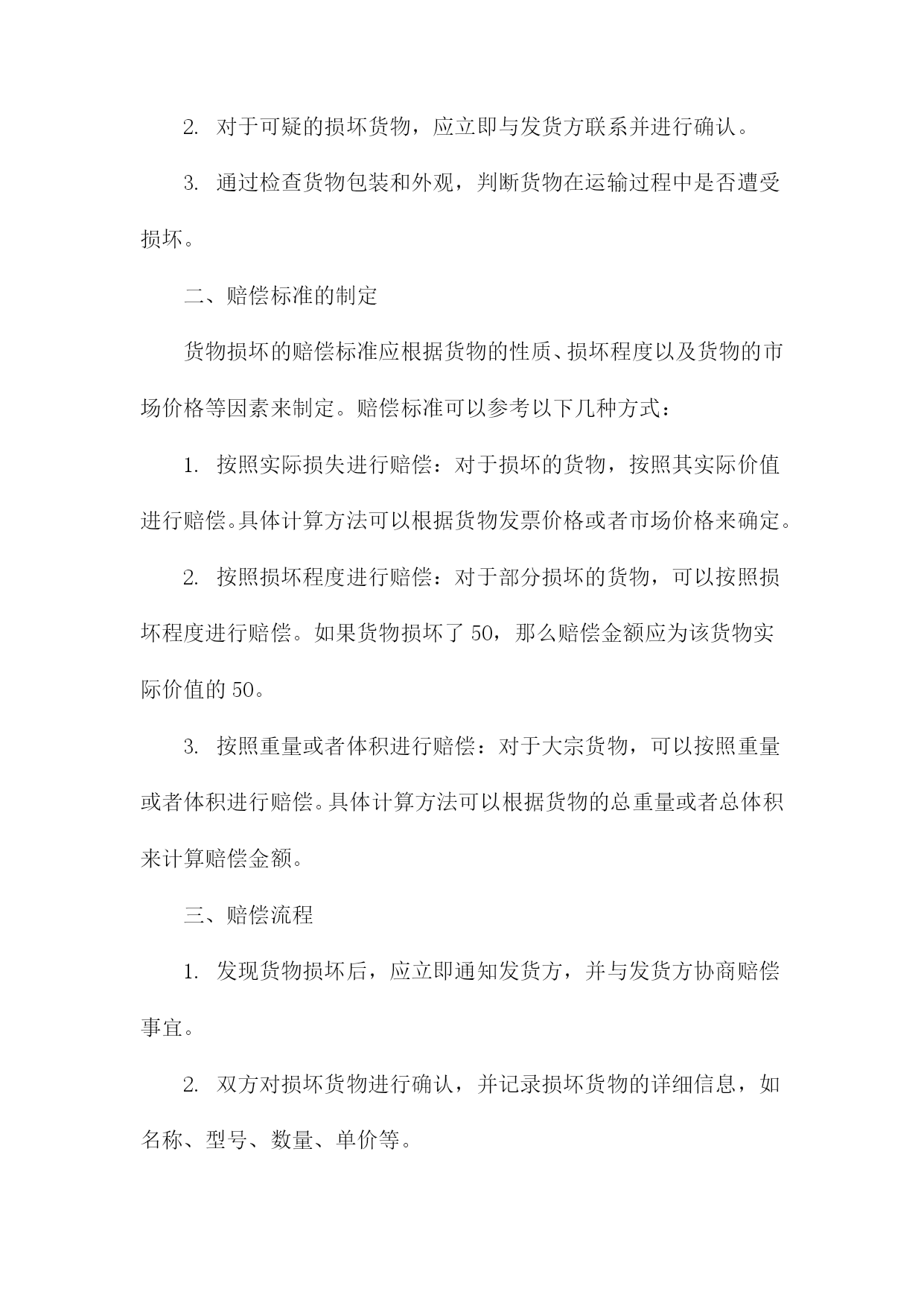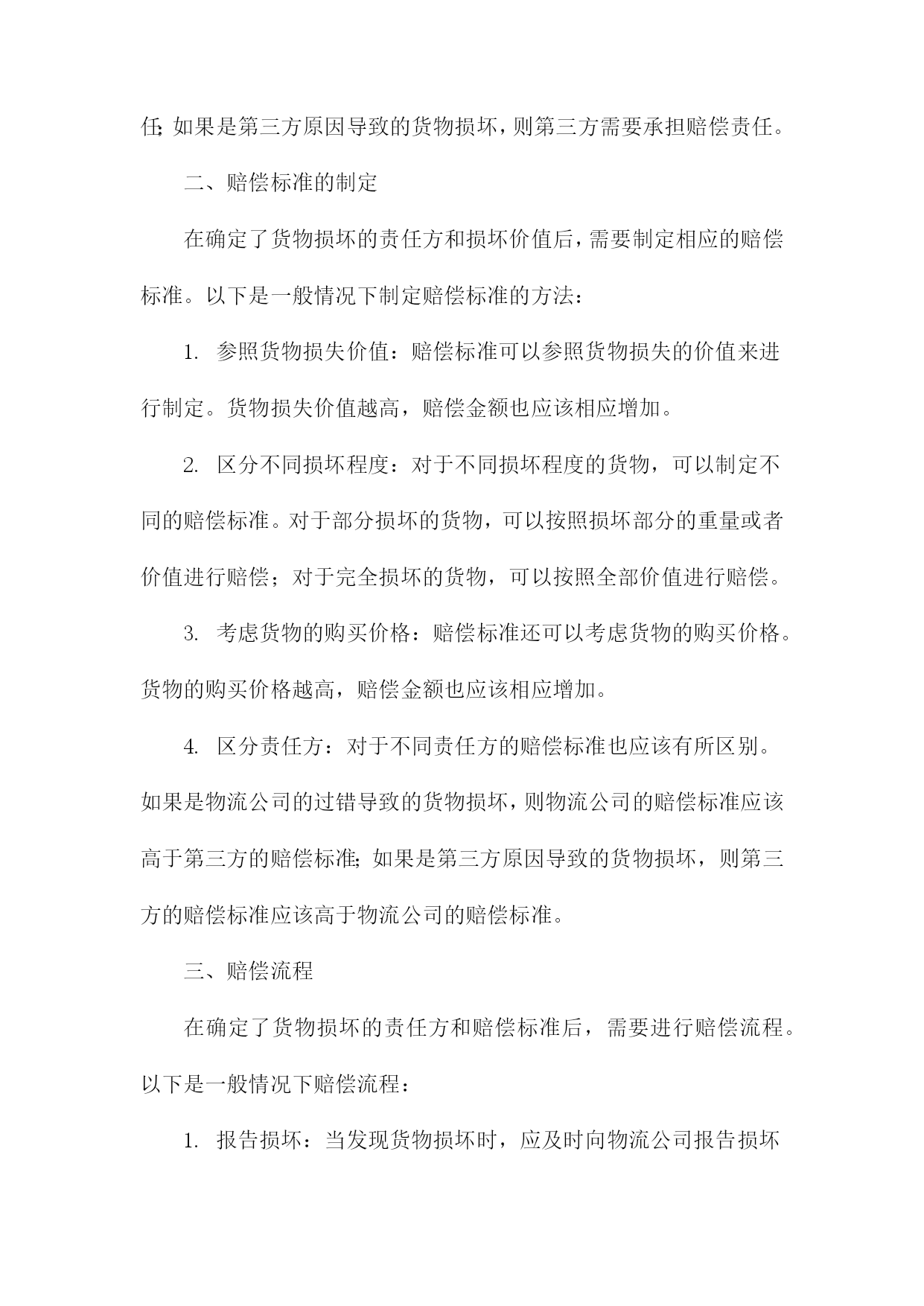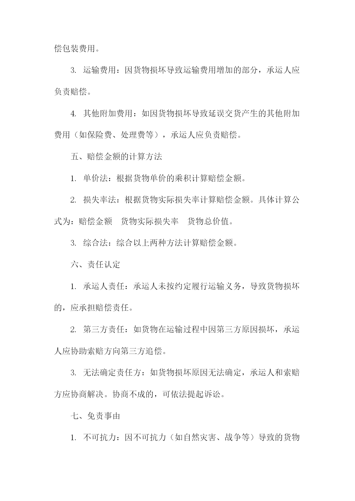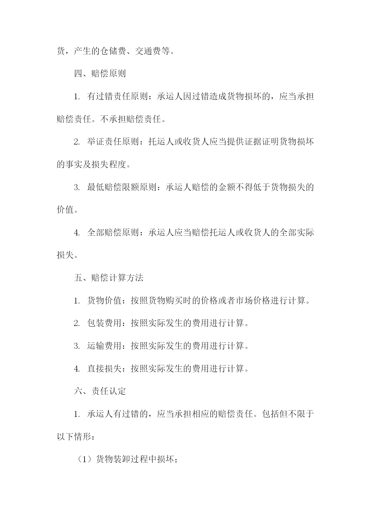 物流损坏货物赔偿标准一、法律依据本标准根据《中华人民共和国民法典》第一千一百六十五条,结合物流行业的特点,制定物流损坏货物赔偿标准。二、定义物流损坏货物赔偿,是指在物流过程中,货物因承运人的过错或疏忽,造成货物损坏,承运人应承担的赔偿责任。三、赔偿原则1.诚实信用原则:承运人应按照约定履行运输义务,确保货物安全、完整地送达目的地。2.谁主张、谁举证原则:索赔方应提供证据证明货物在运输过程中受损的事实及损失程度。3.过错责任原则:承运人应在过错范围内承担赔偿责任。则不承担赔偿责任。四、赔偿范围1.货物价值:货物在运输过程中的损失应按照货物价值进行赔偿。货物价值可根据购货发票、货物清单等证据确定。2.包装费用:由于货物包装不善导致的损坏,承运人应负责赔偿包装费用。3.运输费用:因货物损坏导致运输费用增加的部分,承运人应负责赔偿。4.其他附加费用:如因货物损坏导致延误交货产生的其他附加费用(如保险费、处理费等),承运人应负责赔偿。五、赔偿金额的计算方法1.单价法:根据货物单价的乘积计算赔偿金额。2.损失率法:根据货物实际损失率计算赔偿金额。具体计算公式为:赔偿金额货物实际损失率货物总价值。3.综合法:综合以上两种方法计算赔偿金额。六、责任认定1.承运人责任:承运人未按约定履行运输义务,导致货物损坏的,应承担赔偿责任。2.第三方责任:如货物在运输过程中因第三方原因损坏,承运人应协助索赔方向第三方追偿。3.无法确定责任方:如货物损坏原因无法确定,承运人和索赔方应协商解决。协商不成的,可依法提起诉讼。七、免责事由1.不可抗力:因不可抗力(如自然灾害、战争等)导致的货物损坏,承运人不承担赔偿责任。2.货物本身的自然属性:货物在运输过程中因自然属性(如腐烂、损坏等)导致的损坏,承运人不承担赔偿责任。3.合同约定免责条款:如承运人与托运人在合同中约定免责条款的,按照约定执行。八、争议解决如双方对赔偿金额或责任认定有异议,可协商解决。协商不成的,可依法提起诉讼。在诉讼过程中,双方应提供充分的证据证明自己的主张。物流损坏货物赔偿标准(1)一、货物损坏的确定1.货物损失价值的计算:通常情况下,货物损坏的价值可以根据损坏货物的实际价值、损坏程度以及损坏货物的购买价格等因素来计算。2.损坏程度的鉴定:对于货物损坏程度的鉴定,一般需要由专业鉴定机构或者相关部门进行鉴定,并出具相应的鉴定报告。3.责任方的确定:根据货物损坏的原因和责任方来确定赔偿方。如果是物流公司的过错导致的货物损坏,则物流公司需要承担赔偿责任;如果是第三方原因导致的货物损坏,则第三方需要承担赔偿责任。二、赔偿标准的制定在确定了货物损坏的责任方和损坏价值后,需要制定相应的赔偿标准。以下是一般情况下制定赔偿标准的方法:1.参照货物损失价值:赔偿标准可以参照货物损失的价值来进行制定。货物损失价值越高,赔偿金额也应该相应增加。2.区分不同损坏程度:对于不同损坏程度的货物,可以制定不同的赔偿标准。对于部分损坏的货物,可以按照损坏部分的重量或者价值进行赔偿;对于完全损坏的货物,可以按照全部价值进行赔偿。3.考虑货物的购买价格:赔偿标准还可以考虑货物的购买价格。货物的购买价格越高,赔偿金额也应该相应增加。4.区分责任方:对于不同责任方的赔偿标准也应该有所区别。如果是物流公司的过错导致的货物损坏,则物流公司的赔偿标准应该高于第三方的赔偿标准;如果是第三方原因导致的货物损坏,则第三方的赔偿标准应该高于物流公司的赔偿标准。三、赔偿流程在确定了货物损坏的责任方和赔偿标准后,需要进行赔偿流程。以下是一般情况下赔偿流程:1.报告损坏:当发现货物损坏时,应及时向物流公司报告损坏情况,并提供相应的货物单据和损坏照片等证明材料。2.确定损坏原因:物流公司或第三方应尽快对货物损坏原因进行鉴定,并出具相应的鉴定报告。3.协商赔偿:在确定了损坏原因和责任方后,双方应根据损坏价值和赔偿标准进行协商,以达成赔偿协议。物流损坏货物赔偿标准(2)一、法律依据本标准根据《中华人民共和国民法典》第一千一百六十五条,结合物流行业的特点,制定物流损坏货物赔偿标准。二、定义物流损坏货物赔偿,是指在物流过程中,货物因承运人的过错或疏忽,造成损坏、丢失等损失,承运人应当按照本标准向托运人或收货人承担赔偿责任。三、赔偿范围1.货物本身的损失:包括货物价值、功能、外观等方面的损失。2.包装费用:因货物损坏需要更换包装或修复包装的费用。3.运输费用:因货物损坏需要重新运输的运费。4.收货人或托运人的其他直接损失:如因货物损坏导致延误交货,产生的仓储费、交通费等。四、赔偿原则1.有过错责任原则:承运人因过错造成货物损坏的,应当承担赔偿责任。不承担赔