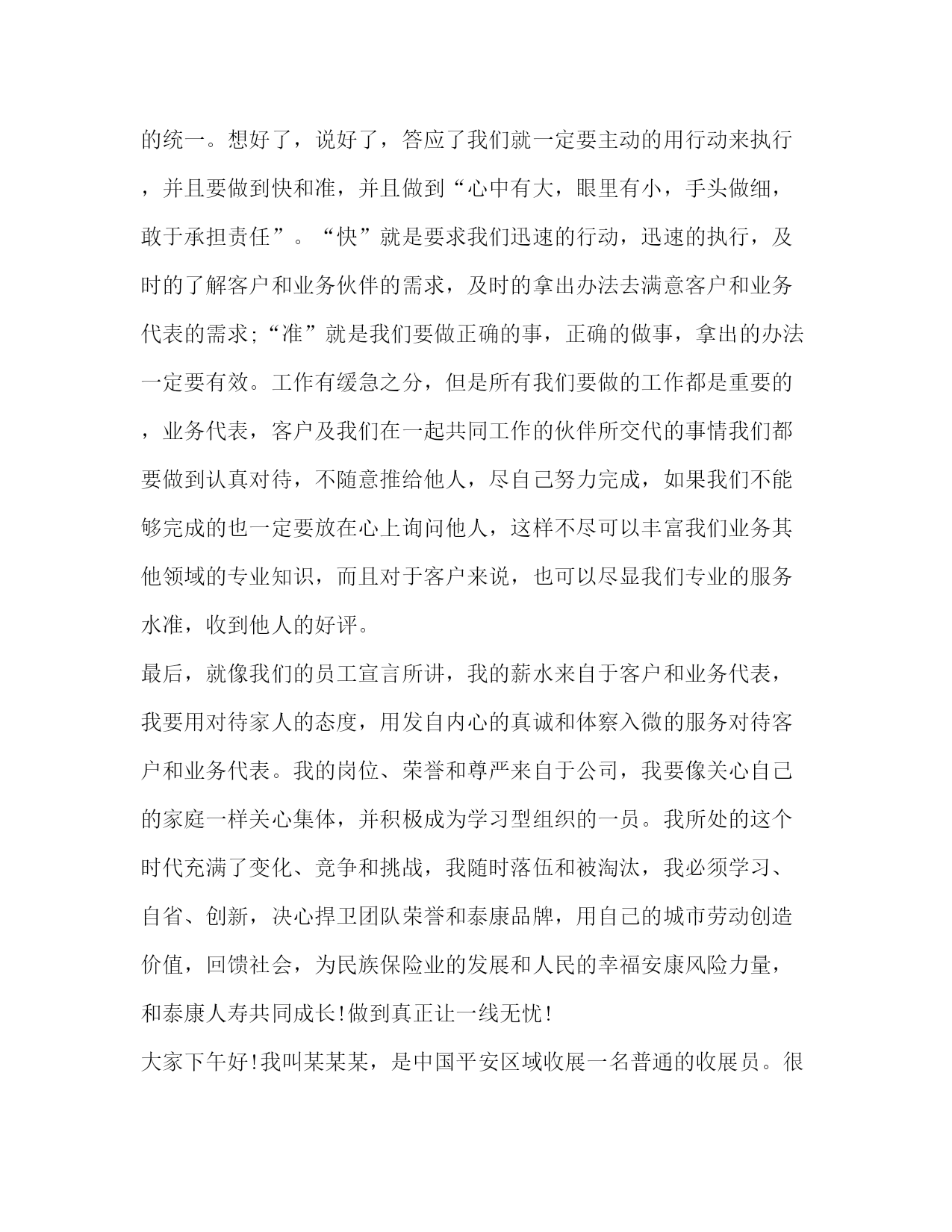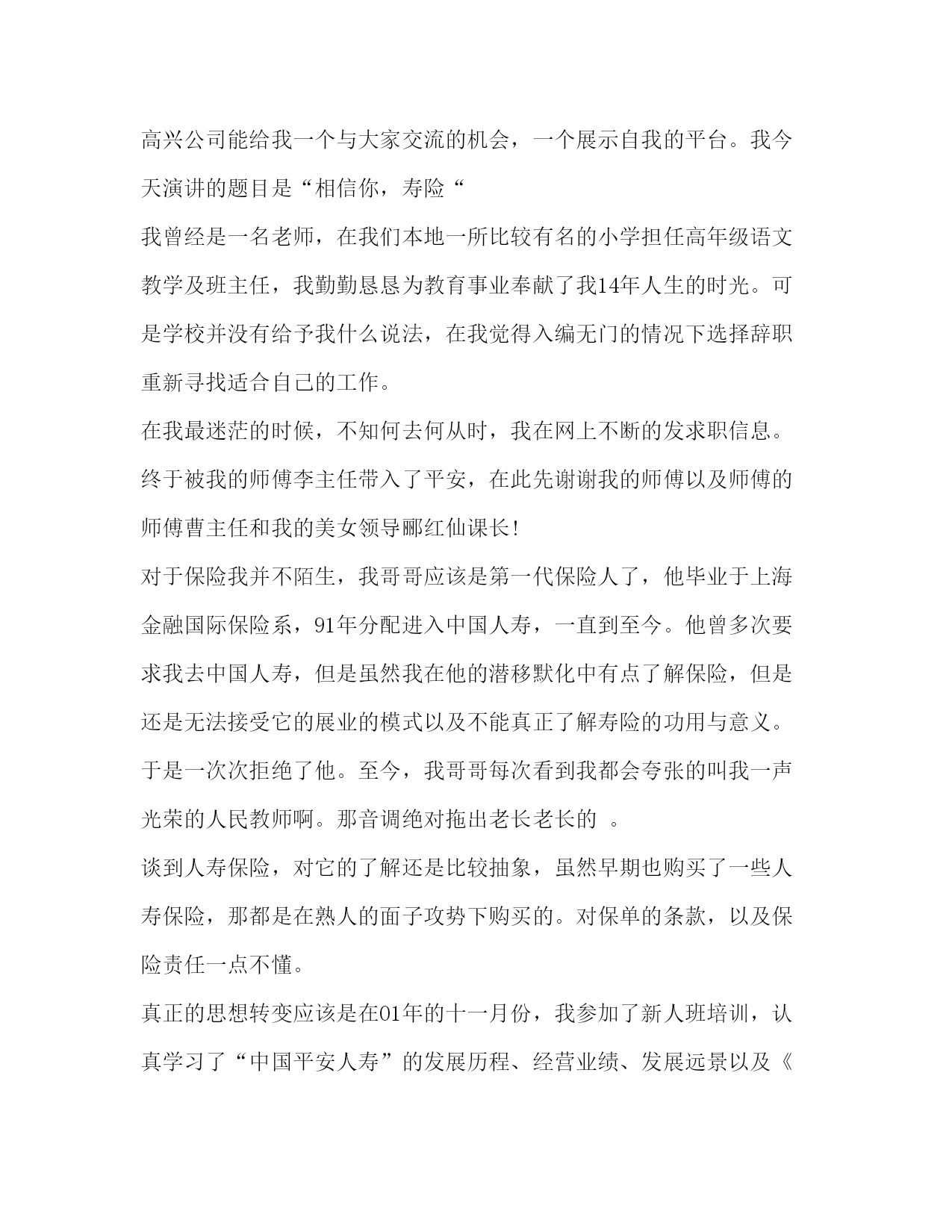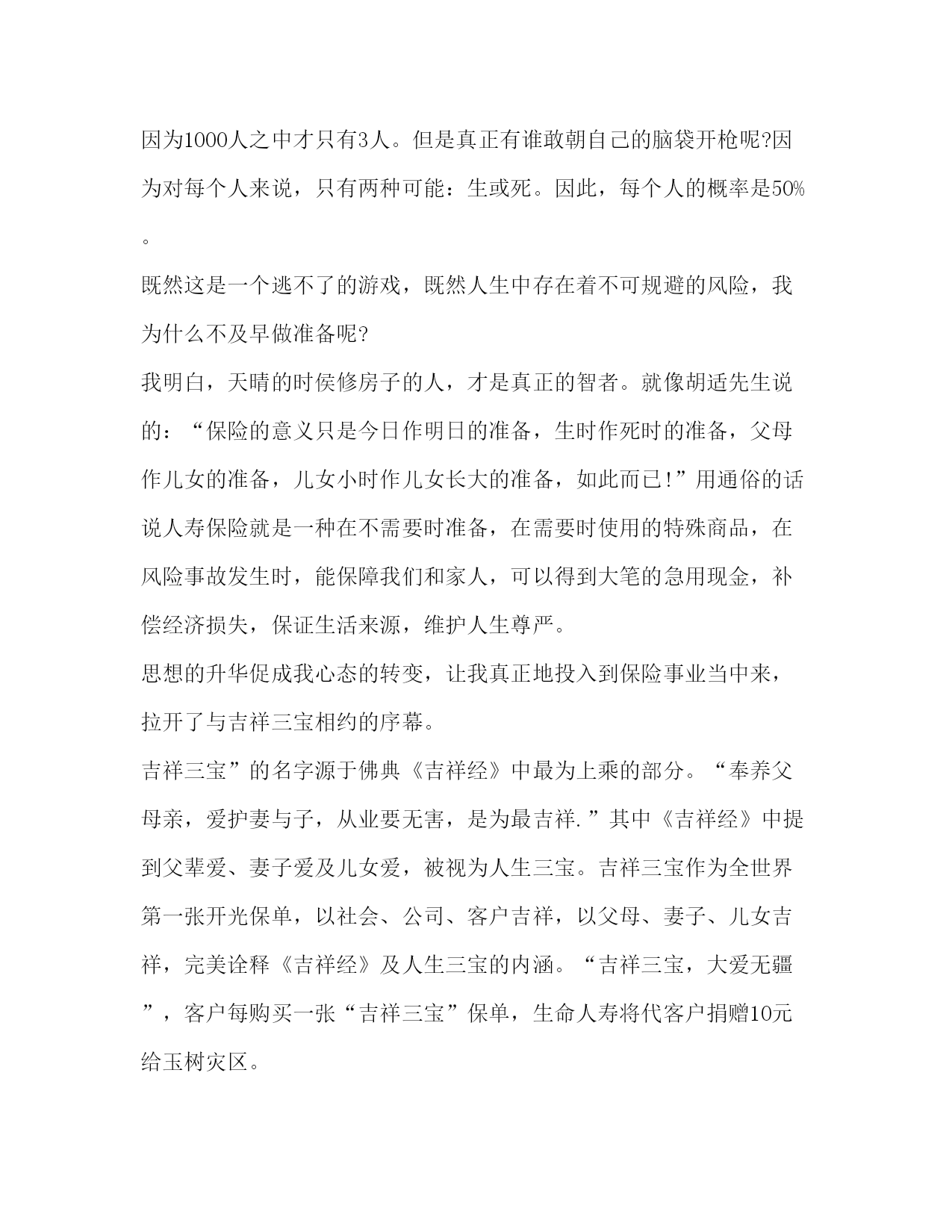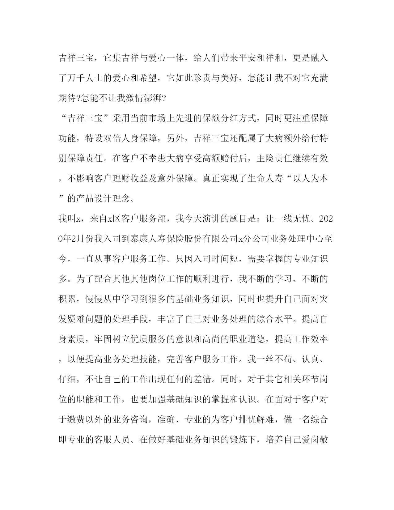 PAGE此资料由网络收集而来,如有侵权请告知上传者立即删除。资料共分享,我们负责传递知识。关于保险发言比尔盖茨说“到目前为止,我没有发现有哪一种方法比购买人寿保险更能有效地解决企业的医疗财务问题”。以下是小编为大家整理的保险发言,供大家参考学习。我一直在等待,等待一个邀约,这本是很多年以前该奔赴的约会,却姗姗来迟。这是一次迟到的相约,我的等待在暮霭中沉默,岁月在静静等待中流逝,一转身,就又过了一季,转眼间,已过了二十多年;这也是一次美丽的相约,更是用智慧驱散我心中迷雾的完美邂逅。一直以来,保险之于我,是遥远而混沌的,虽然我受过高等教育。我们这一代人常被称为保险缺失的一代,在少年时代,我没有受过系统的保险知识教育,连知之甚少的保险知识也是来自于道听途说,其中更有许多歪曲和误解,更别说去购买一份有保障的保险。在生命人寿的专业学习,让我心中的疑惑如迷雾遇到阳光一样逐渐消散。在此之前,我和很多人一样,保险意识淡薄,认为自己年轻身体健康不需要保险。我参加了新人班培训,认真学习了“生命人寿”的发展历程从这个故事中我彻底顿悟了,原来我和我所有人一样,都在无意识地每年重复着这样的游戏。根据中国人生命表统计显示,中国人的年平均死亡率恰巧是千分之三!也许有人说千分之三的概率很小,因为1000人之中才只有3人。但是真正有谁敢朝自己的脑袋开枪呢?因为对每个人来说,只有两种可能:生或死。因此,每个人的概率是50%。既然这是一个逃不了的游戏,既然人生中存在着不可规避的风险,我为什么不及早做准备呢?我明白,天晴的时侯修房子的人,才是真正的智者。就像胡适先生说的:“保险的意义只是今日作明日的准备,生时作死时的准备,父母作儿女的准备,儿女小时作儿女长大的准备,如此而已!”用通俗的话说人寿保险就是一种在不需要时准备,在需要时使用的特殊商品,在风险事故发生时,能保障我们和家人,可以得到大笔的急用现金,补偿经济损失,保证生活来源,维护人生尊严。思想的升华促成我心态的转变,让我真正地投入到保险事业当中来,拉开了与吉祥三宝相约的序幕。吉祥三宝”的名字源于佛典《吉祥经》中最为上乘的部分。“奉养父母亲,爱护妻与子,从业要无害,是为最吉祥.”其中《吉祥经》中提到父辈爱、妻子爱及儿女爱,被视为人生三宝。吉祥三宝作为全世界第一张开光保单,以社会、公司、客户吉祥,以父母、妻子、儿女吉祥,完美诠释《吉祥经》及人生三宝的内涵。“吉祥三宝,大爱无疆”,客户每购买一张“吉祥三宝”保单,生命人寿将代客户捐赠10元给玉树灾区。吉祥三宝,它集吉祥与爱心一体,给人们带来平安和祥和,更是融入了万千人士的爱心和希望,它如此珍贵与美好,怎能让我不对它充满期待?怎能不让我激情澎湃?“吉祥三宝”采用当前市场上先进的保额分红方式,同时更注重保障功能,特设双倍人身保障,另外,吉祥三宝还配属了大病额外给付特别保障责任。在客户不幸患大病享受高额赔付后,主险责任继续有效,不影响客户理财收益及意外保障。真正实现了生命人寿“以人为本”的产品设计理念。我叫x,来自x区客户服务部,我今天演讲的题目是:让一线无忧。2020年2月份我入司到泰康人寿保险股份有限公司x分公司业务处理中心至今,一直从事客户服务工作。只因入司时间短,需要掌握的专业知识多。为了配合其他其他岗位工作的顺利进行,我不断的学习、不断的积累,慢慢从中学习到很多的基础业务知识,同时也提升自己面对突发疑难问题的处理手段,丰富了自己对业务处理的综合水平。提高自身素质,牢固树立优质服务的意识和高尚的职业道德,提高工作效率,以便提高业务处理技能,完善客户服务工作。我一丝不苟、认真、仔细,不让自己的工作出现任何的差错。同时,对于其它相关环节岗位的职能和工作,也要加强基础知识的掌握和认识。在面对于客户对于缴费以外的业务咨询,准确、专业的为客户排忧解难,做一名综合即专业的客服人员。在做好基础业务知识的锻炼下,培养自己爱岗敬业的涵养。干好一个工作,只有自己首先热爱这个岗位,才能充分发挥自已能力,为客户做好每一件事。每天以微笑的心情、以专业和真诚,服务于客户。我热情、我大方、我周到,让客户高兴而来,满意而归。做到不断改进,完善服务,为树立公司优质文明服务建立良好的形象。遵守公司规定,加强自我的管理意识,严格要求自己,以更好的工作状态,让领导满意。使自己成为一名合格的业务管理人员!一座桥梁,要有桥墩为之作柱,否则难以流通千车万人;一枝红玫瑰,要有根茎为之作柱,否则难以飘香于情人节;一座高楼,同样要有支柱,否则,难以拔地而起,而我们的公司,其支柱又是什么?是全体员工的敬业精神。古今中外,敬业被多少有志之士视为人生的座右铭,敬业也成就了多少伟业和功名。“为人性僻耽佳句,语不惊人死不休”体现了一代诗圣杜甫对写作的敬业精神,做几千次试验,甚至拿自己