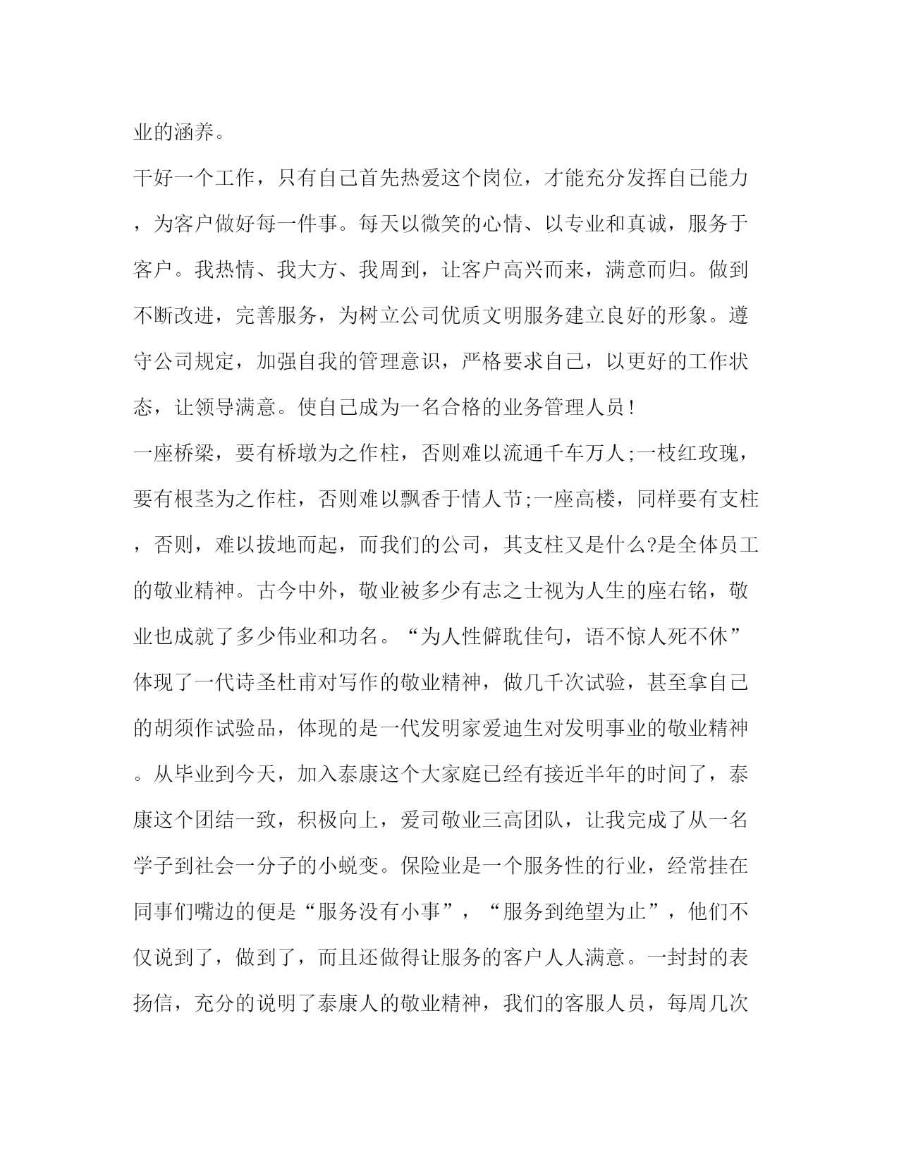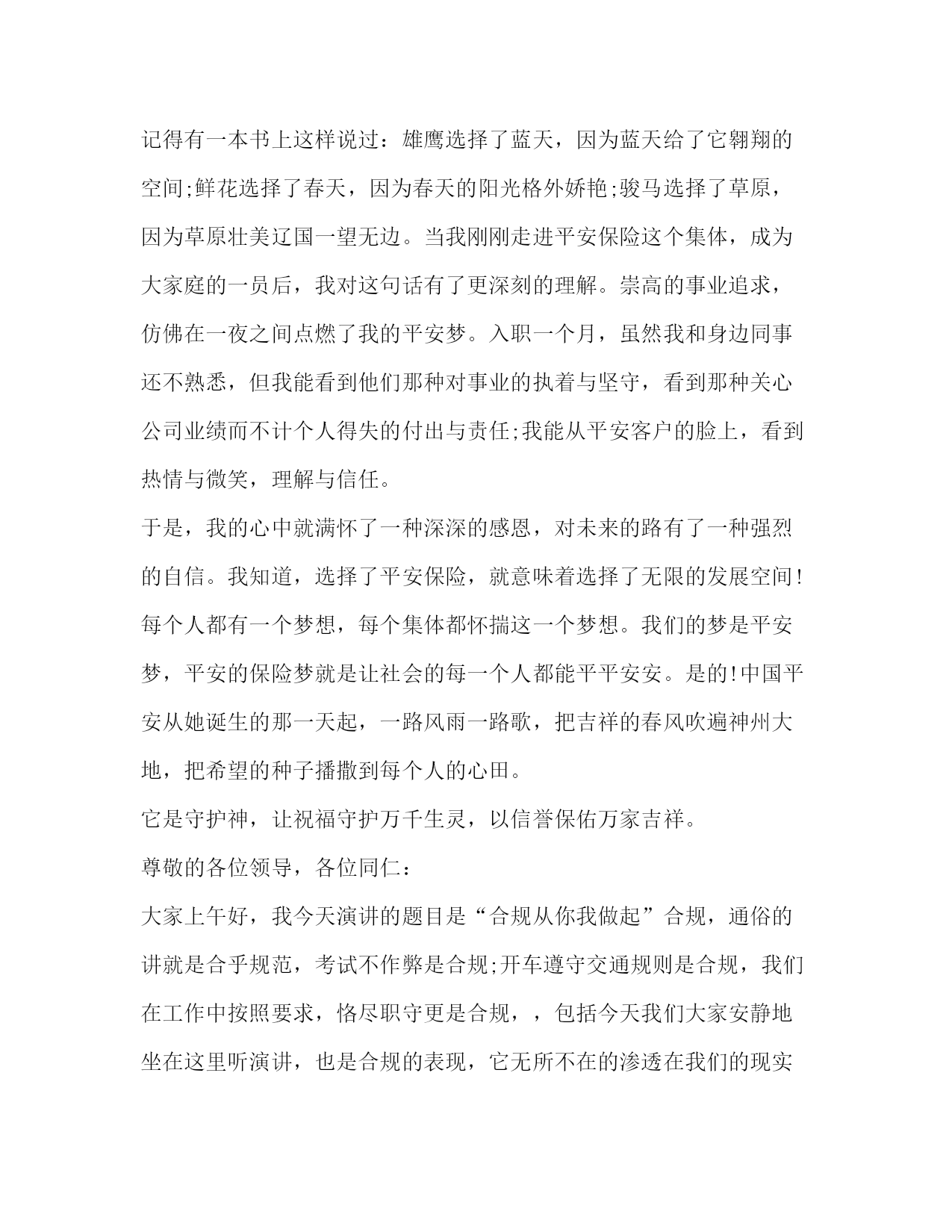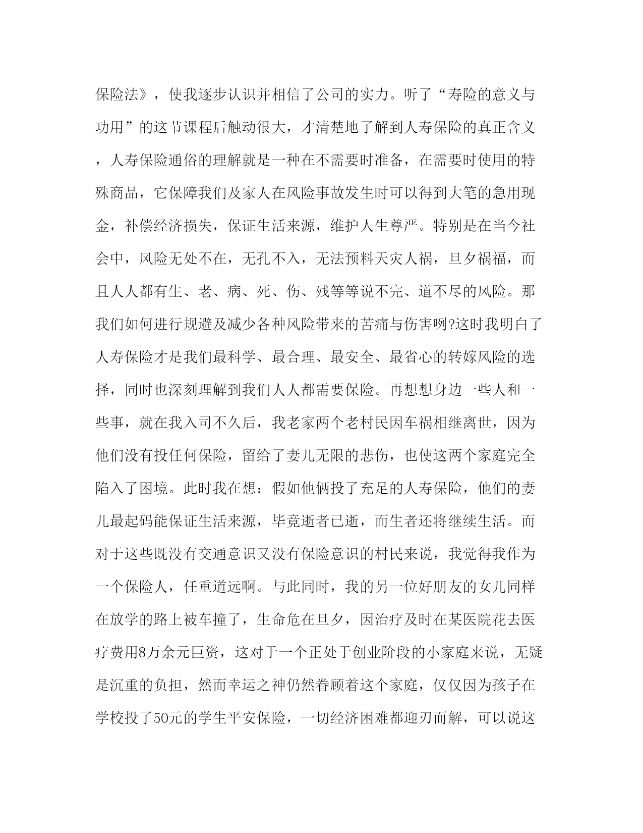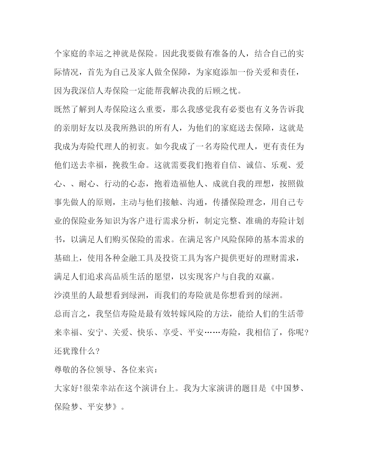 PAGE此资料由网络收集而来,如有侵权请告知上传者立即删除。资料共分享,我们负责传递知识。关于保险发言比尔盖茨说“到目前为止,我没有发现有哪一种方法比购买人寿保险更能有效地解决企业的医疗财务问题”。以下是小编为大家整理的保险发言,供大家参考学习。我一直在等待,等待一个邀约,这本是很多年以前该奔赴的约会,却姗姗来迟。这是一次迟到的相约,我的等待在暮霭中沉默,岁月在静静等待中流逝,一转身,就又过了一季,转眼间,已过了二十多年;这也是一次美丽的相约,更是用智慧驱散我心中迷雾的完美邂逅。一直以来,保险之于我,是遥远而混沌的,虽然我受过高等教育。我们这一代人常被称为保险缺失的一代,在少年时代,我没有受过系统的保险知识教育,连知之甚少的保险知识也是来自于道听途说,其中更有许多歪曲和误解,更别说去购买一份有保障的保险。在生命人寿的专业学习,让我心中的疑惑如迷雾遇到阳光一样逐渐消散。在此之前,我和很多人一样,保险意识淡薄,认为自己年轻身体健康不需要保险。我参加了新人班培训,认真学习了“生命人寿”的发展历程从这个故事中我彻底顿悟了,原来我和我所有人一样,都在无意识地每年重复着这样的游戏。根据中国人生命表统计显示,中国人的年平均死亡率恰巧是千分之三!也许有人说千分之三的概率很小,因为1000人之中才只有3人。但是真正有谁敢朝自己的脑袋开枪呢?因为对每个人来说,只有两种可能:生或死。因此,每个人的概率是50%。既然这是一个逃不了的游戏,既然人生中存在着不可规避的风险,我为什么不及早做准备呢?我明白,天晴的时侯修房子的人,才是真正的智者。就像胡适先生说的:“保险的意义只是今日作明日的准备,生时作死时的准备,父母作儿女的准备,儿女小时作儿女长大的准备,如此而已!”用通俗的话说人寿保险就是一种在不需要时准备,在需要时使用的特殊商品,在风险事故发生时,能保障我们和家人,可以得到大笔的急用现金,补偿经济损失,保证生活来源,维护人生尊严。思想的升华促成我心态的转变,让我真正地投入到保险事业当中来,拉开了与吉祥三宝相约的序幕。吉祥三宝”的名字源于佛典《吉祥经》中最为上乘的部分。“奉养父母亲,爱护妻与子,从业要无害,是为最吉祥.”其中《吉祥经》中提到父辈爱、妻子爱及儿女爱,被视为人生三宝。吉祥三宝作为全世界第一张开光保单,以社会、公司、客户吉祥,以父母、妻子、儿女吉祥,完美诠释《吉祥经》及人生三宝的内涵。“吉祥三宝,大爱无疆”,客户每购买一张“吉祥三宝”保单,生命人寿将代客户捐赠10元给玉树灾区。吉祥三宝,它集吉祥与爱心一体,给人们带来平安和祥和,更是融入了万千人士的爱心和希望,它如此珍贵与美好,怎能让我不对它充满期待?怎能不让我激情澎湃?“吉祥三宝”采用当前市场上先进的保额分红方式,同时更注重保障功能,特设双倍人身保障,另外,吉祥三宝还配属了大病额外给付特别保障责任。在客户不幸患大病享受高额赔付后,主险责任继续有效,不影响客户理财收益及意外保障。真正实现了生命人寿“以人为本”的产品设计理念。我叫x,来自x区客户服务部,我今天演讲的题目是:让一线无忧。2020年2月份我入司到泰康人寿保险股份有限公司x分公司业务处理中心至今,一直从事客户服务工作。只因入司时间短,需要掌握的专业知识多。为了配合其他其他岗位工作的顺利进行,我不断的学习、不断的积累,慢慢从中学习到很多的基础业务知识,同时也提升自己面对突发疑难问题的处理手段,丰富了自己对业务处理的综合水平。提高自身素质,牢固树立优质服务的意识和高尚的职业道德,提高工作效率,以便提高业务处理技能,完善客户服务工作。我一丝不苟、认真、仔细,不让自己的工作出现任何的差错。同时,对于其它相关环节岗位的职能和工作,也要加强基础知识的掌握和认识。在面对于客户对于缴费以外的业务咨询,准确、专业的为客户排忧解难,做一名综合即专业的客服人员。在做好基础业务知识的锻炼下,培养自己爱岗敬业的涵养。干好一个工作,只有自己首先热爱这个岗位,才能充分发挥自已能力,为客户做好每一件事。每天以微笑的心情、以专业和真诚,服务于客户。我热情、我大方、我周到,让客户高兴而来,满意而归。做到不断改进,完善服务,为树立公司优质文明服务建立良好的形象。遵守公司规定,加强自我的管理意识,严格要求自己,以更好的工作状态,让领导满意。使自己成为一名合格的业务管理人员!一座桥梁,要有桥墩为之作柱,否则难以流通千车万人;一枝红玫瑰,要有根茎为之作柱,否则难以飘香于情人节;一座高楼,同样要有支柱,否则,难以拔地而起,而我们的公司,其支柱又是什么?是全体员工的敬业精神。古今中外,敬业被多少有志之士视为人生的座右铭,敬业也成就了多少伟业和功名。“为人性僻耽佳句,语不惊人死不休”体现了一代诗圣杜甫对写作的敬业精神,做几千次试验,甚至拿自己