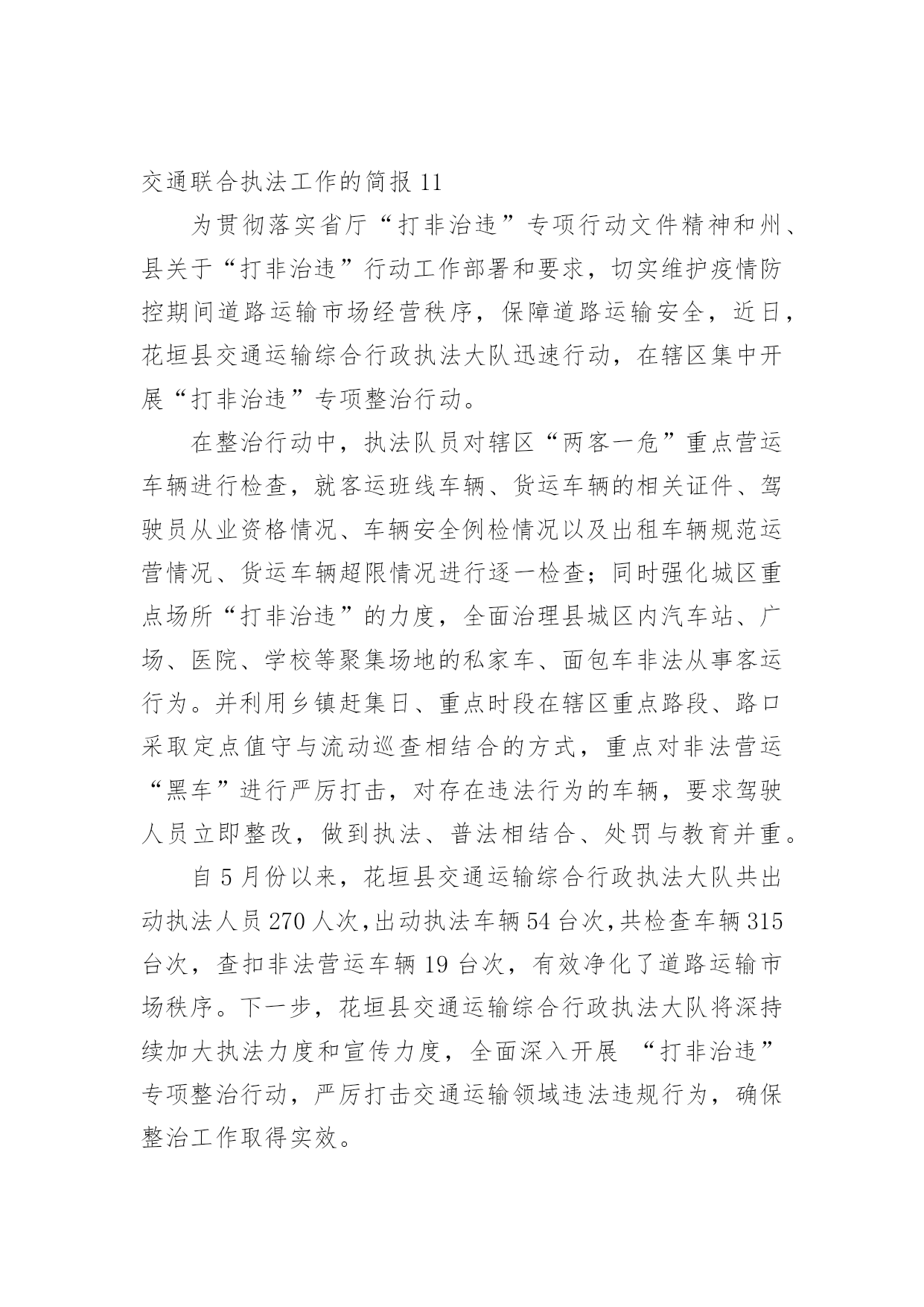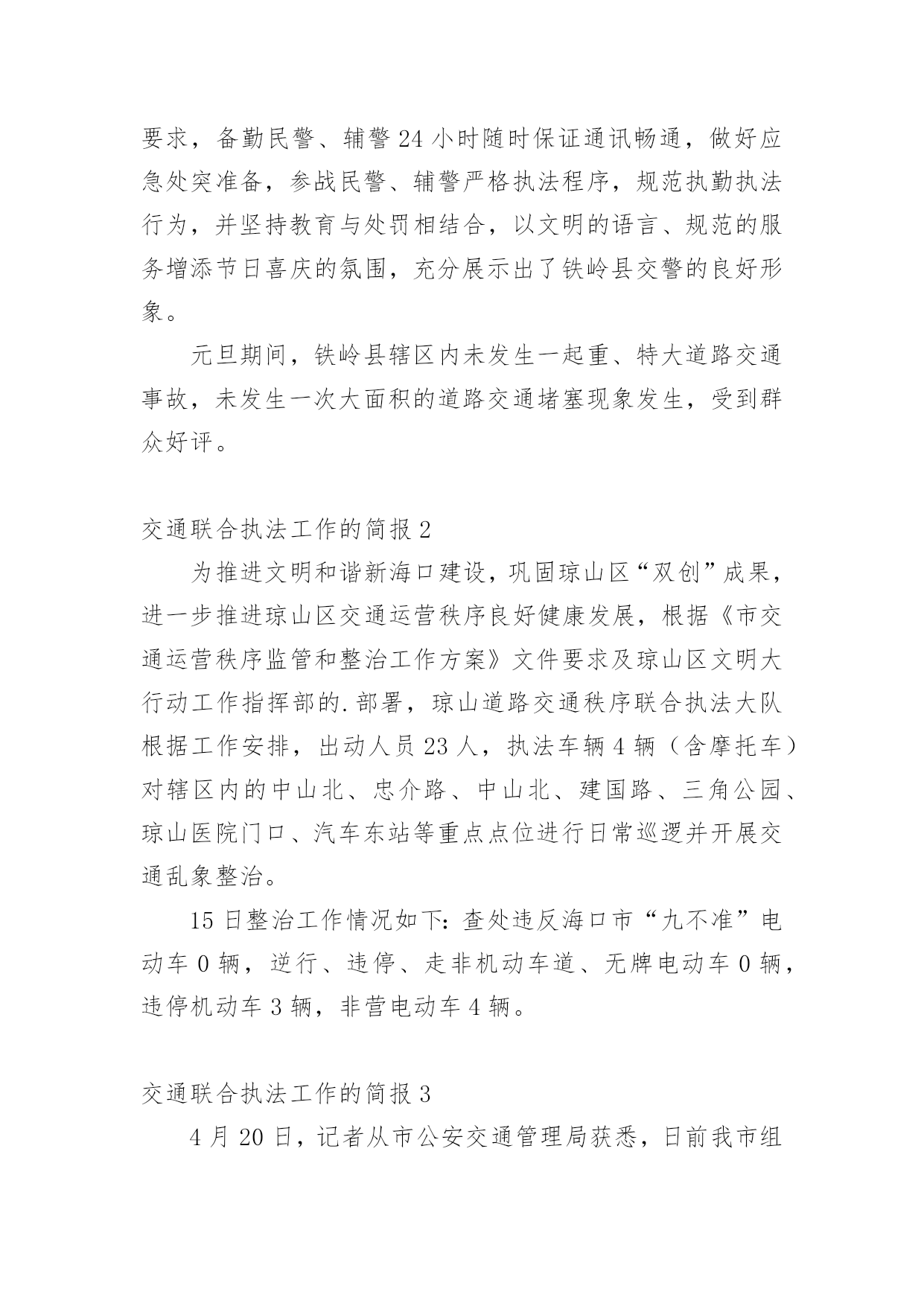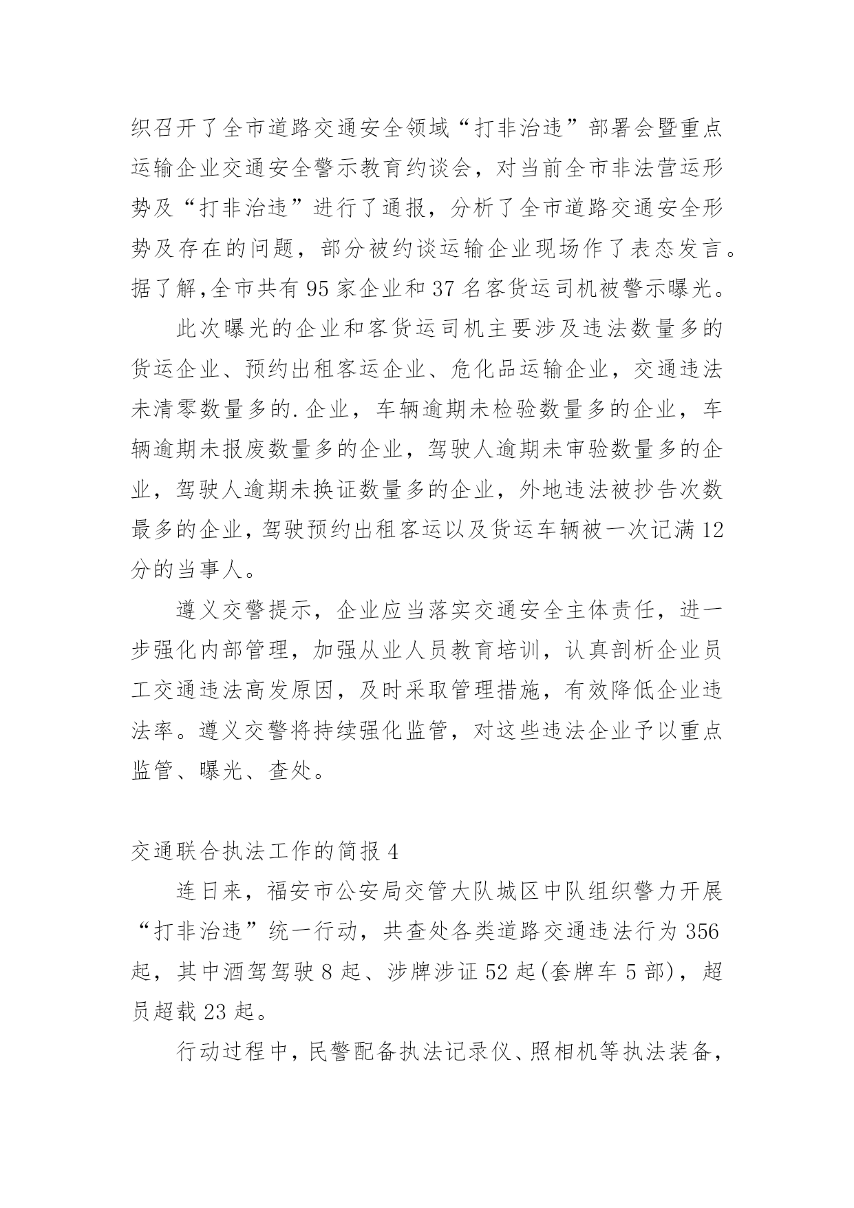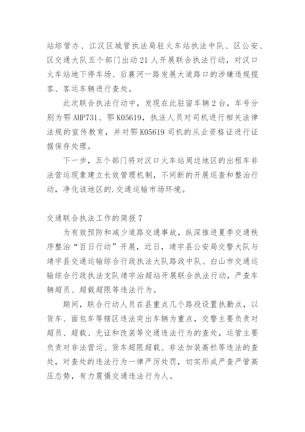 交通联合执法工作的简报交通联合执法工作的简报范文(通用43篇)在日复一日的学习、工作或生活中,许多人对一些广为流传的简报都不陌生吧,简报的种类尽管很多,但其结构却不无共同之处,一般都包括报头、标题、正文和报尾四个部分。究竟什么样的简报才是好的简报呢?下面是小编收集整理的交通联合执法工作的简报范文(通用43篇),希望能够帮助到大家。交通联合执法工作的简报120xx年元旦期间,铁岭县交警大队抽调警力,合理部署,圆满完成节日期间道路交通安保工作,给辖区群众创造一个安全、畅通的道路交通环境。铁岭县交警大队结合辖区道路交通通行的实际情况,采取路面疏导和巡逻管控的勤务模式,把道路交通安全管理重点放在辖区国道102线、省道106沈环线、202铁长线、新调线等车流量大的重点路段,加强道路交通的管控力度和疏导力度,确保辖区道路安全畅通,严防长时间、大面积的道路交通堵塞现象发生。铁岭县交警大队在加强路面巡逻管控的同时,严查酒后驾驶、无牌无证上路行驶、超员、超速行驶等严重交通违法行为,严格做到发现一起、严查一起,及时消除安全隐患,确保了辖区道路交通安全畅通。节日期间,铁岭县交警大队严格落实三分之一值班备勤要求,备勤民警、辅警24小时随时保证通讯畅通,做好应急处突准备,参战民警、辅警严格执法程序,规范执勤执法行为,并坚持教育与处罚相结合,以文明的语言、规范的服务增添节日喜庆的氛围,充分展示出了铁岭县交警的良好形象。元旦期间,铁岭县辖区内未发生一起重、特大道路交通事故,未发生一次大面积的道路交通堵塞现象发生,受到群众好评。交通联合执法工作的简报2为推进文明和谐新海口建设,巩固琼山区“双创”成果,进一步推进琼山区交通运营秩序良好健康发展,根据《市交通运营秩序监管和整治工作方案》文件要求及琼山区文明大行动工作指挥部的.部署,琼山道路交通秩序联合执法大队根据工作安排,出动人员23人,执法车辆4辆(含摩托车)对辖区内的中山北、忠介路、中山北、建国路、三角公园、琼山医院门口、汽车东站等重点点位进行日常巡逻并开展交通乱象整治。15日整治工作情况如下:查处违反海口市“九不准”电动车0辆,逆行、违停、走非机动车道、无牌电动车0辆,违停机动车3辆,非营电动车4辆。交通联合执法工作的简报34月20日,记者从市公安交通管理局获悉,日前我市组织召开了全市道路交通安全领域“打非治违”部署会暨重点运输企业交通安全警示教育约谈会,对当前全市非法营运形势及“打非治违”进行了通报,分析了全市道路交通安全形势及存在的问题,部分被约谈运输企业现场作了表态发言。据了解,全市共有95家企业和37名客货运司机被警示曝光。此次曝光的企业和客货运司机主要涉及违法数量多的货运企业、预约出租客运企业、危化品运输企业,交通违法未清零数量多的.企业,车辆逾期未检验数量多的企业,车辆逾期未报废数量多的企业,驾驶人逾期未审验数量多的企业,驾驶人逾期未换证数量多的企业,外地违法被抄告次数最多的企业,驾驶预约出租客运以及货运车辆被一次记满12分的当事人。遵义交警提示,企业应当落实交通安全主体责任,进一步强化内部管理,加强从业人员教育培训,认真剖析企业员工交通违法高发原因,及时采取管理措施,有效降低企业违法率。遵义交警将持续强化监管,对这些违法企业予以重点监管、曝光、查处。交通联合执法工作的简报4连日来,福安市公安局交管大队城区中队组织警力开展“打非治违”统一行动,共查处各类道路交通违法行为356起,其中酒驾驾驶8起、涉牌涉证52起(套牌车5部),超员超载23起。行动过程中,民警配备执法记录仪、照相机等执法装备,根据使用伪造、变造机动车牌证等车辆上路行驶的规律和特点,白天加强对城区三横三纵路段的管控,加强对居民小区、公共停车场、路侧停车位、背街小巷等区域的车辆清查,严格落实“六必查”:号牌缺少或损坏必查、车和牌新旧不符必查、非本省籍必查、遮挡或污损号牌必查、无牌无证必查、不按规定安装号牌必查。夜间在天马山脚下设置临时检查点,严格检查过往车辆。交通联合执法工作的简报5近段时间以来,分宜辖区强阵雨、雷雨天气频发,路面湿滑极易引发交通事故。为确保汛期辖区道路交通秩序的安全、有序、畅通,有效预防重特大道路交通事故的发生,分宜大队采取五个进一步举措,不断完善恶劣天气条件下的事故预防工作,全力保障辖区道路交通安全、畅通。一、进一步强化应急组织领导。进一步提高汛期道路交通事故预防工作认识,针对道路可能因恶劣天气造成的堵塞或中断等情况,制定完善了相应的交通疏导和绕行分流预案,避免因准备不充分和处置不当造成大量车辆和人员长时间滞留;同时,加强与气象部门、交通等部门联系,建立汛期信息预警通报机制,及时掌握气象变化信息。二、进一步强化路面巡逻管控。坚持以雨为令、降雨到岗,最大限度的组织警力上路执勤,全面加强城区各拥堵路段的指挥疏导,特