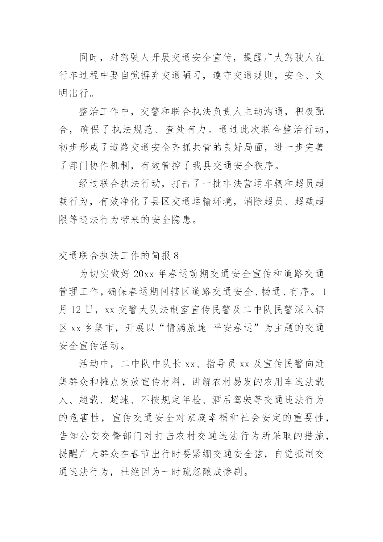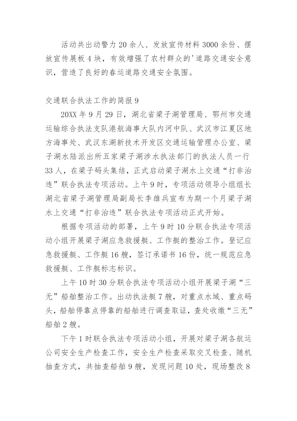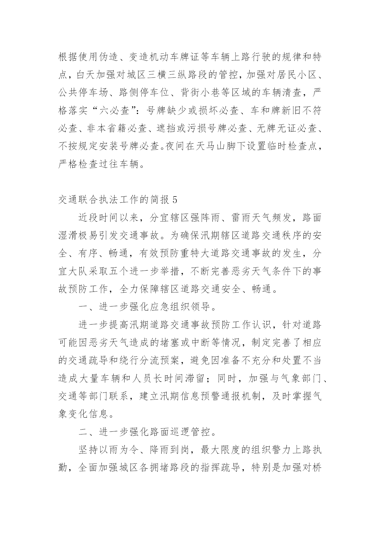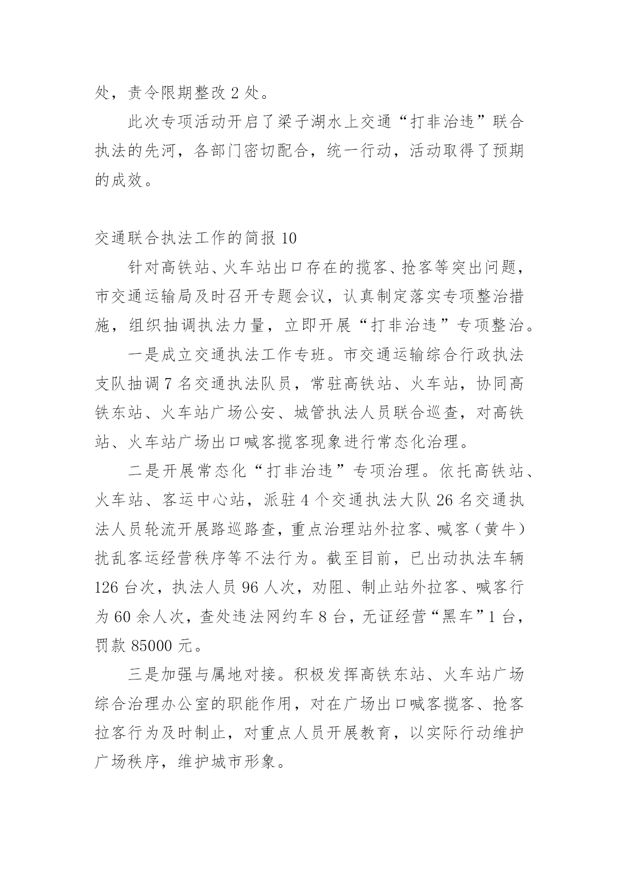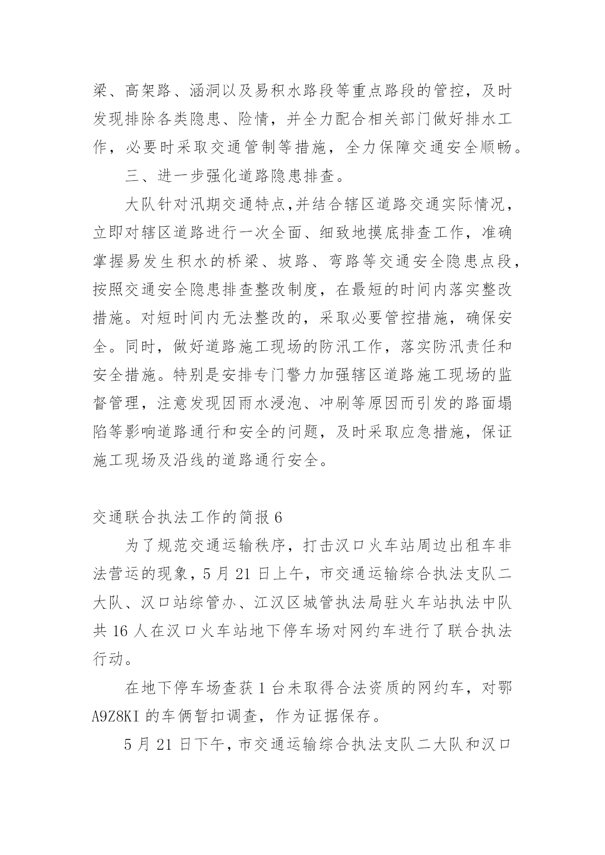 交通联合执法工作的简报交通联合执法工作的简报范文(通用43篇)在日复一日的学习、工作或生活中,许多人对一些广为流传的简报都不陌生吧,简报的种类尽管很多,但其结构却不无共同之处,一般都包括报头、标题、正文和报尾四个部分。究竟什么样的简报才是好的简报呢?下面是小编收集整理的交通联合执法工作的简报范文(通用43篇),希望能够帮助到大家。交通联合执法工作的简报120xx年元旦期间,铁岭县交警大队抽调警力,合理部署,圆满完成节日期间道路交通安保工作,给辖区群众创造一个安全、畅通的道路交通环境。铁岭县交警大队结合辖区道路交通通行的实际情况,采取路面疏导和巡逻管控的勤务模式,把道路交通安全管理重点放在辖区国道102线、省道106沈环线、202铁长线、新调线等车流量大的重点路段,加强道路交通的管控力度和疏导力度,确保辖区道路安全畅通,严防长时间、大面积的道路交通堵塞现象发生。铁岭县交警大队在加强路面巡逻管控的同时,严查酒后驾驶、无牌无证上路行驶、超员、超速行驶等严重交通违法行为,严格做到发现一起、严查一起,及时消除安全隐患,确保了辖区道路交通安全畅通。节日期间,铁岭县交警大队严格落实三分之一值班备勤要求,备勤民警、辅警24小时随时保证通讯畅通,做好应急处突准备,参战民警、辅警严格执法程序,规范执勤执法行为,并坚持教育与处罚相结合,以文明的语言、规范的服务增添节日喜庆的氛围,充分展示出了铁岭县交警的良好形象。元旦期间,铁岭县辖区内未发生一起重、特大道路交通事故,未发生一次大面积的道路交通堵塞现象发生,受到群众好评。交通联合执法工作的简报2为推进文明和谐新海口建设,巩固琼山区“双创”成果,进一步推进琼山区交通运营秩序良好健康发展,根据《市交通运营秩序监管和整治工作方案》文件要求及琼山区文明大行动工作指挥部的.部署,琼山道路交通秩序联合执法大队根据工作安排,出动人员23人,执法车辆4辆(含摩托车)对辖区内的中山北、忠介路、中山北、建国路、三角公园、琼山医院门口、汽车东站等重点点位进行日常巡逻并开展交通乱象整治。15日整治工作情况如下:查处违反海口市“九不准”电动车0辆,逆行、违停、走非机动车道、无牌电动车0辆,违停机动车3辆,非营电动车4辆。交通联合执法工作的简报34月20日,记者从市公安交通管理局获悉,日前我市组织召开了全市道路交通安全领域“打非治违”部署会暨重点运输企业交通安全警示教育约谈会,对当前全市非法营运形势及“打非治违”进行了通报,分析了全市道路交通安全形势及存在的问题,部分被约谈运输企业现场作了表态发言。据了解,全市共有95家企业和37名客货运司机被警示曝光。此次曝光的企业和客货运司机主要涉及违法数量多的货运企业、预约出租客运企业、危化品运输企业,交通违法未清零数量多的.企业,车辆逾期未检验数量多的企业,车辆逾期未报废数量多的企业,驾驶人逾期未审验数量多的企业,驾驶人逾期未换证数量多的企业,外地违法被抄告次数最多的企业,驾驶预约出租客运以及货运车辆被一次记满12分的当事人。遵义交警提示,企业应当落实交通安全主体责任,进一步强化内部管理,加强从业人员教育培训,认真剖析企业员工交通违法高发原因,及时采取管理措施,有效降低企业违法率。遵义交警将持续强化监管,对这些违法企业予以重点监管、曝光、查处。交通联合执法工作的简报4连日来,福安市公安局交管大队城区中队组织警力开展“打非治违”统一行动,共查处各类道路交通违法行为356起,其中酒驾驾驶8起、涉牌涉证52起(套牌车5部),超员超载23起。行动过程中,民警配备执法记录仪、照相机等执法装备,根据使用伪造、变造机动车牌证等车辆上路行驶的规律和特点,白天加强对城区三横三纵路段的管控,加强对居民小区、公共停车场、路侧停车位、背街小巷等区域的车辆清查,严格落实“六必查”:号牌缺少或损坏必查、车和牌新旧不符必查、非本省籍必查、遮挡或污损号牌必查、无牌无证必查、不按规定安装号牌必查。夜间在天马山脚下设置临时检查点,严格检查过往车辆。交通联合执法工作的简报5近段时间以来,分宜辖区强阵雨、雷雨天气频发,路面湿滑极易引发交通事故。为确保汛期辖区道路交通秩序的安全、有序、畅通,有效预防重特大道路交通事故的发生,分宜大队采取五个进一步举措,不断完善恶劣天气条件下的事故预防工作,全力保障辖区道路交通安全、畅通。一、进一步强化应急组织领导。进一步提高汛期道路交通事故预防工作认识,针对道路可能因恶劣天气造成的堵塞或中断等情况,制定完善了相应的交通疏导和绕行分流预案,避免因准备不充分和处置不当造成大量车辆和人员长时间滞留;同时,加强与气象部门、交通等部门联系,建立汛期信息预警通报机制,及时掌握气象变化信息。二、进一步强化路面巡逻管控。坚持以雨为令、降雨到岗,最大限度的组织警力上路执勤,全面加强城区各拥堵路段的指挥疏导,特