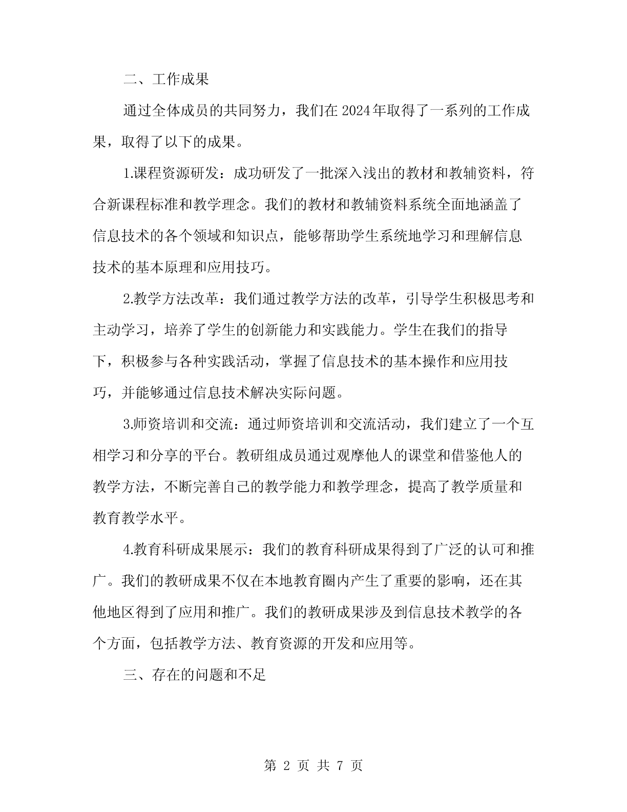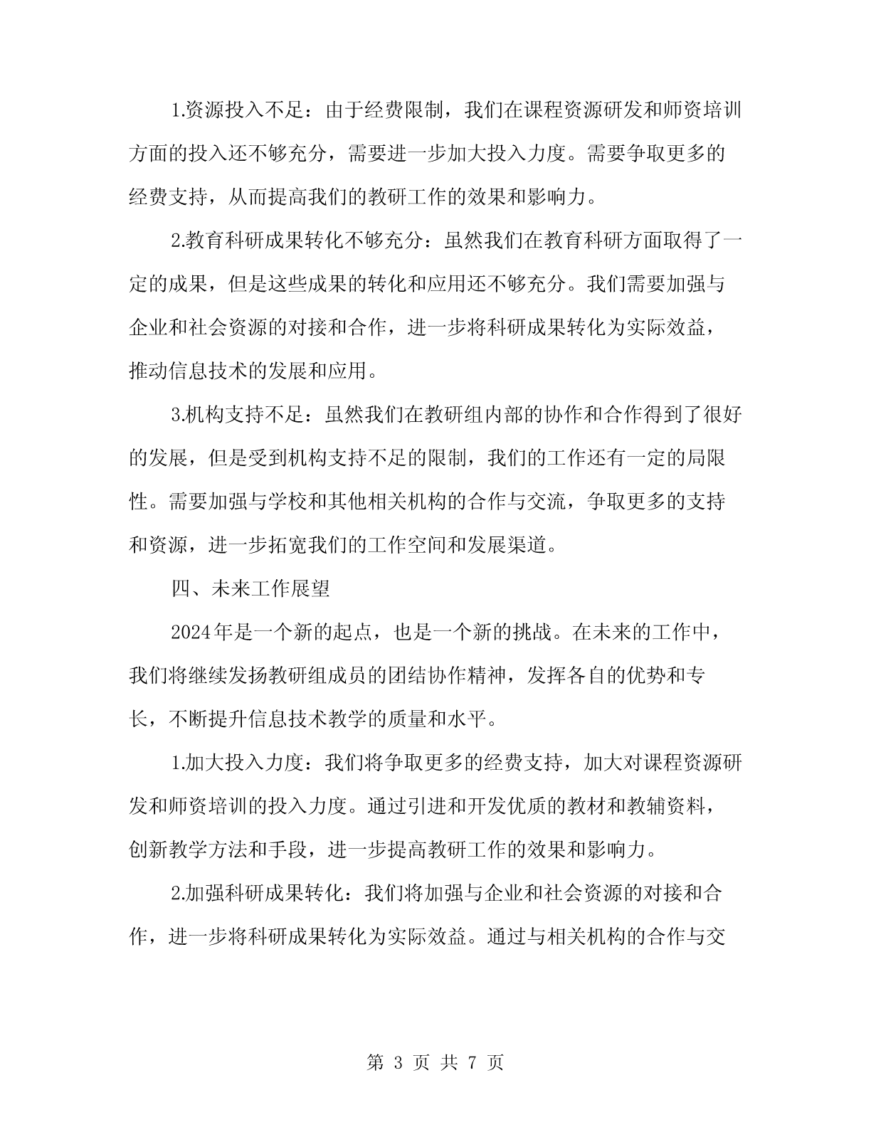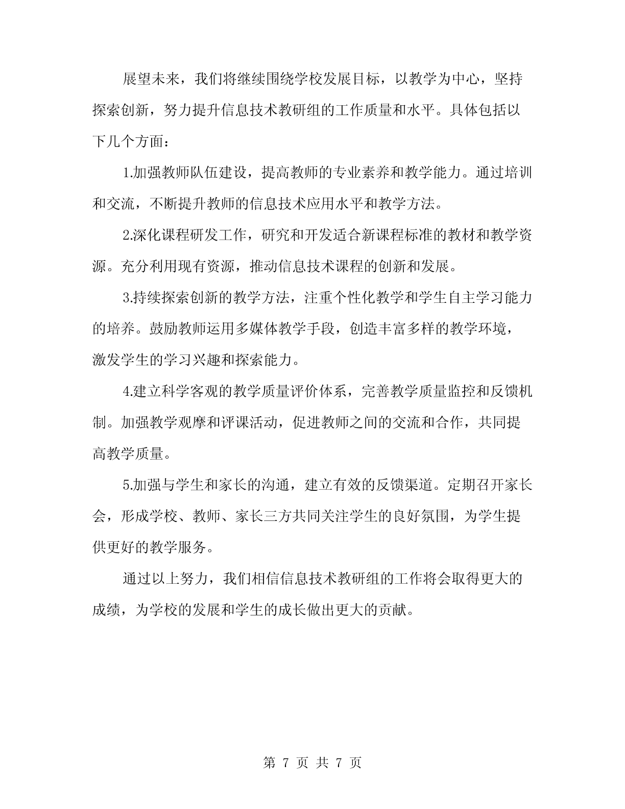 2024年信息技术教研组工作总结一、工作回顾2024年是我们信息技术教研组的工作的延续和发展之年。在这一年里,教研组的成员紧密团结一致,充分发挥各自的专长和优势,充满激情和创造力地开展了一系列有意义的工作。1.课程资源研发:通过精心设计和修改现有的课程资源,我们不断提升教学质量,深化学生对信息技术理论知识的理解和掌握。我们根据学生的实际需求和未来发展趋势,针对性地研发了一批全新的教材和教辅资料,使之更加贴合时代发展的需要。2.教学方法改革:在教学过程中,我们积极尝试创新的教学方法,提倡学生参与式的授课模式,倡导学生自主思考和动手实践。通过引导学生积极思考和讨论,我们鼓励学生发现问题、解决问题的能力,培养他们的创新意识和团队合作精神。3.师资培训和交流:为了提升教研组成员的教学能力和教育教学水平,我们组织了一系列的师资培训和教学交流活动。通过请相关领域的专家做讲座、邀请同行进行课堂观摩和反思,我们不断吸取他人的经验和教训,不断完善自身的教学方法和教学理念。4.教育科研成果展示:为了激发教研组成员的科研激情和推动教育科研的发展,我们组织了一系列的科研论文撰写和成果展示活动。通过提供科研经费支持和指导,我们鼓励教研组成员积极参与科研项目,提升自身的科研能力,促进科研成果的转化和应用。二、工作成果通过全体成员的共同努力,我们在2024年取得了一系列的工作成果,取得了以下的成果。1.课程资源研发:成功研发了一批深入浅出的教材和教辅资料,符合新课程标准和教学理念。我们的教材和教辅资料系统全面地涵盖了信息技术的各个领域和知识点,能够帮助学生系统地学习和理解信息技术的基本原理和应用技巧。2.教学方法改革:我们通过教学方法的改革,引导学生积极思考和主动学习,培养了学生的创新能力和实践能力。学生在我们的指导下,积极参与各种实践活动,掌握了信息技术的基本操作和应用技巧,并能够通过信息技术解决实际问题。3.师资培训和交流:通过师资培训和交流活动,我们建立了一个互相学习和分享的平台。教研组成员通过观摩他人的课堂和借鉴他人的教学方法,不断完善自己的教学能力和教学理念,提高了教学质量和教育教学水平。4.教育科研成果展示:我们的教育科研成果得到了广泛的认可和推广。我们的教研成果不仅在本地教育圈内产生了重要的影响,还在其他地区得到了应用和推广。我们的教研成果涉及到信息技术教学的各个方面,包括教学方法、教育资源的开发和应用等。三、存在的问题和不足1.资源投入不足:由于经费限制,我们在课程资源研发和师资培训方面的投入还不够充分,需要进一步加大投入力度。需要争取更多的经费支持,从而提高我们的教研工作的效果和影响力。2.教育科研成果转化不够充分:虽然我们在教育科研方面取得了一定的成果,但是这些成果的转化和应用还不够充分。我们需要加强与企业和社会资源的对接和合作,进一步将科研成果转化为实际效益,推动信息技术的发展和应用。3.机构支持不足:虽然我们在教研组内部的协作和合作得到了很好的发展,但是受到机构支持不足的限制,我们的工作还有一定的局限性。需要加强与学校和其他相关机构的合作与交流,争取更多的支持和资源,进一步拓宽我们的工作空间和发展渠道。四、未来工作展望2024年是一个新的起点,也是一个新的挑战。在未来的工作中,我们将继续发扬教研组成员的团结协作精神,发挥各自的优势和专长,不断提升信息技术教学的质量和水平。1.加大投入力度:我们将争取更多的经费支持,加大对课程资源研发和师资培训的投入力度。通过引进和开发优质的教材和教辅资料,创新教学方法和手段,进一步提高教研工作的效果和影响力。2.加强科研成果转化:我们将加强与企业和社会资源的对接和合作,进一步将科研成果转化为实际效益。通过与相关机构的合作与交流,我们将促进信息技术的发展和应用,推动信息技术在教育领域的创新和进步。3.拓宽发展渠道:我们将加强与学校和其他相关机构的合作与交流,争取更多的支持和资源。通过组织各类教研活动和展示,我们将提高信息技术教育的影响力和知名度,为学生的信息技术学习和发展提供更好的支持和保障。总之,2024年是我们信息技术教研组工作的一个重要年份。通过全体成员的共同努力和合作,我们在工作中取得了丰硕的成果,但同时也存在一些问题和不足。在未来的工作中,我们将进一步加大投入力度,加强科研成果的转化,拓宽发展渠道,努力为学生的信息技术学习和发展提供更好的支持和服务。相信在我们的不断努力下,信息技术教育必将取