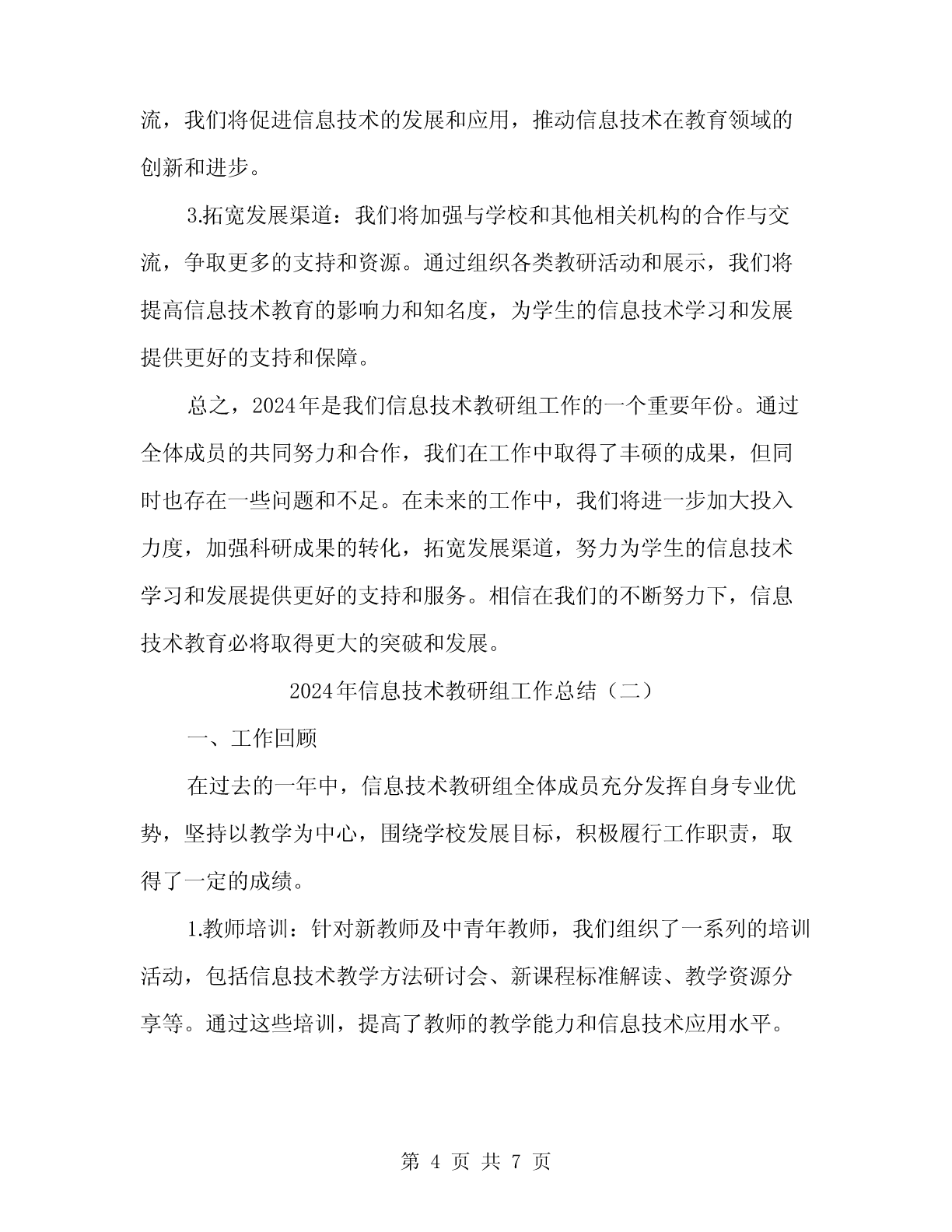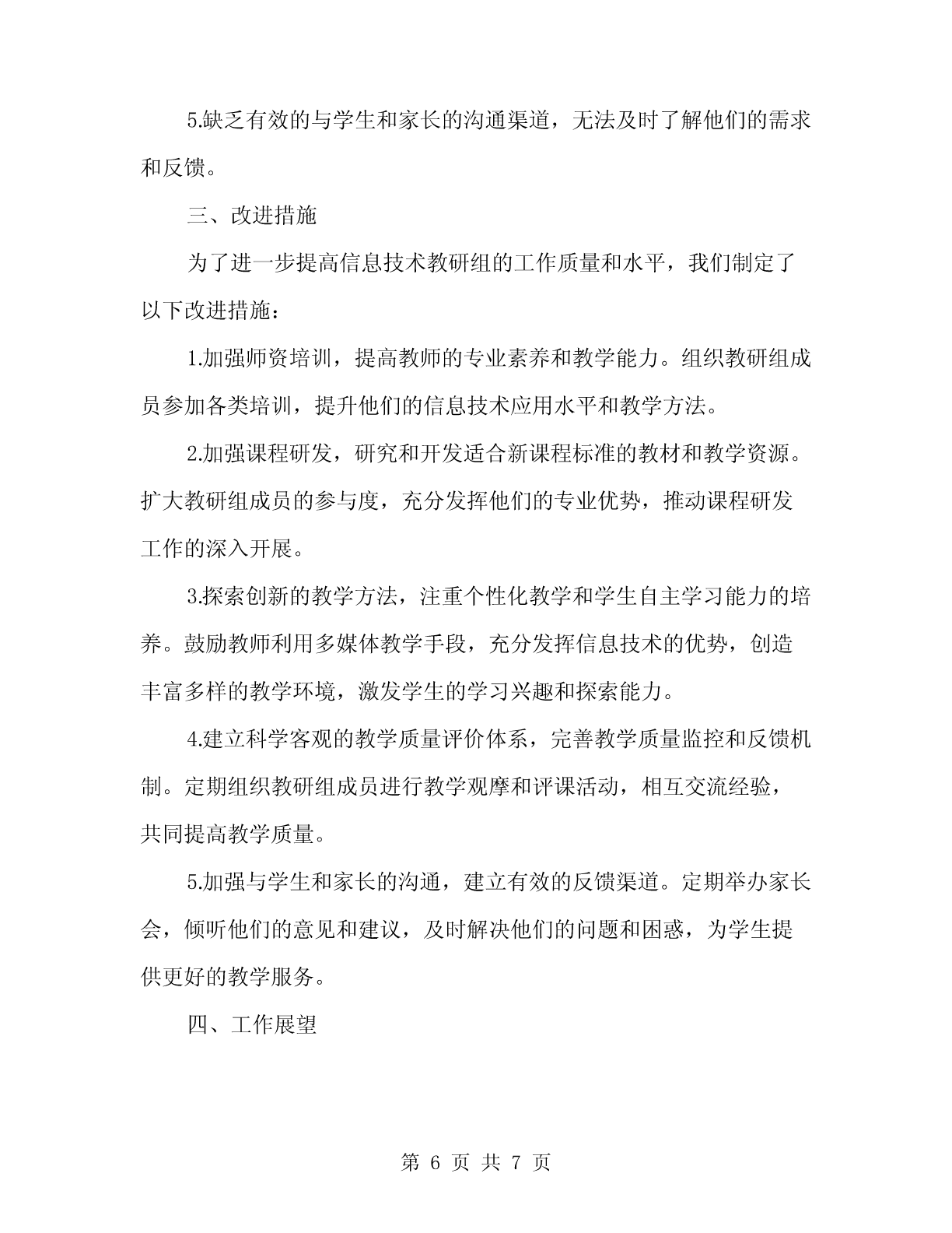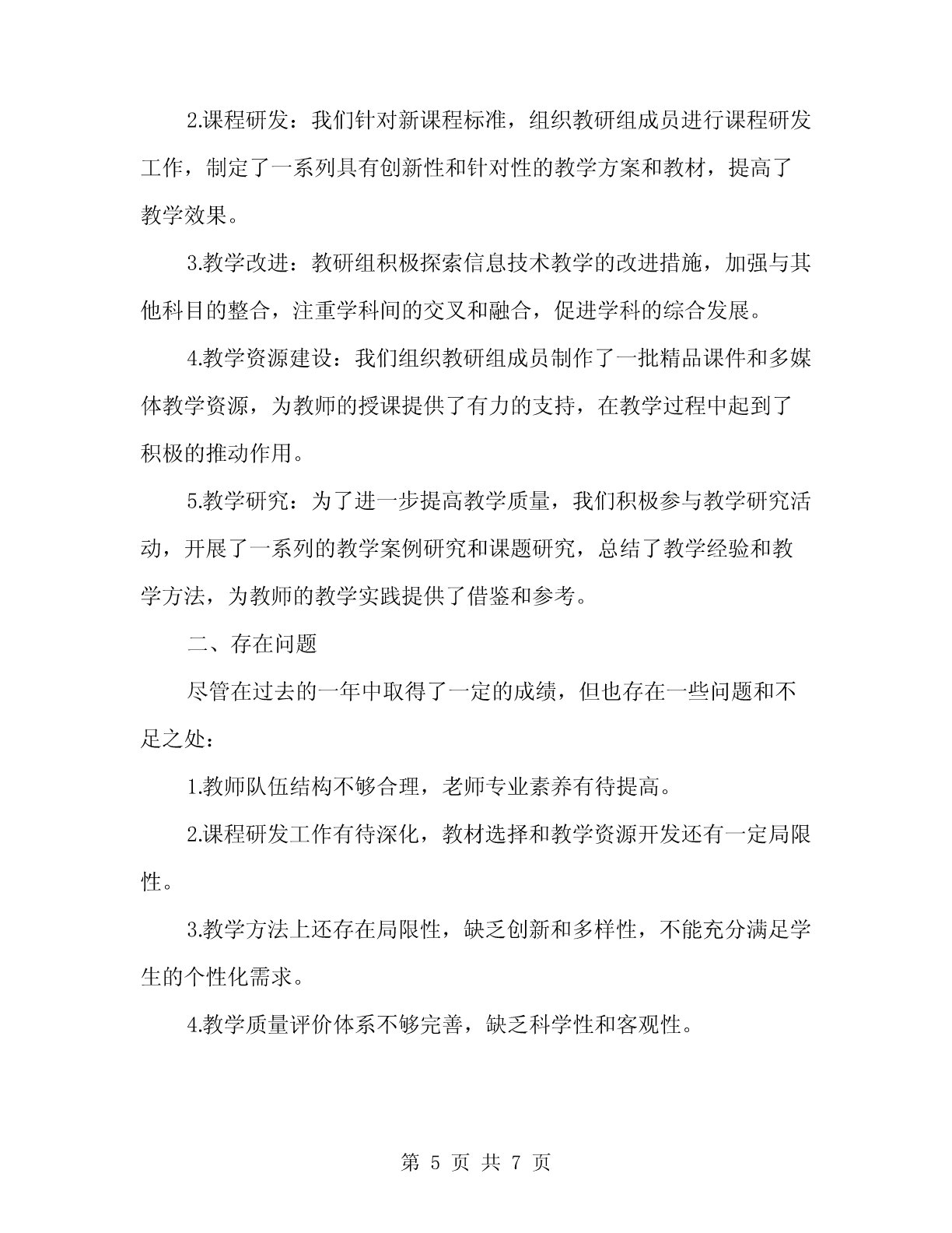 2024年信息技术教研组工作总结一、工作回顾2024年是我们信息技术教研组的工作的延续和发展之年。在这一年里,教研组的成员紧密团结一致,充分发挥各自的专长和优势,充满激情和创造力地开展了一系列有意义的工作。1.课程资源研发:通过精心设计和修改现有的课程资源,我们不断提升教学质量,深化学生对信息技术理论知识的理解和掌握。我们根据学生的实际需求和未来发展趋势,针对性地研发了一批全新的教材和教辅资料,使之更加贴合时代发展的需要。2.教学方法改革:在教学过程中,我们积极尝试创新的教学方法,提倡学生参与式的授课模式,倡导学生自主思考和动手实践。通过引导学生积极思考和讨论,我们鼓励学生发现问题、解决问题的能力,培养他们的创新意识和团队合作精神。3.师资培训和交流:为了提升教研组成员的教学能力和教育教学水平,我们组织了一系列的师资培训和教学交流活动。通过请相关领域的专家做讲座、邀请同行进行课堂观摩和反思,我们不断吸取他人的经验和教训,不断完善自身的教学方法和教学理念。4.教育科研成果展示:为了激发教研组成员的科研激情和推动教育科研的发展,我们组织了一系列的科研论文撰写和成果展示活动。通过提供科研经费支持和指导,我们鼓励教研组成员积极参与科研项目,提升自身的科研能力,促进科研成果的转化和应用。二、工作成果通过全体成员的共同努力,我们在2024年取得了一系列的工作成果,取得了以下的成果。1.课程资源研发:成功研发了一批深入浅出的教材和教辅资料,符合新课程标准和教学理念。我们的教材和教辅资料系统全面地涵盖了信息技术的各个领域和知识点,能够帮助学生系统地学习和理解信息技术的基本原理和应用技巧。2.教学方法改革:我们通过教学方法的改革,引导学生积极思考和主动学习,培养了学生的创新能力和实践能力。学生在我们的指导下,积极参与各种实践活动,掌握了信息技术的基本操作和应用技巧,并能够通过信息技术解决实际问题。3.师资培训和交流:通过师资培训和交流活动,我们建立了一个互相学习和分享的平台。教研组成员通过观摩他人的课堂和借鉴他人的教学方法,不断完善自己的教学能力和教学理念,提高了教学质量和教育教学水平。4.教育科研成果展示:我们的教育科研成果得到了广泛的认可和推广。我们的教研成果不仅在本地教育圈内产生了重要的影响,还在其他地区得到了应用和推广。我们的教研成果涉及到信息技术教学的各个方面,包括教学方法、教育资源的开发和应用等。三、存在的问题和不足1.资源投入不足:由于经费限制,我们在课程资源研发和师资培训方面的投入还不够充分,需要进一步加大投入力度。需要争取更多的经费支持,从而提高我们的教研工作的效果和影响力。2.教育科研成果转化不够充分:虽然我们在教育科研方面取得了一定的成果,但是这些成果的转化和应用还不够充分。我们需要加强与企业和社会资源的对接和合作,进一步将科研成果转化为实际效益,推动信息技术的发展和应用。3.机构支持不足:虽然我们在教研组内部的协作和合作得到了很好的发展,但是受到机构支持不足的限制,我们的工作还有一定的局限性。需要加强与学校和其他相关机构的合作与交流,争取更多的支持和资源,进一步拓宽我们的工作空间和发展渠道。四、未来工作展望2024年是一个新的起点,也是一个新的挑战。在未来的工作中,我们将继续发扬教研组成员的团结协作精神,发挥各自的优势和专长,不断提升信息技术教学的质量和水平。1.加大投入力度:我们将争取更多的经费支持,加大对课程资源研发和师资培训的投入力度。通过引进和开发优质的教材和教辅资料,创新教学方法和手段,进一步提高教研工作的效果和影响力。2.加强科研成果转化:我们将加强与企业和社会资源的对接和合作,进一步将科研成果转化为实际效益。通过与相关机构的合作与交流,我们将促进信息技术的发展和应用,推动信息技术在教育领域的创新和进步。3.拓宽发展渠道:我们将加强与学校和其他相关机构的合作与交流,争取更多的支持和资源。通过组织各类教研活动和展示,我们将提高信息技术教育的影响力和知名度,为学生的信息技术学习和发展提供更好的支持和保障。总之,2024年是我们信息技术教研组工作的一个重要年份。通过全体成员的共同努力和合作,我们在工作中取得了丰硕的成果,但同时也存在一些问题和不足。在未来的工作中,我们将进一步加大投入力度,加强科研成果的转化,拓宽发展渠道,努力为学生的信息技术学习和发展提供更好的支持和服务。相信在我们的不断努力下,信息技术教育必将取