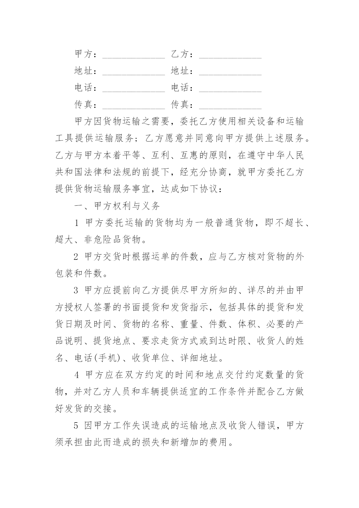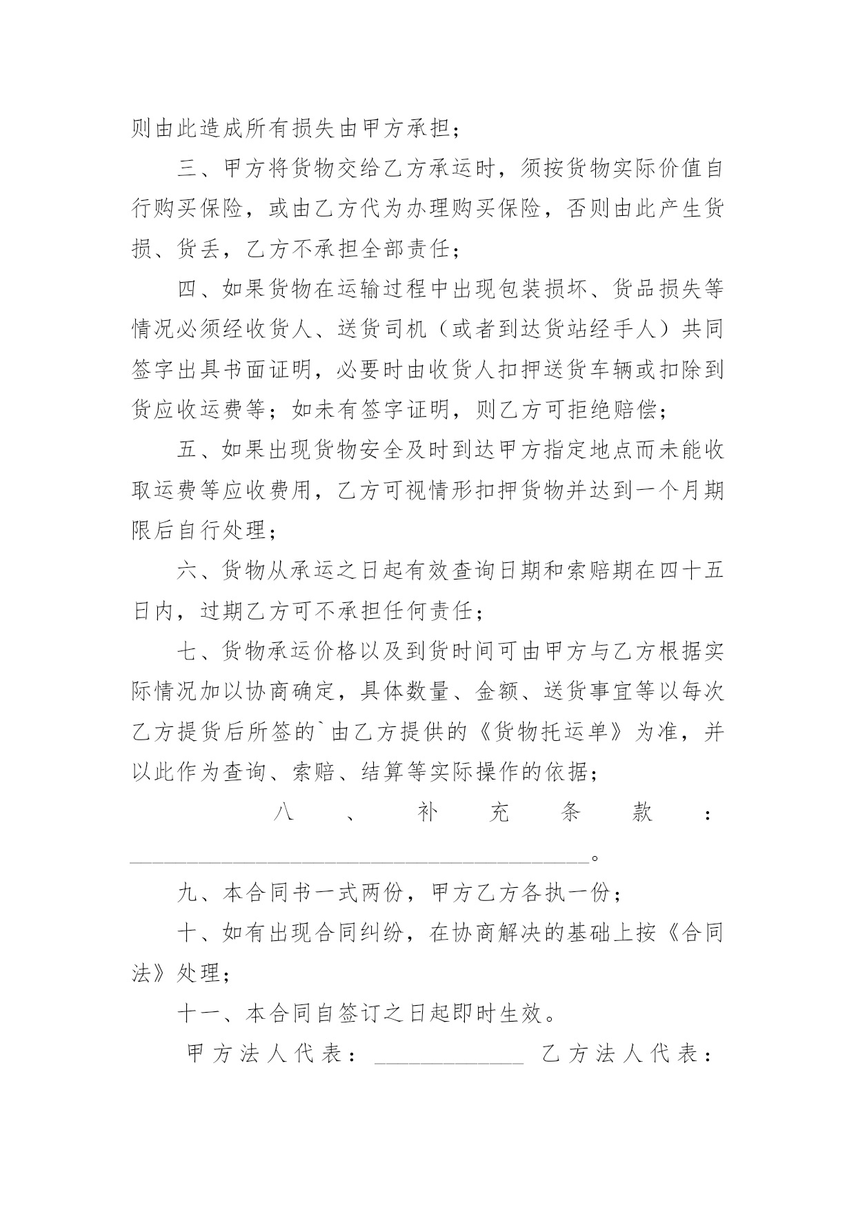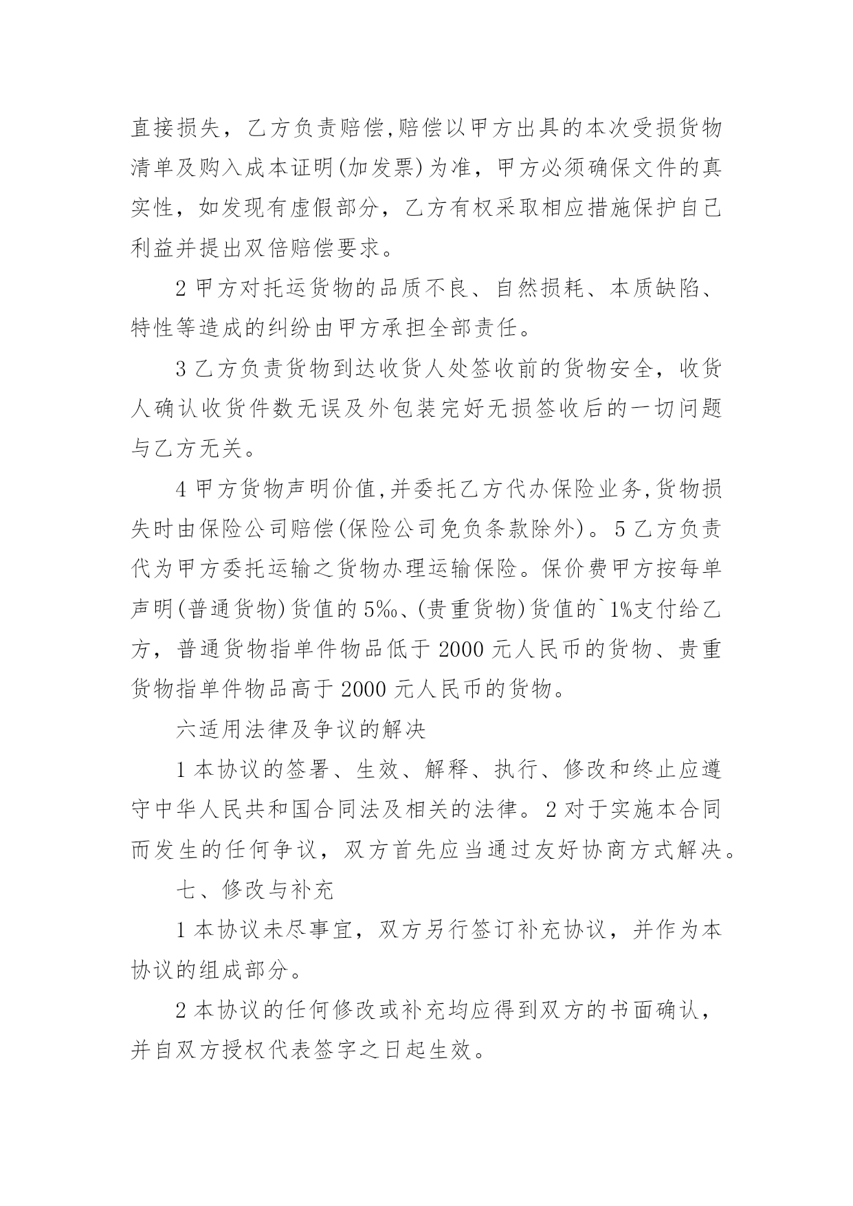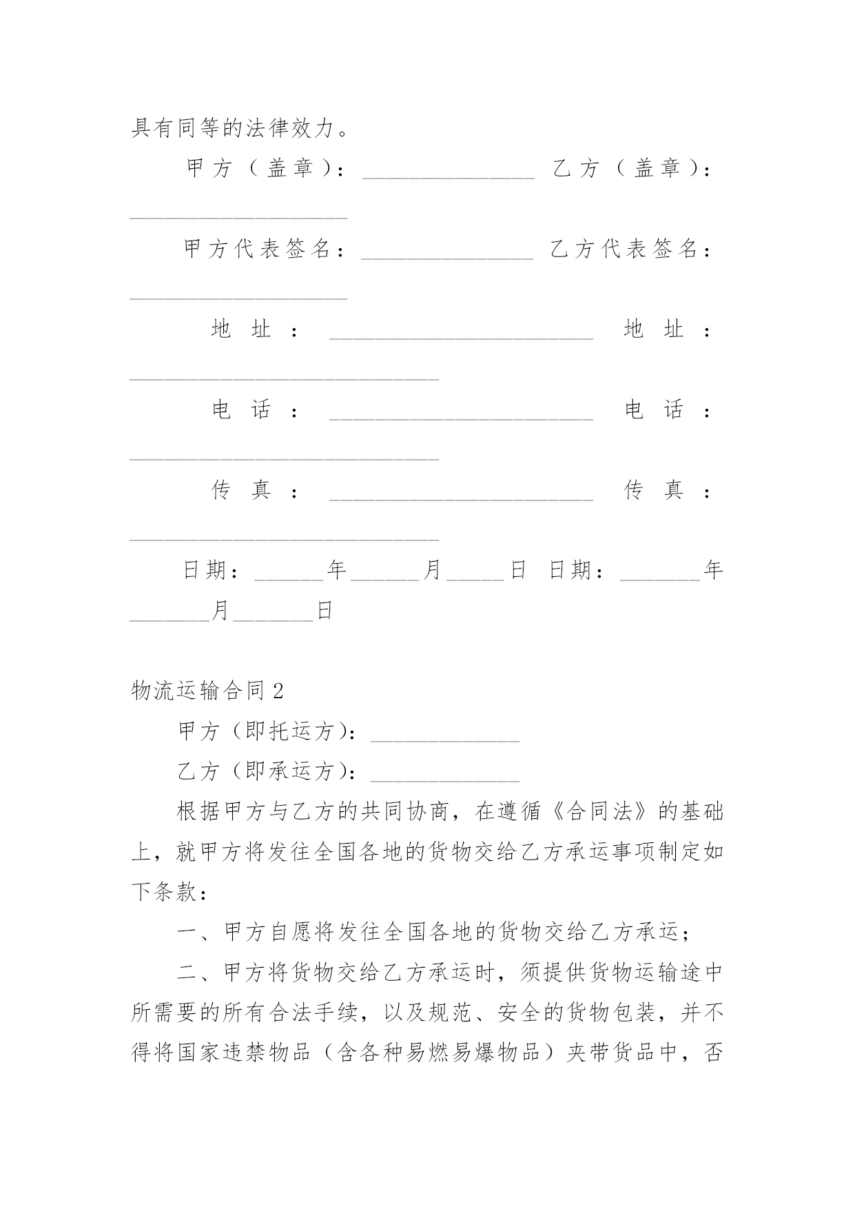 物流运输合同物流运输合同集合15篇在人民愈发重视法律的社会中,越来越多的场景和场合需要用到合同,签订合同可以明确双方当事人的权利和义务。那么制定合同书有什么需要注意的呢?下面是小编精心整理的物流运输合同,仅供参考,希望能够帮助到大家。物流运输合同1甲方:_______乙方:_______为有序地开展运输业务,更好地为运输户谋利益,甲乙双方本着“平等、自愿、协商一致”的原则,就汽车挂靠(代管)经营事宜达成如下协议:第一条:乙方自筹资金自购:乙方自愿将该车“挂靠”于甲方,交甲方代为管理经营,车辆产权归乙方所有,车辆证照所有权(管理权)归甲方。第二条:合同期内乙方不得将车转售或抵押担保,如乙方需将车辆转售,转售前必须征得甲方书面同意,并到甲方办理过户手续,向甲方交纳过户手续费。第三条:乙方车辆挂靠交甲方代管后,甲方为乙方代办理各项手续(费用乙方自付),交付乙方使用,并确保乙方货物运输的道路畅通(严禁违规、违法、违禁物品运输)。第四条:甲方收取乙方挂靠费_______元/年或代管费_______元/年,甲方力争多方联系货源,使乙方有更多的货物运输,为运输户谋取更多的利益。第五条:该车辆营运年限为国家规定的车辆营运报废期(含各种因素而提前报废),该车报废后,乙方应在_________日内将车辆牌照及其他所有证照交回甲方,车辆报废残值归乙方所有。第六条:乙方车辆在上户前,必须按照公司规定办理保险,保险费由乙方出资,甲方负责办理。该车次年保险,必须由公司统一办理,乙方按时在上年保修期前十日以前缴纳保险费用,如乙方不按国家法律、法规及公司要求缴纳保险费,其逾期期间产生的一切法律责任、经济责任及安全事故责任的费用,由乙方自行负责。第七条:该车上户后,乙方应严格按照上户的'技术参数营运,乙方不得将车辆擅自改型,如乙方自行做主改型,后果自负。第八条:乙方按时参加季检、年检,甲方负责代办有关手续,所需花费由乙方承担,逾期不参加季检、年检者,一切责任由乙方自行承担。第九条:乙方应自觉遵守国家道路交通安全规程及相关法律、法规、否则,由此而产生的一切责任由乙方自行承担。第十条:本合同经甲乙双方法定代表人委托代理人签字后,自任何一方违约,将按照合同法及相关法律、法规规定追究违约责任。第十一条:本合同一式两份,甲乙双方各执一份,双方具有同等的法律效力。甲方(盖章):_______________乙方(盖章):___________________甲方代表签名:_______________乙方代表签名:___________________地址:_______________________地址:___________________________电话:_______________________电话:___________________________传真:_______________________传真:___________________________日期:______年______月_____日日期:_______年_______月_______日物流运输合同2甲方(即托运方):_____________乙方(即承运方):_____________根据甲方与乙方的共同协商,在遵循《合同法》的基础上,就甲方将发往全国各地的货物交给乙方承运事项制定如下条款:一、甲方自愿将发往全国各地的货物交给乙方承运;二、甲方将货物交给乙方承运时,须提供货物运输途中所需要的所有合法手续,以及规范、安全的货物包装,并不得将国家违禁物品(含各种易燃易爆物品)夹带货品中,否则由此造成所有损失由甲方承担;三、甲方将货物交给乙方承运时,须按货物实际价值自行购买保险,或由乙方代为办理购买保险,否则由此产生货损、货丢,乙方不承担全部责任;四、如果货物在运输过程中出现包装损坏、货品损失等情况必须经收货人、送货司机(或者到达货站经手人)共同签字出具书面证明,必要时由收货人扣押送货车辆或扣除到货应收运费等;如未有签字证明,则乙方可拒绝赔偿;五、如果出现货物安全及时到达甲方指定地点而未能收取运费等应收费用,乙方可视情形扣押货物并达到一个月期限后自行处理;六、货物从承运之日起有效查询日期和索赔期在四十五日内,过期乙方可不承担任何责任;七、货物承运价格以及到货时间可由甲方与乙方根据实际情况加以协商确定,具体数量、金额、送货事宜等以每次乙方提货后所签的`由乙方提供的《货物托运单》为准,并以此作为查询、索赔、结算等实际操作的依据;八、补充条款:________________________________________。九、本合同书一式两份,甲方乙方各执一份;十、如有出现合同纠纷,在协商解决的基础上按《合同法》处理;十一、本合同自签订之日起即时生效。甲方法人代表:_________