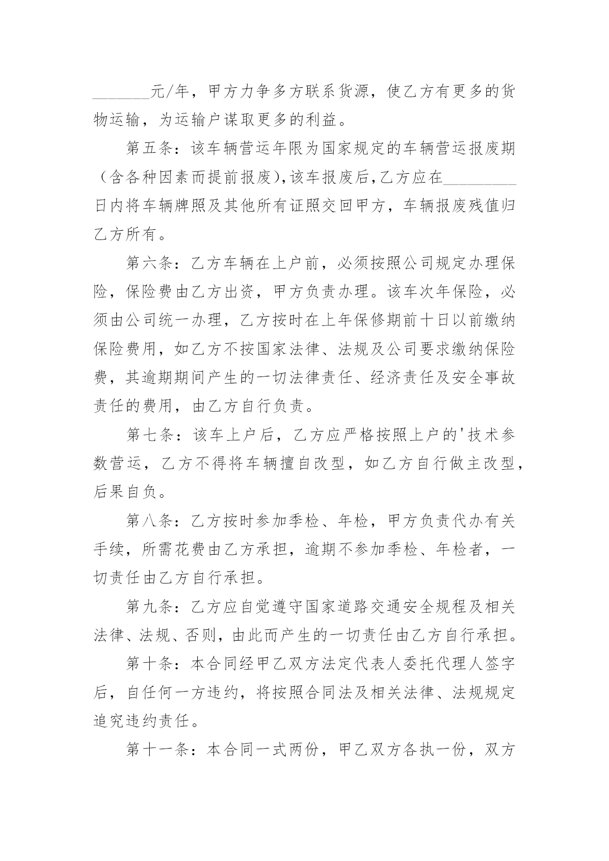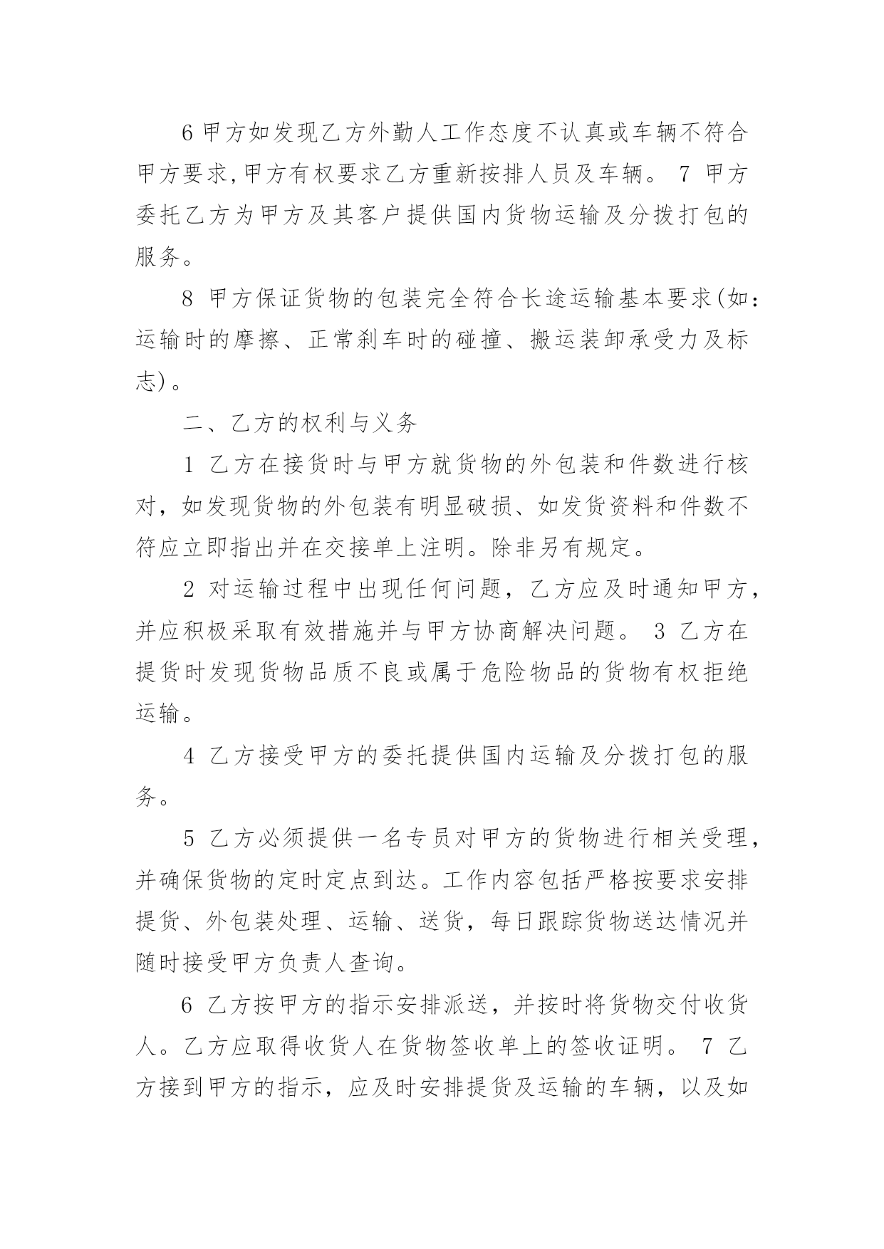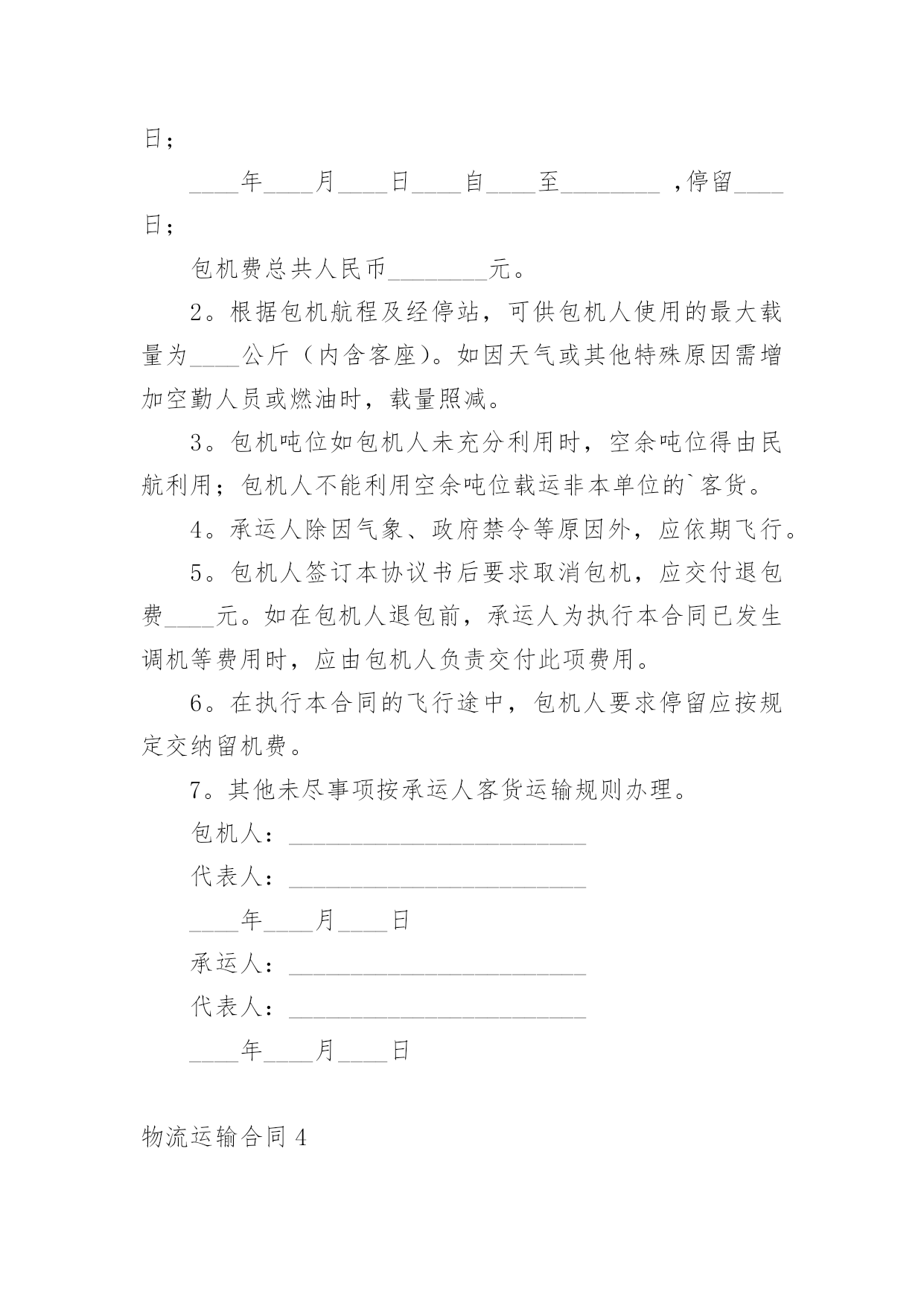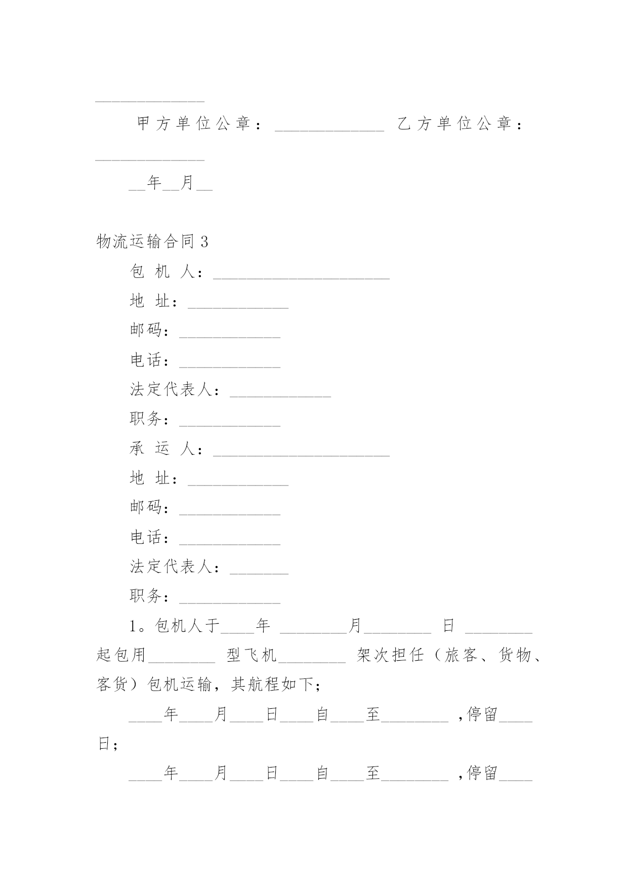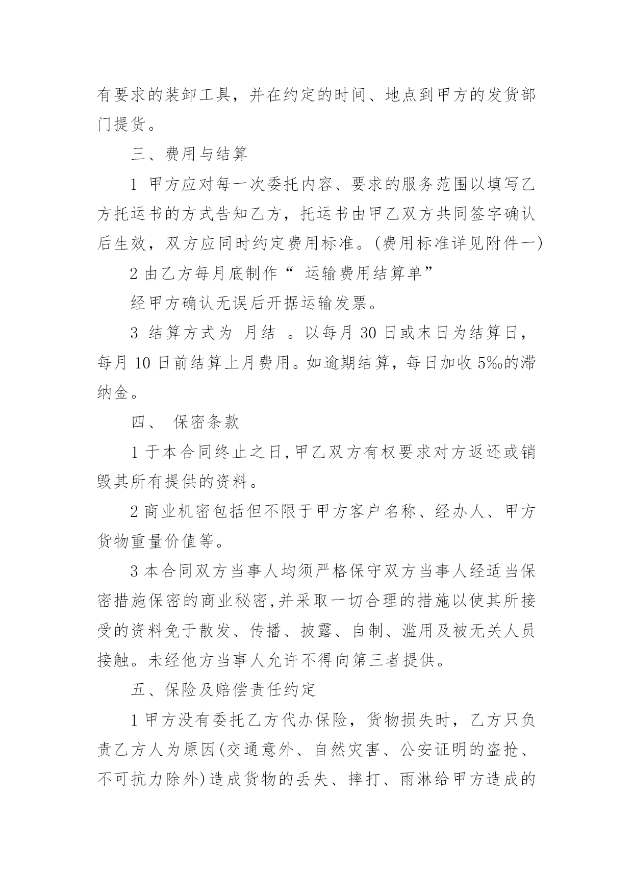 物流运输合同物流运输合同集合15篇在人民愈发重视法律的社会中,越来越多的场景和场合需要用到合同,签订合同可以明确双方当事人的权利和义务。那么制定合同书有什么需要注意的呢?下面是小编精心整理的物流运输合同,仅供参考,希望能够帮助到大家。物流运输合同1甲方:_______乙方:_______为有序地开展运输业务,更好地为运输户谋利益,甲乙双方本着“平等、自愿、协商一致”的原则,就汽车挂靠(代管)经营事宜达成如下协议:第一条:乙方自筹资金自购:乙方自愿将该车“挂靠”于甲方,交甲方代为管理经营,车辆产权归乙方所有,车辆证照所有权(管理权)归甲方。第二条:合同期内乙方不得将车转售或抵押担保,如乙方需将车辆转售,转售前必须征得甲方书面同意,并到甲方办理过户手续,向甲方交纳过户手续费。第三条:乙方车辆挂靠交甲方代管后,甲方为乙方代办理各项手续(费用乙方自付),交付乙方使用,并确保乙方货物运输的道路畅通(严禁违规、违法、违禁物品运输)。第四条:甲方收取乙方挂靠费_______元/年或代管费_______元/年,甲方力争多方联系货源,使乙方有更多的货物运输,为运输户谋取更多的利益。第五条:该车辆营运年限为国家规定的车辆营运报废期(含各种因素而提前报废),该车报废后,乙方应在_________日内将车辆牌照及其他所有证照交回甲方,车辆报废残值归乙方所有。第六条:乙方车辆在上户前,必须按照公司规定办理保险,保险费由乙方出资,甲方负责办理。该车次年保险,必须由公司统一办理,乙方按时在上年保修期前十日以前缴纳保险费用,如乙方不按国家法律、法规及公司要求缴纳保险费,其逾期期间产生的一切法律责任、经济责任及安全事故责任的费用,由乙方自行负责。第七条:该车上户后,乙方应严格按照上户的'技术参数营运,乙方不得将车辆擅自改型,如乙方自行做主改型,后果自负。第八条:乙方按时参加季检、年检,甲方负责代办有关手续,所需花费由乙方承担,逾期不参加季检、年检者,一切责任由乙方自行承担。第九条:乙方应自觉遵守国家道路交通安全规程及相关法律、法规、否则,由此而产生的一切责任由乙方自行承担。第十条:本合同经甲乙双方法定代表人委托代理人签字后,自任何一方违约,将按照合同法及相关法律、法规规定追究违约责任。第十一条:本合同一式两份,甲乙双方各执一份,双方具有同等的法律效力。甲方(盖章):_______________乙方(盖章):___________________甲方代表签名:_______________乙方代表签名:___________________地址:_______________________地址:___________________________电话:_______________________电话:___________________________传真:_______________________传真:___________________________日期:______年______月_____日日期:_______年_______月_______日物流运输合同2甲方(即托运方):_____________乙方(即承运方):_____________根据甲方与乙方的共同协商,在遵循《合同法》的基础上,就甲方将发往全国各地的货物交给乙方承运事项制定如下条款:一、甲方自愿将发往全国各地的货物交给乙方承运;二、甲方将货物交给乙方承运时,须提供货物运输途中所需要的所有合法手续,以及规范、安全的货物包装,并不得将国家违禁物品(含各种易燃易爆物品)夹带货品中,否则由此造成所有损失由甲方承担;三、甲方将货物交给乙方承运时,须按货物实际价值自行购买保险,或由乙方代为办理购买保险,否则由此产生货损、货丢,乙方不承担全部责任;四、如果货物在运输过程中出现包装损坏、货品损失等情况必须经收货人、送货司机(或者到达货站经手人)共同签字出具书面证明,必要时由收货人扣押送货车辆或扣除到货应收运费等;如未有签字证明,则乙方可拒绝赔偿;五、如果出现货物安全及时到达甲方指定地点而未能收取运费等应收费用,乙方可视情形扣押货物并达到一个月期限后自行处理;六、货物从承运之日起有效查询日期和索赔期在四十五日内,过期乙方可不承担任何责任;七、货物承运价格以及到货时间可由甲方与乙方根据实际情况加以协商确定,具体数量、金额、送货事宜等以每次乙方提货后所签的`由乙方提供的《货物托运单》为准,并以此作为查询、索赔、结算等实际操作的依据;八、补充条款:________________________________________。九、本合同书一式两份,甲方乙方各执一份;十、如有出现合同纠纷,在协商解决的基础上按《合同法》处理;十一、本合同自签订之日起即时生效。甲方法人代表:_________