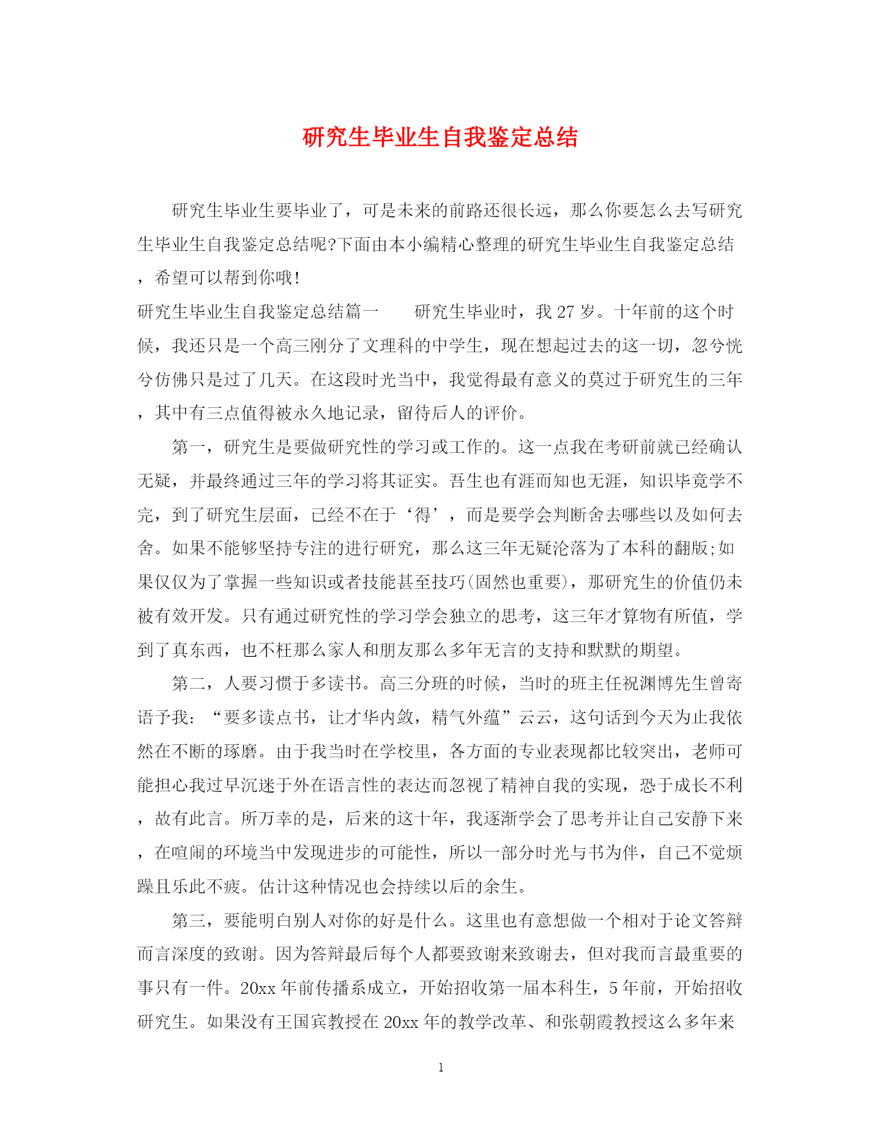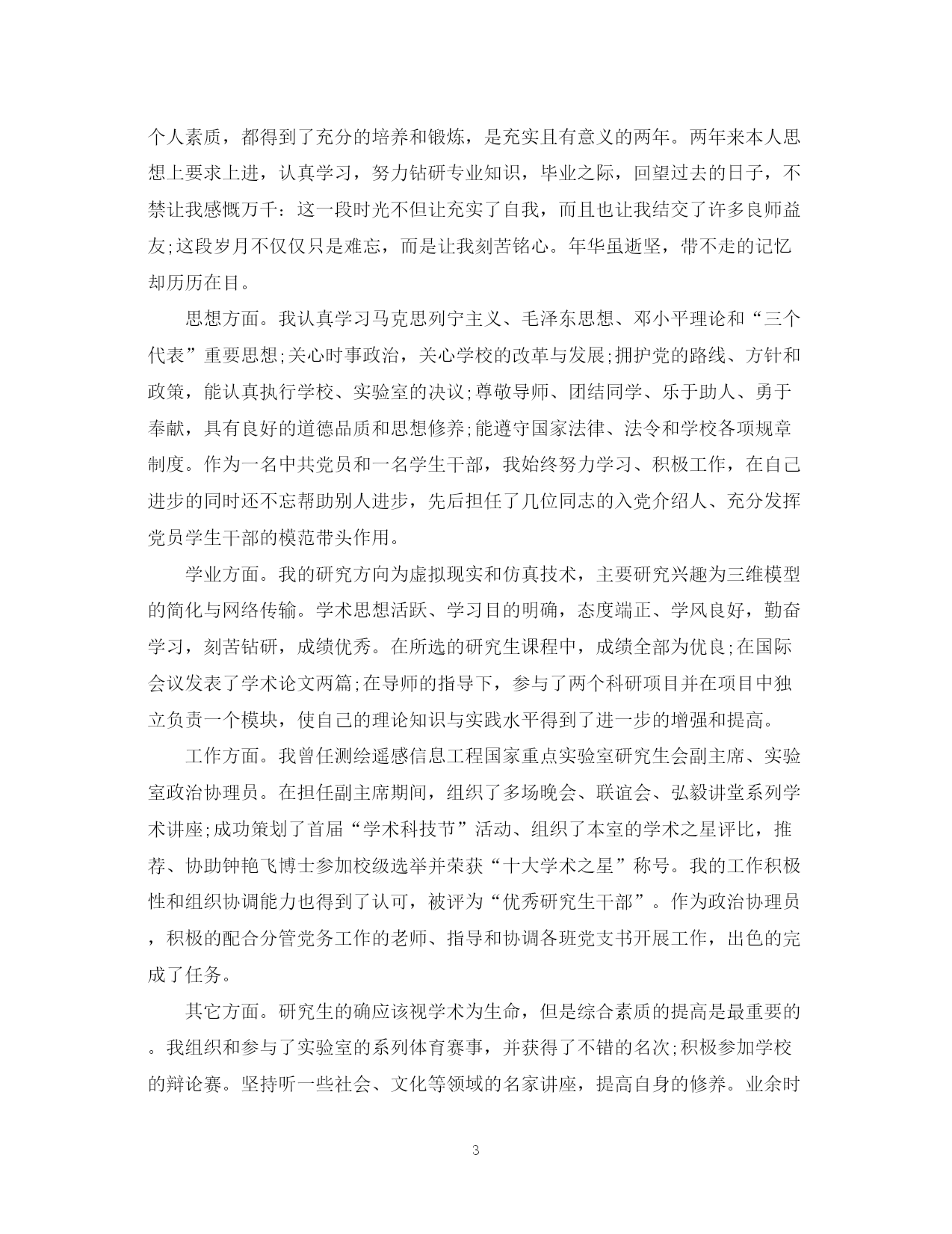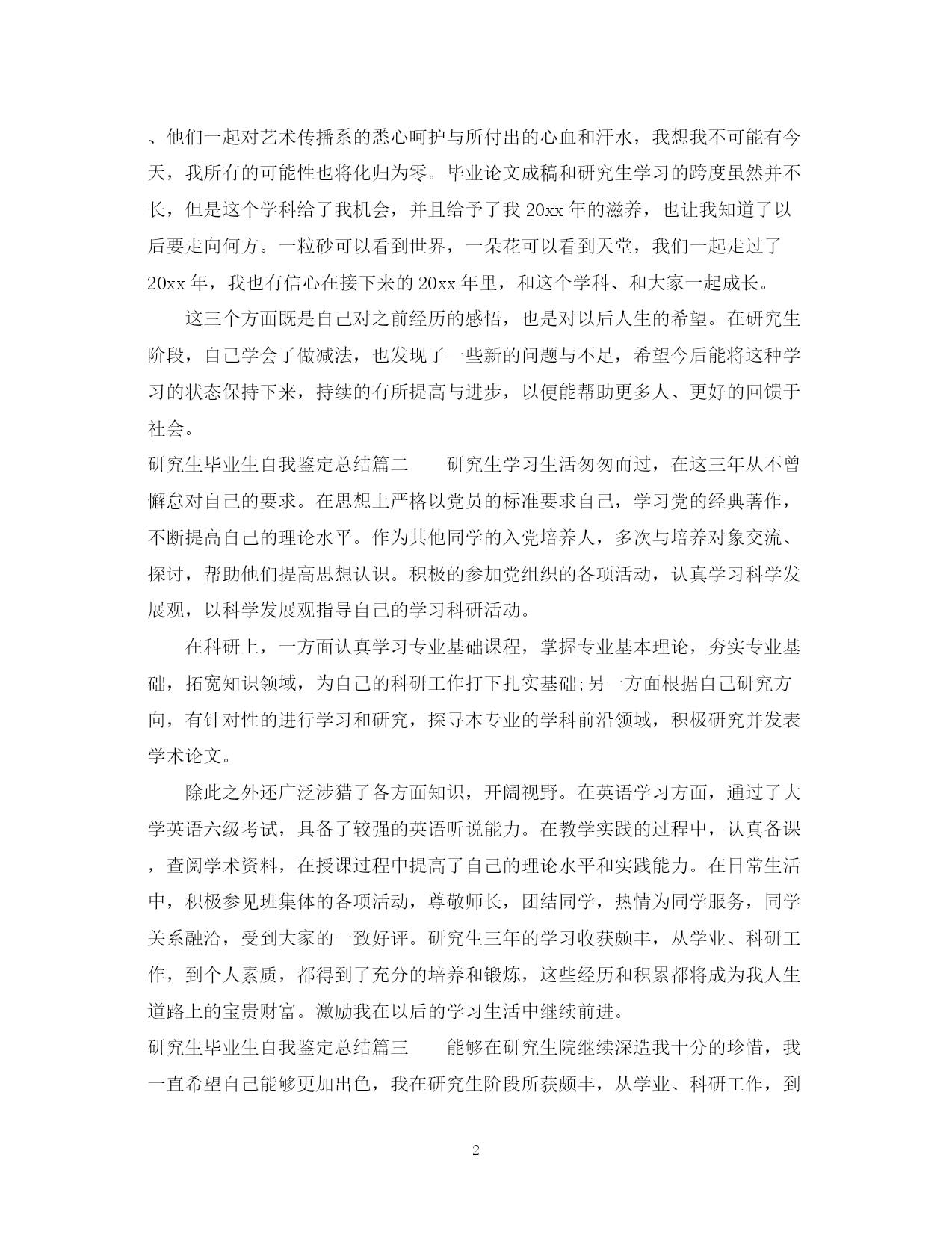 此资料由网络收集而来,如有侵权请告知上传者立即删除。资料共分享,我们负责传递知识。PAGEPAGE4研究生毕业生自我鉴定总结研究生毕业生要毕业了,可是未来的前路还很长远,那么你要怎么去写研究生毕业生自我鉴定总结呢?下面由本小编精心整理的研究生毕业生自我鉴定总结,希望可以帮到你哦!研究生毕业生自我鉴定总结篇一研究生毕业时,我27岁。十年前的这个时候,我还只是一个高三刚分了文理科的中学生,现在想起过去的这一切,忽兮恍兮仿佛只是过了几天。在这段时光当中,我觉得最有意义的莫过于研究生的三年,其中有三点值得被永久地记录,留待后人的评价。第一,研究生是要做研究性的学习或工作的。这一点我在考研前就已经确认无疑,并最终通过三年的学习将其证实。吾生也有涯而知也无涯,知识毕竟学不完,到了研究生层面,已经不在于‘得’,而是要学会判断舍去哪些以及如何去舍。如果不能够坚持专注的进行研究,那么这三年无疑沦落为了本科的翻版;如果仅仅为了掌握一些知识或者技能甚至技巧(固然也重要),那研究生的价值仍未被有效开发。只有通过研究性的学习学会独立的思考,这三年才算物有所值,学到了真东西,也不枉那么家人和朋友那么多年无言的支持和默默的期望。第二,人要习惯于多读书。高三分班的时候,当时的班主任祝渊博先生曾寄语予我:“要多读点书,让才华内敛,精气外蕴”云云,这句话到今天为止我依然在不断的琢磨。由于我当时在学校里,各方面的专业表现都比较突出,老师可能担心我过早沉迷于外在语言性的表达而忽视了精神自我的实现,恐于成长不利,故有此言。所万幸的是,后来的这十年,我逐渐学会了思考并让自己安静下来,在喧闹的环境当中发现进步的可能性,所以一部分时光与书为伴,自己不觉烦躁且乐此不疲。估计这种情况也会持续以后的余生。第三,要能明白别人对你的好是什么。这里也有意想做一个相对于论文答辩而言深度的致谢。因为答辩最后每个人都要致谢来致谢去,但对我而言最重要的事只有一件。20xx年前传播系成立,开始招收第一届本科生,5年前,开始招收研究生。如果没有王国宾教授在20xx年的教学改革、和张朝霞教授这么多年来、他们一起对艺术传播系的悉心呵护与所付出的心血和汗水,我想我不可能有今天,我所有的可能性也将化归为零。毕业论文成稿和研究生学习的跨度虽然并不长,但是这个学科给了我机会,并且给予了我20xx年的滋养,也让我知道了以后要走向何方。一粒砂可以看到世界,一朵花可以看到天堂,我们一起走过了20xx年,我也有信心在接下来的20xx年里,和这个学科、和大家一起成长。这三个方面既是自己对之前经历的感悟,也是对以后人生的希望。在研究生阶段,自己学会了做减法,也发现了一些新的问题与不足,希望今后能将这种学习的状态保持下来,持续的有所提高与进步,以便能帮助更多人、更好的回馈于社会。研究生毕业生自我鉴定总结篇二研究生学习生活匆匆而过,在这三年从不曾懈怠对自己的要求。在思想上严格以党员的标准要求自己,学习党的经典著作,不断提高自己的理论水平。作为其他同学的入党培养人,多次与培养对象交流、探讨,帮助他们提高思想认识。积极的参加党组织的各项活动,认真学习科学发展观,以科学发展观指导自己的学习科研活动。在科研上,一方面认真学习专业基础课程,掌握专业基本理论,夯实专业基础,拓宽知识领域,为自己的科研工作打下扎实基础;另一方面根据自己研究方向,有针对性的进行学习和研究,探寻本专业的学科前沿领域,积极研究并发表学术论文。除此之外还广泛涉猎了各方面知识,开阔视野。在英语学习方面,通过了大学英语六级考试,具备了较强的英语听说能力。在教学实践的过程中,认真备课,查阅学术资料,在授课过程中提高了自己的理论水平和实践能力。在日常生活中,积极参见班集体的各项活动,尊敬师长,团结同学,热情为同学服务,同学关系融洽,受到大家的一致好评。研究生三年的学习收获颇丰,从学业、科研工作,到个人素质,都得到了充分的培养和锻炼,这些经历和积累都将成为我人生道路上的宝贵财富。激励我在以后的学习生活中继续前进。研究生毕业生自我鉴定总结篇三能够在研究生院继续深造我十分的珍惜,我一直希望自己能够更加出色,我在研究生阶段所获颇丰,从学业、科研工作,到个人素质,都得到了充分的培养和锻炼,是充实且有意义的两年。两年来本人思想上要求上进,认真学习,努力钻研专业知识,毕业之际,回望过去的日子,不禁让我感慨万千:这一段时光不但让充实了自我,而且也让我结交了许多良师益友;这段岁月不仅仅只是难忘,而是让我刻苦铭心。年华虽逝坚,带不走的记忆却历历在目。思想方面。我认真学习马克思列宁主义、毛泽东思想、邓小平理论和“三个代表”重要思想;关心时事政治,关心学校的改革与发展;拥护党的路线、方针和政策,能认真执行学校、实验室的决议;尊敬导师、团结同学、乐于助人