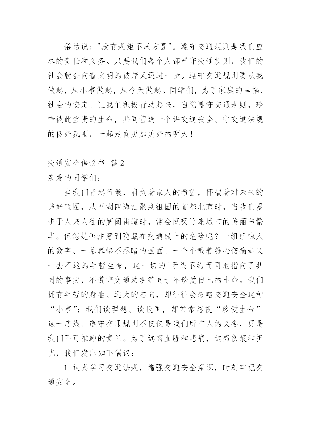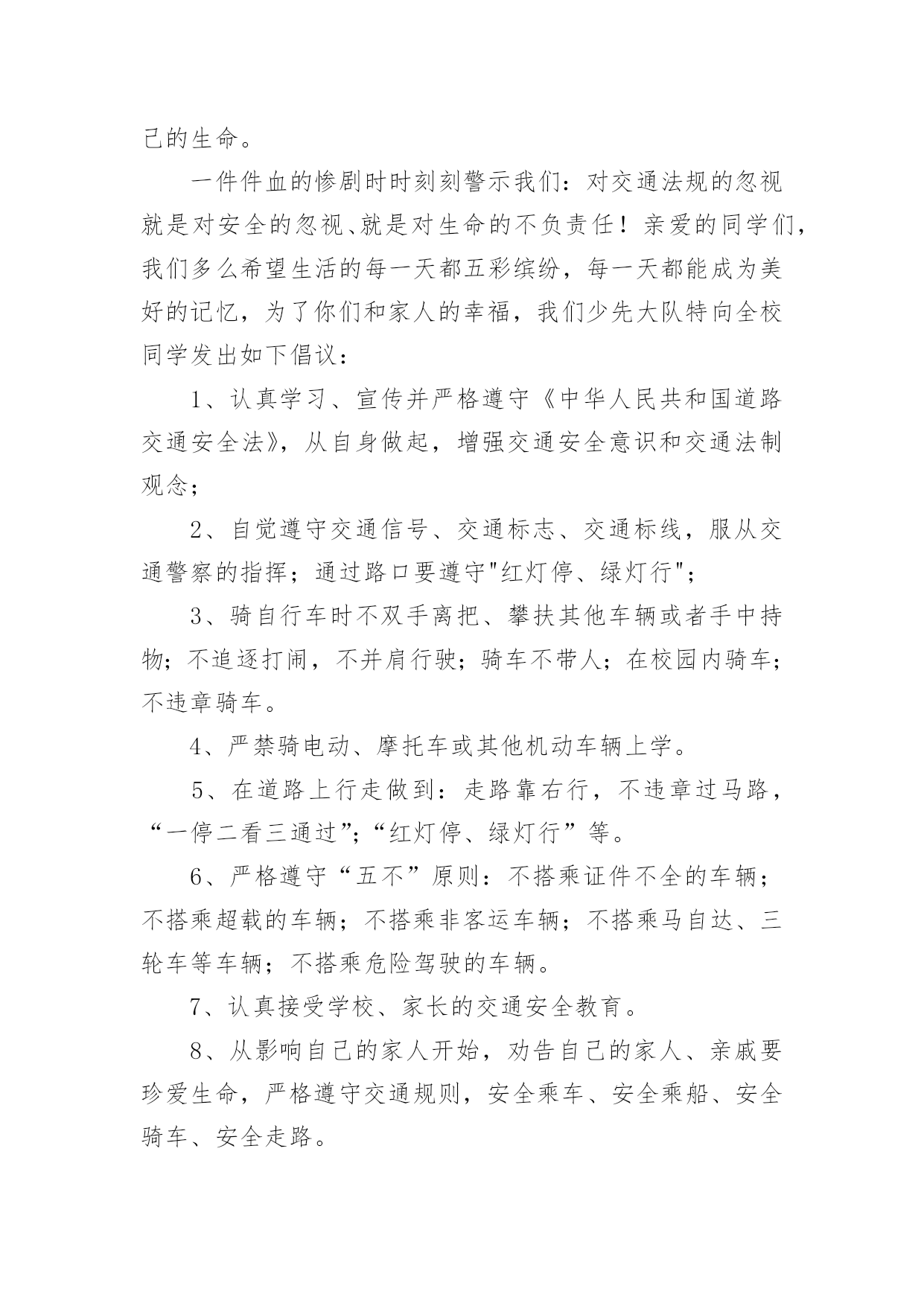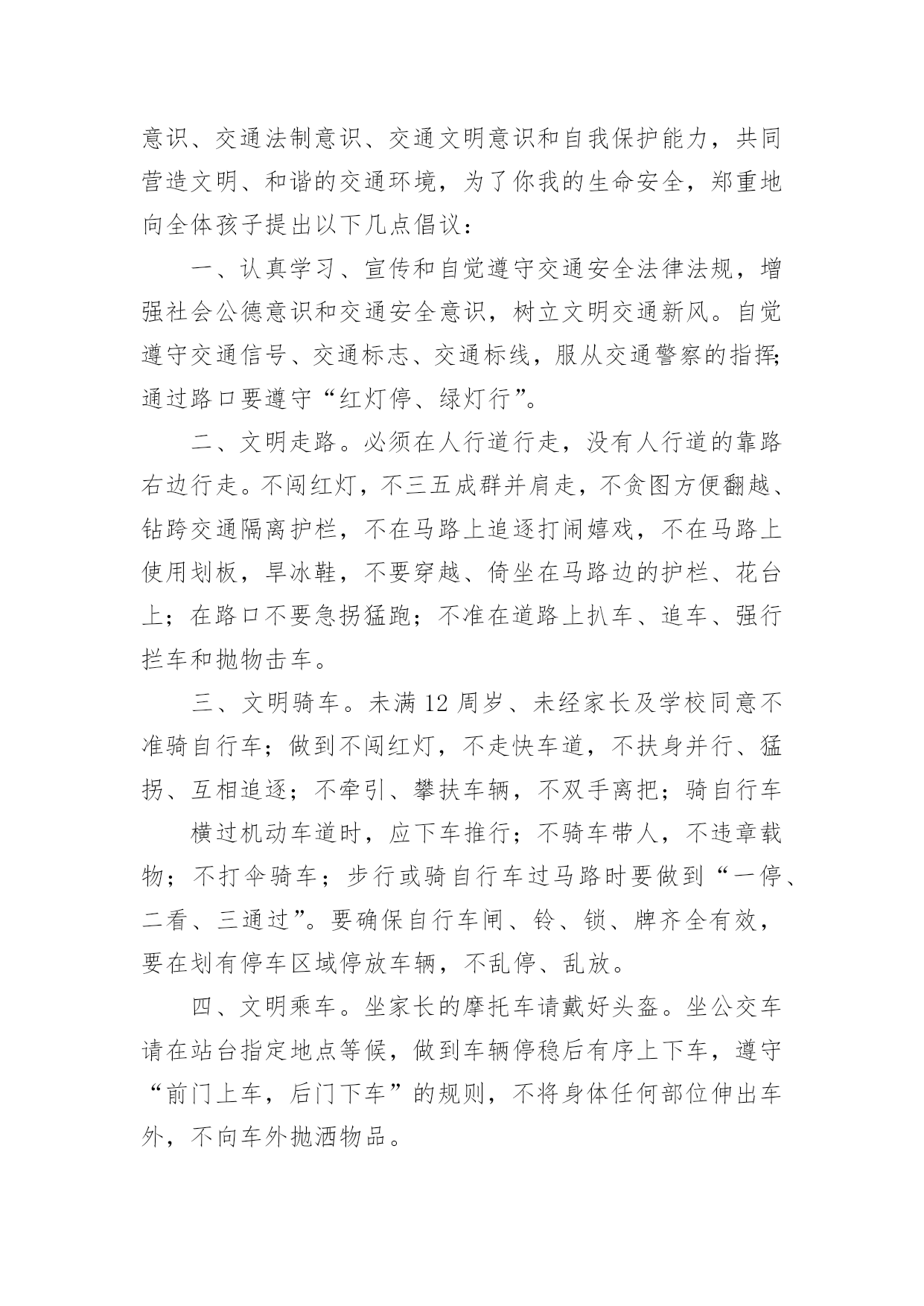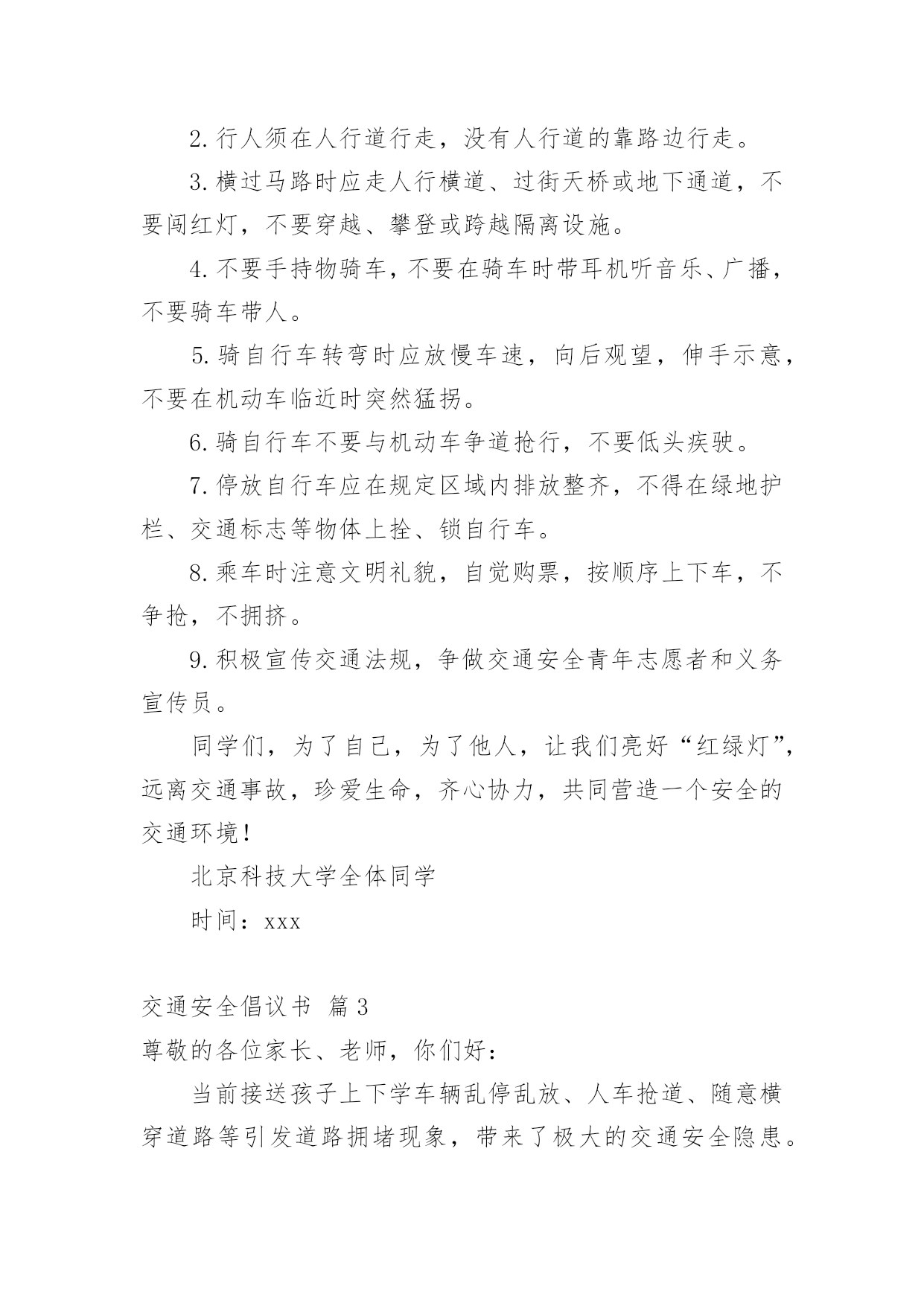 交通安全倡议书【精华】交通安全倡议书模板汇总5篇在快速变化和不断变革的新时代,用到倡议书的地方越来越多,倡议书是由某一组织或社团拟定、就某事向社会提出建议或提议社会成员共同去做某事的书面文章。还是对倡议书一筹莫展吗?下面是小编精心整理的交通安全倡议书5篇,欢迎阅读与收藏。交通安全倡议书篇1亲爱的同学们:人的生命只有一次,所以我们必须珍惜,珍惜每个人都仅有一次的生命??我曾听说过这样一则交通事故:一辆没有营运证的面包车满载15人,上坡时因为发动机动力不够,车子滑下了深水塘,酿成8死4伤的重大惨祸。后来,虽然这辆黑车的车主以超载及非法营运被逮捕了,并叛了无期徒刑,但给死伤者家庭带来的却是永远的伤痛??当我们背起行囊,肩负着家人的希望,怀揣着对未来的美好蓝图,走进凤中美丽校园时;当我们朝气蓬勃,漫步于人来人往的宽阔街道时,你是否注意到隐藏在交通线上的危险呢?一组组惊人的数字、一幕幕惨不忍睹的画面、一个个载着锥心伤痛却又一去不返的年轻生命,这一切的矛头不约而同地指向了共同的事实,不遵守交通法规即是不珍爱自己的生命。一件件血的惨剧时时刻刻警示我们:对交通法规的忽视就是对安全的忽视、就是对生命的不负责任!亲爱的同学们,我们多么希望生活的每一天都五彩缤纷,每一天都能成为美好的记忆,为了你们和家人的幸福,我们少先大队特向全校同学发出如下倡议:1、认真学习、宣传并严格遵守《中华人民共和国道路交通安全法》,从自身做起,增强交通安全意识和交通法制观念;2、自觉遵守交通信号、交通标志、交通标线,服从交通警察的指挥;通过路口要遵守"红灯停、绿灯行";3、骑自行车时不双手离把、攀扶其他车辆或者手中持物;不追逐打闹,不并肩行驶;骑车不带人;在校园内骑车;不违章骑车。4、严禁骑电动、摩托车或其他机动车辆上学。5、在道路上行走做到:走路靠右行,不违章过马路,“一停二看三通过”;“红灯停、绿灯行”等。6、严格遵守“五不”原则:不搭乘证件不全的车辆;不搭乘超载的车辆;不搭乘非客运车辆;不搭乘马自达、三轮车等车辆;不搭乘危险驾驶的车辆。7、认真接受学校、家长的交通安全教育。8、从影响自己的家人开始,劝告自己的家人、亲戚要珍爱生命,严格遵守交通规则,安全乘车、安全乘船、安全骑车、安全走路。俗话说:"没有规矩不成方圆"。遵守交通规则是我们应尽的责任和义务。只要我们每个人都严守交通规则,我们的社会就会向着文明的彼岸又迈进一步。遵守交通规则要从我做起,从小事做起,从今天做起。同学们,为了家庭的幸福、社会的安定、让我们积极行动起来,自觉遵守交通规则,珍惜彼此宝贵的生命,共同营造一个讲交通安全、守交通法规的良好氛围,一起走向更加美好的明天!交通安全倡议书篇2亲爱的同学们:当我们背起行囊,肩负着家人的希望,怀揣着对未来的美好蓝图,从五湖四海汇聚到祖国的首都北京时,当我们漫步于人来人往的宽阔街道时,常会慨叹这座城市的美丽与繁华。但您是否注意到隐藏在交通线上的危险呢?一组组惊人的数字、一幕幕惨不忍睹的画面、一个个载着锥心伤痛却又一去不返的年轻生命,这一切的`矛头不约而同地指向了共同的事实,不遵守交通法规等同于不珍爱自己的生命。我们拥有年轻的身躯、远大的志向,却往往会忽略交通安全这种“小事”;我们谈理想、谈报国,却常常忽视“珍爱生命”这一底线。遵守交通规则不仅仅是我们所有人的义务,更是我们不可推卸的责任。为了远离血腥和悲痛,远离伤痕和担忧,我们发出如下倡议:1.认真学习交通法规,增强交通安全意识,时刻牢记交通安全。2.行人须在人行道行走,没有人行道的靠路边行走。3.横过马路时应走人行横道、过街天桥或地下通道,不要闯红灯,不要穿越、攀登或跨越隔离设施。4.不要手持物骑车,不要在骑车时带耳机听音乐、广播,不要骑车带人。5.骑自行车转弯时应放慢车速,向后观望,伸手示意,不要在机动车临近时突然猛拐。6.骑自行车不要与机动车争道抢行,不要低头疾驶。7.停放自行车应在规定区域内排放整齐,不得在绿地护栏、交通标志等物体上拴、锁自行车。8.乘车时注意文明礼貌,自觉购票,按顺序上下车,不争抢,不拥挤。9.积极宣传交通法规,争做交通安全青年志愿者和义务宣传员。同学们,为了自己,为了他人,让我们亮好“红绿灯”,远离交通事故,珍爱生命,齐心协力,共同营造一个安全的交通环境!北京科技大学全体同学时间:xxx交通安全倡议书篇3尊敬的各位家长、老师,你们好:当前接送孩子上下学车辆乱停乱放、人车抢道、随意横穿道路等引发道路拥堵现象,带来了极大的交通安全隐患。为了孩子和您的生命财产安全,寿光市教育局、寿光市公安局真诚发出如下倡议:1、自觉将接送孩子车辆离校门口远一点两侧排队、有序停放,不乱掉头,不抢道,不逆行,不乱穿马路,不跨越隔离护栏。非机动车不在机动车道内行走,不妨碍机动车正常通行,车辆礼让行人。2、尽量让初中