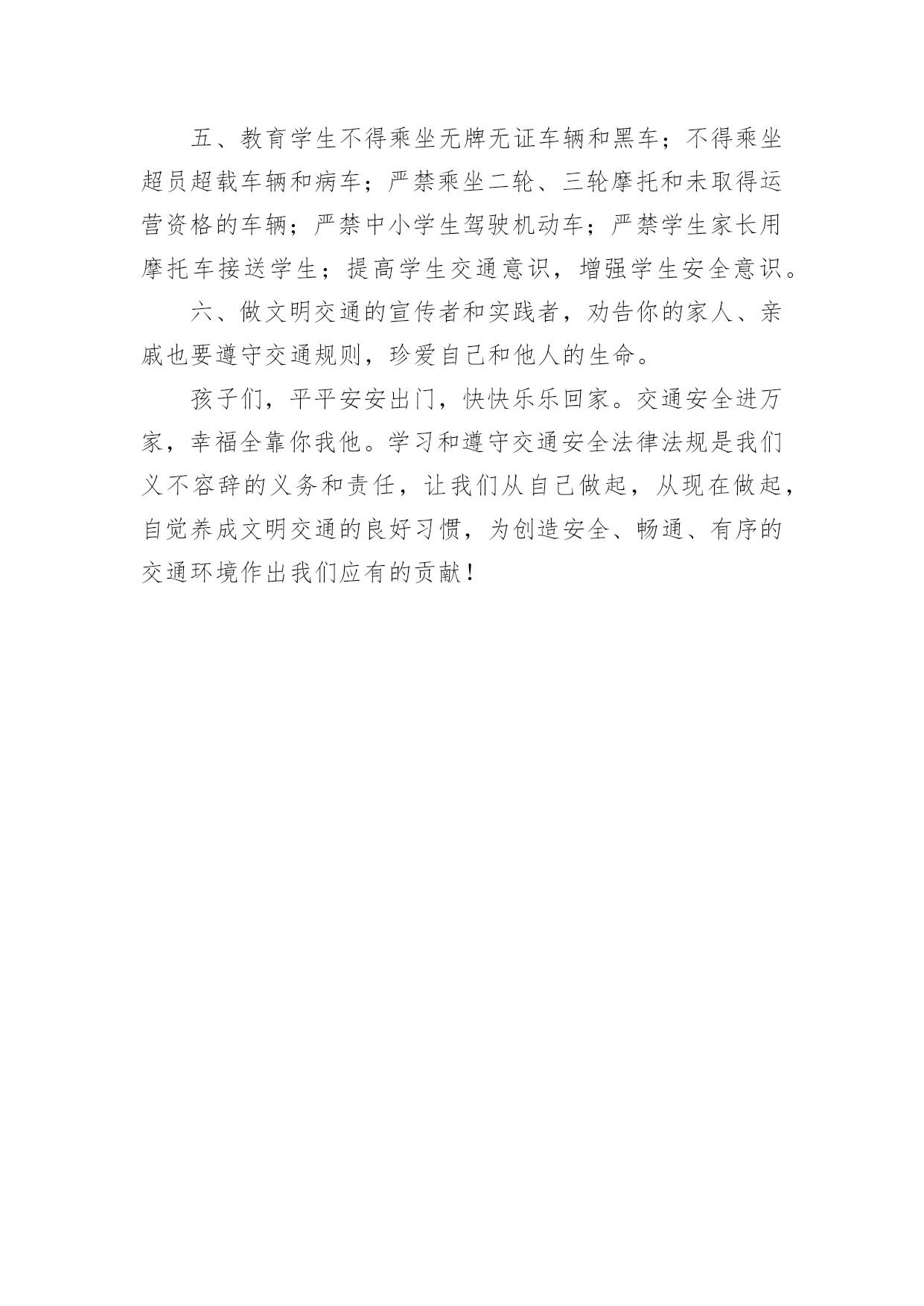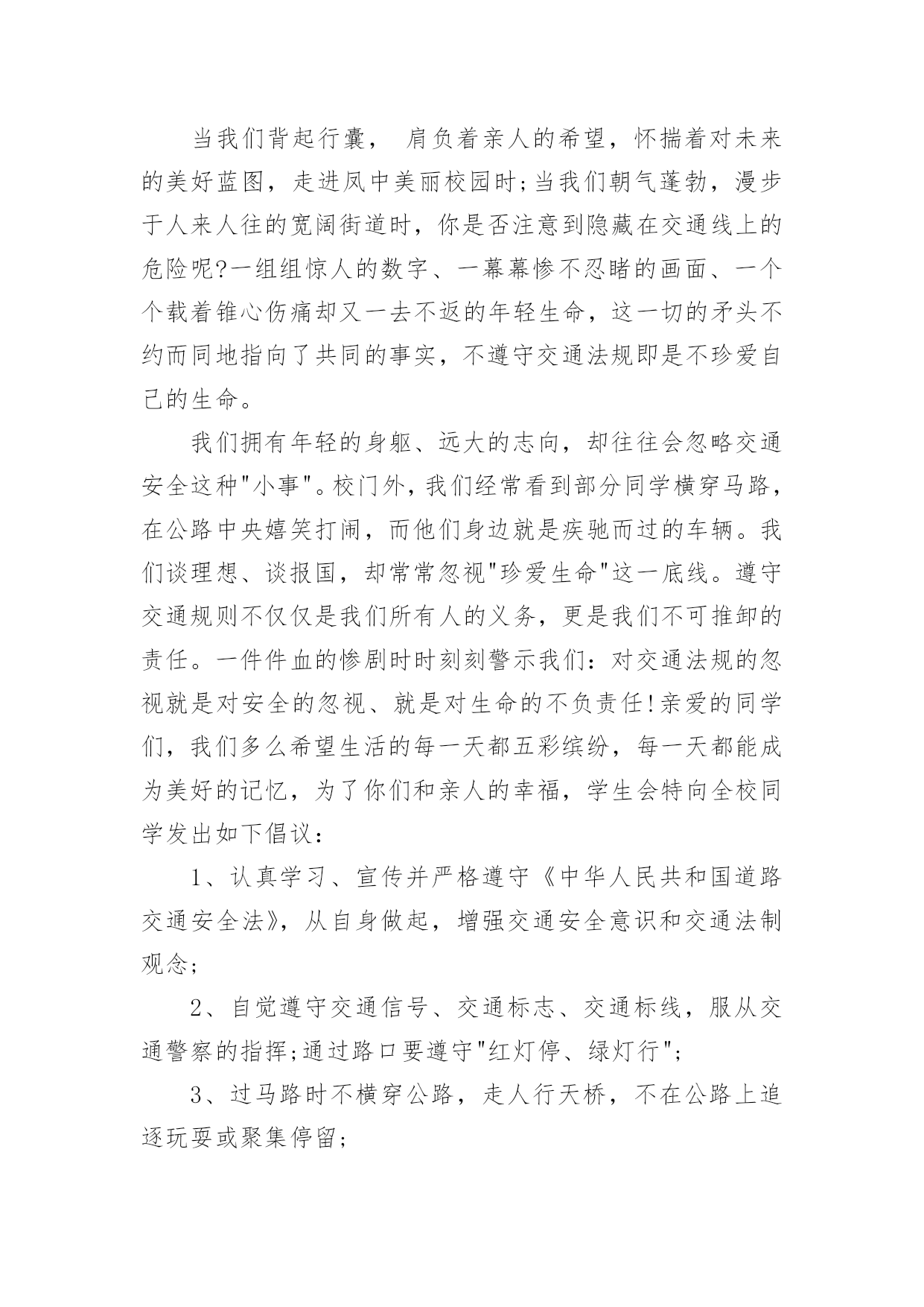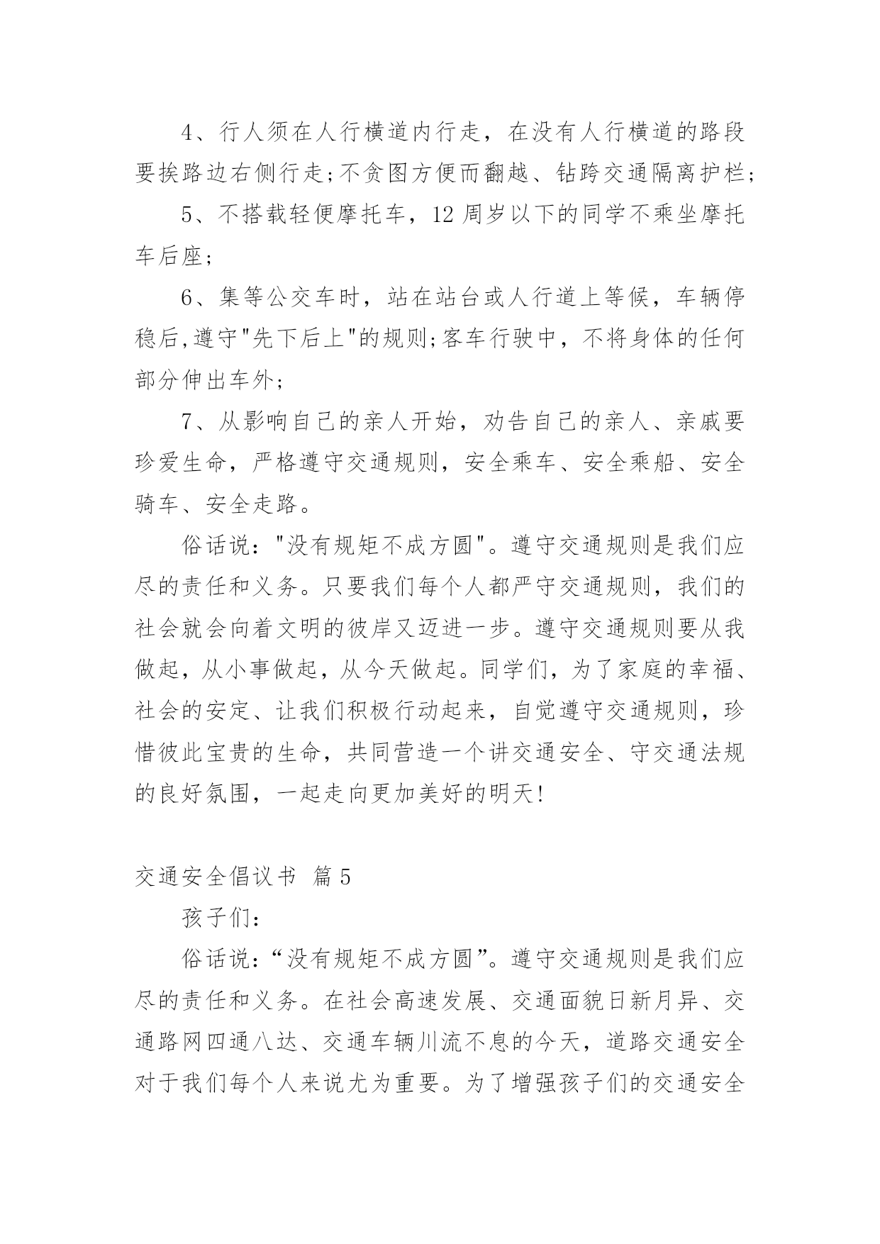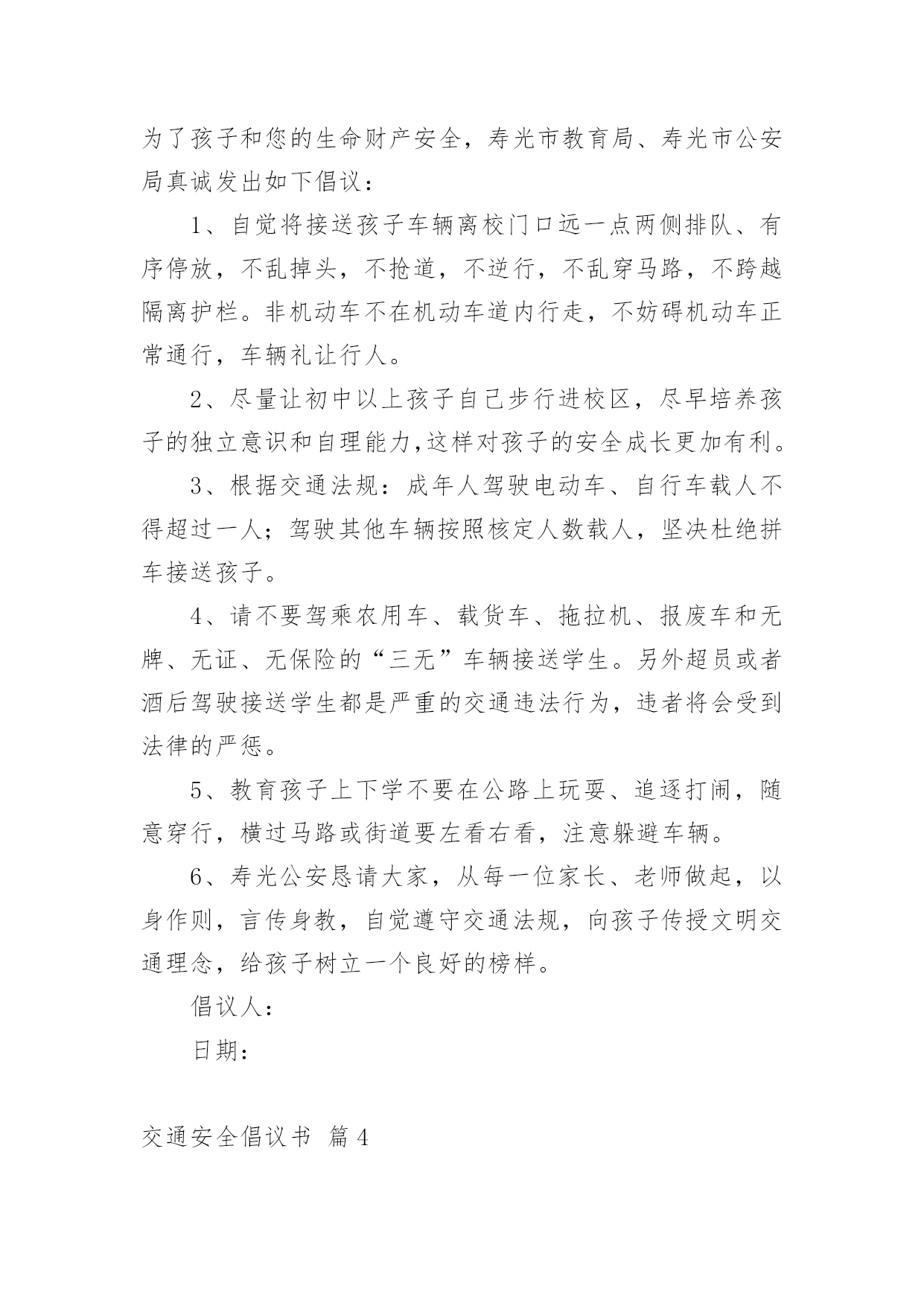 交通安全倡议书【精华】交通安全倡议书模板汇总5篇在快速变化和不断变革的新时代,用到倡议书的地方越来越多,倡议书是由某一组织或社团拟定、就某事向社会提出建议或提议社会成员共同去做某事的书面文章。还是对倡议书一筹莫展吗?下面是小编精心整理的交通安全倡议书5篇,欢迎阅读与收藏。交通安全倡议书篇1亲爱的同学们:人的生命只有一次,所以我们必须珍惜,珍惜每个人都仅有一次的生命??我曾听说过这样一则交通事故:一辆没有营运证的面包车满载15人,上坡时因为发动机动力不够,车子滑下了深水塘,酿成8死4伤的重大惨祸。后来,虽然这辆黑车的车主以超载及非法营运被逮捕了,并叛了无期徒刑,但给死伤者家庭带来的却是永远的伤痛??当我们背起行囊,肩负着家人的希望,怀揣着对未来的美好蓝图,走进凤中美丽校园时;当我们朝气蓬勃,漫步于人来人往的宽阔街道时,你是否注意到隐藏在交通线上的危险呢?一组组惊人的数字、一幕幕惨不忍睹的画面、一个个载着锥心伤痛却又一去不返的年轻生命,这一切的矛头不约而同地指向了共同的事实,不遵守交通法规即是不珍爱自己的生命。一件件血的惨剧时时刻刻警示我们:对交通法规的忽视就是对安全的忽视、就是对生命的不负责任!亲爱的同学们,我们多么希望生活的每一天都五彩缤纷,每一天都能成为美好的记忆,为了你们和家人的幸福,我们少先大队特向全校同学发出如下倡议:1、认真学习、宣传并严格遵守《中华人民共和国道路交通安全法》,从自身做起,增强交通安全意识和交通法制观念;2、自觉遵守交通信号、交通标志、交通标线,服从交通警察的指挥;通过路口要遵守"红灯停、绿灯行";3、骑自行车时不双手离把、攀扶其他车辆或者手中持物;不追逐打闹,不并肩行驶;骑车不带人;在校园内骑车;不违章骑车。4、严禁骑电动、摩托车或其他机动车辆上学。5、在道路上行走做到:走路靠右行,不违章过马路,“一停二看三通过”;“红灯停、绿灯行”等。6、严格遵守“五不”原则:不搭乘证件不全的车辆;不搭乘超载的车辆;不搭乘非客运车辆;不搭乘马自达、三轮车等车辆;不搭乘危险驾驶的车辆。7、认真接受学校、家长的交通安全教育。8、从影响自己的家人开始,劝告自己的家人、亲戚要珍爱生命,严格遵守交通规则,安全乘车、安全乘船、安全骑车、安全走路。俗话说:"没有规矩不成方圆"。遵守交通规则是我们应尽的责任和义务。只要我们每个人都严守交通规则,我们的社会就会向着文明的彼岸又迈进一步。遵守交通规则要从我做起,从小事做起,从今天做起。同学们,为了家庭的幸福、社会的安定、让我们积极行动起来,自觉遵守交通规则,珍惜彼此宝贵的生命,共同营造一个讲交通安全、守交通法规的良好氛围,一起走向更加美好的明天!交通安全倡议书篇2亲爱的同学们:当我们背起行囊,肩负着家人的希望,怀揣着对未来的美好蓝图,从五湖四海汇聚到祖国的首都北京时,当我们漫步于人来人往的宽阔街道时,常会慨叹这座城市的美丽与繁华。但您是否注意到隐藏在交通线上的危险呢?一组组惊人的数字、一幕幕惨不忍睹的画面、一个个载着锥心伤痛却又一去不返的年轻生命,这一切的`矛头不约而同地指向了共同的事实,不遵守交通法规等同于不珍爱自己的生命。我们拥有年轻的身躯、远大的志向,却往往会忽略交通安全这种“小事”;我们谈理想、谈报国,却常常忽视“珍爱生命”这一底线。遵守交通规则不仅仅是我们所有人的义务,更是我们不可推卸的责任。为了远离血腥和悲痛,远离伤痕和担忧,我们发出如下倡议:1.认真学习交通法规,增强交通安全意识,时刻牢记交通安全。2.行人须在人行道行走,没有人行道的靠路边行走。3.横过马路时应走人行横道、过街天桥或地下通道,不要闯红灯,不要穿越、攀登或跨越隔离设施。4.不要手持物骑车,不要在骑车时带耳机听音乐、广播,不要骑车带人。5.骑自行车转弯时应放慢车速,向后观望,伸手示意,不要在机动车临近时突然猛拐。6.骑自行车不要与机动车争道抢行,不要低头疾驶。7.停放自行车应在规定区域内排放整齐,不得在绿地护栏、交通标志等物体上拴、锁自行车。8.乘车时注意文明礼貌,自觉购票,按顺序上下车,不争抢,不拥挤。9.积极宣传交通法规,争做交通安全青年志愿者和义务宣传员。同学们,为了自己,为了他人,让我们亮好“红绿灯”,远离交通事故,珍爱生命,齐心协力,共同营造一个安全的交通环境!北京科技大学全体同学时间:xxx交通安全倡议书篇3尊敬的各位家长、老师,你们好:当前接送孩子上下学车辆乱停乱放、人车抢道、随意横穿道路等引发道路拥堵现象,带来了极大的交通安全隐患。为了孩子和您的生命财产安全,寿光市教育局、寿光市公安局真诚发出如下倡议:1、自觉将接送孩子车辆离校门口远一点两侧排队、有序停放,不乱掉头,不抢道,不逆行,不乱穿马路,不跨越隔离护栏。非机动车不在机动车道内行走,不妨碍机动车正常通行,车辆礼让行人。2、尽量让初中