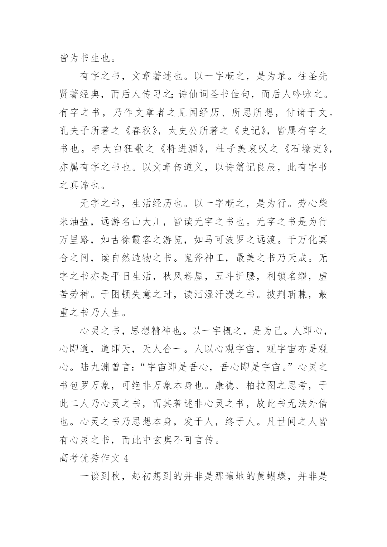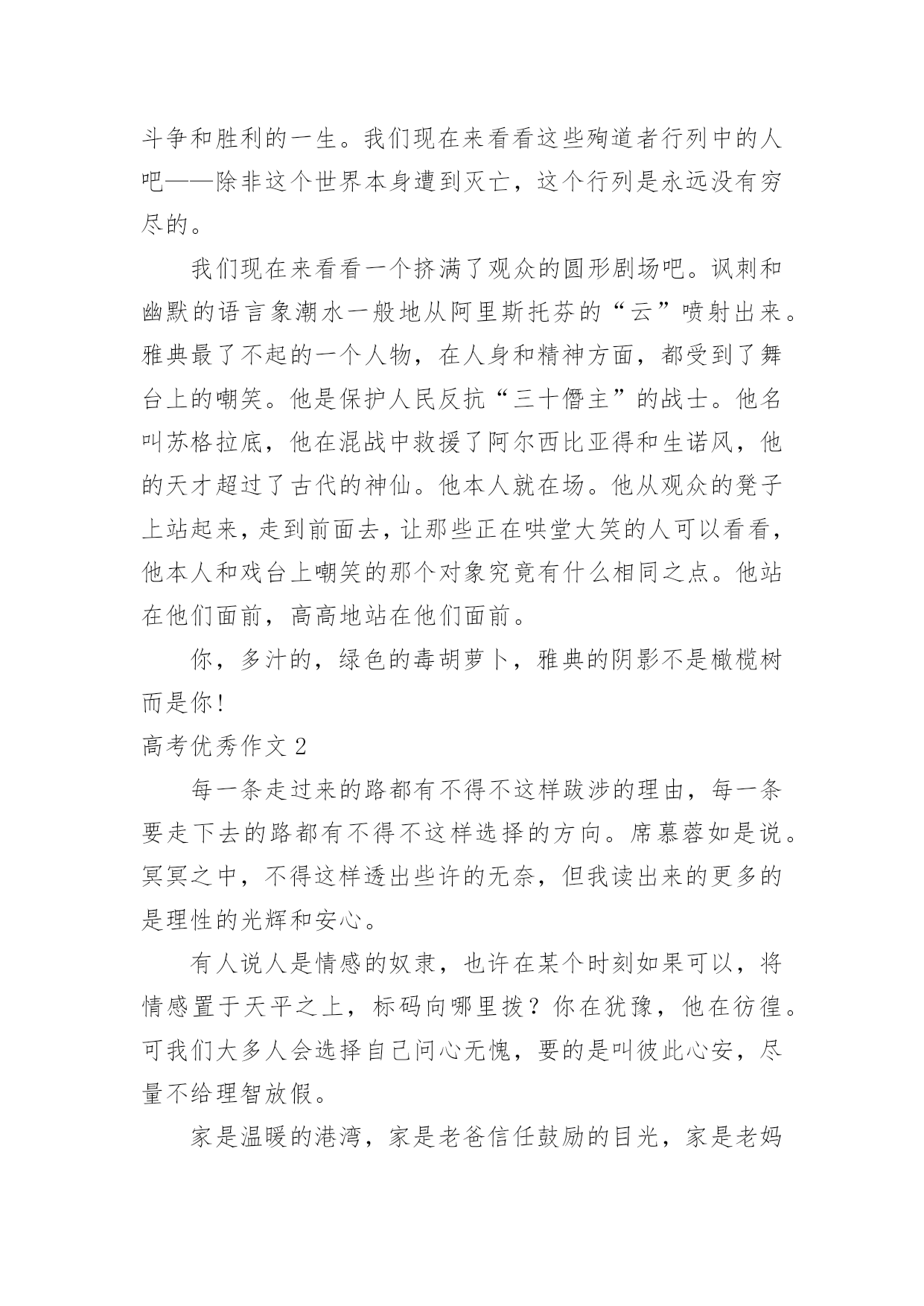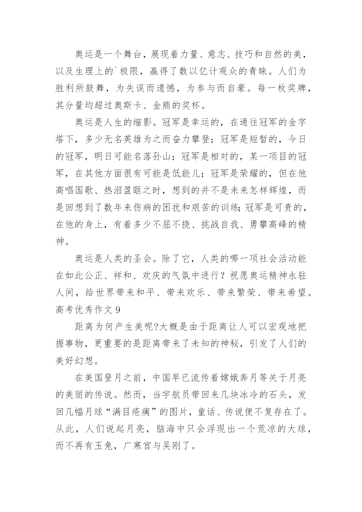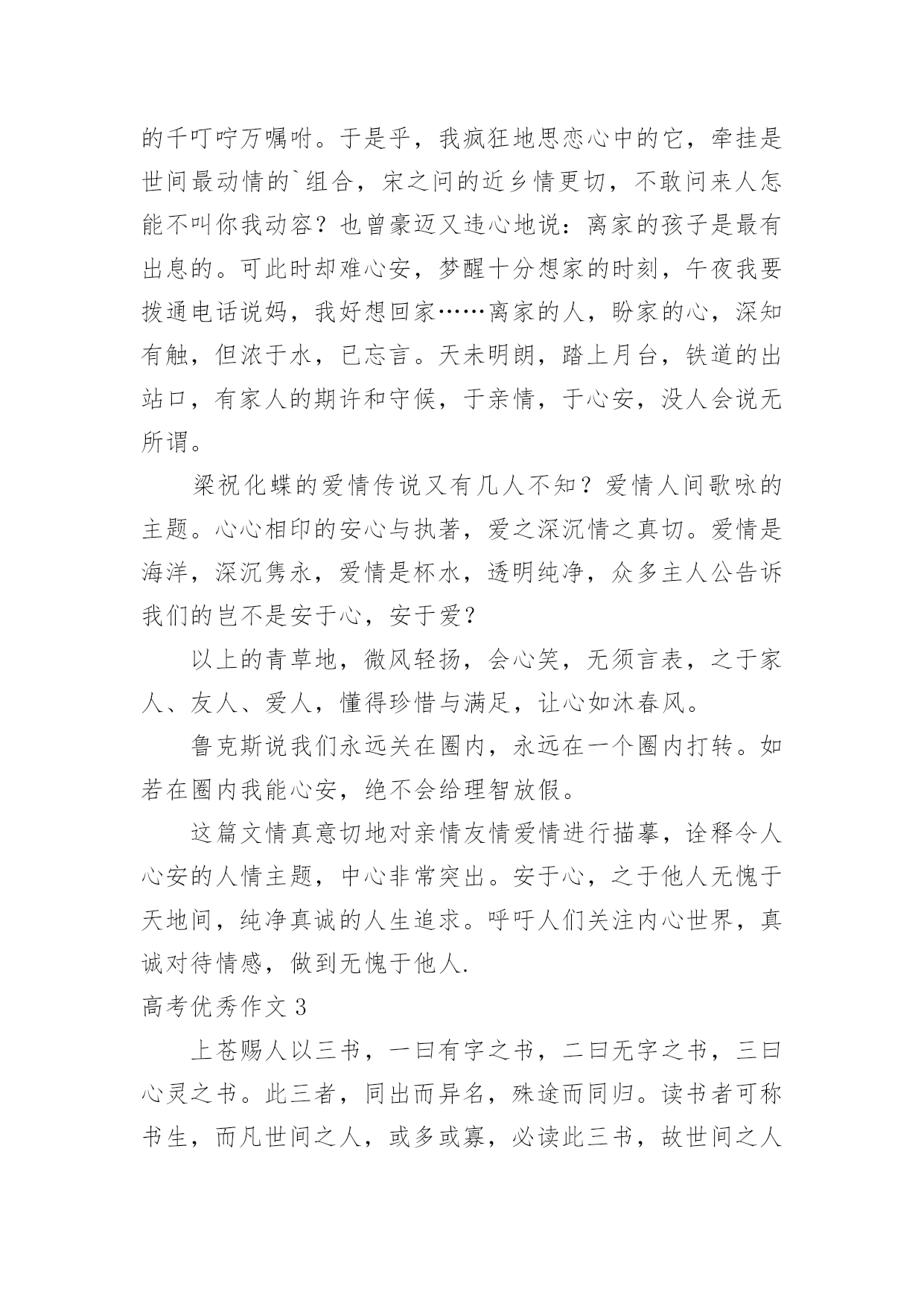 高考优秀作文【精】高考优秀作文在日常学习、工作或生活中,大家最不陌生的就是作文了吧,作文是经过人的思想考虑和语言组织,通过文字来表达一个主题意义的记叙方法。怎么写作文才能避免踩雷呢?以下是小编为大家收集的高考优秀作文,仅供参考,大家一起来看看吧。高考优秀作文1从前有一个古老的故事:“光荣的荆棘路:一个叫做布鲁德的猎人得到了无上的光荣和尊严,但是他却长时期遇到极大的困难和冒着生命的危险。”我们大多数的人在小时已经听到过这个故事,可能后来还读到过它,并且也想起自己没有被人歌诵过的“荆棘路”和“极大的困难”。故事和真事没有什么很大的分界线。不过故事在我们这个世界里经常有一个愉快的结尾,而真事常常在今生没有结果,只好等到永恒的.未来。世界的历史象一个幻灯。它在现代的黑暗背景上,放映出明朗的片子,说明那些造福人类的善人和天才的殉道者在怎样走着荆棘路。这些光耀的图片把各个时代,各个国家都反映给我们看。每张片子只映几秒钟,但是它却代表整个的一生——充满了斗争和胜利的一生。我们现在来看看这些殉道者行列中的人吧——除非这个世界本身遭到灭亡,这个行列是永远没有穷尽的。我们现在来看看一个挤满了观众的圆形剧场吧。讽刺和幽默的语言象潮水一般地从阿里斯托芬的“云”喷射出来。雅典最了不起的一个人物,在人身和精神方面,都受到了舞台上的嘲笑。他是保护人民反抗“三十僭主”的战士。他名叫苏格拉底,他在混战中救援了阿尔西比亚得和生诺风,他的天才超过了古代的神仙。他本人就在场。他从观众的凳子上站起来,走到前面去,让那些正在哄堂大笑的人可以看看,他本人和戏台上嘲笑的那个对象究竟有什么相同之点。他站在他们面前,高高地站在他们面前。你,多汁的,绿色的毒胡萝卜,雅典的阴影不是橄榄树而是你!高考优秀作文2每一条走过来的路都有不得不这样跋涉的理由,每一条要走下去的路都有不得不这样选择的方向。席慕蓉如是说。冥冥之中,不得这样透出些许的无奈,但我读出来的更多的是理性的光辉和安心。有人说人是情感的奴隶,也许在某个时刻如果可以,将情感置于天平之上,标码向哪里拨?你在犹豫,他在彷徨。可我们大多人会选择自己问心无愧,要的是叫彼此心安,尽量不给理智放假。家是温暖的港湾,家是老爸信任鼓励的目光,家是老妈的千叮咛万嘱咐。于是乎,我疯狂地思恋心中的它,牵挂是世间最动情的`组合,宋之问的近乡情更切,不敢问来人怎能不叫你我动容?也曾豪迈又违心地说:离家的孩子是最有出息的。可此时却难心安,梦醒十分想家的时刻,午夜我要拨通电话说妈,我好想回家……离家的人,盼家的心,深知有触,但浓于水,已忘言。天未明朗,踏上月台,铁道的出站口,有家人的期许和守候,于亲情,于心安,没人会说无所谓。梁祝化蝶的爱情传说又有几人不知?爱情人间歌咏的主题。心心相印的安心与执著,爱之深沉情之真切。爱情是海洋,深沉隽永,爱情是杯水,透明纯净,众多主人公告诉我们的岂不是安于心,安于爱?以上的青草地,微风轻扬,会心笑,无须言表,之于家人、友人、爱人,懂得珍惜与满足,让心如沐春风。鲁克斯说我们永远关在圈内,永远在一个圈内打转。如若在圈内我能心安,绝不会给理智放假。这篇文情真意切地对亲情友情爱情进行描摹,诠释令人心安的人情主题,中心非常突出。安于心,之于他人无愧于天地间,纯净真诚的人生追求。呼吁人们关注内心世界,真诚对待情感,做到无愧于他人.高考优秀作文3上苍赐人以三书,一曰有字之书,二曰无字之书,三曰心灵之书。此三者,同出而异名,殊途而同归。读书者可称书生,而凡世间之人,或多或寡,必读此三书,故世间之人皆为书生也。有字之书,文章著述也。以一字概之,是为录。往圣先贤著经典,而后人传习之;诗仙词圣书佳句,而后人吟咏之。有字之书,乃作文章者之见闻经历、所思所想,付诸于文。孔夫子所著之《春秋》,太史公所著之《史记》,皆属有字之书也。李太白狂歌之《将进酒》,杜子美哀叹之《石壕吏》,亦属有字之书也。以文章传道义,以诗篇记良辰,此有字书之真谛也。无字之书,生活经历也。以一字概之,是为行。劳心柴米油盐,远游名山大川,皆读无字之书也。无字之书是为行万里路,如古徐霞客之游览,如马可波罗之远渡。于万化冥合之间,读自然造物之书。鬼斧神工,最美之书乃天成。无字之书亦是平日生活,秋风卷屋,五斗折腰,利锁名缰,虚苦劳神。于困顿失意之时,读泪湿汗浸之书。披荆斩棘,最重之书乃人生。心灵之书,思想精神也。以一字概之,是为己。人即心,心即道,道即天,天人合一。人以心观宇宙,观宇宙亦是观心。陆九渊曾言:“宇宙即是吾心,吾心即是宇宙。”心灵之书包罗万象,可绝非万象本身也。康德、柏拉图之思考,于此二人乃心灵之书,而其著述非心灵之书,故此书无法外借也。心灵之书乃思想本身,发于人,终于人。凡世间之人皆有心灵之书,而此中玄奥不可言传。高考优秀作文4一谈到秋,起初想到的并非是那遍地的黄蝴蝶,