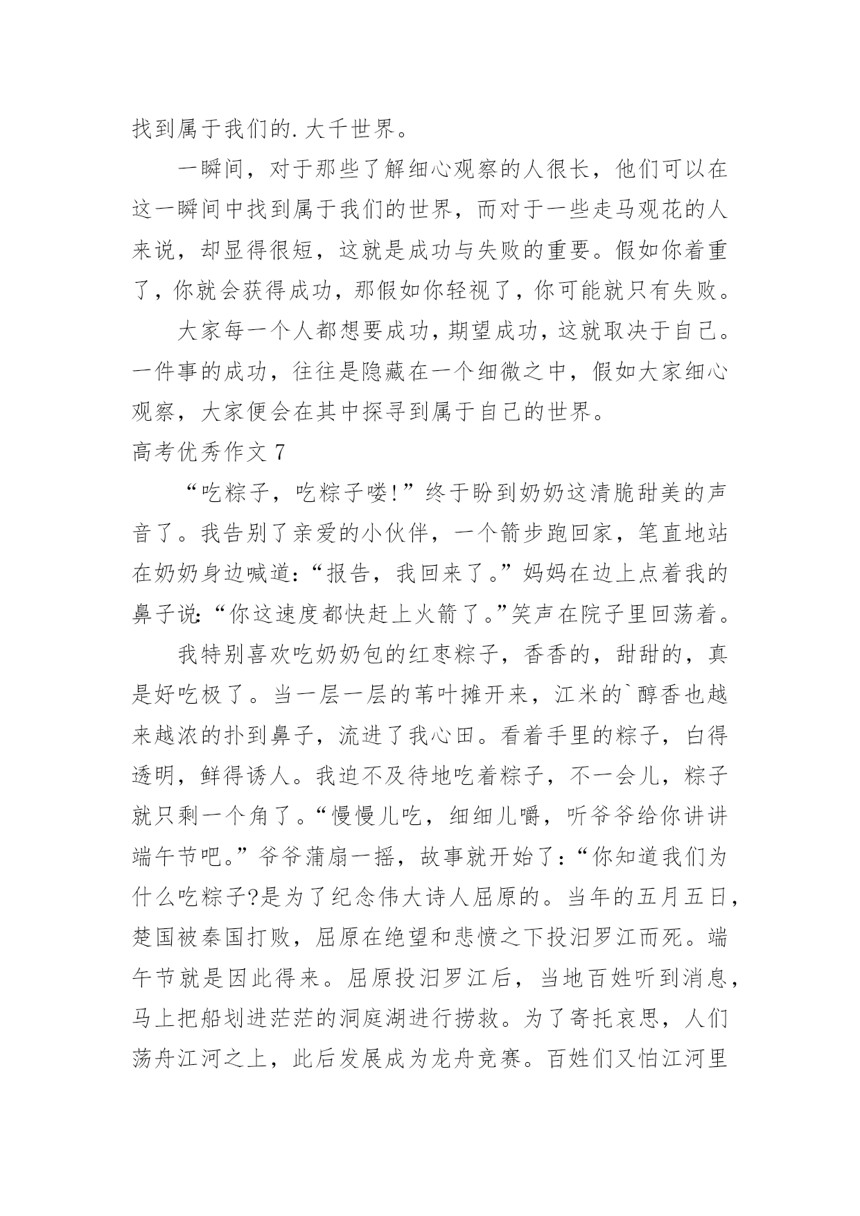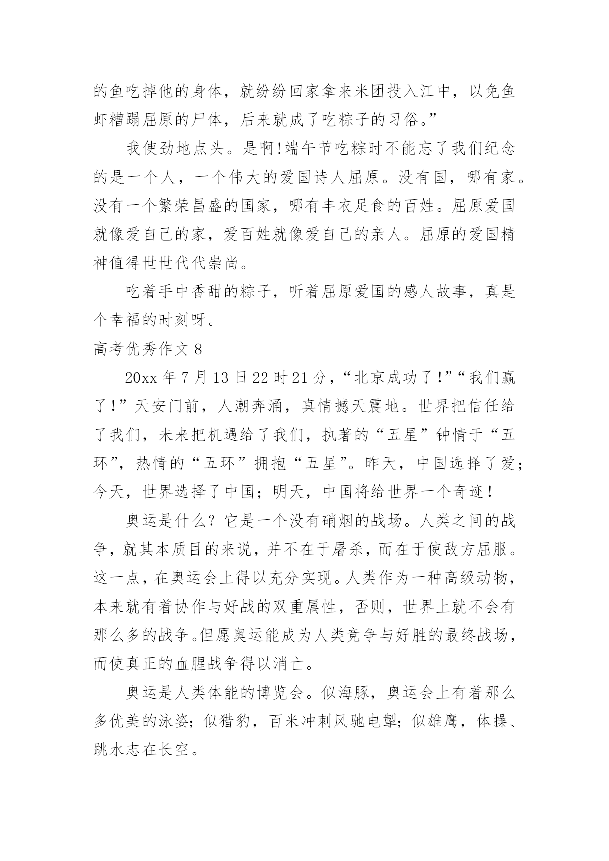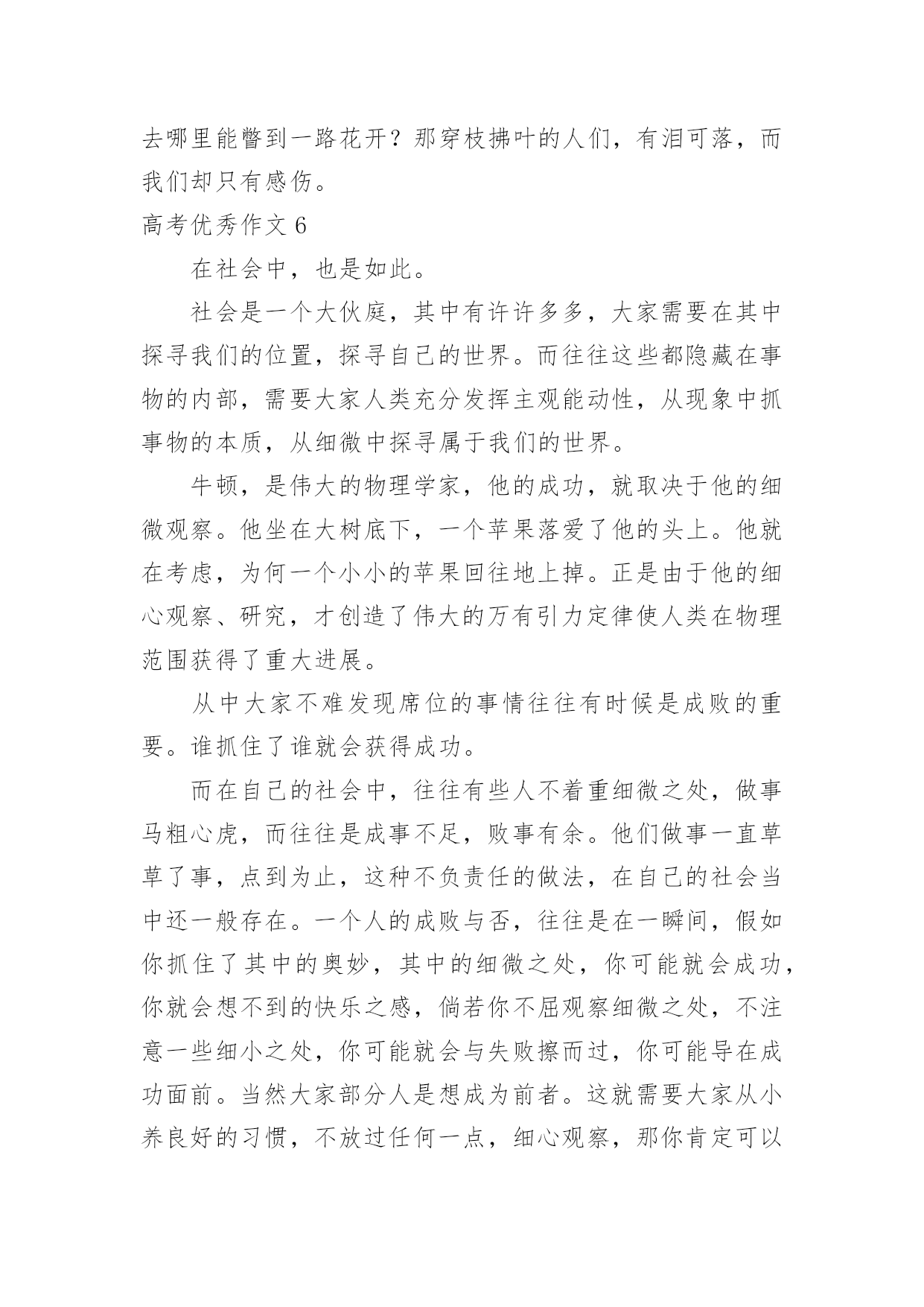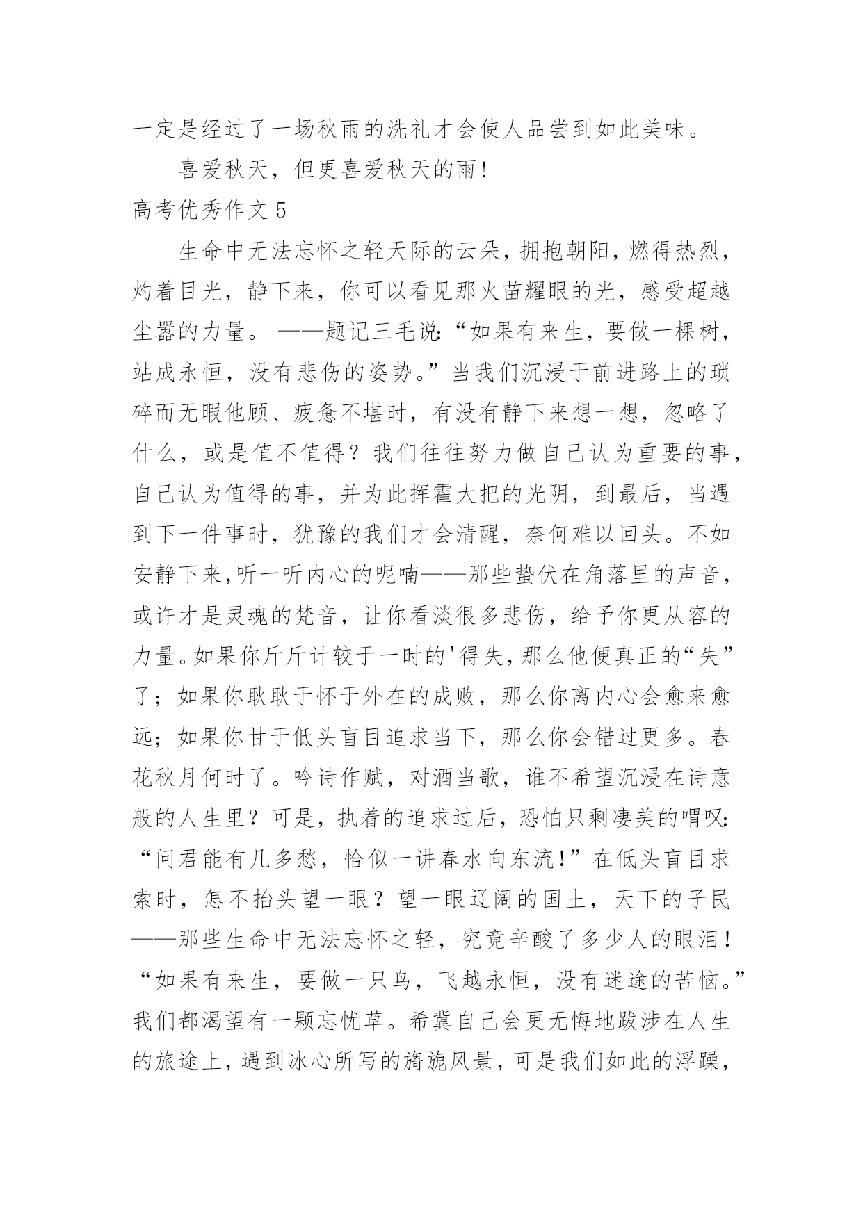 高考优秀作文【精】高考优秀作文在日常学习、工作或生活中,大家最不陌生的就是作文了吧,作文是经过人的思想考虑和语言组织,通过文字来表达一个主题意义的记叙方法。怎么写作文才能避免踩雷呢?以下是小编为大家收集的高考优秀作文,仅供参考,大家一起来看看吧。高考优秀作文1从前有一个古老的故事:“光荣的荆棘路:一个叫做布鲁德的猎人得到了无上的光荣和尊严,但是他却长时期遇到极大的困难和冒着生命的危险。”我们大多数的人在小时已经听到过这个故事,可能后来还读到过它,并且也想起自己没有被人歌诵过的“荆棘路”和“极大的困难”。故事和真事没有什么很大的分界线。不过故事在我们这个世界里经常有一个愉快的结尾,而真事常常在今生没有结果,只好等到永恒的.未来。世界的历史象一个幻灯。它在现代的黑暗背景上,放映出明朗的片子,说明那些造福人类的善人和天才的殉道者在怎样走着荆棘路。这些光耀的图片把各个时代,各个国家都反映给我们看。每张片子只映几秒钟,但是它却代表整个的一生——充满了斗争和胜利的一生。我们现在来看看这些殉道者行列中的人吧——除非这个世界本身遭到灭亡,这个行列是永远没有穷尽的。我们现在来看看一个挤满了观众的圆形剧场吧。讽刺和幽默的语言象潮水一般地从阿里斯托芬的“云”喷射出来。雅典最了不起的一个人物,在人身和精神方面,都受到了舞台上的嘲笑。他是保护人民反抗“三十僭主”的战士。他名叫苏格拉底,他在混战中救援了阿尔西比亚得和生诺风,他的天才超过了古代的神仙。他本人就在场。他从观众的凳子上站起来,走到前面去,让那些正在哄堂大笑的人可以看看,他本人和戏台上嘲笑的那个对象究竟有什么相同之点。他站在他们面前,高高地站在他们面前。你,多汁的,绿色的毒胡萝卜,雅典的阴影不是橄榄树而是你!高考优秀作文2每一条走过来的路都有不得不这样跋涉的理由,每一条要走下去的路都有不得不这样选择的方向。席慕蓉如是说。冥冥之中,不得这样透出些许的无奈,但我读出来的更多的是理性的光辉和安心。有人说人是情感的奴隶,也许在某个时刻如果可以,将情感置于天平之上,标码向哪里拨?你在犹豫,他在彷徨。可我们大多人会选择自己问心无愧,要的是叫彼此心安,尽量不给理智放假。家是温暖的港湾,家是老爸信任鼓励的目光,家是老妈的千叮咛万嘱咐。于是乎,我疯狂地思恋心中的它,牵挂是世间最动情的`组合,宋之问的近乡情更切,不敢问来人怎能不叫你我动容?也曾豪迈又违心地说:离家的孩子是最有出息的。可此时却难心安,梦醒十分想家的时刻,午夜我要拨通电话说妈,我好想回家……离家的人,盼家的心,深知有触,但浓于水,已忘言。天未明朗,踏上月台,铁道的出站口,有家人的期许和守候,于亲情,于心安,没人会说无所谓。梁祝化蝶的爱情传说又有几人不知?爱情人间歌咏的主题。心心相印的安心与执著,爱之深沉情之真切。爱情是海洋,深沉隽永,爱情是杯水,透明纯净,众多主人公告诉我们的岂不是安于心,安于爱?以上的青草地,微风轻扬,会心笑,无须言表,之于家人、友人、爱人,懂得珍惜与满足,让心如沐春风。鲁克斯说我们永远关在圈内,永远在一个圈内打转。如若在圈内我能心安,绝不会给理智放假。这篇文情真意切地对亲情友情爱情进行描摹,诠释令人心安的人情主题,中心非常突出。安于心,之于他人无愧于天地间,纯净真诚的人生追求。呼吁人们关注内心世界,真诚对待情感,做到无愧于他人.高考优秀作文3上苍赐人以三书,一曰有字之书,二曰无字之书,三曰心灵之书。此三者,同出而异名,殊途而同归。读书者可称书生,而凡世间之人,或多或寡,必读此三书,故世间之人皆为书生也。有字之书,文章著述也。以一字概之,是为录。往圣先贤著经典,而后人传习之;诗仙词圣书佳句,而后人吟咏之。有字之书,乃作文章者之见闻经历、所思所想,付诸于文。孔夫子所著之《春秋》,太史公所著之《史记》,皆属有字之书也。李太白狂歌之《将进酒》,杜子美哀叹之《石壕吏》,亦属有字之书也。以文章传道义,以诗篇记良辰,此有字书之真谛也。无字之书,生活经历也。以一字概之,是为行。劳心柴米油盐,远游名山大川,皆读无字之书也。无字之书是为行万里路,如古徐霞客之游览,如马可波罗之远渡。于万化冥合之间,读自然造物之书。鬼斧神工,最美之书乃天成。无字之书亦是平日生活,秋风卷屋,五斗折腰,利锁名缰,虚苦劳神。于困顿失意之时,读泪湿汗浸之书。披荆斩棘,最重之书乃人生。心灵之书,思想精神也。以一字概之,是为己。人即心,心即道,道即天,天人合一。人以心观宇宙,观宇宙亦是观心。陆九渊曾言:“宇宙即是吾心,吾心即是宇宙。”心灵之书包罗万象,可绝非万象本身也。康德、柏拉图之思考,于此二人乃心灵之书,而其著述非心灵之书,故此书无法外借也。心灵之书乃思想本身,发于人,终于人。凡世间之人皆有心灵之书,而此中玄奥不可言传。高考优秀作文4一谈到秋,起初想到的并非是那遍地的黄蝴蝶,