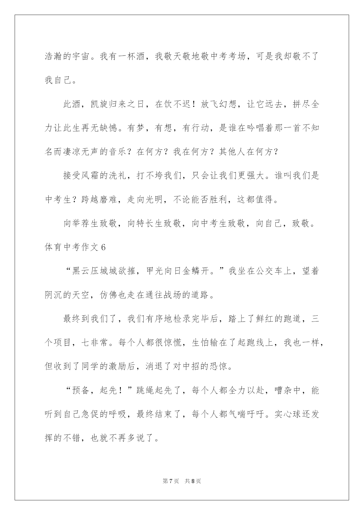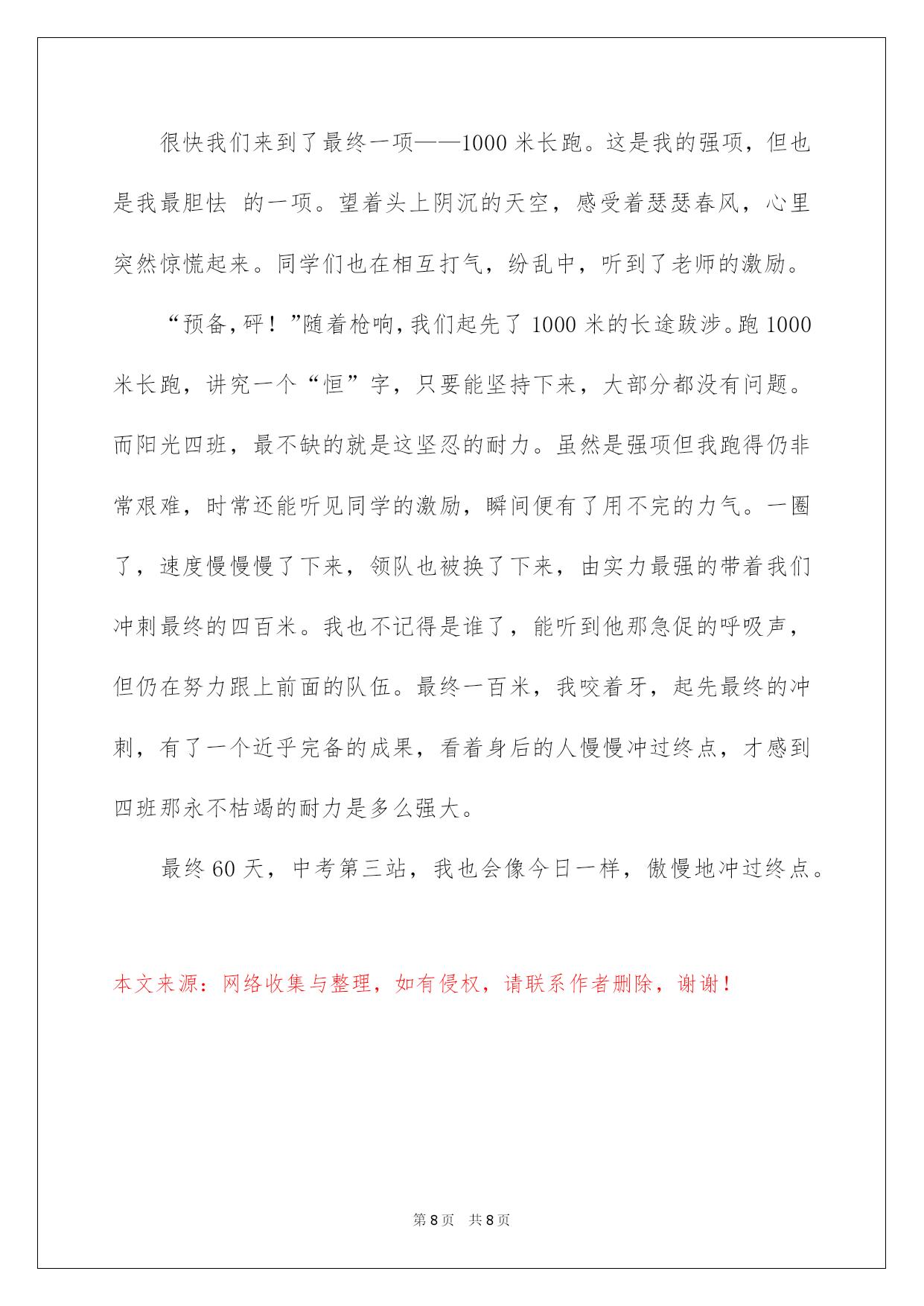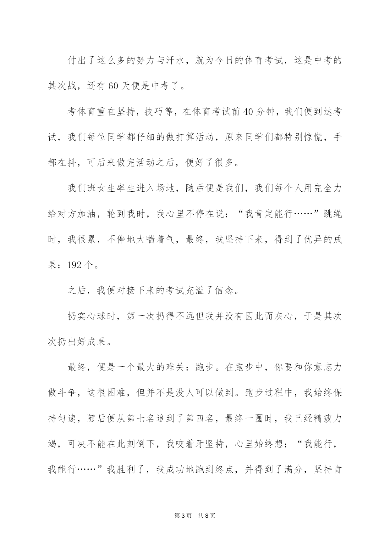 第PAGE\*Arabic\*MERGEFORMAT8页共NUMPAGES\*Arabic\*MERGEFORMAT8页第PAGE\*MERGEFORMAT8页共NUMPAGES\*MERGEFORMAT8页第PAGE\*MERGEFORMAT8页共NUMPAGES\*MERGEFORMAT8页第PAGE\*MERGEFORMAT8页共NUMPAGES\*MERGEFORMAT8页第PAGE\*MERGEFORMAT8页共NUMPAGES\*MERGEFORMAT8页第PAGE\*MERGEFORMAT8页共NUMPAGES\*MERGEFORMAT8页第PAGE\*MERGEFORMAT8页共NUMPAGES\*MERGEFORMAT8页第PAGE\*MERGEFORMAT8页共NUMPAGES\*MERGEFORMAT8页第PAGE\*MERGEFORMAT8页共NUMPAGES\*MERGEFORMAT8页第PAGE\*MERGEFORMAT8页共NUMPAGES\*MERGEFORMAT8页第PAGE\*MERGEFORMAT8页共NUMPAGES\*MERGEFORMAT8页2022体育中考作文体育中考作文在平凡的学习、工作、生活中,大家最不生疏的就是作文了吧,作文是经过人的思想考虑和语言组织,通过文字来表达一个主题意义的记叙方法。那么一般作文是怎么写的呢?以下是我细心整理的体育中考作文,供大家参考借鉴,希望可以帮助到有须要的挚友。体育中考作文1前方道路是艰辛还是华蜜,只有脚踏乌云之上,才能迎接绚丽阳光!题记拼搏·昂扬向上又到了春日播种的季节,预示着毕业生的体育过关检测又近了一步??每天大部分时间都在操场上训练,天气晴好时,每次训练后,同学们脸上像被火烤过般炙热,汗水大滴大滴地落下。休息时间,我一个人坐在花坛边,见到园丁们在洒落种子。我的视线落在了一粒被丢掉的劣质种子上,它被丢弃在周边的碎石旁,时时常还被人无情地踩踏。可能它注定是个淘汰者,不会有生根发芽的机会吧。休息一会儿,我又快速回到操场,接着着训练的生活。我坚信,只要努力,既使流再多的汗水,我也不会是那个淘汰者。坚持·摆脱束缚又到了训练的时候了,我拖着无力的身子,双腿颤抖地走向操场??体育老师依据每个人的体质安排任务,这就是说我们要脱离集体,个人训练!没有了大家的带领,我很难坚持下去。跑了几圈后,我发觉,我无力去超越他人,甚至无力再跑下去,动也懒得动。我艰难的挪移到了花坛边坐下休息,关节的酸痛让我偷偷流下了几滴眼泪。不经意间,一抹新绿晃了我的双眼,是它吗!是它,真的'是它,就是那颗被人丢在一边的种子呀!它竟然比别的种子领先钻出了土壤,弯着身子艰难的生长!种子的坚毅让我的心猛的一颤,它并不是淘汰者。我擦干了眼泪,咬紧了牙关,艰难地抬起腿,接着奔跑,我信任我也会有我的重生!体育中考作文2付出了这么多的努力与汗水,就为今日的体育考试,这是中考的其次战,还有60天便是中考了。考体育重在坚持,技巧等,在体育考试前40分钟,我们便到达考试,我们每位同学都仔细的做打算活动,原来同学们都特别惊慌,手都在抖,可后来做完活动之后,便好了很多。我们班女生率生进入场地,随后便是我们,我们每个人用完全力给对方加油,轮到我时,我心里不停在说:“我肯定能行……”跳绳时,我很累,不停地大喘着气,最终,我坚持下来,得到了优异的成果:192个。之后,我便对接下来的考试充溢了信念。扔实心球时,第一次扔得不远但我并没有因此而灰心,于是其次次扔出好成果。最终,便是一个最大的难关:跑步。在跑步中,你要和你意志力做斗争,这很困难,但并不是没人可以做到。跑步过程中,我始终保持匀速,随后便从第七名追到了第四名,最终一圈时,我已经精疲力竭,可决不能在此刻倒下,我咬着牙坚持,心里始终想:“我能行,我能行……”我胜利了,我成功地跑到终点,并得到了满分,坚持肯定是最重要的。既然体育考试都可以坚持下来,更不必说中考了,所以,加油吧,各位!体育中考作文3今日是星期四,也是是我们体育期中考试的日子。作为班长,我要给同学们带一个好头,不仅成果好体质也要好。为了打算期中的体育考试,我可是练了许多天呢!今日我要见证这几个星期的努力了。我们16班是第一个考试的。一清早,我们迎着风热身打算考试。我们女生第一项测的是50米跑。我跑的是比较快的,但是心情照旧很激烈,很惊慌。老师测得很快,不过一会儿就到我了,老师拿着一面黄色的旗子,下令:“跑!”我就拔起腿,使出洪荒之力,逆着风,像与风赛跑。最终我的成果接近满分,太棒了!跑完50米我们去跳绳,最近两个星期我每一天都在写完作业后跳非常钟的