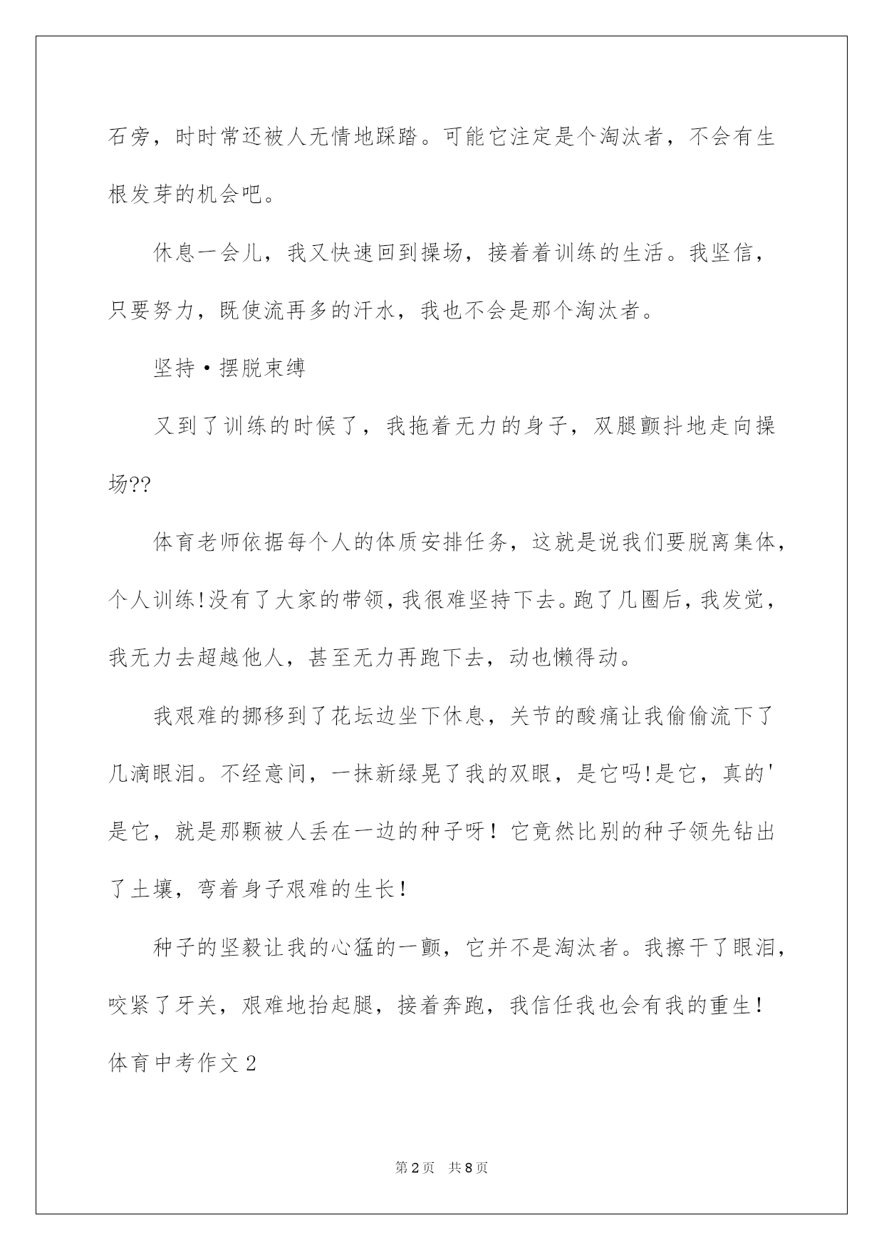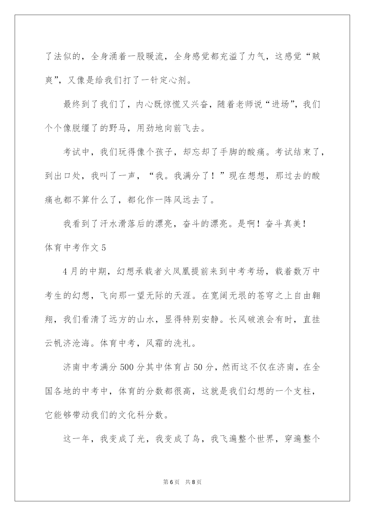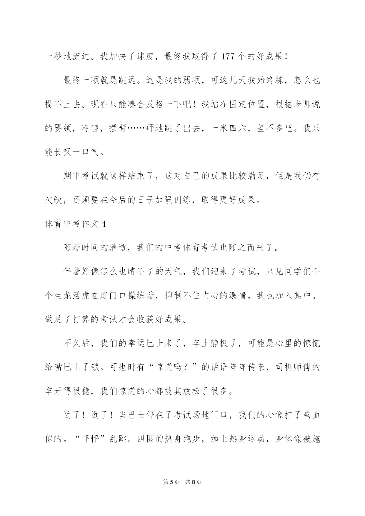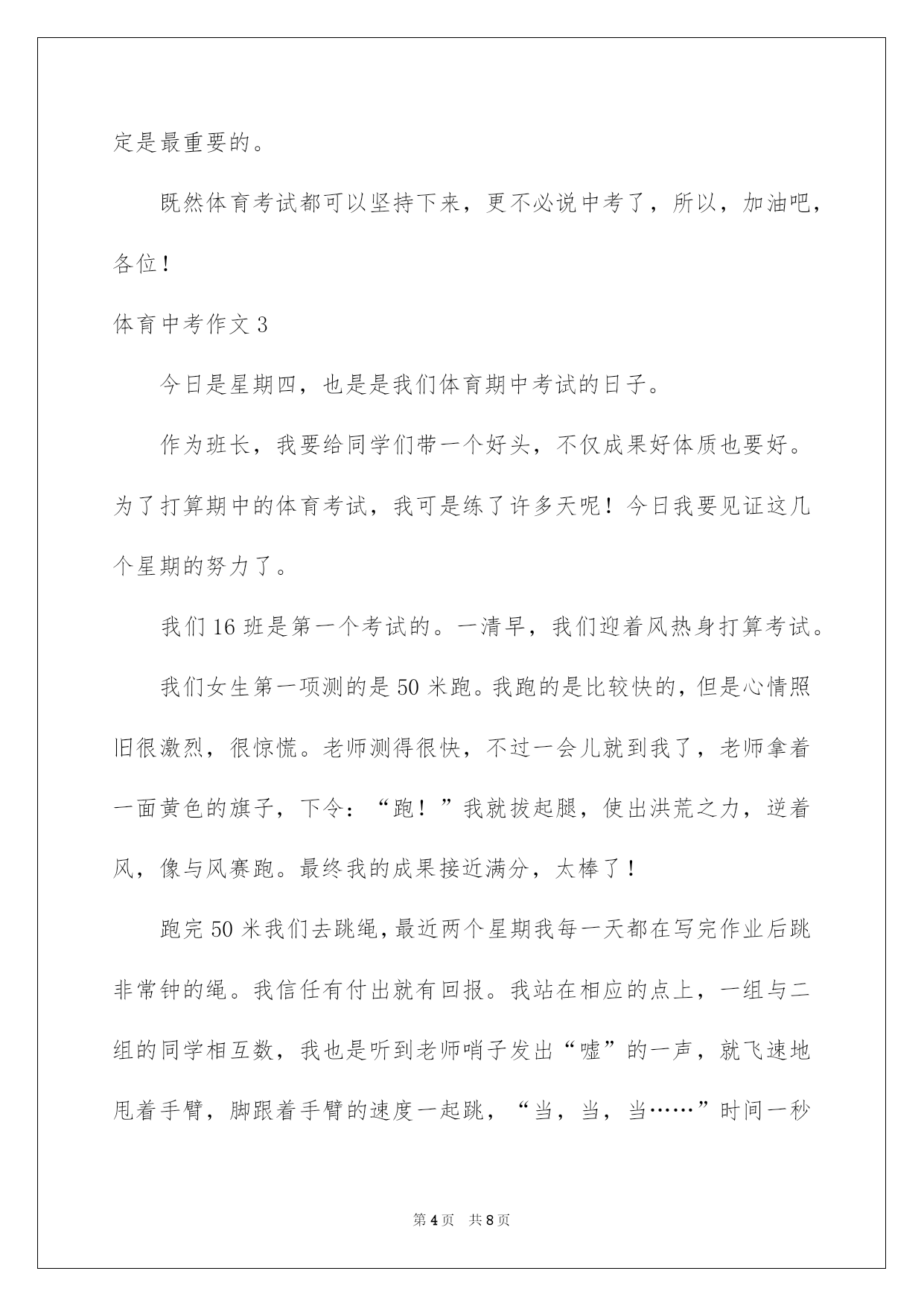 第PAGE\*Arabic\*MERGEFORMAT8页共NUMPAGES\*Arabic\*MERGEFORMAT8页第PAGE\*MERGEFORMAT8页共NUMPAGES\*MERGEFORMAT8页第PAGE\*MERGEFORMAT8页共NUMPAGES\*MERGEFORMAT8页第PAGE\*MERGEFORMAT8页共NUMPAGES\*MERGEFORMAT8页第PAGE\*MERGEFORMAT8页共NUMPAGES\*MERGEFORMAT8页第PAGE\*MERGEFORMAT8页共NUMPAGES\*MERGEFORMAT8页第PAGE\*MERGEFORMAT8页共NUMPAGES\*MERGEFORMAT8页第PAGE\*MERGEFORMAT8页共NUMPAGES\*MERGEFORMAT8页第PAGE\*MERGEFORMAT8页共NUMPAGES\*MERGEFORMAT8页第PAGE\*MERGEFORMAT8页共NUMPAGES\*MERGEFORMAT8页第PAGE\*MERGEFORMAT8页共NUMPAGES\*MERGEFORMAT8页2022体育中考作文体育中考作文在平凡的学习、工作、生活中,大家最不生疏的就是作文了吧,作文是经过人的思想考虑和语言组织,通过文字来表达一个主题意义的记叙方法。那么一般作文是怎么写的呢?以下是我细心整理的体育中考作文,供大家参考借鉴,希望可以帮助到有须要的挚友。体育中考作文1前方道路是艰辛还是华蜜,只有脚踏乌云之上,才能迎接绚丽阳光!题记拼搏·昂扬向上又到了春日播种的季节,预示着毕业生的体育过关检测又近了一步??每天大部分时间都在操场上训练,天气晴好时,每次训练后,同学们脸上像被火烤过般炙热,汗水大滴大滴地落下。休息时间,我一个人坐在花坛边,见到园丁们在洒落种子。我的视线落在了一粒被丢掉的劣质种子上,它被丢弃在周边的碎石旁,时时常还被人无情地踩踏。可能它注定是个淘汰者,不会有生根发芽的机会吧。休息一会儿,我又快速回到操场,接着着训练的生活。我坚信,只要努力,既使流再多的汗水,我也不会是那个淘汰者。坚持·摆脱束缚又到了训练的时候了,我拖着无力的身子,双腿颤抖地走向操场??体育老师依据每个人的体质安排任务,这就是说我们要脱离集体,个人训练!没有了大家的带领,我很难坚持下去。跑了几圈后,我发觉,我无力去超越他人,甚至无力再跑下去,动也懒得动。我艰难的挪移到了花坛边坐下休息,关节的酸痛让我偷偷流下了几滴眼泪。不经意间,一抹新绿晃了我的双眼,是它吗!是它,真的'是它,就是那颗被人丢在一边的种子呀!它竟然比别的种子领先钻出了土壤,弯着身子艰难的生长!种子的坚毅让我的心猛的一颤,它并不是淘汰者。我擦干了眼泪,咬紧了牙关,艰难地抬起腿,接着奔跑,我信任我也会有我的重生!体育中考作文2付出了这么多的努力与汗水,就为今日的体育考试,这是中考的其次战,还有60天便是中考了。考体育重在坚持,技巧等,在体育考试前40分钟,我们便到达考试,我们每位同学都仔细的做打算活动,原来同学们都特别惊慌,手都在抖,可后来做完活动之后,便好了很多。我们班女生率生进入场地,随后便是我们,我们每个人用完全力给对方加油,轮到我时,我心里不停在说:“我肯定能行……”跳绳时,我很累,不停地大喘着气,最终,我坚持下来,得到了优异的成果:192个。之后,我便对接下来的考试充溢了信念。扔实心球时,第一次扔得不远但我并没有因此而灰心,于是其次次扔出好成果。最终,便是一个最大的难关:跑步。在跑步中,你要和你意志力做斗争,这很困难,但并不是没人可以做到。跑步过程中,我始终保持匀速,随后便从第七名追到了第四名,最终一圈时,我已经精疲力竭,可决不能在此刻倒下,我咬着牙坚持,心里始终想:“我能行,我能行……”我胜利了,我成功地跑到终点,并得到了满分,坚持肯定是最重要的。既然体育考试都可以坚持下来,更不必说中考了,所以,加油吧,各位!体育中考作文3今日是星期四,也是是我们体育期中考试的日子。作为班长,我要给同学们带一个好头,不仅成果好体质也要好。为了打算期中的体育考试,我可是练了许多天呢!今日我要见证这几个星期的努力了。我们16班是第一个考试的。一清早,我们迎着风热身打算考试。我们女生第一项测的是50米跑。我跑的是比较快的,但是心情照旧很激烈,很惊慌。老师测得很快,不过一会儿就到我了,老师拿着一面黄色的旗子,下令:“跑!”我就拔起腿,使出洪荒之力,逆着风,像与风赛跑。最终我的成果接近满分,太棒了!跑完50米我们去跳绳,最近两个星期我每一天都在写完作业后跳非常钟的